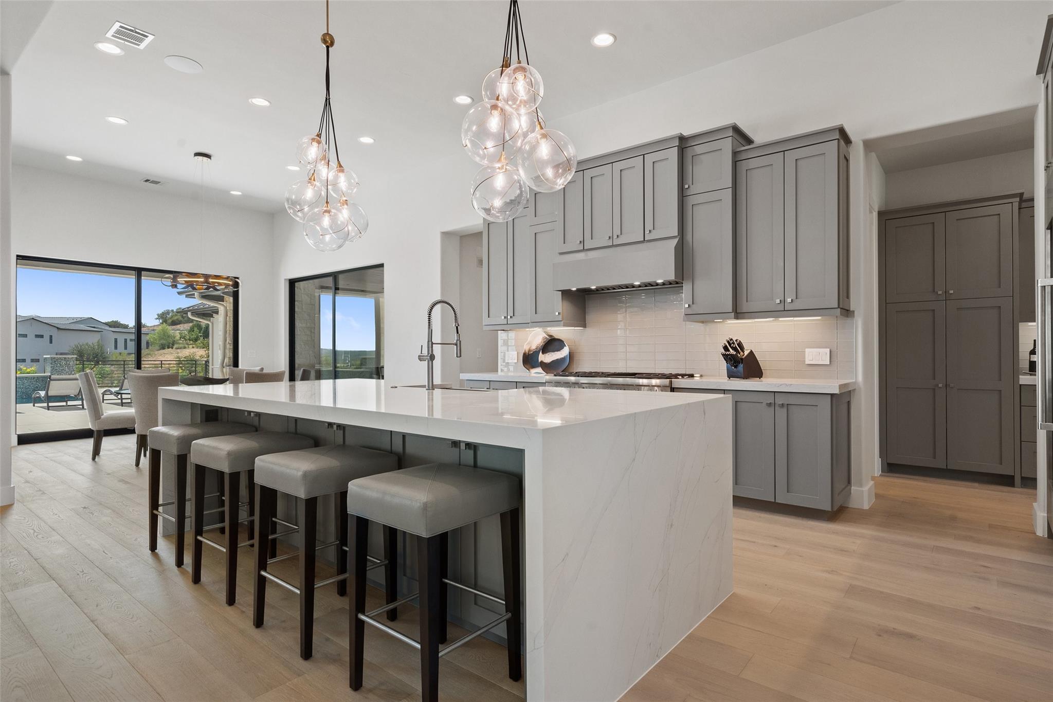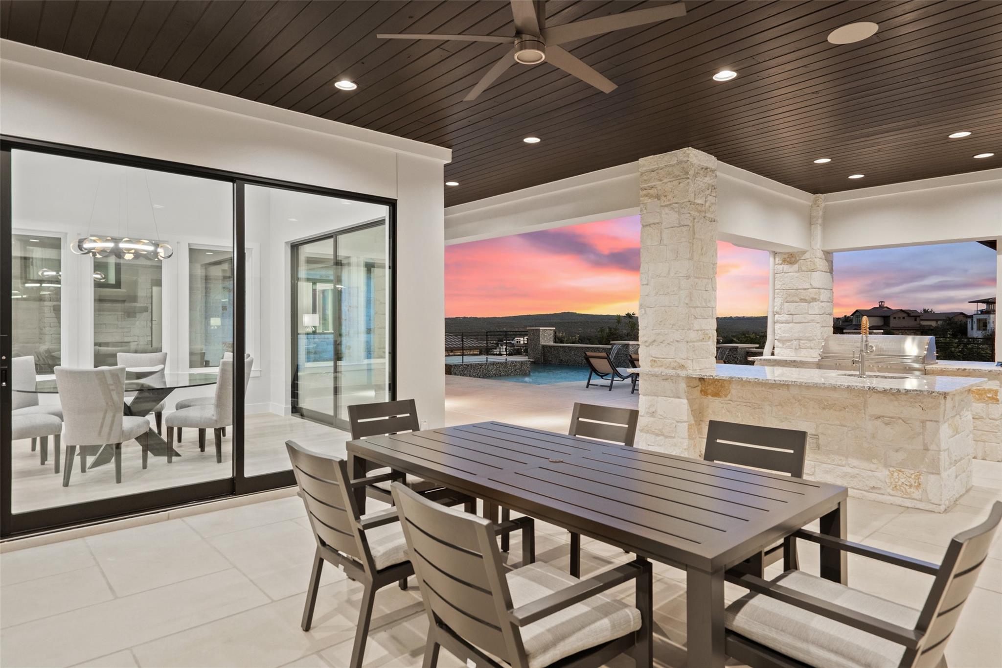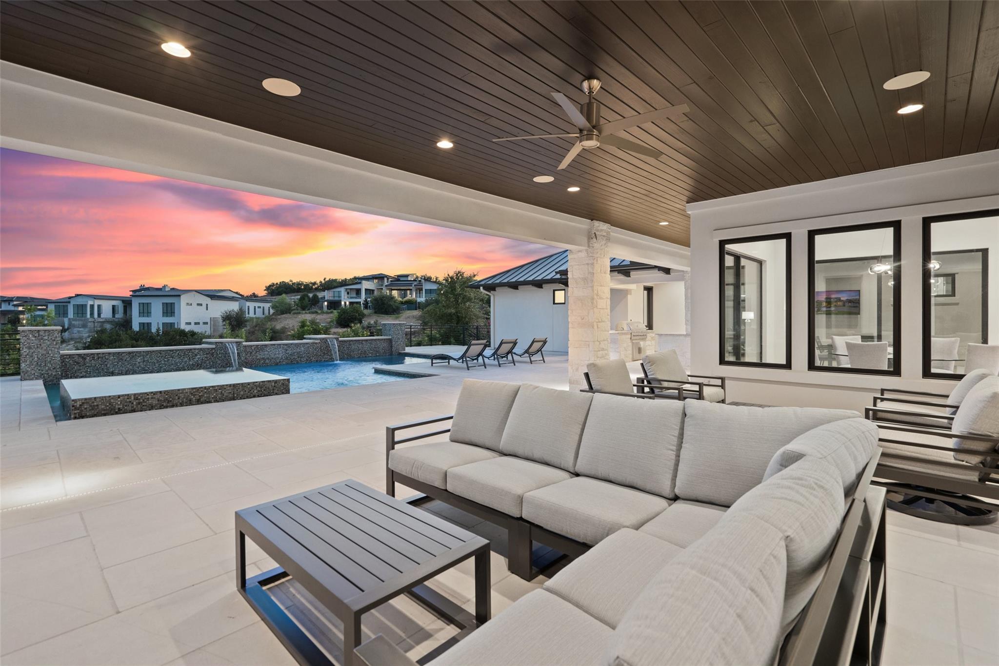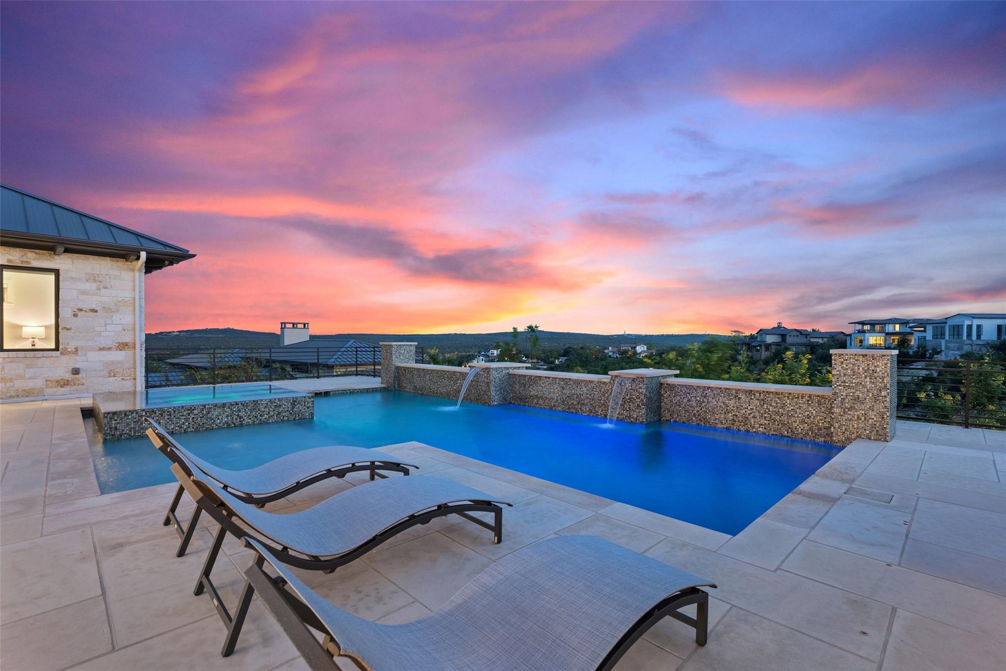 Renovated in 2023, this immaculate home is a true testament to thoughtful design and quality craftsmanship. White oak floors and an abundance of natural light bathes the heart of this residence. The adjoining dining area sets the stage for intimate gatherings and grand soirées, complemented by an adjacent wet bar. The owner's sanctuary offers breathtaking pool and Hill Country views. The primary bathroom exudes spa-like luxury, boasting a dual walk-in shower, quartz-adorned dual vanities and a custom-designed California closet. The office space doubles as a sixth bedroom or versatile multipurpose room. The interior has been refreshed inside and out, with fresh paint and designer light fixtures. Western sliding doors adorn the family room, eating area, and game room, seamlessly merging indoor and outdoor living. The kitchen stands as a masterpiece, featuring a Calcutta Arni island countertop with waterfall edge and top-of-the-line Thermador appliances. The family room exudes warmth by a Saratoga stone fireplace. Custom California closets in every bedroom maximize storage. Enhanced security with the addition of an exterior camera system. Enjoy the expansive sparkling pool and spa. The covered patio offers a comfortable space for al fresco dining or lounging. Meanwhile, the uncovered patio is perfect for sunbathing, stargazing, or savoring the nature. The fully equipped outdoor kitchen is a gourmet's delight, complete with state-of-the-art appliances, ample counter space, and built-in grill. The exterior of the home has been meticulously landscaped. New exterior lighting both on the front porch and in the expanded parking area. Located in Spanish Oaks, residents enjoy 24/7 manned gate security, access to Spanish Oaks Golf Club, hiking and biking trails, stocked Fish Camp, and pool pavilion. The Austin Tennis Academy awaits just beyond the community gates. The Lake Travis ISD, along with various private school options, lies within a convenient 10-mile radius.