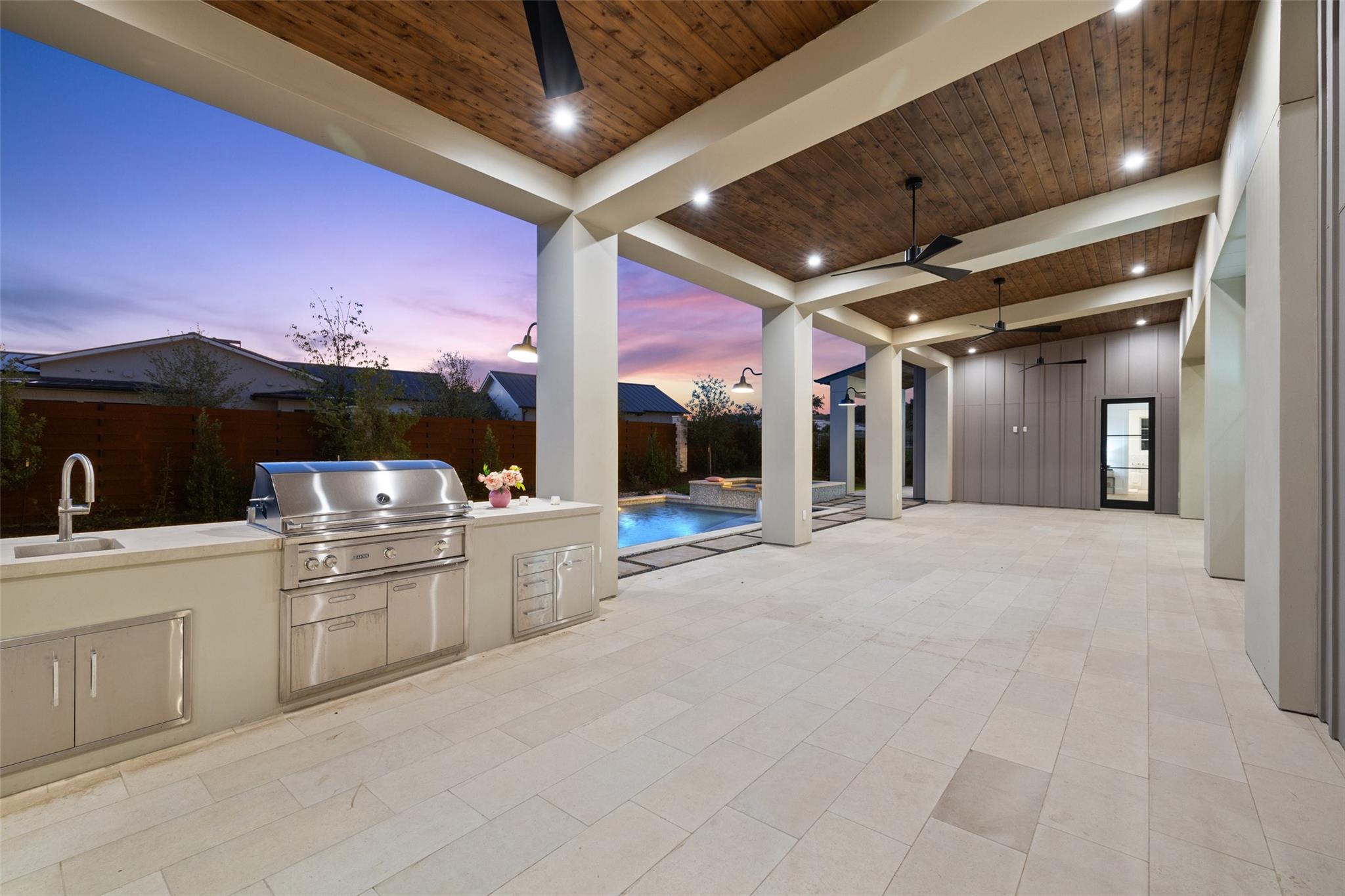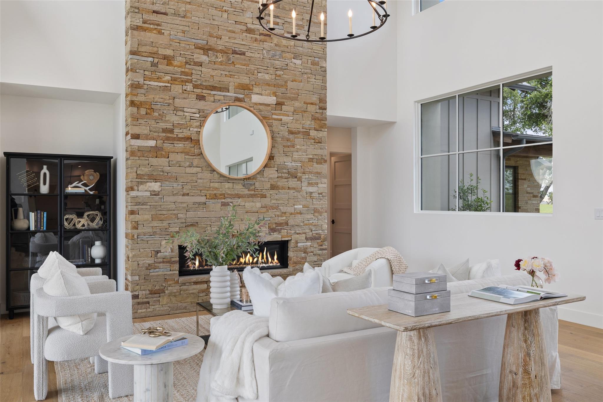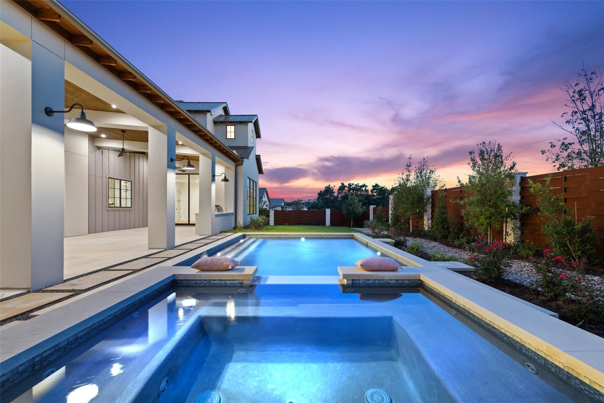 Timeless elegance awaits at Madrone Manor…This newly constructed masterpiece, designed by Ames Design Build, enjoys over $250k of builder upgrades—making it one of the most upgraded homes within the exclusive gates of Madrone Canyon. Step inside this two-story home to find soaring ceilings with stunning wood beams and expansive western sliding doors leading to outdoor entertainment. The home boasts 20-foot ceilings, creating a bright and airy ambiance throughout. The gourmet kitchen features professional Wolf Sub-Zero appliances, including a Wolf steam oven, an oversized island, quartzite countertops, and custom cabinetry. The walk-in pantry is plumbed for a refrigerator, adding ample storage. The living area features a floor-to-ceiling stone fireplace that creates a warm atmosphere. Outside, the serene backyard is designed for relaxation and privacy with an outdoor kitchen ideal for hosting gatherings. Enjoy the luxurious pool and spa, surrounded by thoughtfully designed landscaping. Just off the BBQ area, the media room is perfect for hosting parties while watching the game. The primary suite on the main floor offers a private retreat with a spa-like bathroom. The expansive walk-in closet includes built-in shelving and a dressing area. The other main floor bedroom enjoys a private entrance and can be used as an office, ideal for those who work from home or host visitors. Upstairs, two additional bedrooms have en-suite bathrooms, built-in desk areas, and a living area perfect for children or guests. The second story also boasts a peaceful balcony with stunning Hill Country views. This home includes a GENERAC Guardian 22kw GENERATOR for winter peace of mind, and the garage is equipped with an EV charger. Located minutes from the Hill Country Galleria and within 30 minutes of downtown Austin, this property offers the perfect blend of seclusion and accessibility. Whether you’re seeking a peaceful retreat or a luxurious space to entertain, Madrone Manor offers it all!