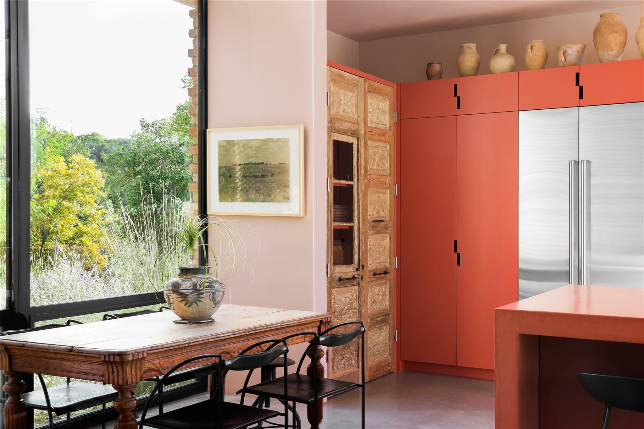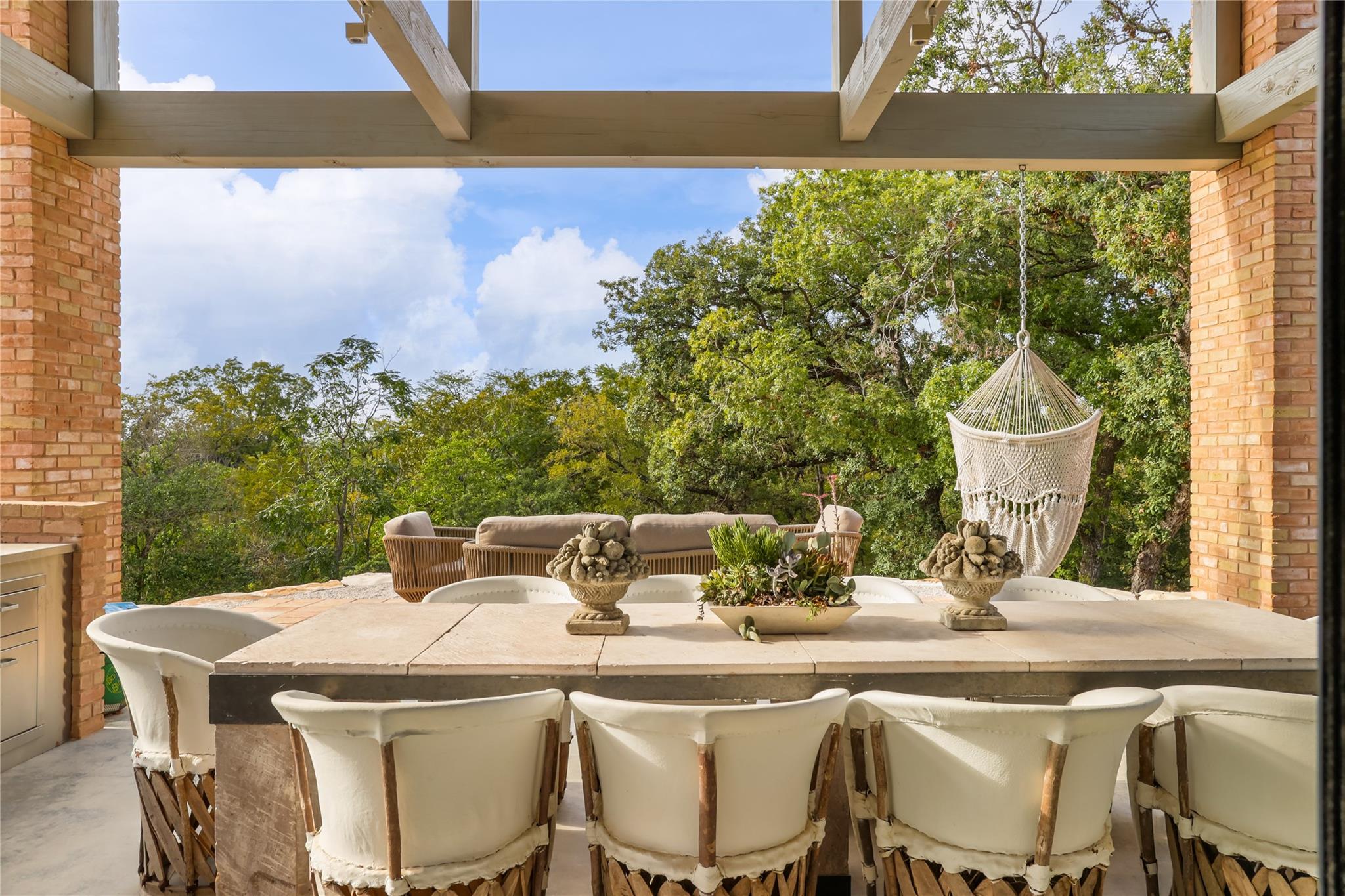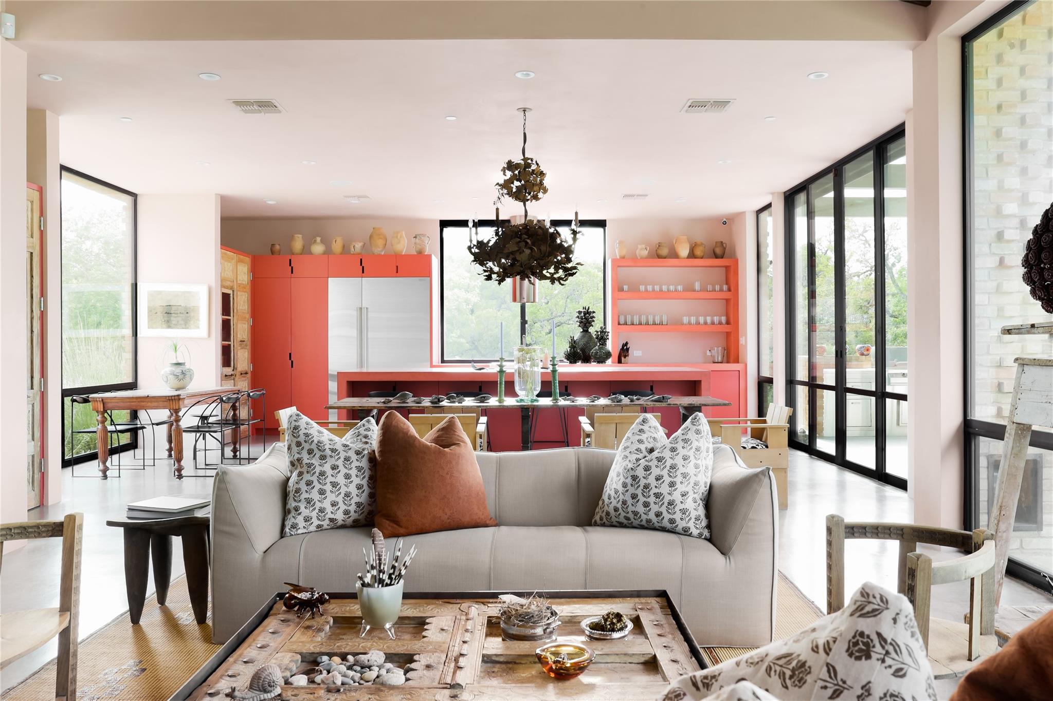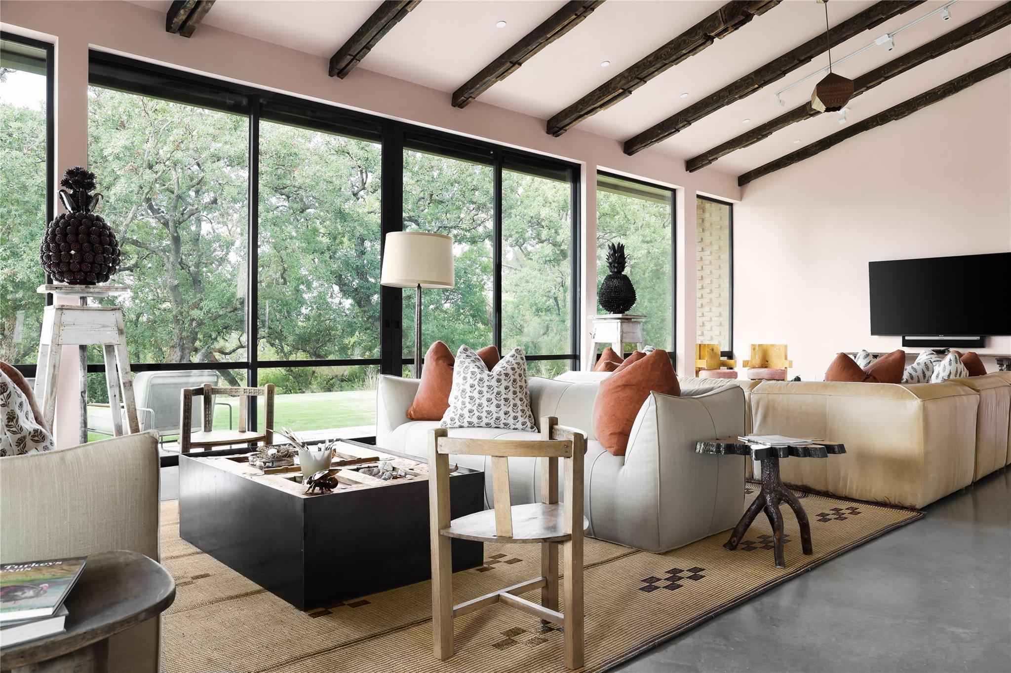 This finely curated modern 12.5-acre property with 342 feet of deep sparkling riverfront water on the Guadalupe River in Comfort, Texas is unlike anything you’ve ever seen in the Texas Hill Country. Using inspiration from the Yves Saint Laurent Museum in Marrakech, Morocco, the stylish homeowners made their vision a reality. The result was a home incorporating the best of two disparate worlds: an urban modern oasis and the comfort of a family-friendly hill country retreat. The interior is designed to allow for casual entertaining with floor-to-ceiling sliding doors from every room providing an unobstructed vista out to the spectacular river frontage. Traditional tile and stone have been replaced with tadalakt plaster serving as the primary material for all walls and counter surfaces throughout the home. Reclaimed timber beams, antique wooden doors and handpainted walls lend a comfortable feel to the living areas. One wing of the home hosts public spaces like the oversized family room, dining room and chef’s kitchen, while private spaces including the 4 bedrooms, 3.5 bathrooms, and office/bunk space are located in the opposite wing. The primary hallway opens the home to create a breezy, oasis-like persona. The exterior is enhanced with mature oaks and lush landscaping to created by award-winning Land West Design Group of Austin to create a rich resort-like experience for you and your guests. Multiple outdoor living spaces make the most of the breathtaking scenery. Enjoy alfresco outdoor dining from the covered patio or enjoy backyard play on the flat, immaculately maintained lawn that provides easy access down to the riverfront. Cozy up in the front courtyard around the fireplace after the sun goes down and enjoy the gentle hill country breezes. Here awaits your private waterfront retreat perfectly designed for families looking for a place to create lifelong memories, establish family traditions, and enjoy the absolute best of Texas Hill Country living.