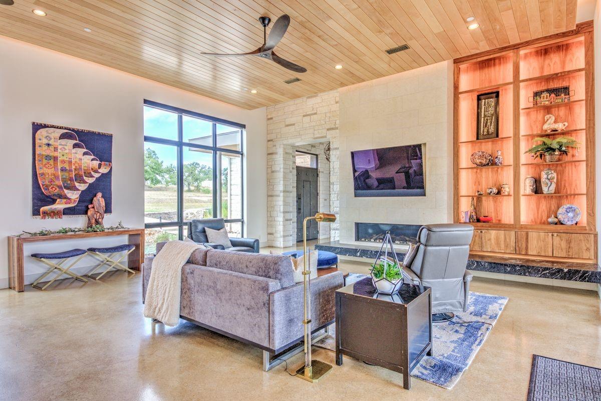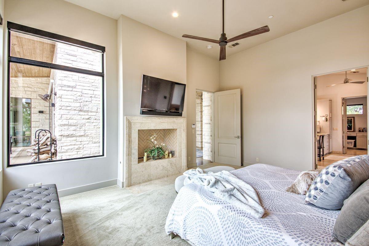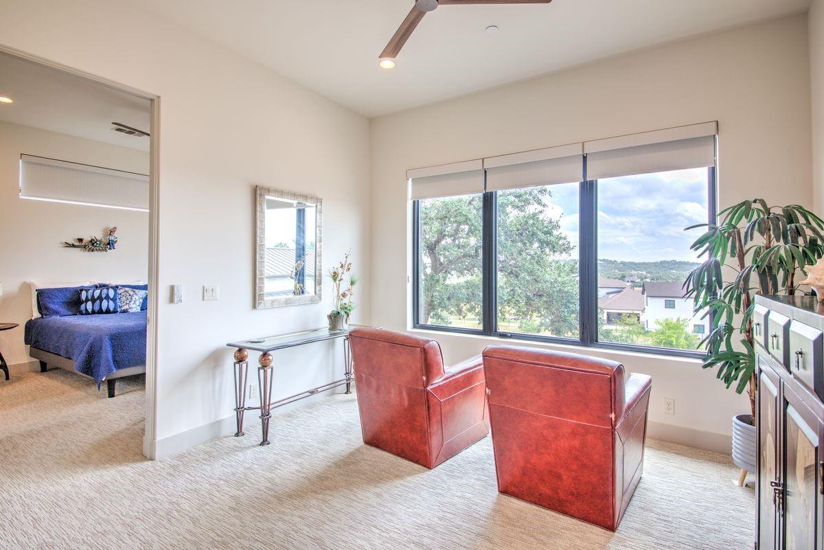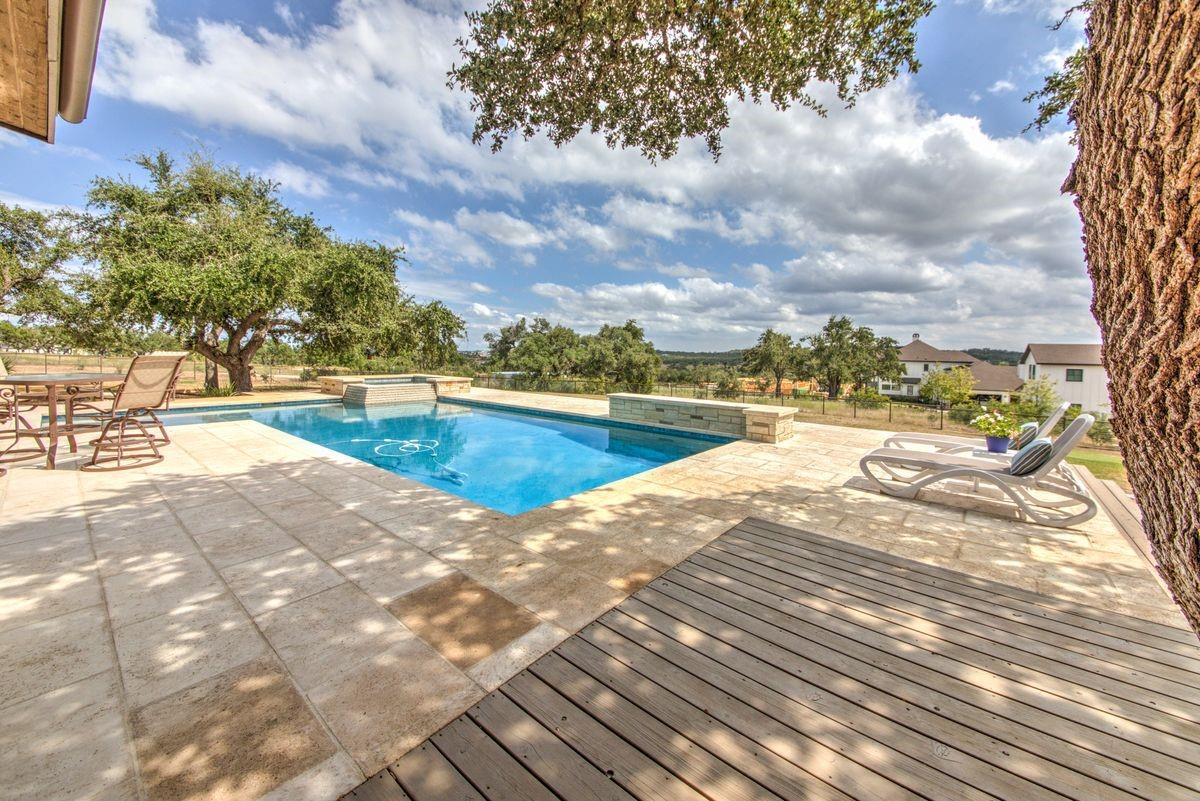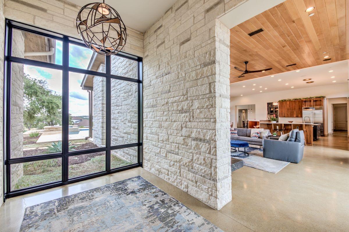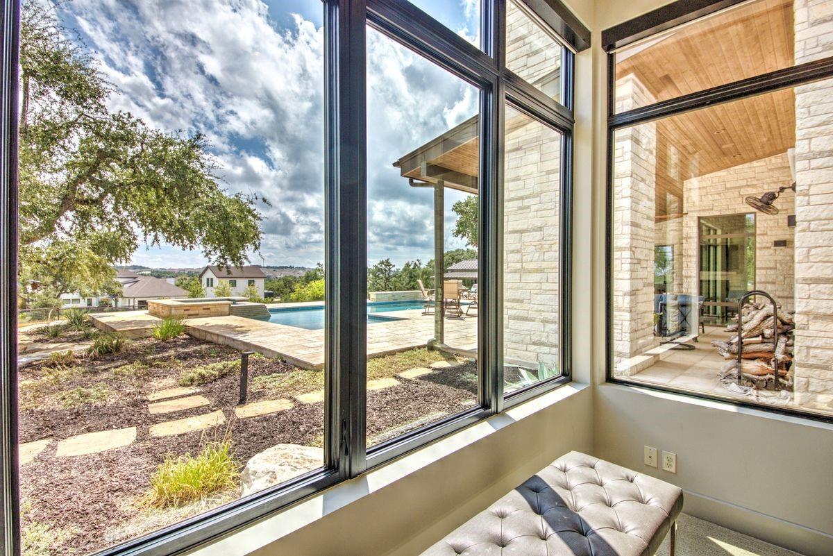 Welcome to this luxurious residence, custom-built in 2018 by John Hagy. Set on a tranquil, tree-covered two-acre lot, this home is the epitome of high-end living & design. Four expansive bedrooms each feature ensuite bathrooms, with the primary bedroom suite conveniently located downstairs. This private oasis comes complete with a custom closet, exercise room, & a spa-like bathroom with heated floors & multiple body sprays in the shower. High-end finishes throughout the home including polished concrete floors & designer automatic window shades. The home's open-concept floor plan is accentuated by high ceilings & custom lighting, blending seamlessly into the sunlit kitchen & family room. These spaces overlook a superb backyard retreat featuring several covered decks for relaxing & party hosting, a chef’s outdoor kitchen, a fireplace, & a stunning pool with water features. Guest house with Kitchen, full bathroom and massive closet for storage also doubles as a pool party cabana Additional amenities: upstairs game/media room, sunroom, separate office, 4-car garage w/epoxy floors, wet bar with ice maker & wine refrigerators. 2150 sq ft air-conditioned bus barn/shop is not included in total sq ft(7898) For added security, the property includes a gun safe room and a tornado-safe room. Located within the Lake Travis Independent School District and just 10 minutes from the Hill Country Galleria and Whole Foods, this exceptional property offers both convenience and lifestyle. It's not just a home; it's an experience awaiting your arrival. Driveway engineered to handle 2 25-ton buses Shop area – insulated w/open cell foam & insulated garage doors. Minisplit air conditioning & heat works very efficiently in keeping it cool in summer & warm the winter. Multiple 50-amp service points for RV plug in, pottery kiln plug ins, etc. A sewer connection & concrete splash tray for dumping RV tanks into the septic 27,000-gallon rainwater collection and filtration system
