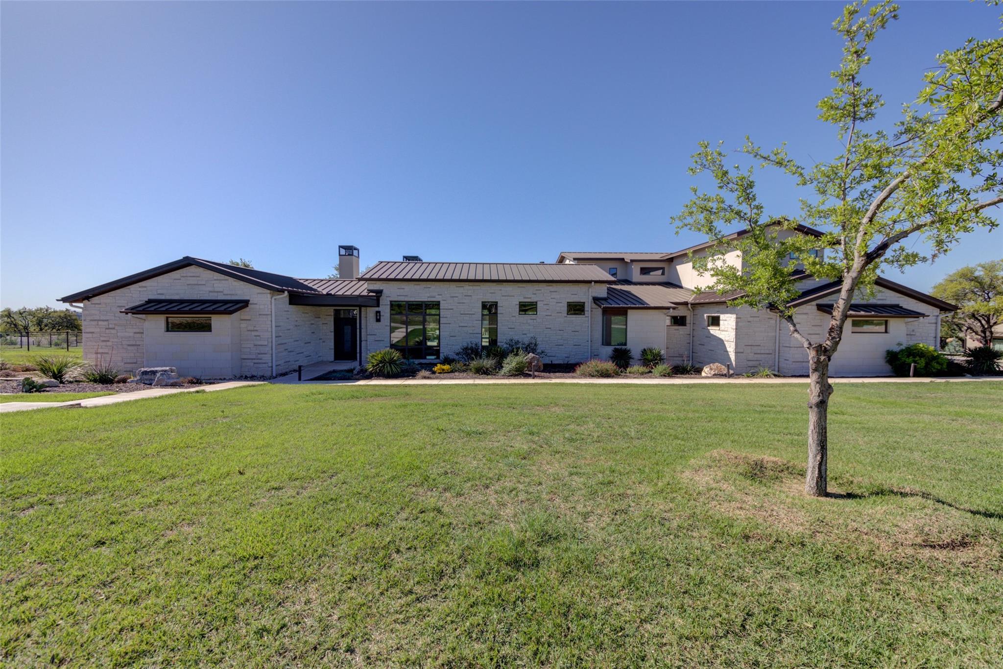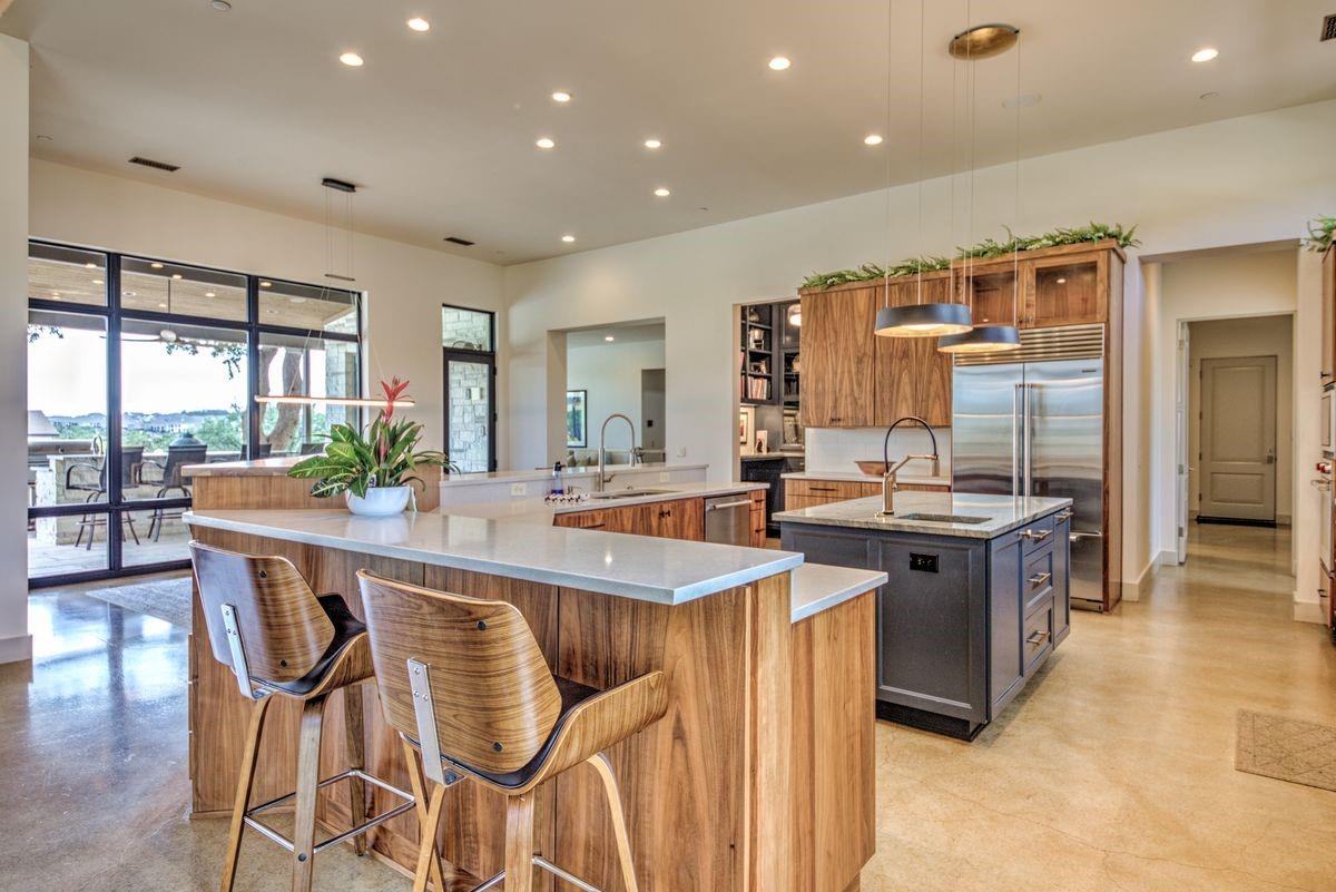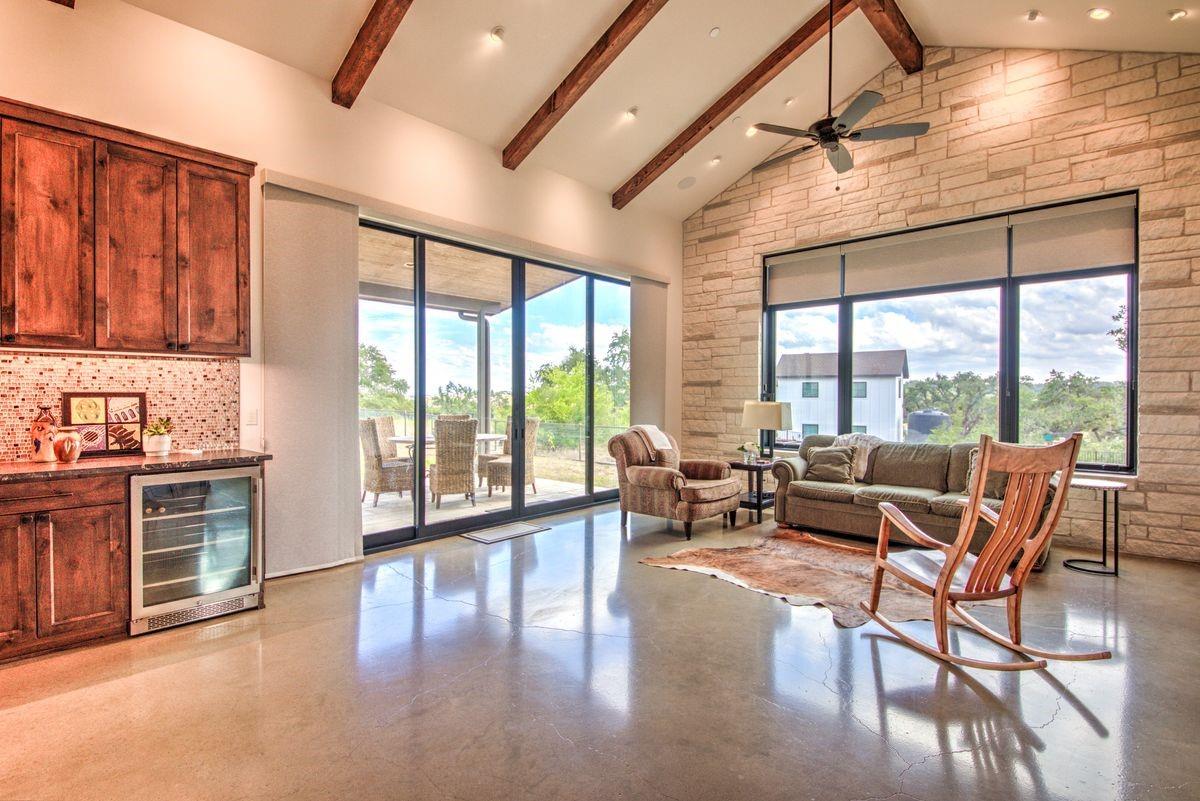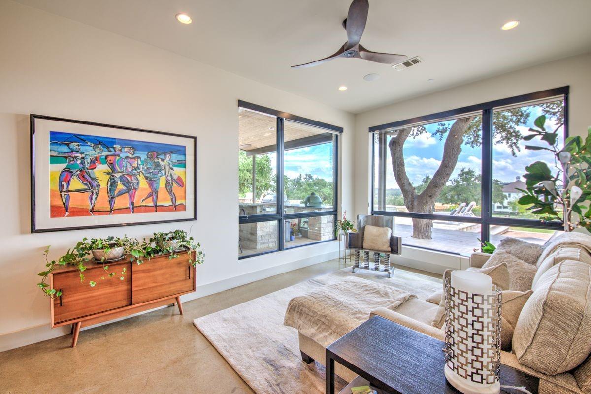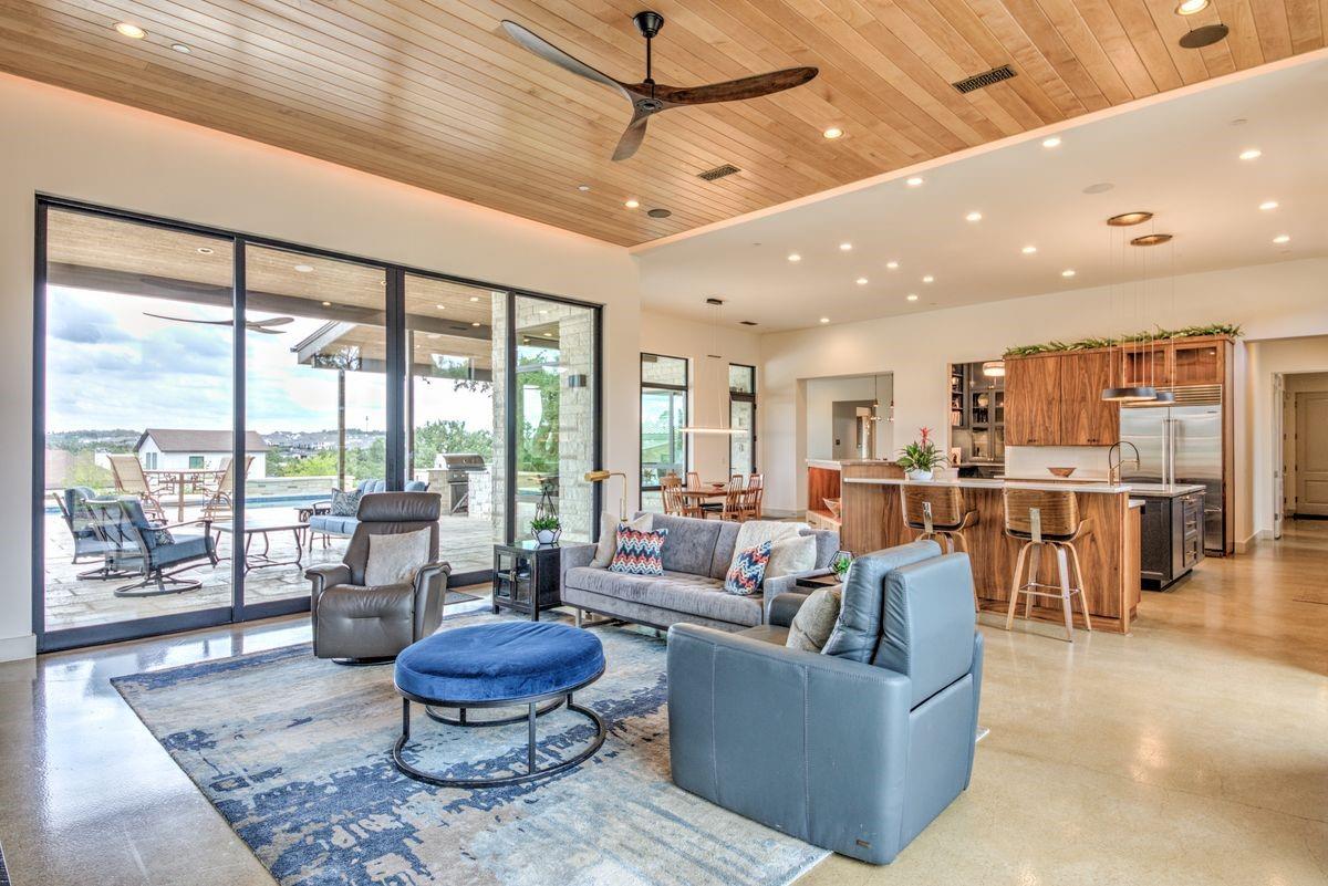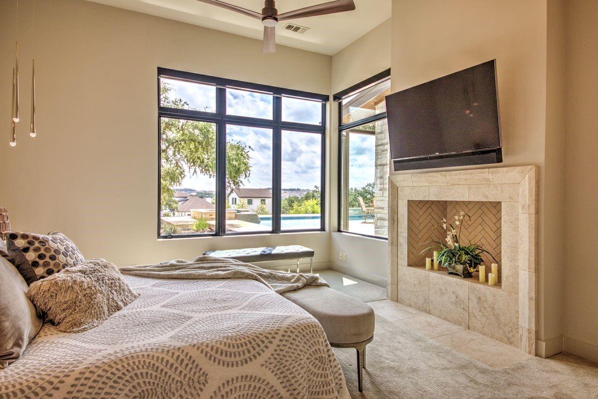 Welcome to this luxurious residence, custom-built in 2018 by John Hagy. Set on a tranquil, tree-covered two-acre lot, this home is the epitome of high-end living & design. Four expansive bedrooms each feature ensuite bathrooms, with the primary bedroom suite conveniently located downstairs. This private oasis comes complete with a custom closet, exercise room, & a spa-like bathroom with heated floors & multiple body sprays in the shower. High-end finishes throughout the home including polished concrete floors & designer automatic window shades. The home's open-concept floor plan is accentuated by high ceilings & custom lighting, blending seamlessly into the sunlit kitchen & family room. These spaces overlook a superb backyard retreat featuring several covered decks for relaxing & party hosting, a chef’s outdoor kitchen, a fireplace, & a stunning pool with water features. Guest house with Kitchen, full bathroom and massive closet for storage also doubles as a pool party cabana Additional amenities: upstairs game/media room, sunroom, separate office, 4-car garage w/epoxy floors, wet bar with ice maker & wine refrigerators. 2150 sq ft air-conditioned bus barn/shop is not included in total sq ft(7898) For added security, the property includes a gun safe room and a tornado-safe room. Located within the Lake Travis Independent School District and just 10 minutes from the Hill Country Galleria and Whole Foods, this exceptional property offers both convenience and lifestyle. It's not just a home; it's an experience awaiting your arrival. Driveway engineered to handle 2 25-ton buses Shop area – insulated w/open cell foam & insulated garage doors. Minisplit air conditioning & heat works very efficiently in keeping it cool in summer & warm the winter. Multiple 50-amp service points for RV plug in, pottery kiln plug ins, etc. A sewer connection & concrete splash tray for dumping RV tanks into the septic 27,000-gallon rainwater collection and filtration system