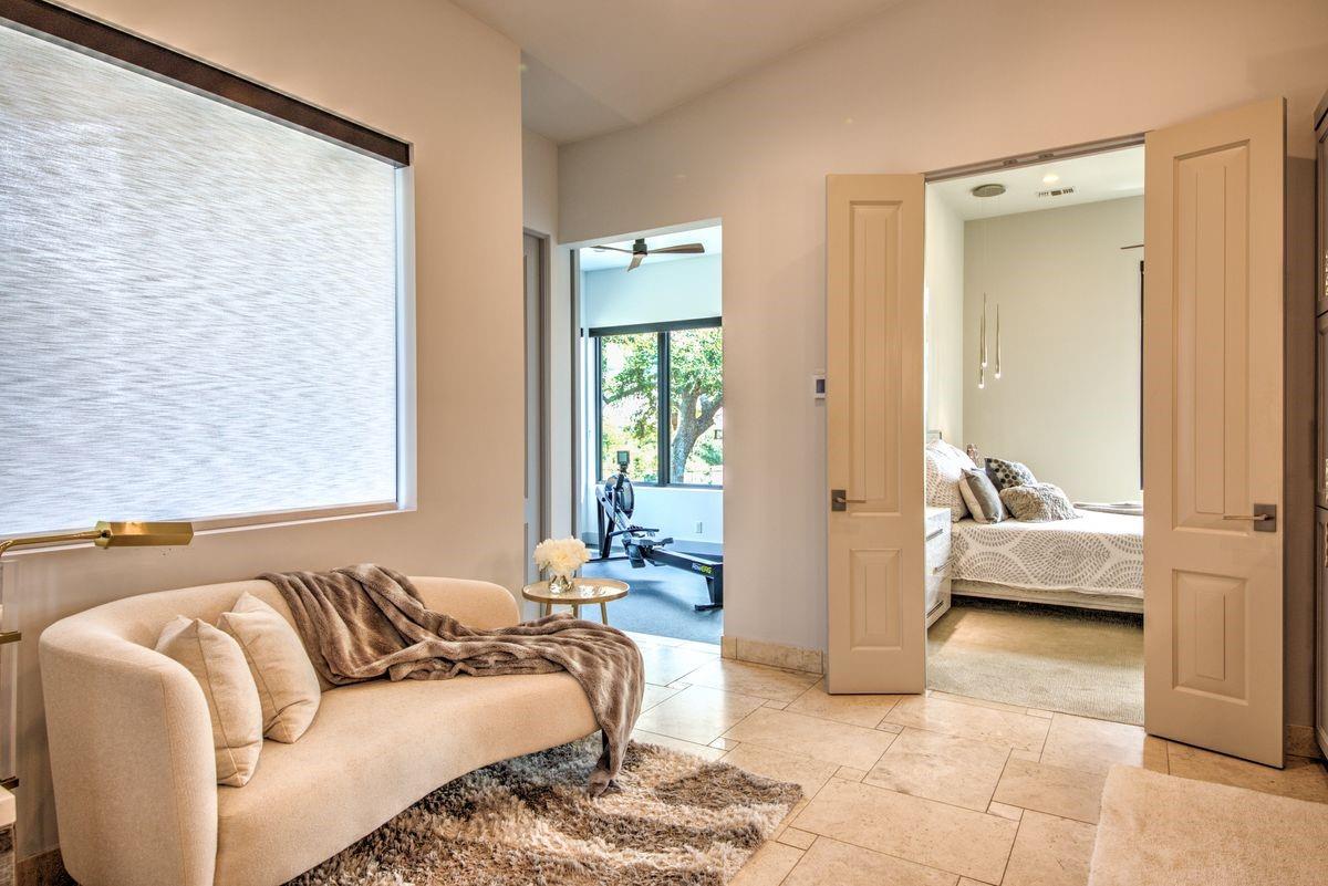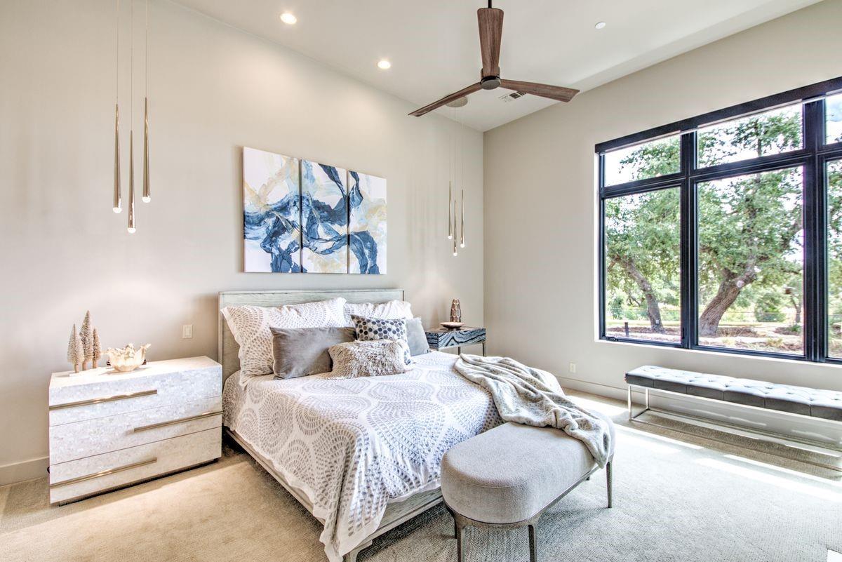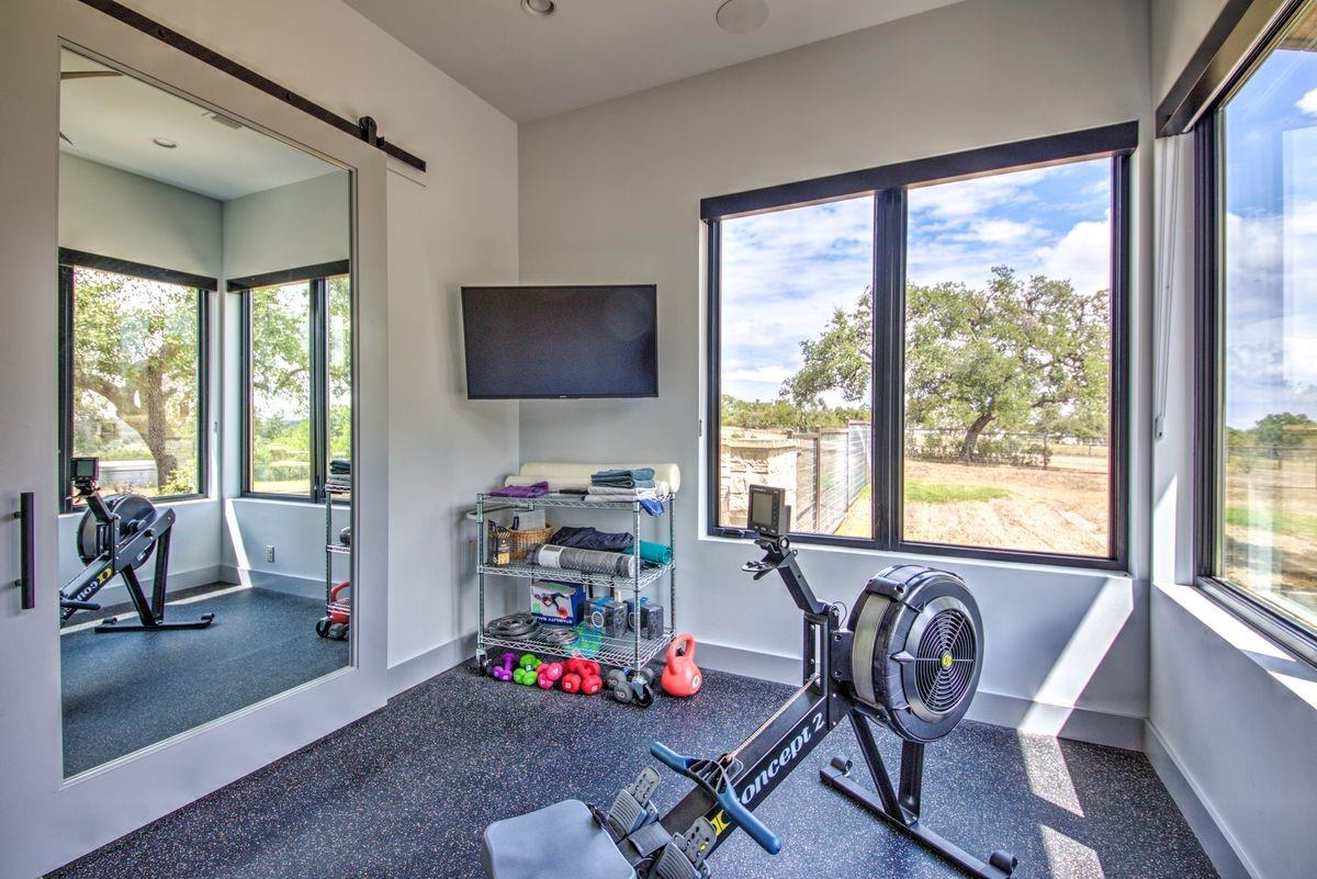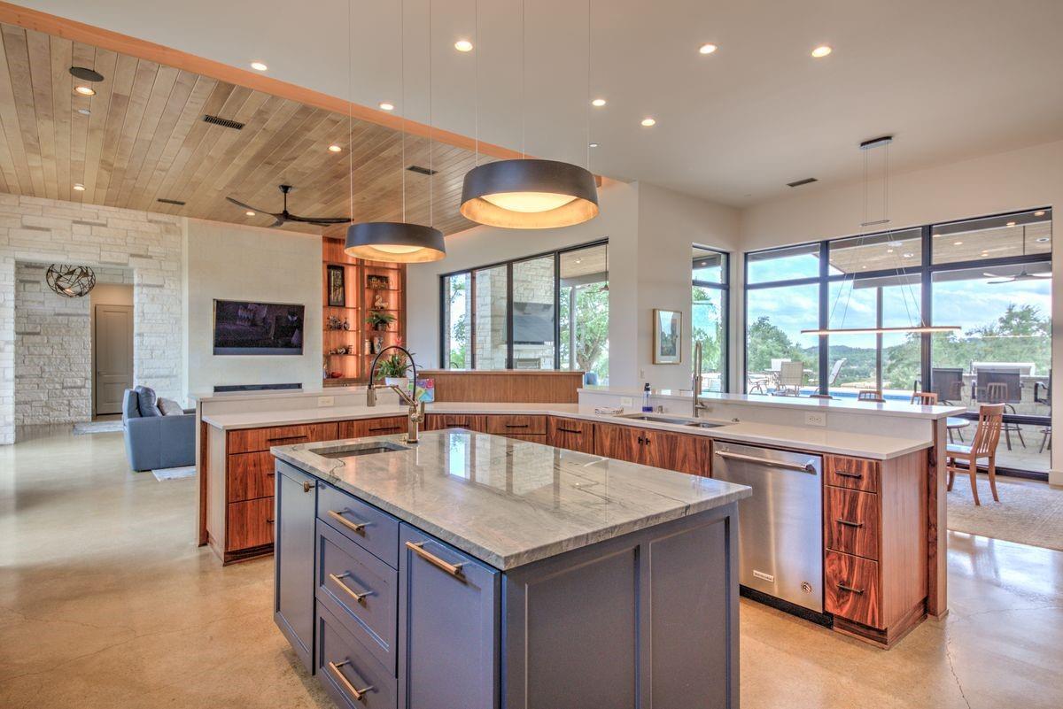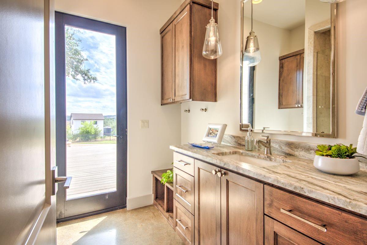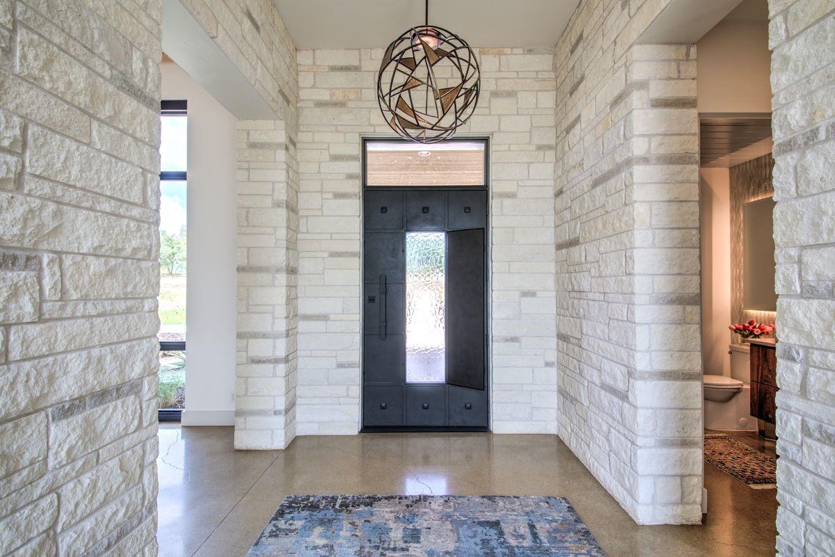 Welcome to this luxurious residence, custom-built in 2018 by John Hagy. Set on a tranquil, tree-covered two-acre lot, this home is the epitome of high-end living & design. Four expansive bedrooms each feature ensuite bathrooms, with the primary bedroom suite conveniently located downstairs. This private oasis comes complete with a custom closet, exercise room, & a spa-like bathroom with heated floors & multiple body sprays in the shower. High-end finishes throughout the home including polished concrete floors & designer automatic window shades. The home's open-concept floor plan is accentuated by high ceilings & custom lighting, blending seamlessly into the sunlit kitchen & family room. These spaces overlook a superb backyard retreat featuring several covered decks for relaxing & party hosting, a chef’s outdoor kitchen, a fireplace, & a stunning pool with water features. Guest house with Kitchen, full bathroom and massive closet for storage also doubles as a pool party cabana Additional amenities: upstairs game/media room, sunroom, separate office, 4-car garage w/epoxy floors, wet bar with ice maker & wine refrigerators. 2150 sq ft air-conditioned bus barn/shop is not included in total sq ft(7898) For added security, the property includes a gun safe room and a tornado-safe room. Located within the Lake Travis Independent School District and just 10 minutes from the Hill Country Galleria and Whole Foods, this exceptional property offers both convenience and lifestyle. It's not just a home; it's an experience awaiting your arrival. Driveway engineered to handle 2 25-ton buses Shop area – insulated w/open cell foam & insulated garage doors. Minisplit air conditioning & heat works very efficiently in keeping it cool in summer & warm the winter. Multiple 50-amp service points for RV plug in, pottery kiln plug ins, etc. A sewer connection & concrete splash tray for dumping RV tanks into the septic 27,000-gallon rainwater collection and filtration system