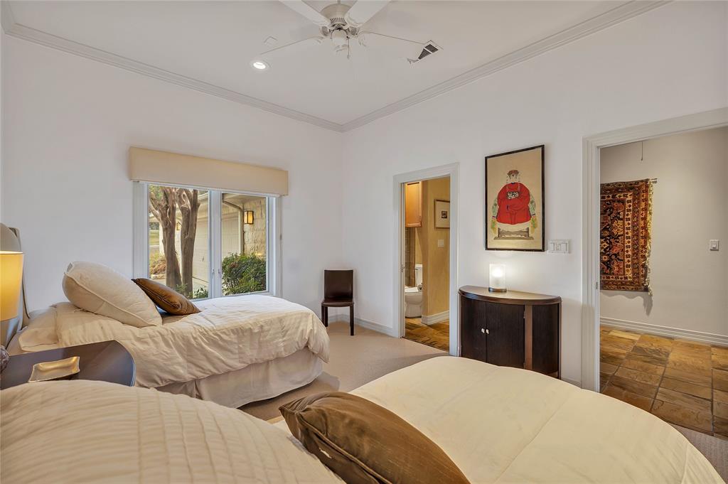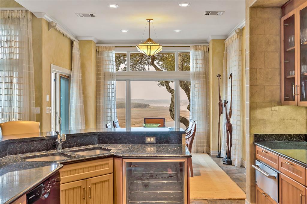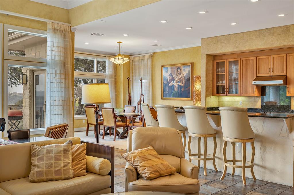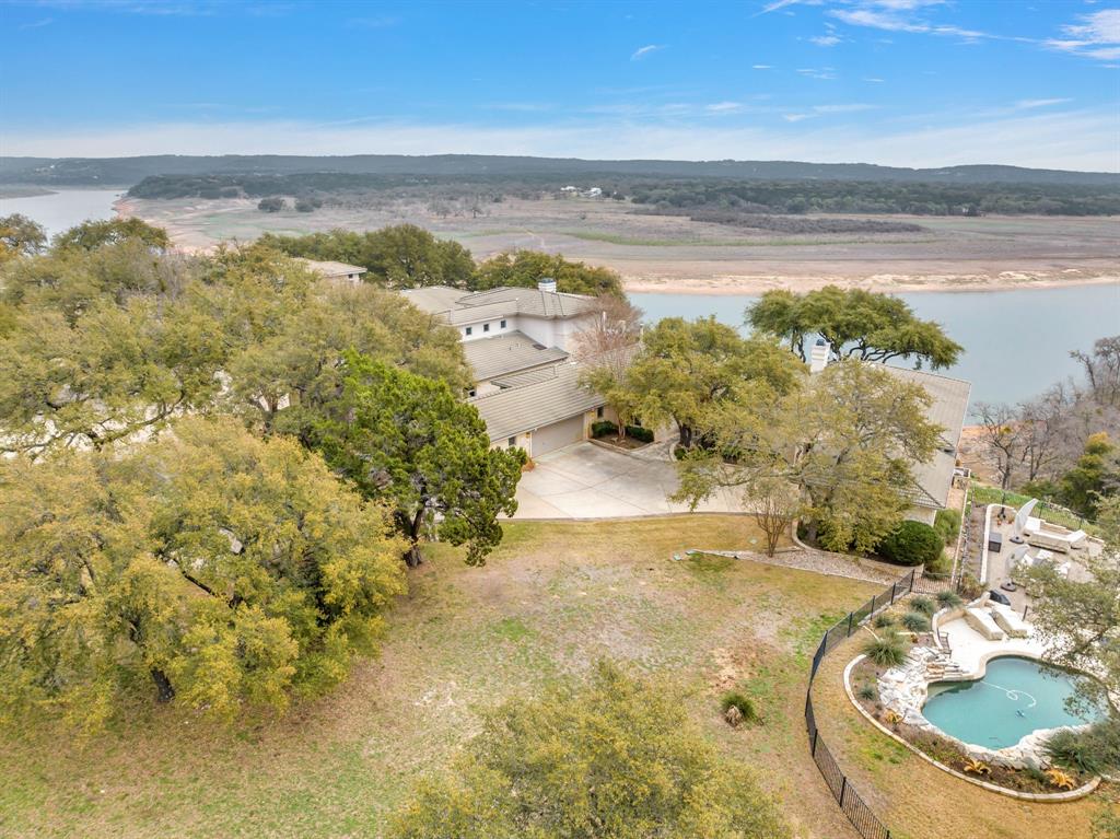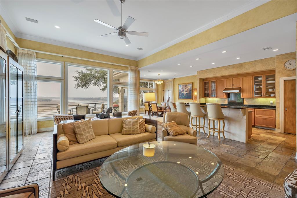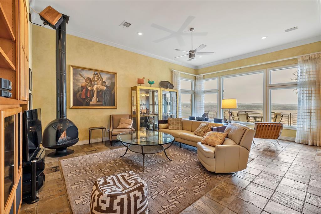 Take in the panoramic views of Lake Travis from your peninsula villa designed by renowned architect, Dick Clark. This beautifully designed home features breathtaking views from 2 separate living areas and 2 primary suites. Also included is a guest suite off the garage with a private entrance. Located lakeside that includes a boat slip with a lift in the prestigious private country club community of Barton Creek Lakeside. Available to residents is an Arnold Palmer golf course, fitness center, pool, tennis courts, and dining, all behind a 24-hour manned security gate. Included in the quarterly dues is all ground maintenance, trash pick-up, window and gutter cleaning, irrigation water, potable water, and pest control. One of only 9 villas in the community that is move-in ready and is the perfect lock-n-leave.