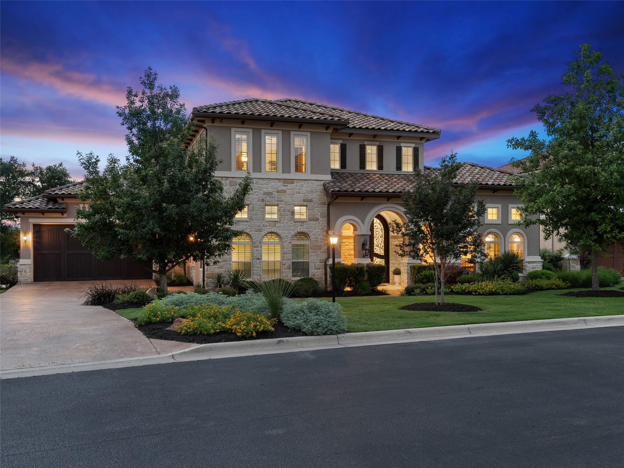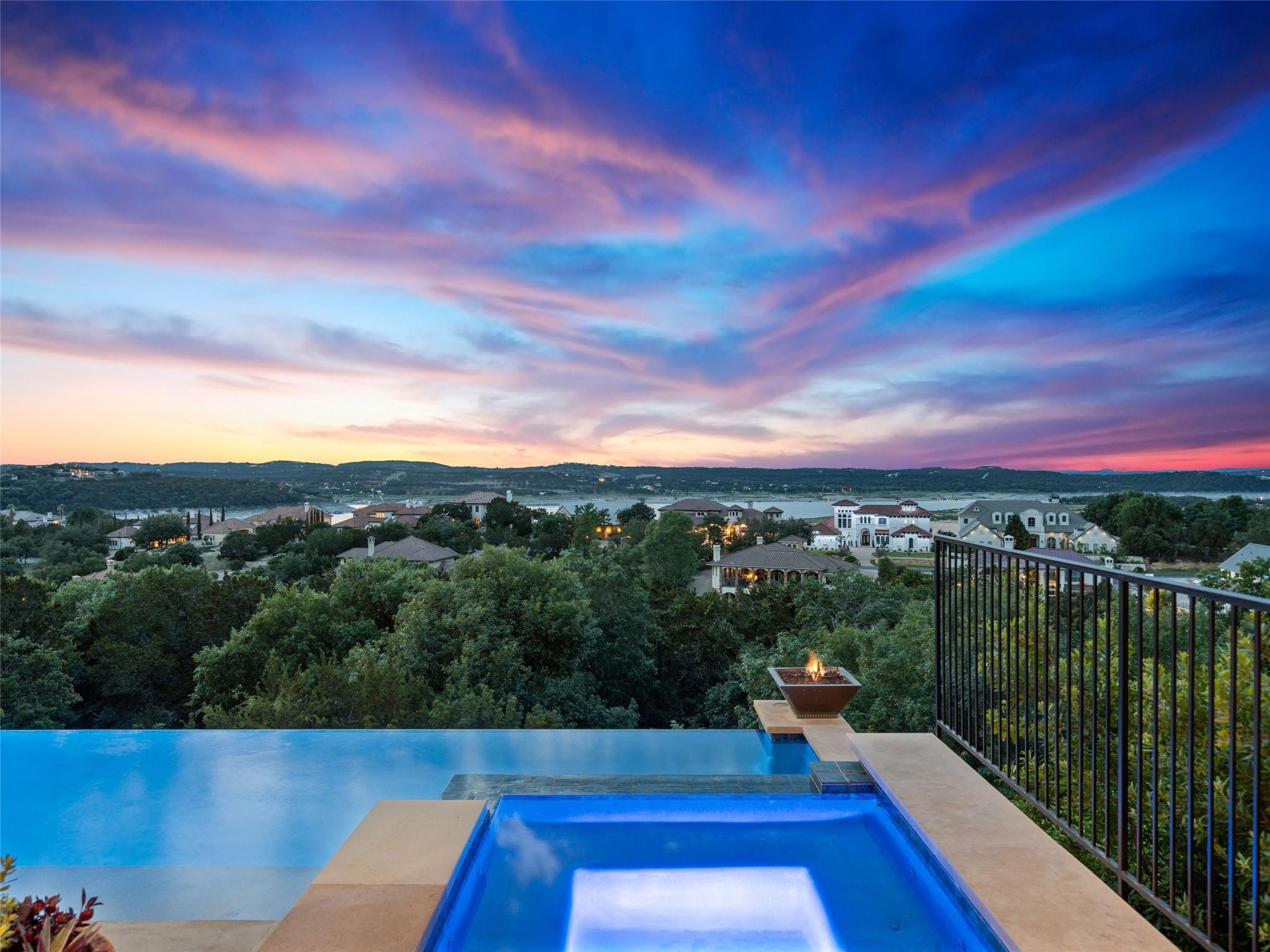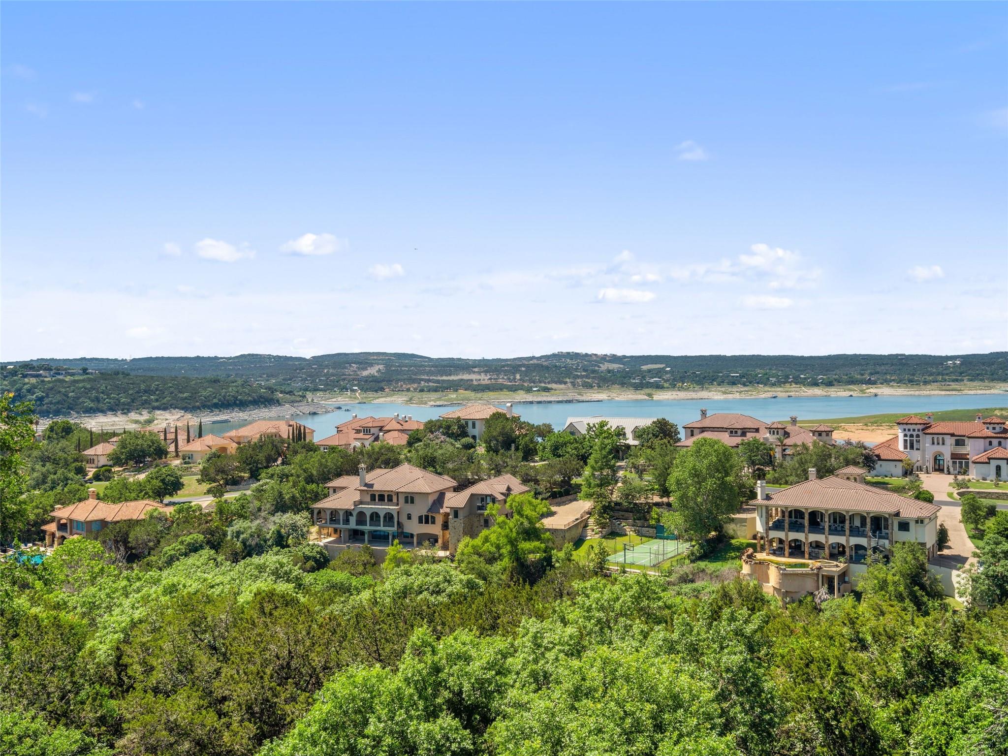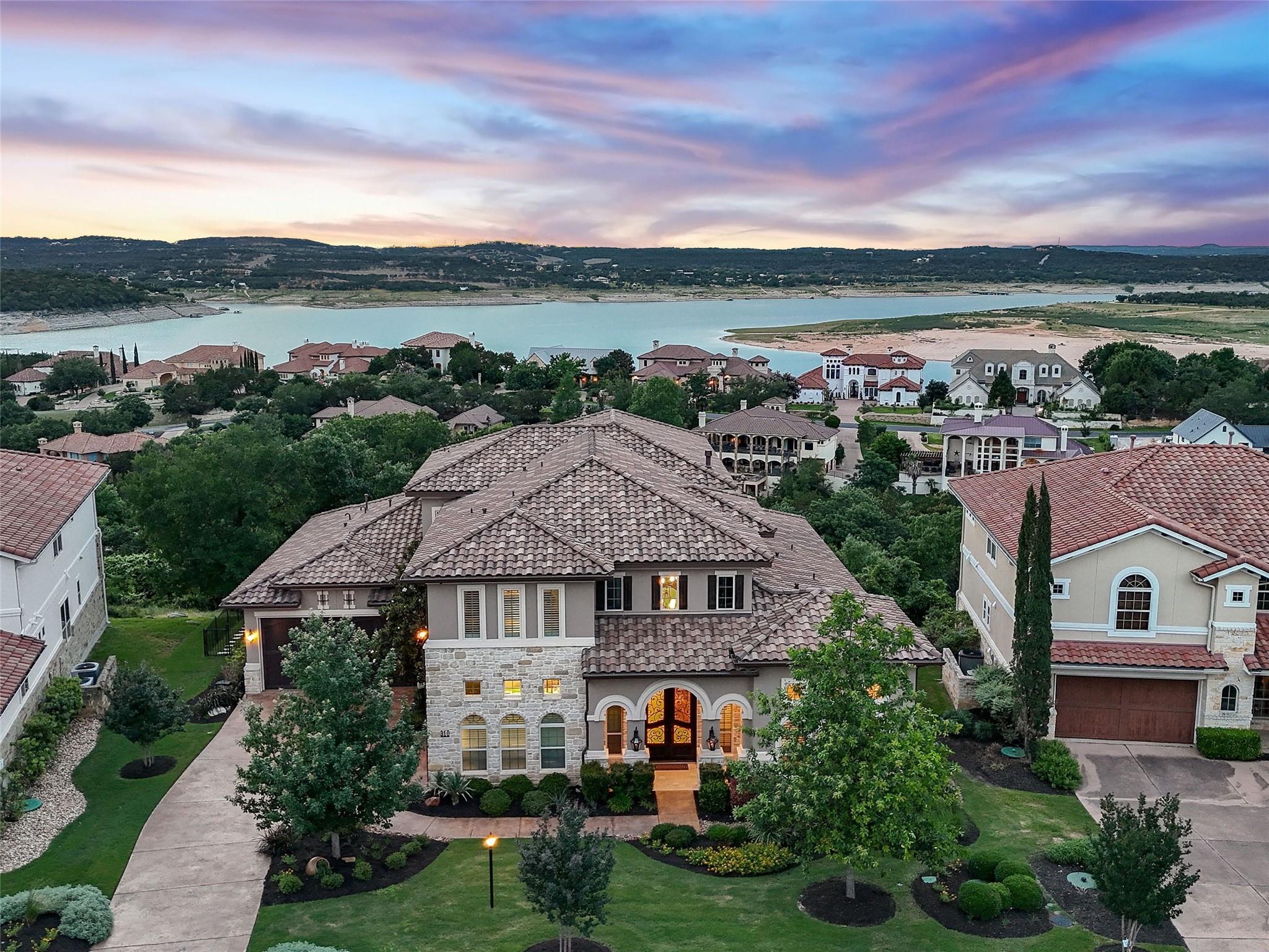 Welcome to your own slice of luxury lake view living in the exclusive gated neighborhood of the Enclave at Rough Hollow overlooking Lago Vista on Lake Travis. This stunning 5,158 square foot home boasts timeless elegance at every turn. Thoughtfully situated on one of the largest lots in Rough Hollow, (1.679 acres), the wooded back yard and lake views are stunning. The gorgeous gas lanterns and massive Cantera door entry invite you and your guests into this beautiful home with a 2-story foyer and sweeping staircase. The residence features 4 beds, 4 full baths, 2 half baths, media room, separate dining room with an amazing custom stone wine display, 2 spacious living areas, gourmet kitchen, and a private office. The flooring is hardwood and tile throughout, with only the media room being carpeted. This immaculate home is filled with natural light, an abundance of storage, an oversized 3-car garage, and a full bar upstairs for entertaining. The single garage was specifically built for boat storage. The sunset views of Lake Travis over the resort style infinity pool are extraordinary. The inviting firepit below the pool area and the full outdoor kitchen provides a peaceful place for family and friends to gather. Enjoy wildlife and greenbelt/lake views all from the serene setting of your own personal sanctuary. There is even a fenced yard for your favorite pet. The location is great, approximately 35 minutes to AUS airport, close to HEB, shopping/dining and in top-rated school district of Lake Travis ISD. The HOA amenities offered are incredible, yacht club/marina, lazy river/pool, hiking trails, fitness center, complimentary kayak/standup paddleboards, community events and Canyon Grille for delicious dining with a view! You may dock your boat at the marina or Freedom Boat club offers valet boating for a fabulous day on the lake.