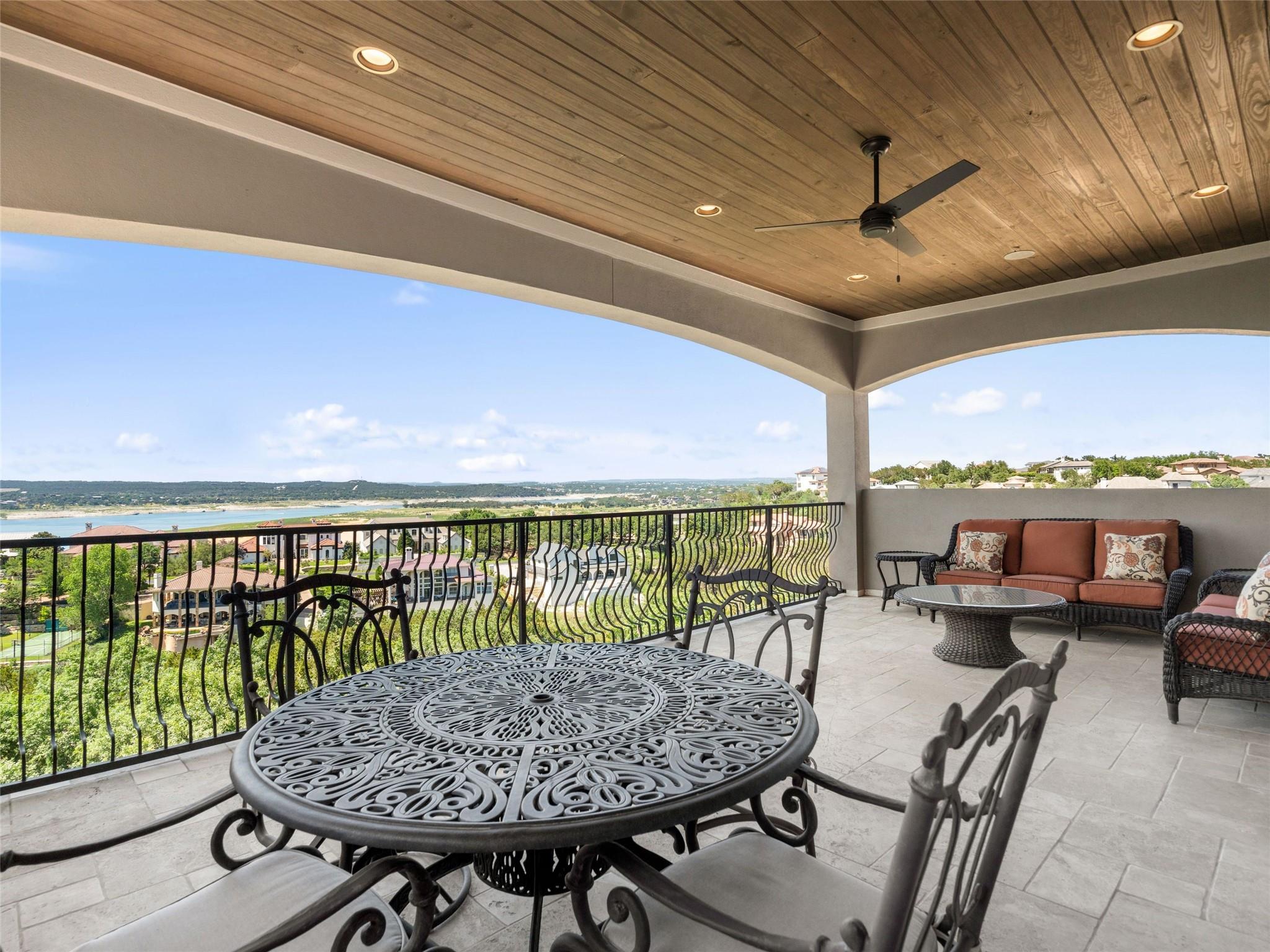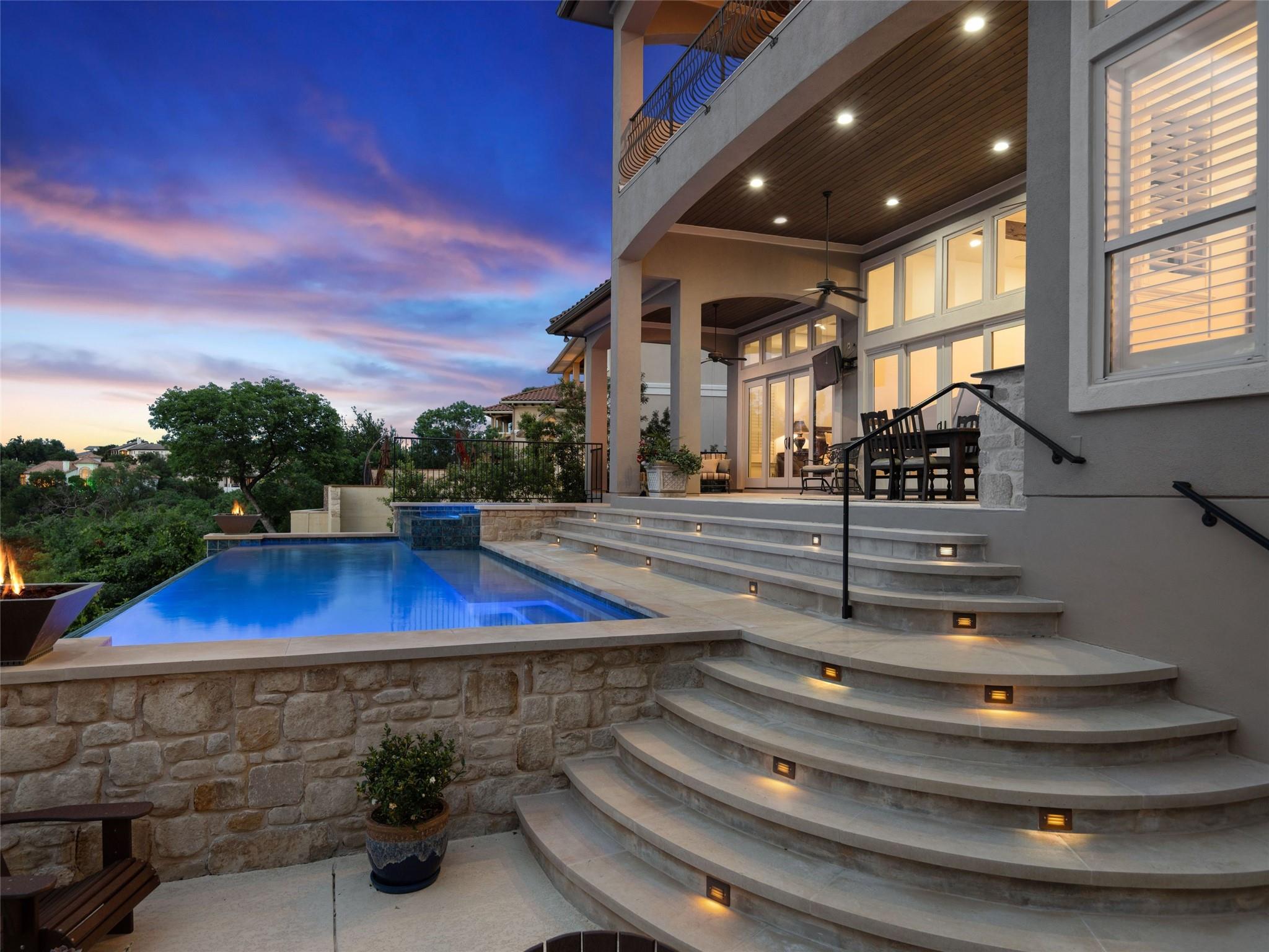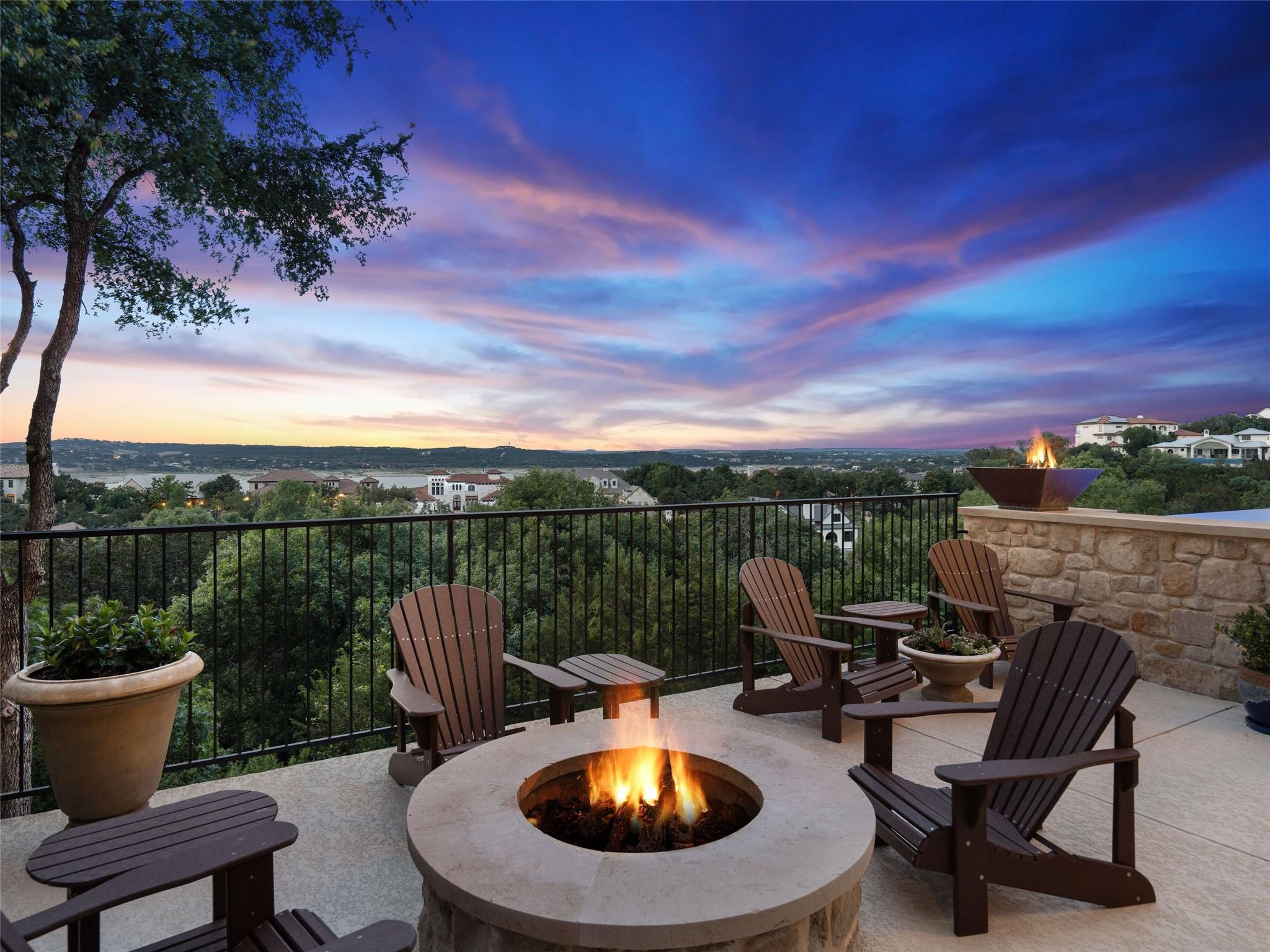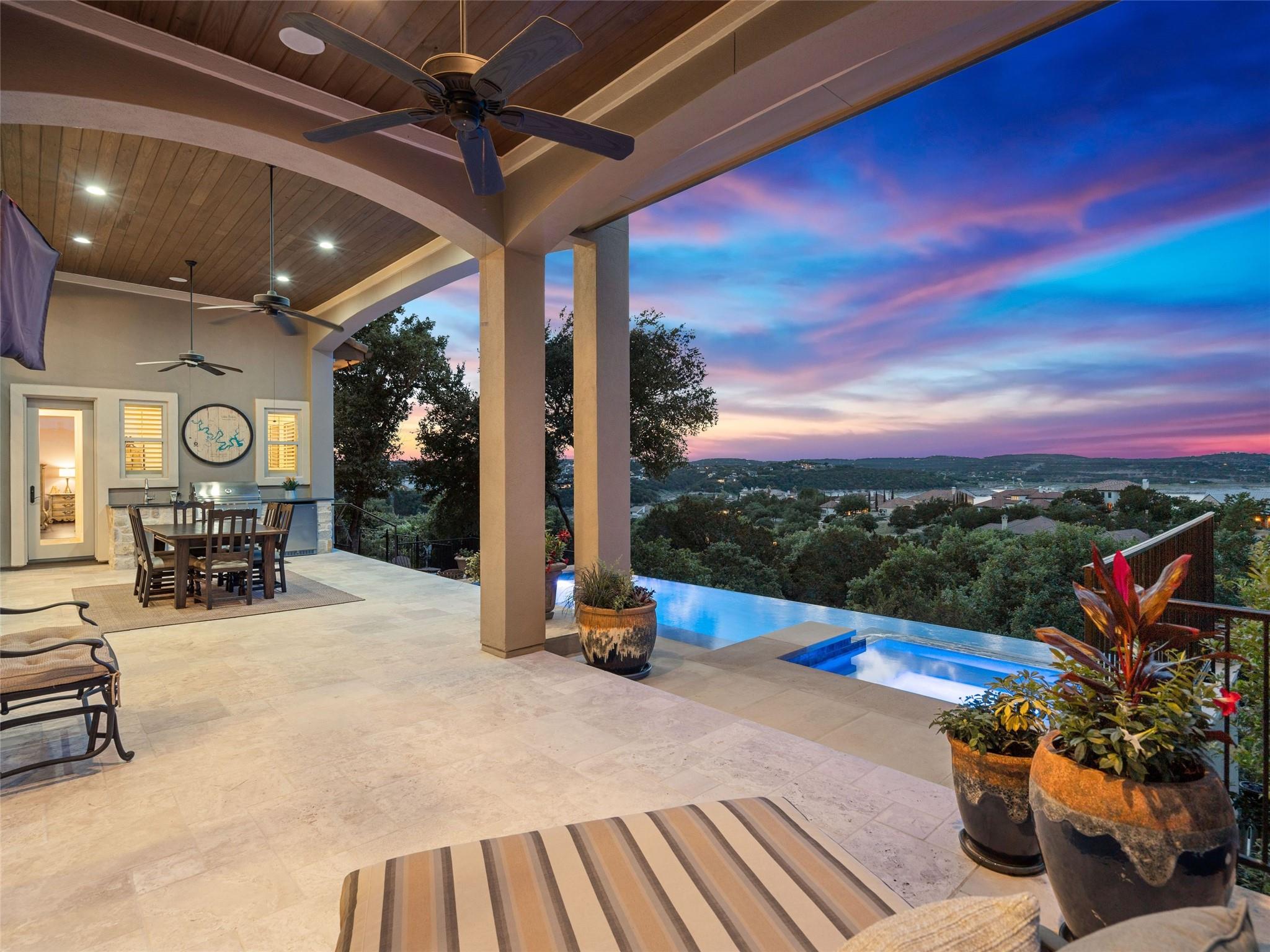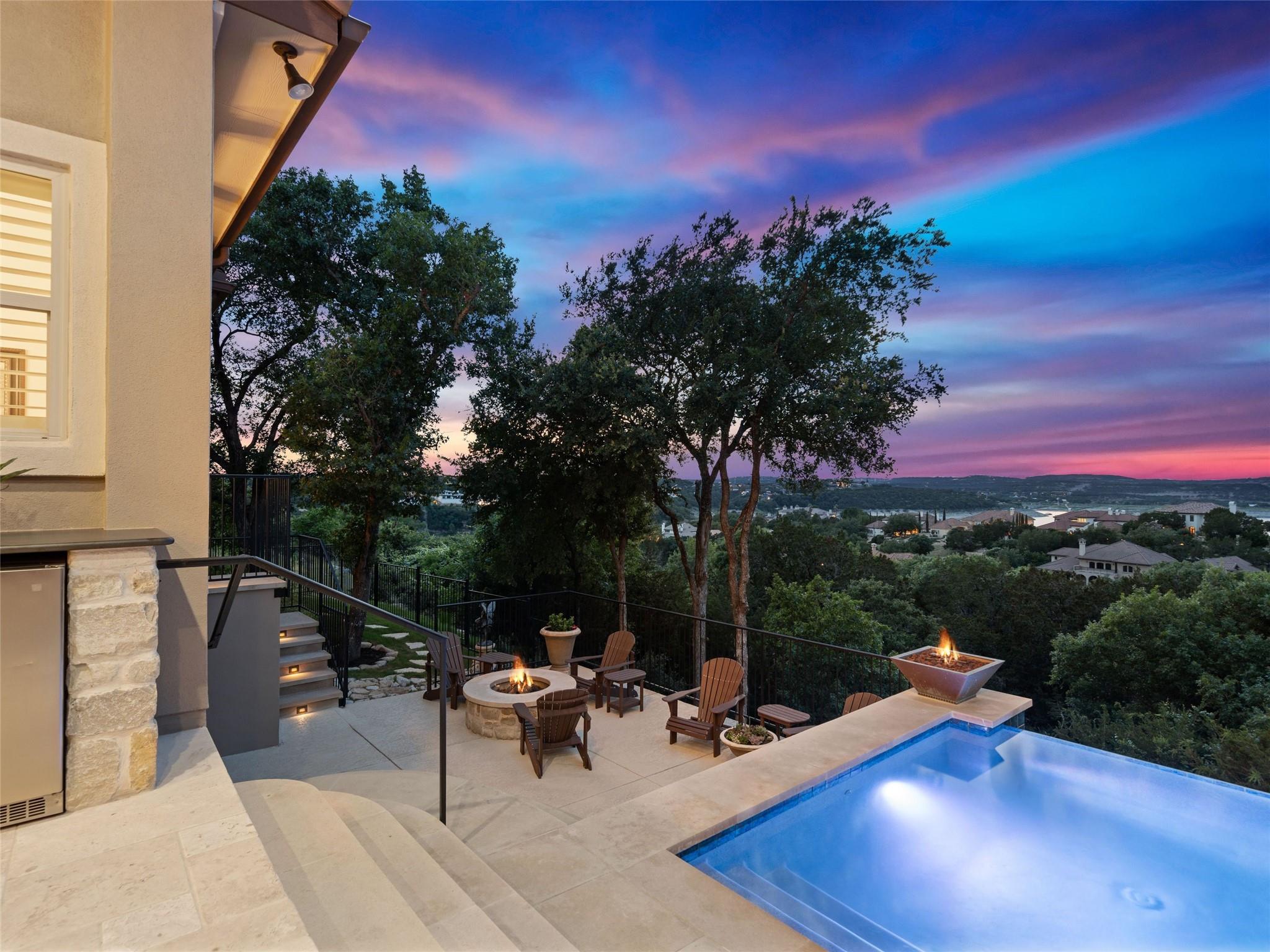 Welcome to your own slice of luxury lake view living in the exclusive gated neighborhood of the Enclave at Rough Hollow overlooking Lago Vista on Lake Travis. This stunning 5,158 square foot home boasts timeless elegance at every turn. Thoughtfully situated on one of the largest lots in Rough Hollow, (1.679 acres), the wooded back yard and lake views are stunning. The gorgeous gas lanterns and massive Cantera door entry invite you and your guests into this beautiful home with a 2-story foyer and sweeping staircase. The residence features 4 beds, 4 full baths, 2 half baths, media room, separate dining room with an amazing custom stone wine display, 2 spacious living areas, gourmet kitchen, and a private office. The flooring is hardwood and tile throughout, with only the media room being carpeted. This immaculate home is filled with natural light, an abundance of storage, an oversized 3-car garage, and a full bar upstairs for entertaining. The single garage was specifically built for boat storage. The sunset views of Lake Travis over the resort style infinity pool are extraordinary. The inviting firepit below the pool area and the full outdoor kitchen provides a peaceful place for family and friends to gather. Enjoy wildlife and greenbelt/lake views all from the serene setting of your own personal sanctuary. There is even a fenced yard for your favorite pet. The location is great, approximately 35 minutes to AUS airport, close to HEB, shopping/dining and in top-rated school district of Lake Travis ISD. The HOA amenities offered are incredible, yacht club/marina, lazy river/pool, hiking trails, fitness center, complimentary kayak/standup paddleboards, community events and Canyon Grille for delicious dining with a view! You may dock your boat at the marina or Freedom Boat club offers valet boating for a fabulous day on the lake.