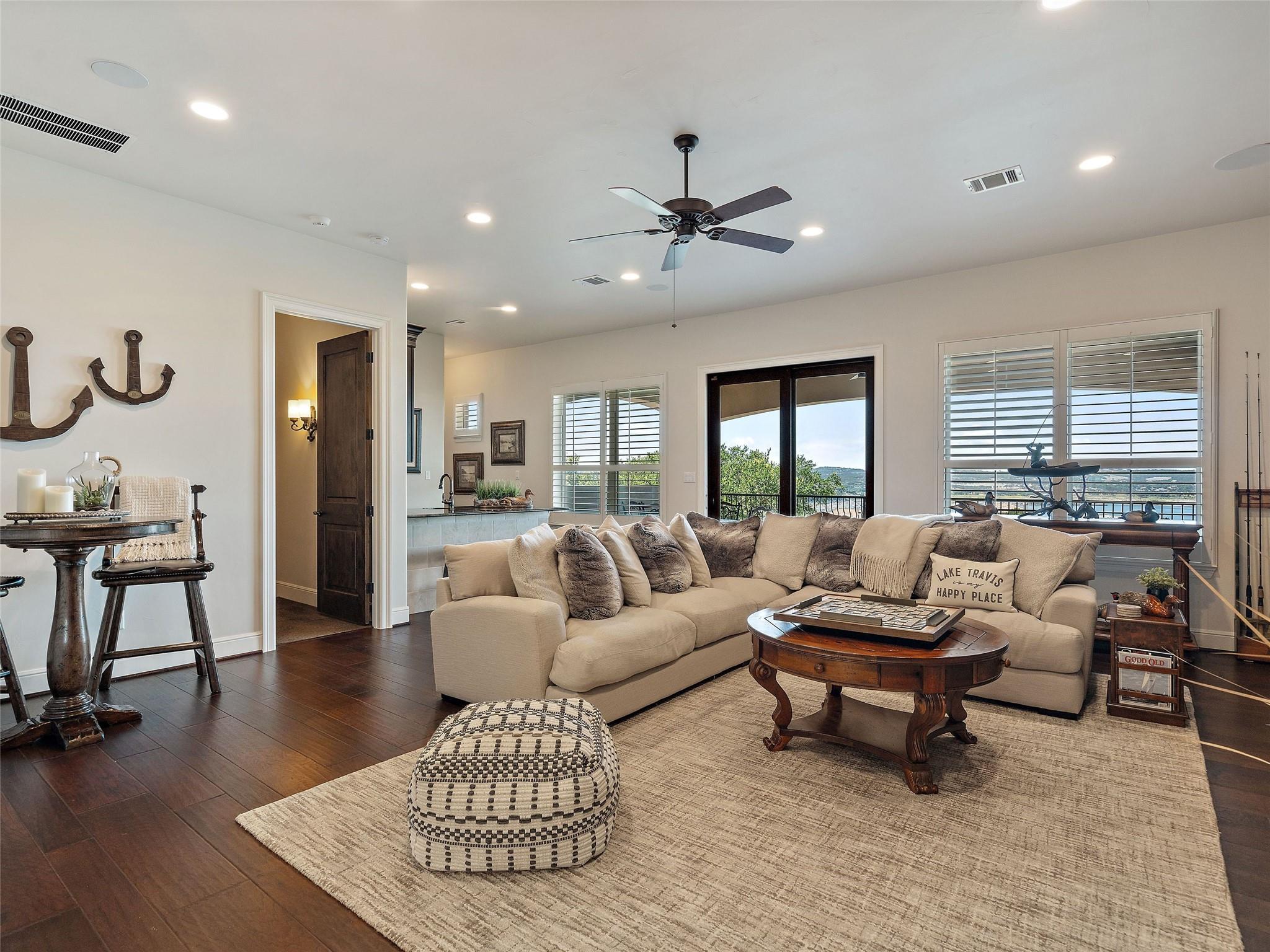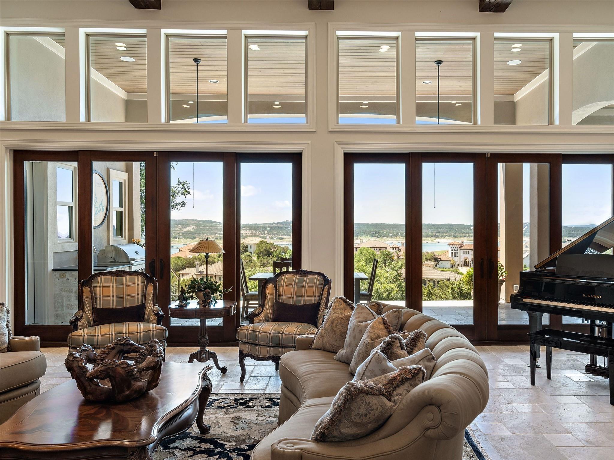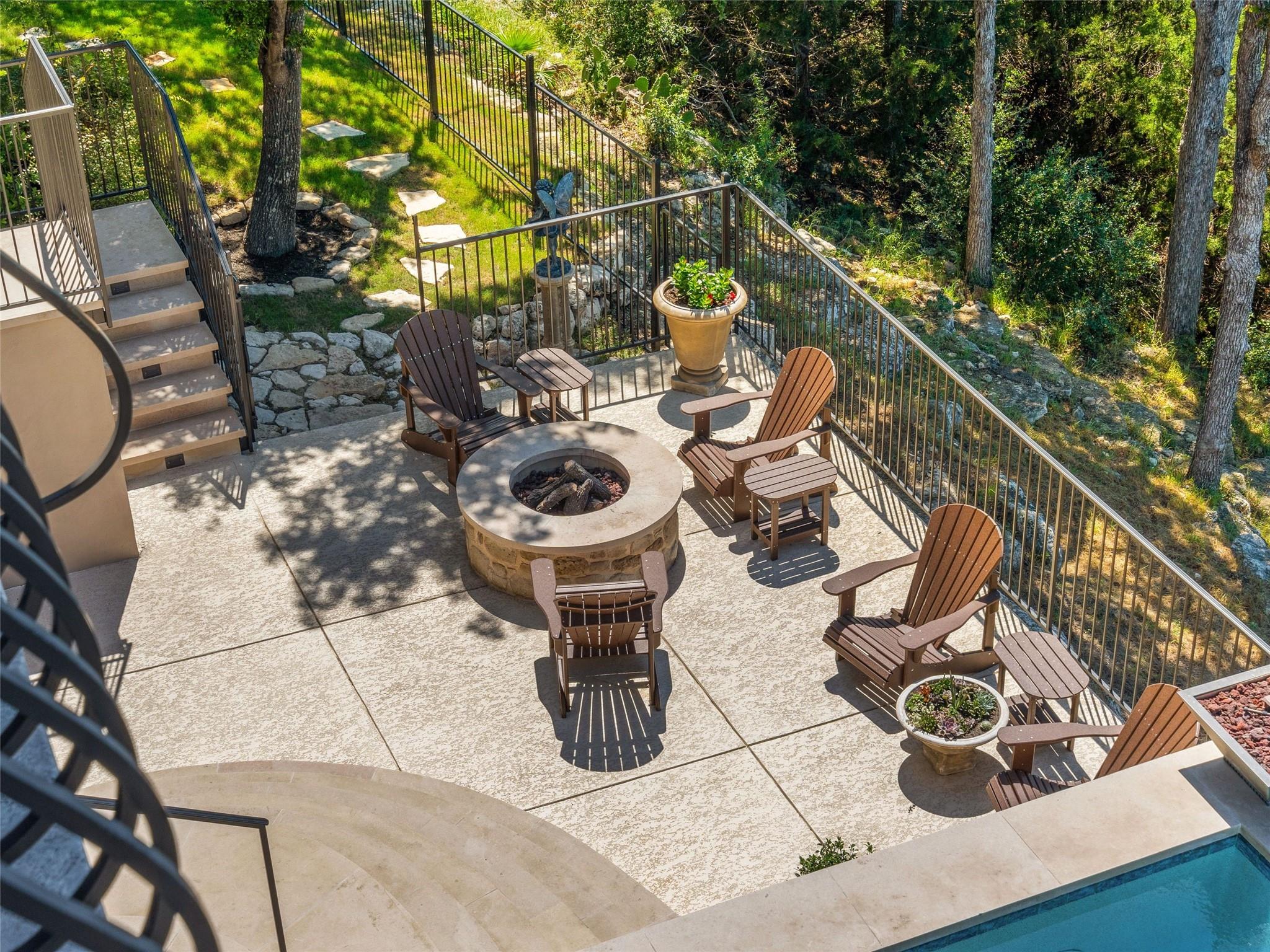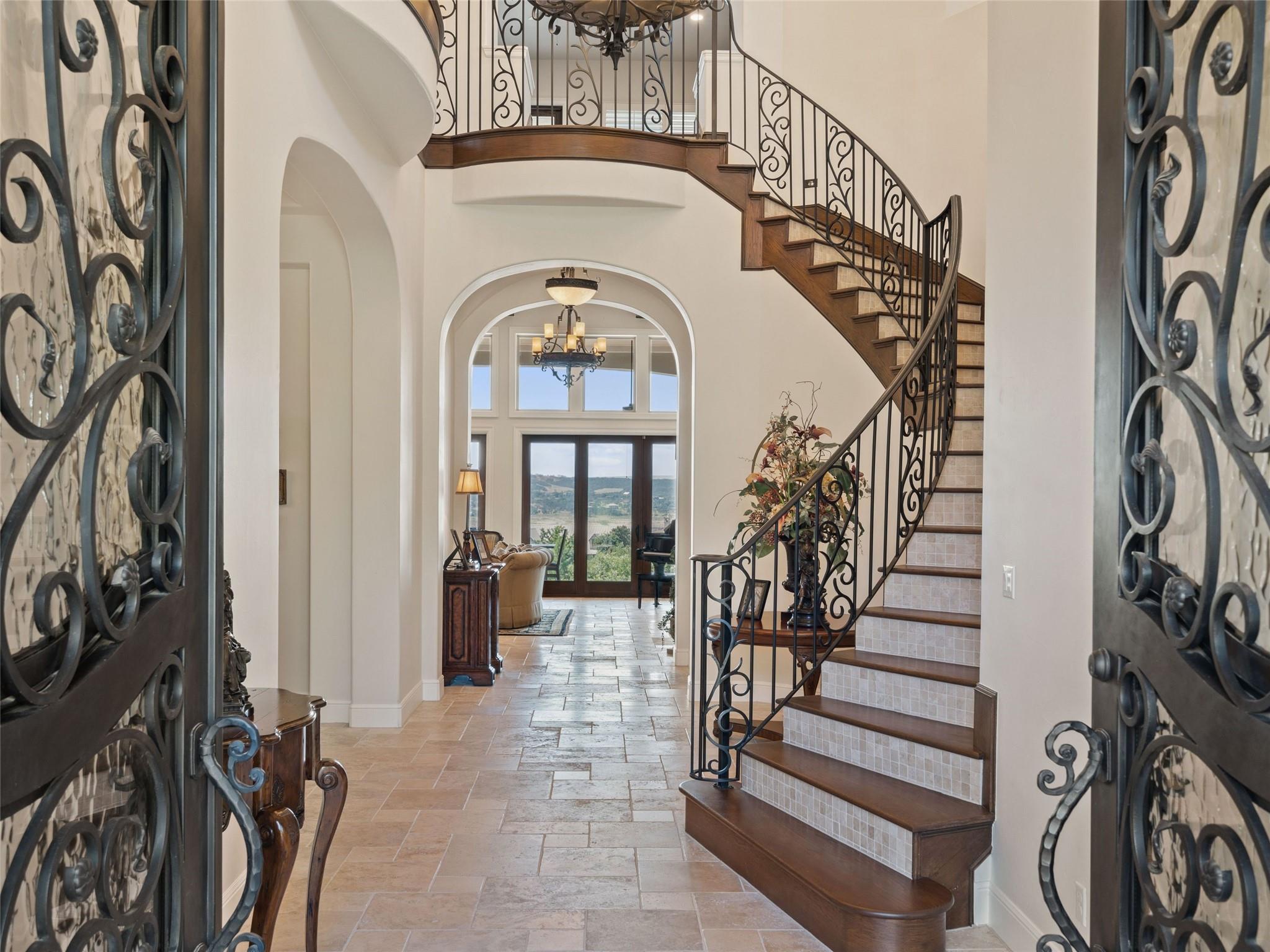 Welcome to your own slice of luxury lake view living in the exclusive gated neighborhood of the Enclave at Rough Hollow overlooking Lago Vista on Lake Travis. This stunning 5,158 square foot home boasts timeless elegance at every turn. Thoughtfully situated on one of the largest lots in Rough Hollow, (1.679 acres), the wooded back yard and lake views are stunning. The gorgeous gas lanterns and massive Cantera door entry invite you and your guests into this beautiful home with a 2-story foyer and sweeping staircase. The residence features 4 beds, 4 full baths, 2 half baths, media room, separate dining room with an amazing custom stone wine display, 2 spacious living areas, gourmet kitchen, and a private office. The flooring is hardwood and tile throughout, with only the media room being carpeted. This immaculate home is filled with natural light, an abundance of storage, an oversized 3-car garage, and a full bar upstairs for entertaining. The single garage was specifically built for boat storage. The sunset views of Lake Travis over the resort style infinity pool are extraordinary. The inviting firepit below the pool area and the full outdoor kitchen provides a peaceful place for family and friends to gather. Enjoy wildlife and greenbelt/lake views all from the serene setting of your own personal sanctuary. There is even a fenced yard for your favorite pet. The location is great, approximately 35 minutes to AUS airport, close to HEB, shopping/dining and in top-rated school district of Lake Travis ISD. The HOA amenities offered are incredible, yacht club/marina, lazy river/pool, hiking trails, fitness center, complimentary kayak/standup paddleboards, community events and Canyon Grille for delicious dining with a view! You may dock your boat at the marina or Freedom Boat club offers valet boating for a fabulous day on the lake.