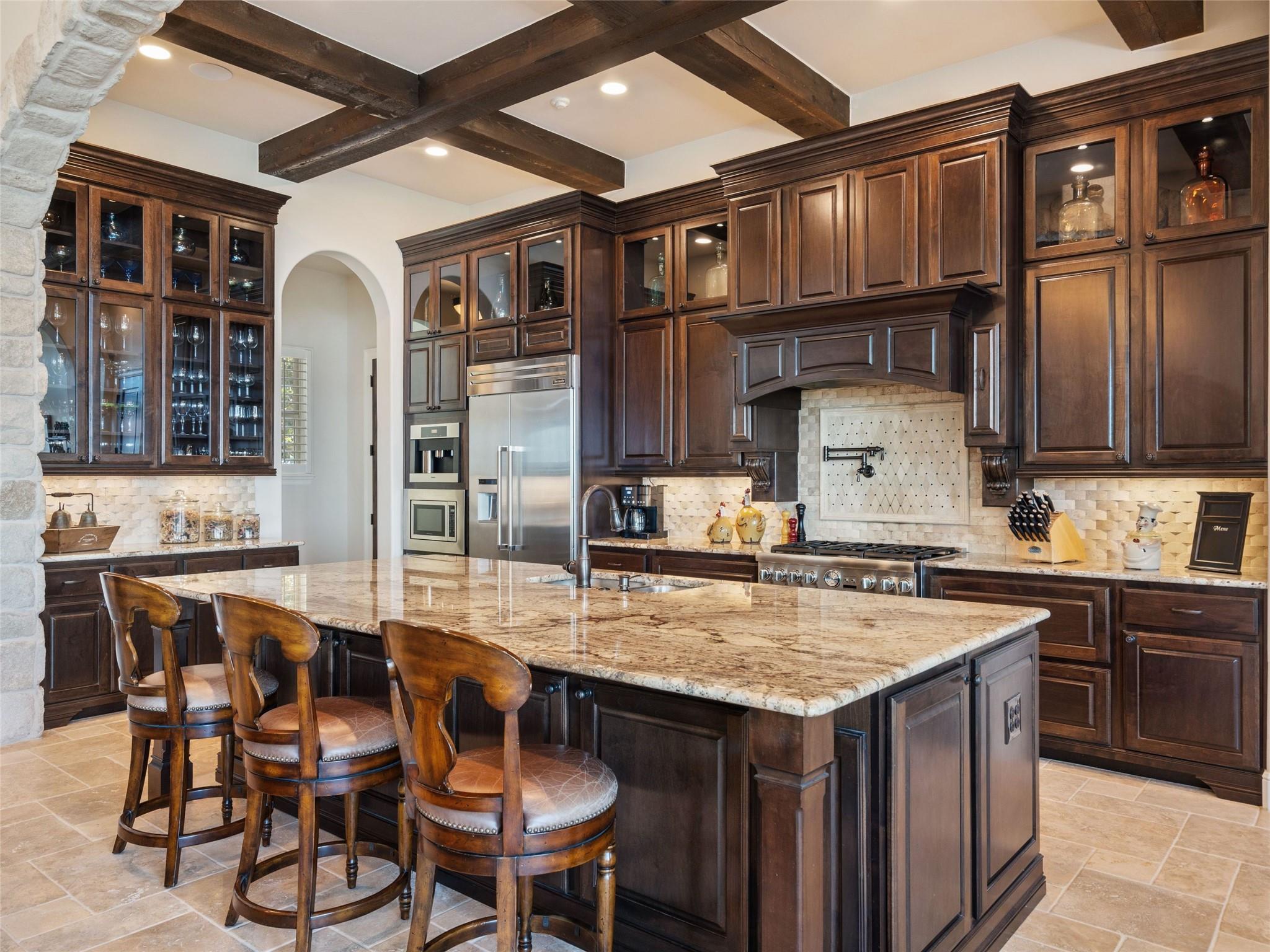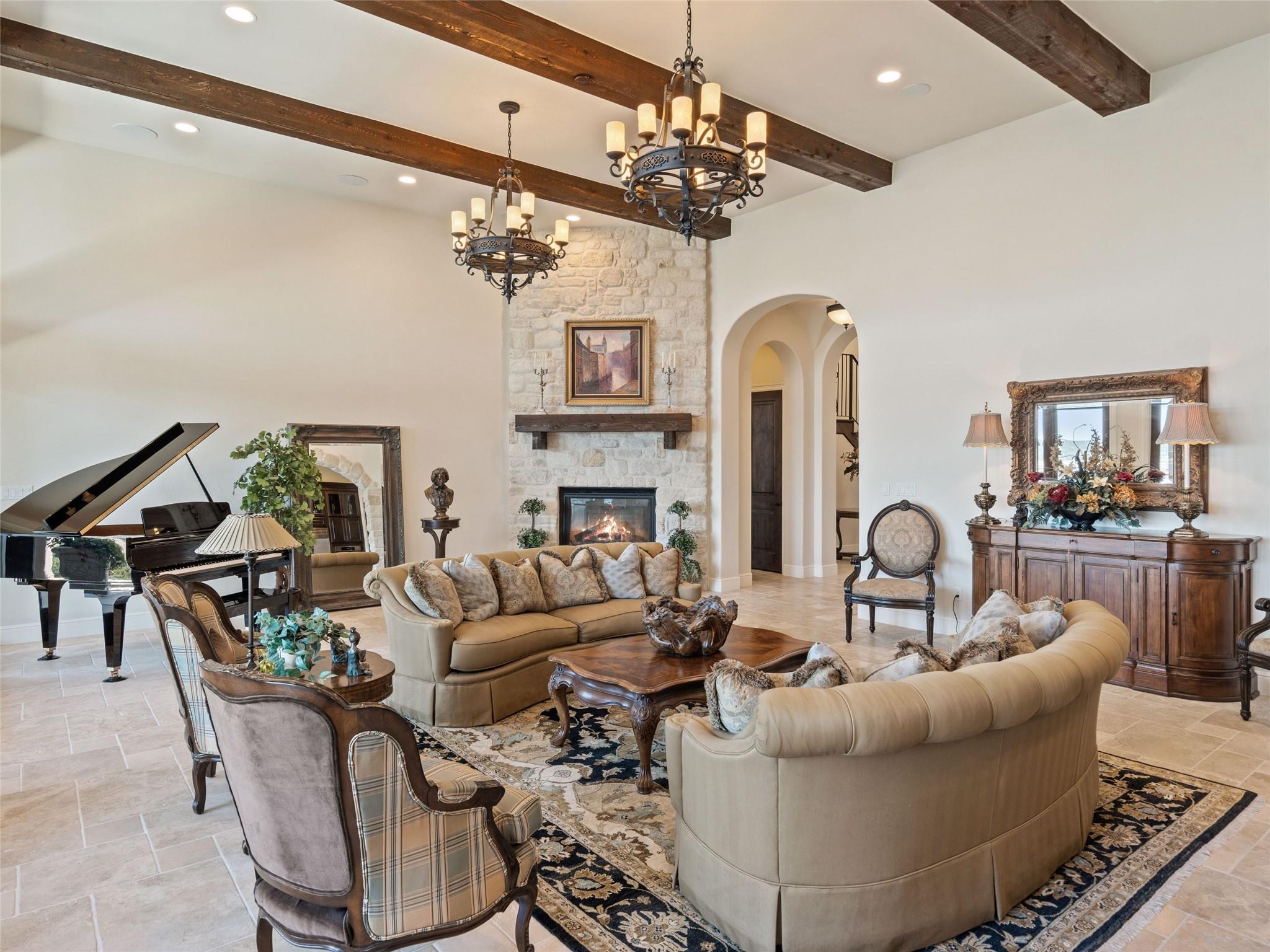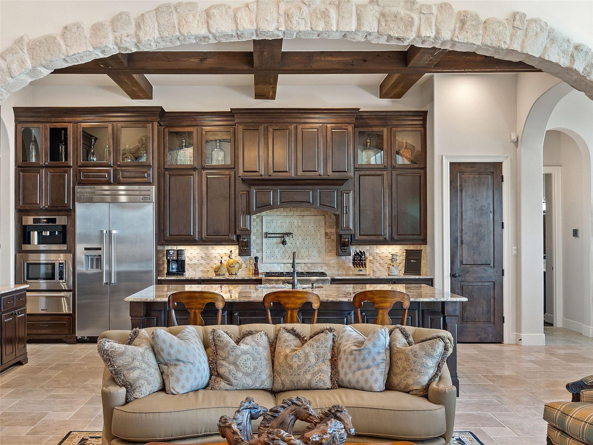 | Interior Features | Bar, Bookcases, Breakfast Bar, Ceiling Fan(s), Beamed Ceilings, High Ceilings, Central Vacuum, Entrance Foyer, Interior Steps, Kitchen Island, Multiple Dining Areas, Multiple Living Areas, Pantry, Primary Bedroom on Main, Recessed Lighting, Soaking Tub, Walk-In Closet(s), Washer Hookup, Wet Bar, Wired for Sound | |