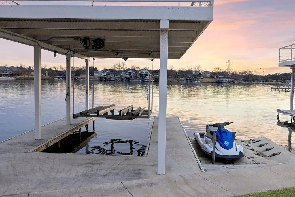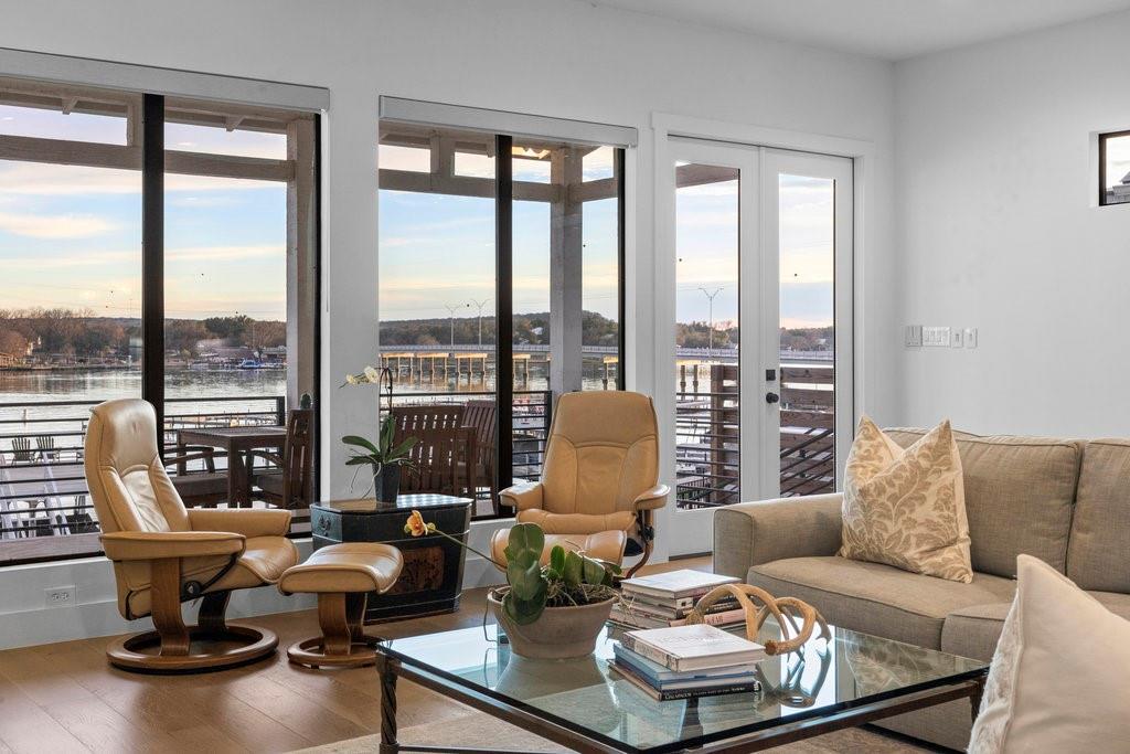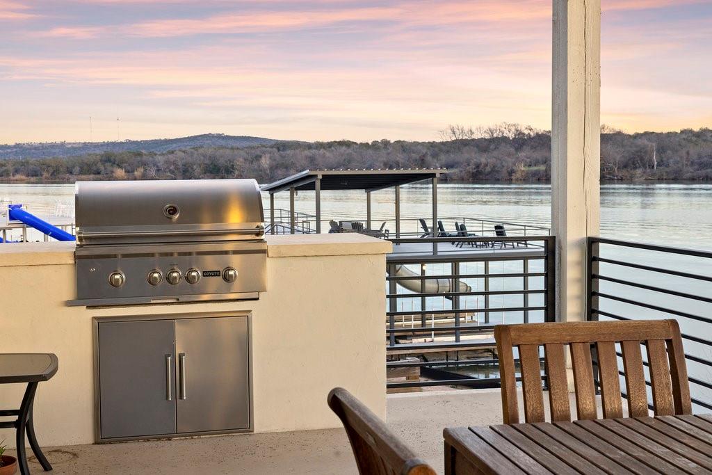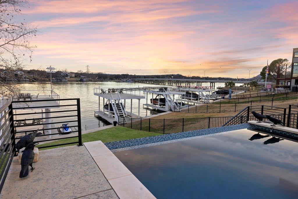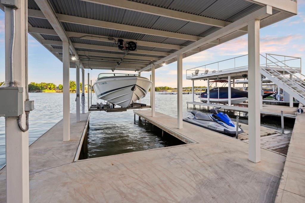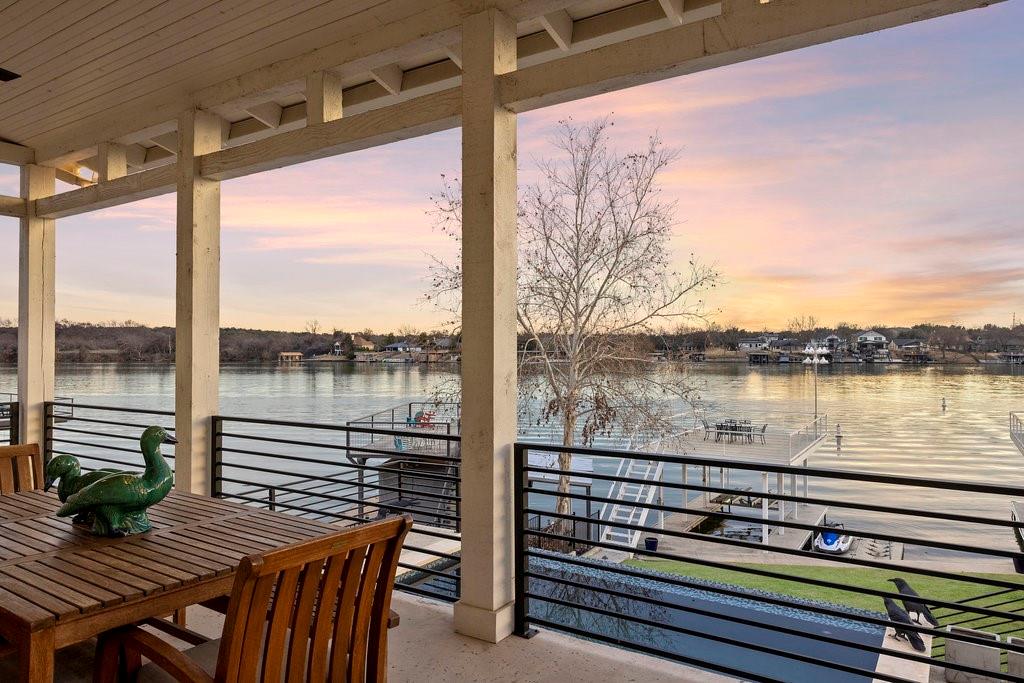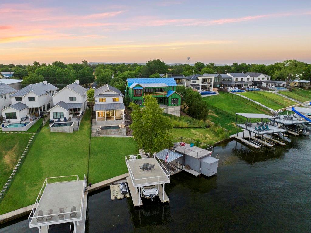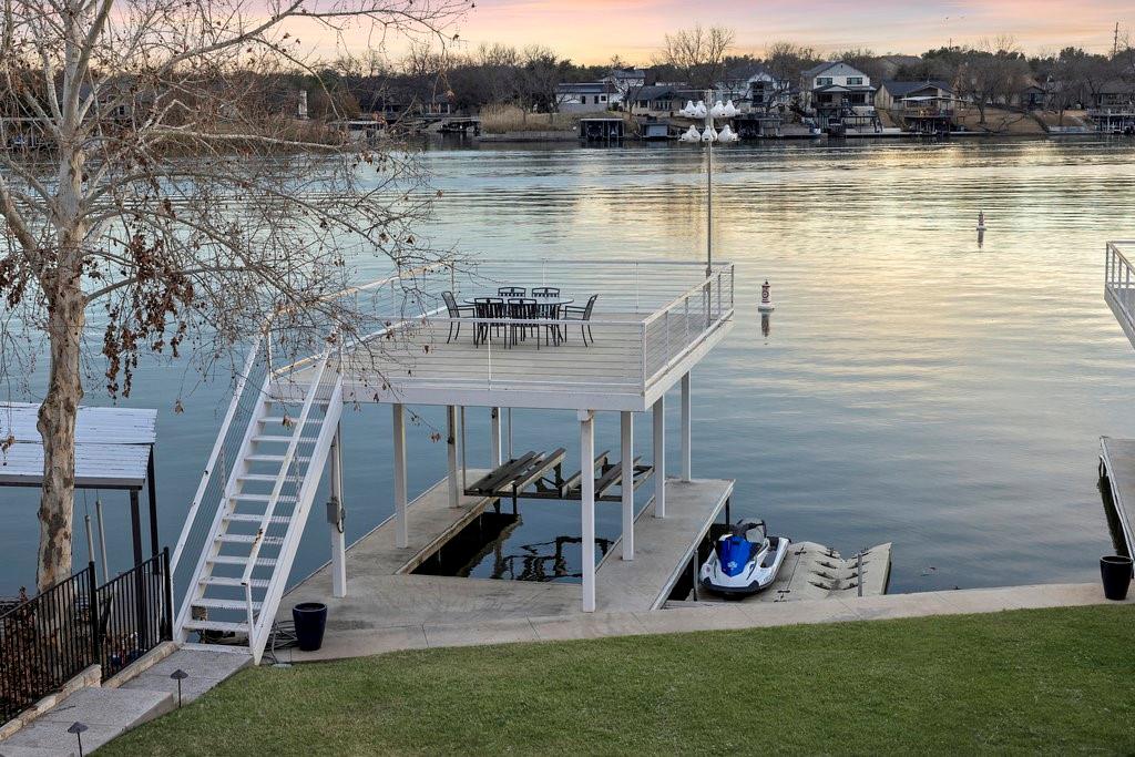 At 1322 Euel Moore, you'll find a stunning lakefront property situated on the beautiful shores of Lake LBJ. With its prime location on open water, this home offers sweeping views as you enjoy the south facing orientation. Bring your boat, because this property includes a universal boat cradle with the ability to fit a wide range of boats; anything from a V hull to a pontoon. Outside, the boat dock, patio above the dock, two personal watercraft slips, covered deck, grill, and in-ground heated pool creates the perfect setting for entertaining or simply unwinding. As you step inside, you'll be greeted by soaring ceilings and charming shiplap accents that infuse the home with a warm and inviting atmosphere. The first floor primary suite ensures a private, relaxing retreat. Upstairs are the three additional bedrooms, three full bathrooms, as well as a spacious family/bunk area. Sleeps 12 comfortably. The open living, dining, and kitchen provide a seamless flow, making it easy to enjoy time with loved ones while taking in the scenic lake views through the large windows. Throughout you'll find thoughtful upgrades that add both style and functionality. With a perfect location on the water, desirable amenities, walking distance to Boat Town Burger Bar, and a 2 min drive to HEB, plus an excellent short term rental opportunity, you can embrace the lake house you've always wanted.