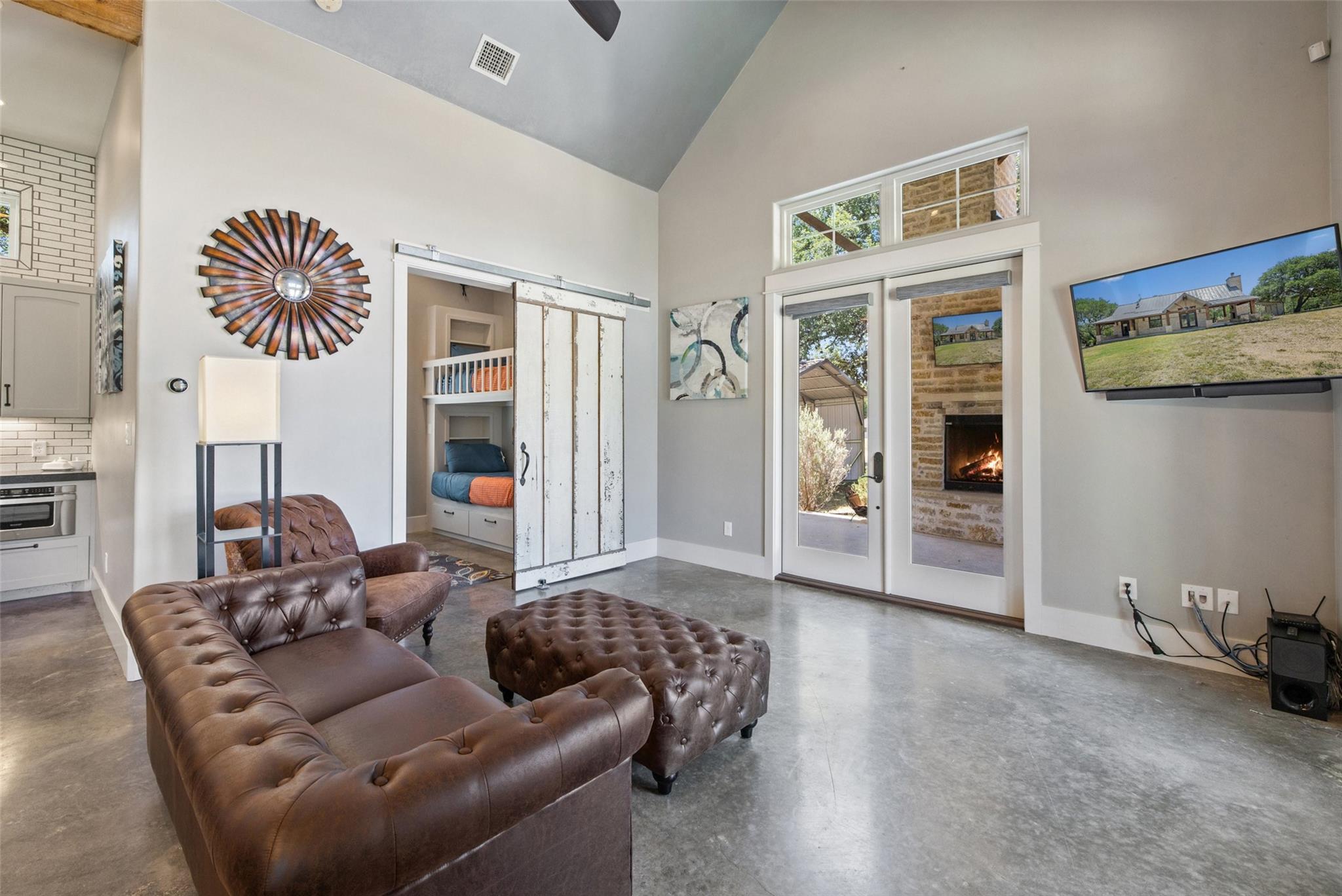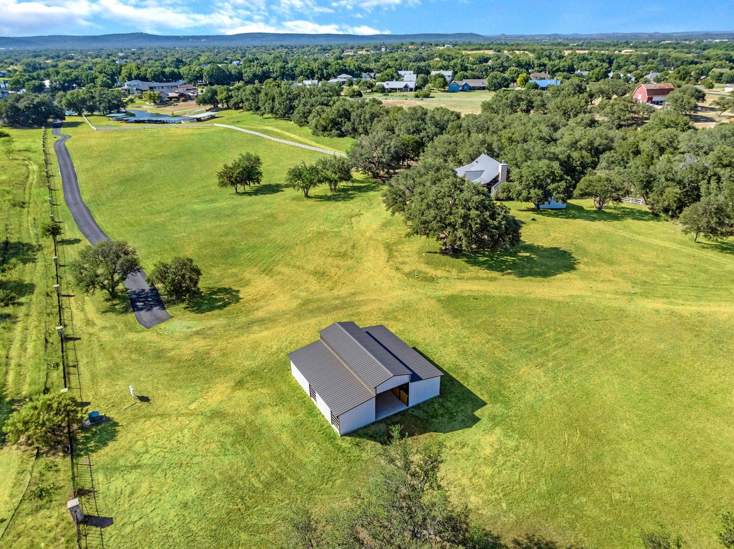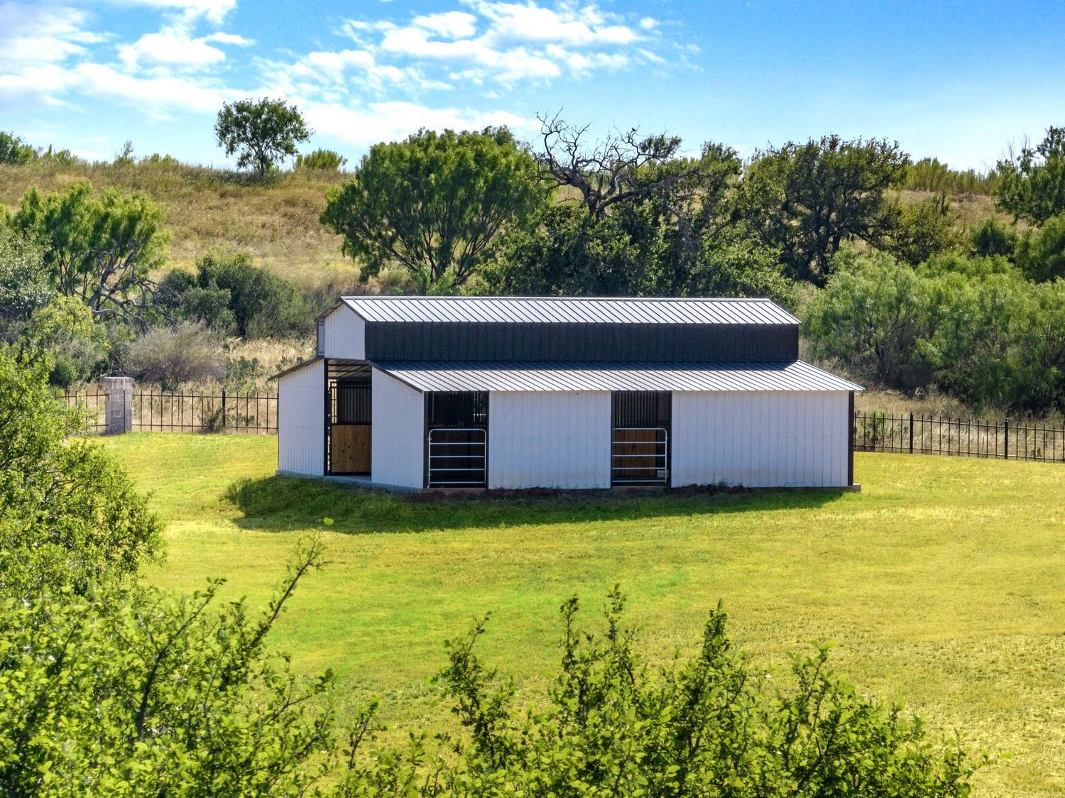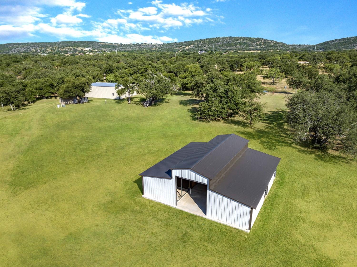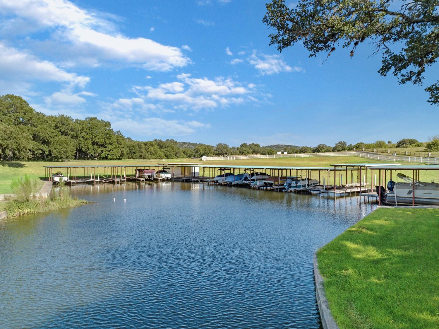 This is no ordinary find - 20 acres with 100’ of LBJ waterfront is an extraordinary discovery! The unspoiled waterfront with two jet ski slips, beckons for limitless aquatic escapades. Boating enthusiasts will find delight in the dual deeded boat slips at the nearby community marina. Indoors, you have vaulted beamed ceilings combined with airy concrete floors, creating a sense of lightness as natural light streams through the expansive windows and patio doors, seamlessly merging the indoor and outdoor realms. The chef's kitchen, adorned with gas cooking and a generous center island with bar seating, features built-in appliances and extends into an adjacent dining area with outdoor views and shiplap accent wall. The secondary bedroom offers guest accommodations with built-in bunk beds, while the Owner’s Suite becomes a peaceful sanctuary, granting private outdoor access to the covered patio. This outdoor oasis is equipped with a masonry fireplace and ceiling fans, elevating your outdoor experience. The expansive property boasts a host of exceptional amenities. The 60 x 40 workshop provides an ideal space for pursuing hobbies. Equestrian enthusiasts will be thrilled by the 4-stall horse barn with direct turnout access to the rolling acreage. Don't let this hill country lakefront property slip away with an array of outdoor and waterfront amenities.