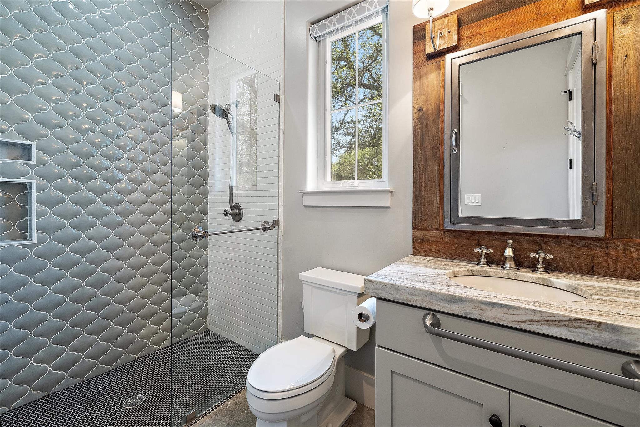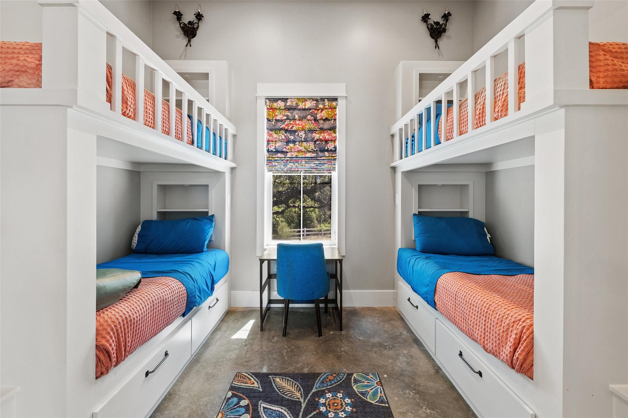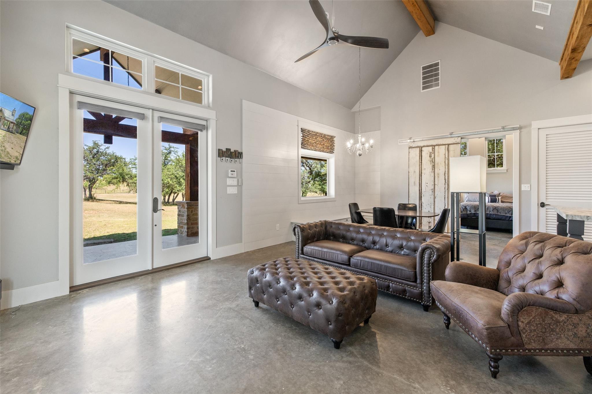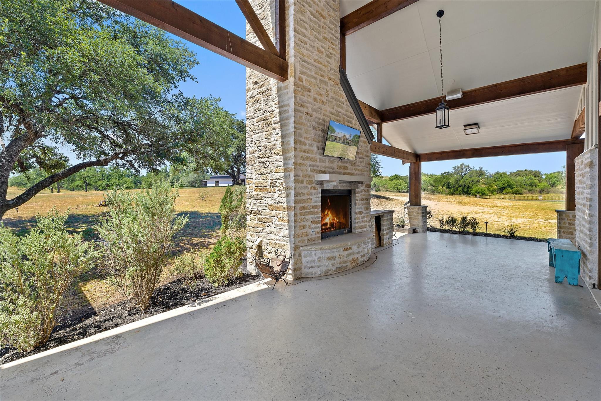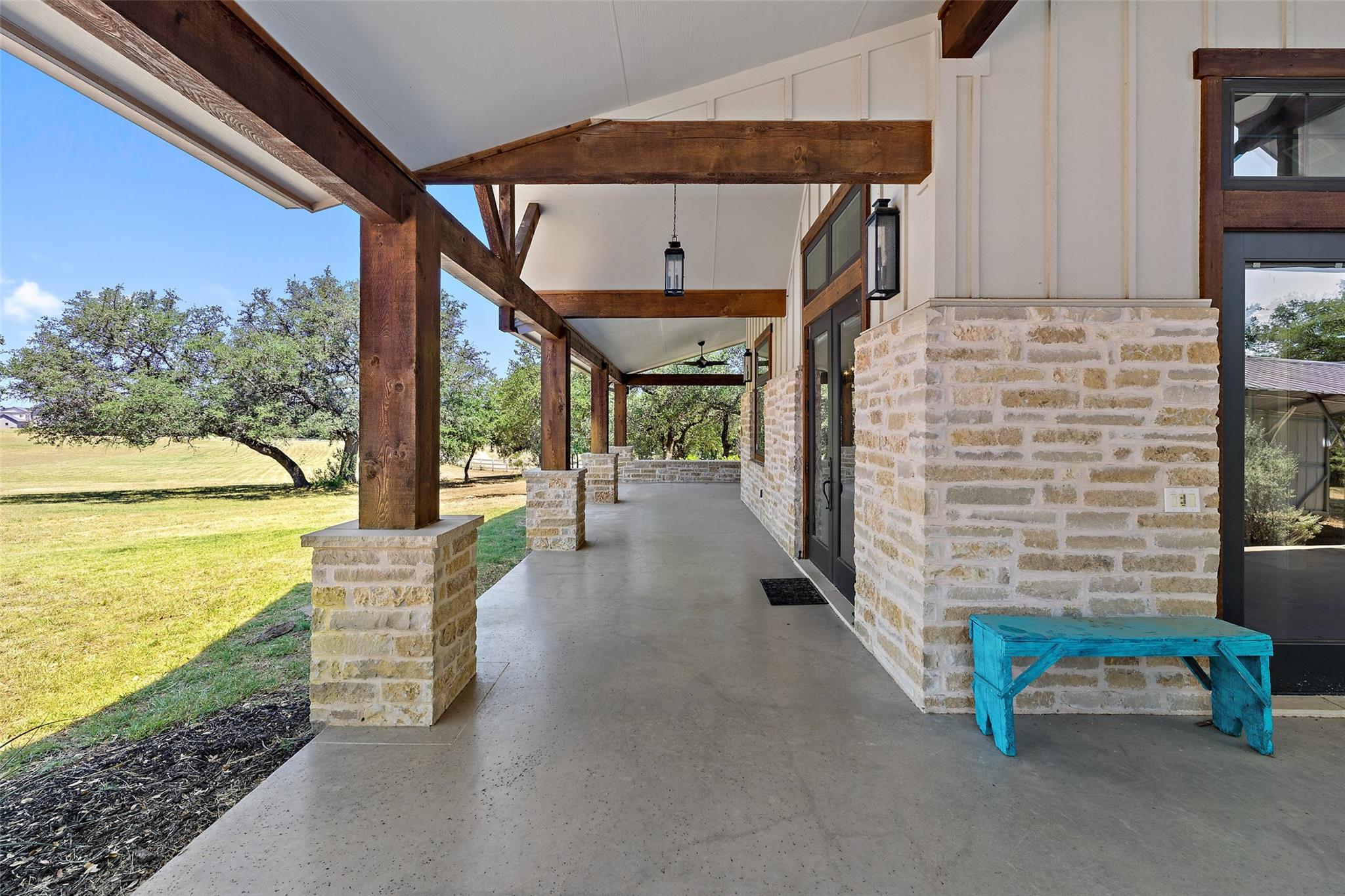 This is no ordinary find - 20 acres with 100’ of LBJ waterfront is an extraordinary discovery! The unspoiled waterfront with two jet ski slips, beckons for limitless aquatic escapades. Boating enthusiasts will find delight in the dual deeded boat slips at the nearby community marina. Indoors, you have vaulted beamed ceilings combined with airy concrete floors, creating a sense of lightness as natural light streams through the expansive windows and patio doors, seamlessly merging the indoor and outdoor realms. The chef's kitchen, adorned with gas cooking and a generous center island with bar seating, features built-in appliances and extends into an adjacent dining area with outdoor views and shiplap accent wall. The secondary bedroom offers guest accommodations with built-in bunk beds, while the Owner’s Suite becomes a peaceful sanctuary, granting private outdoor access to the covered patio. This outdoor oasis is equipped with a masonry fireplace and ceiling fans, elevating your outdoor experience. The expansive property boasts a host of exceptional amenities. The 60 x 40 workshop provides an ideal space for pursuing hobbies. Equestrian enthusiasts will be thrilled by the 4-stall horse barn with direct turnout access to the rolling acreage. Don't let this hill country lakefront property slip away with an array of outdoor and waterfront amenities.
