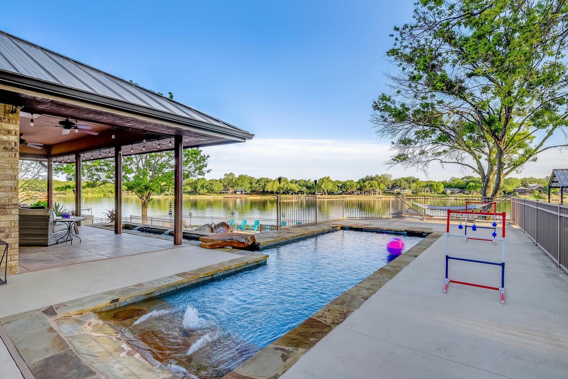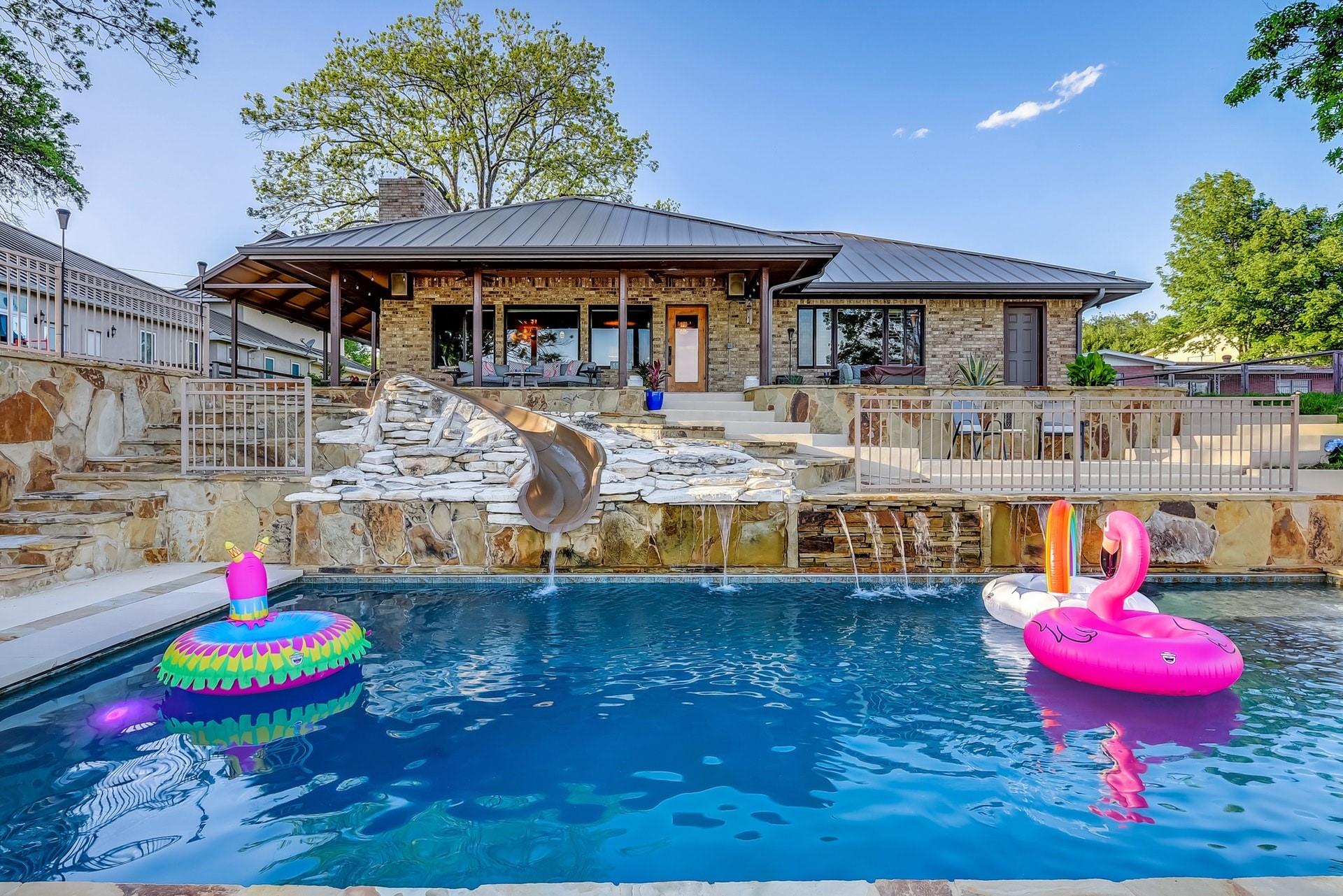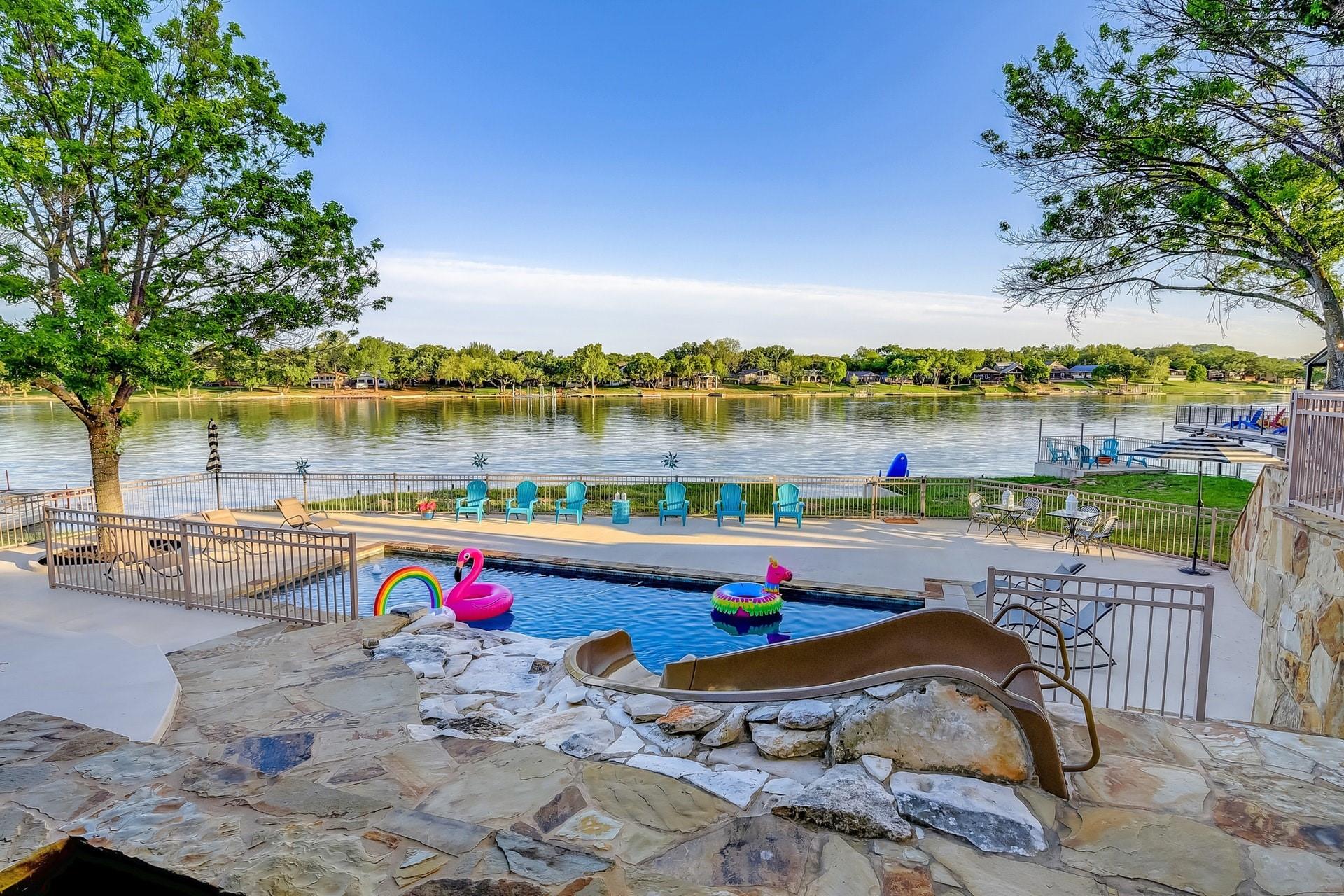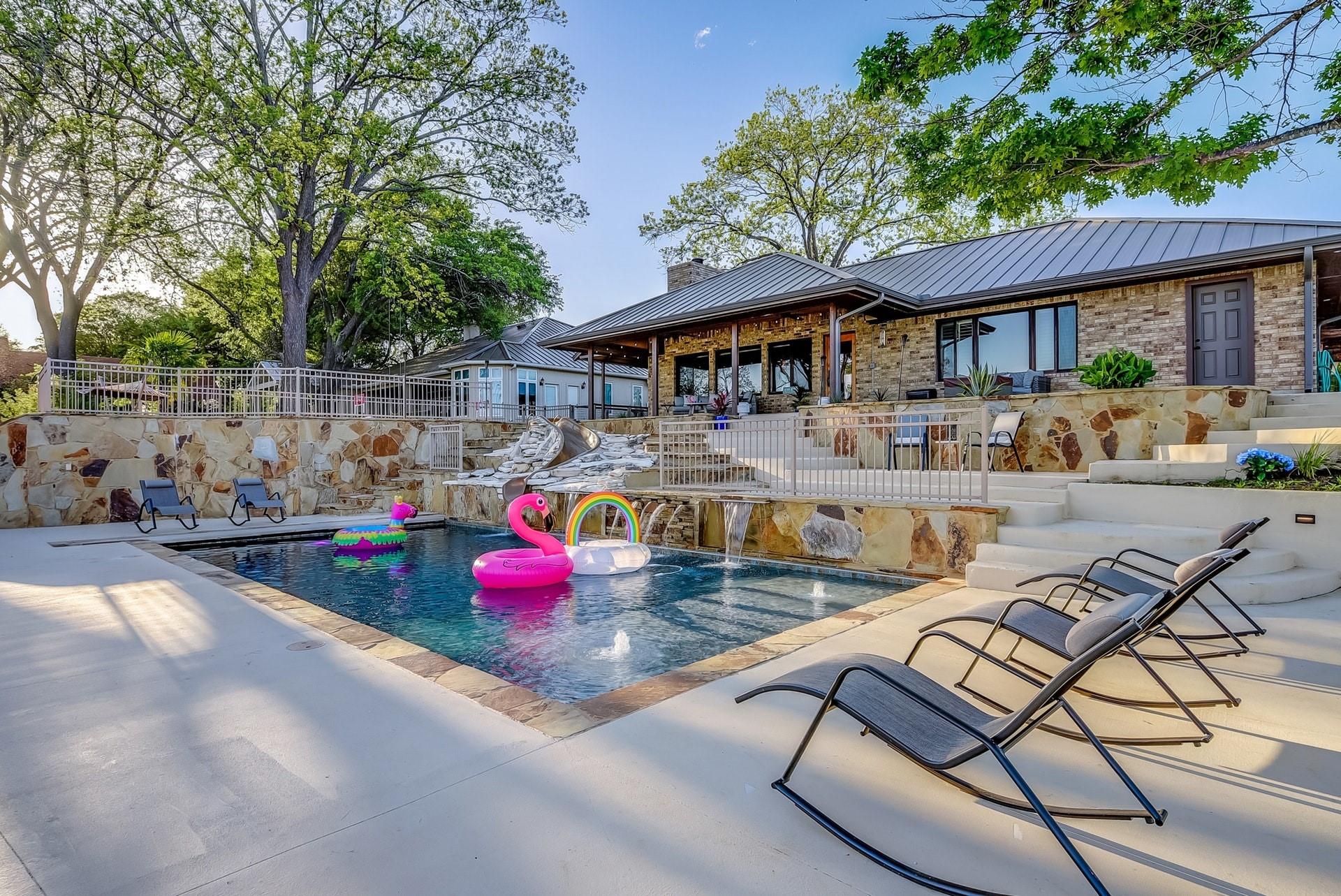 Incredible, vacation rental opportunity with proven track record on Lake LBJ! 4 bedroom, 2.5 bath single-story home with multiple living spaces, two pools, a water slide and a newly constructed boat dock with two slips and room for waverunners. The large lot is over 1/2 acre with 105 feet of south-facing waterfront on the Llano arm of Lake LBJ with outstanding views of the 2900 bridge in one direction and Packsaddle Mountain in the other. Multiple indoor and outdoor living spaces including The Game Room, and a covered outdoor kitchen overlooking one of the pools. Outstanding location close to Boat Town, HEB, Lazy Heron Coffee and the new Hoopers Restuarant in Kingsland. This home is being offered fully-furnished for a turn-key opportunity to start owning your own cash-flowing waterfront asset in the Texas Hill Country. This home did not flood in 2018 and has been well-maintained by its current owners as a 5-star rental property. Many unique features help elevate this property and allow it to stand out amongst the rental competition. Qualified buyers reach out to schedule a tour and come see this opportunity in the Texas Hill Country!
