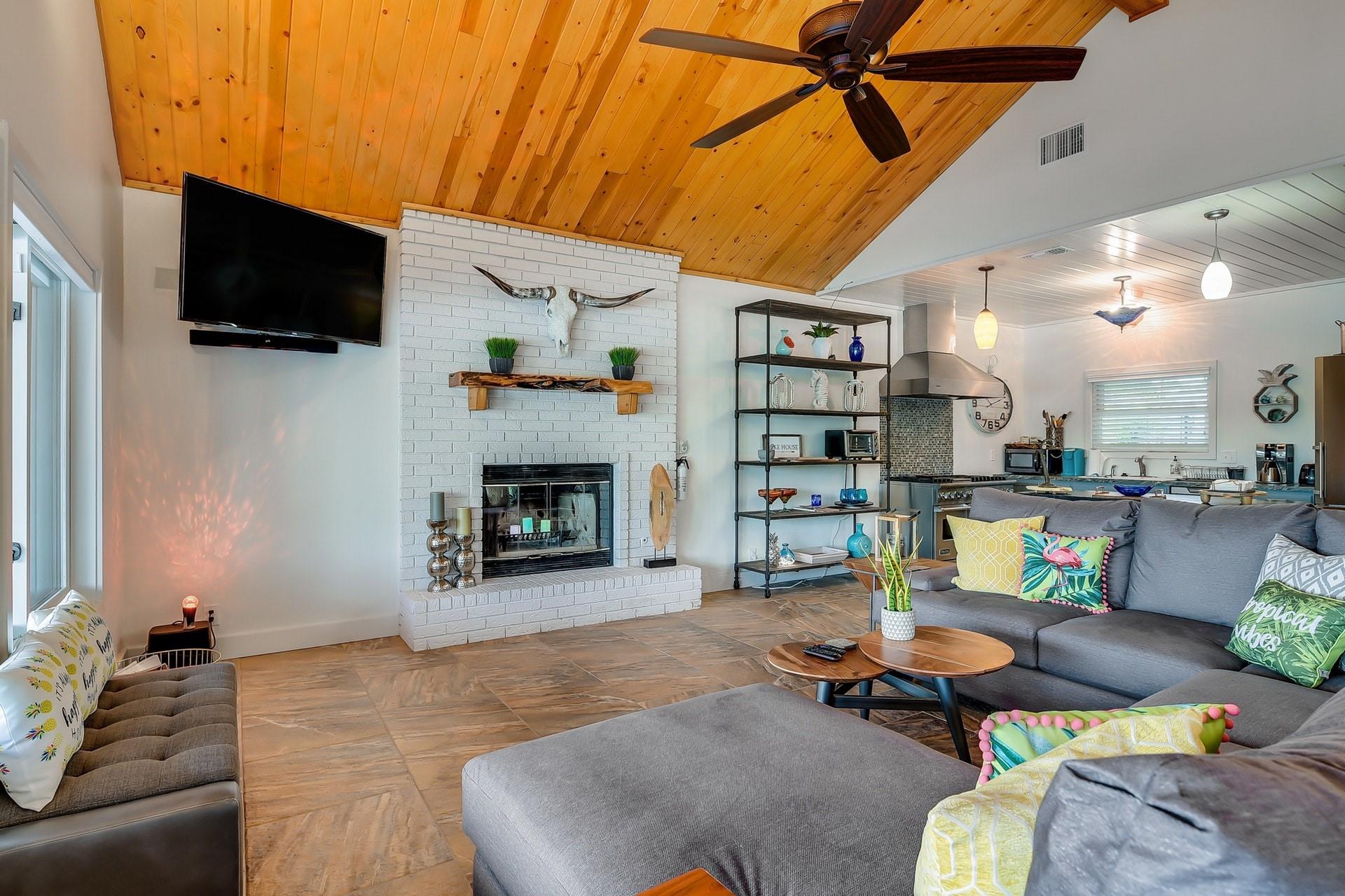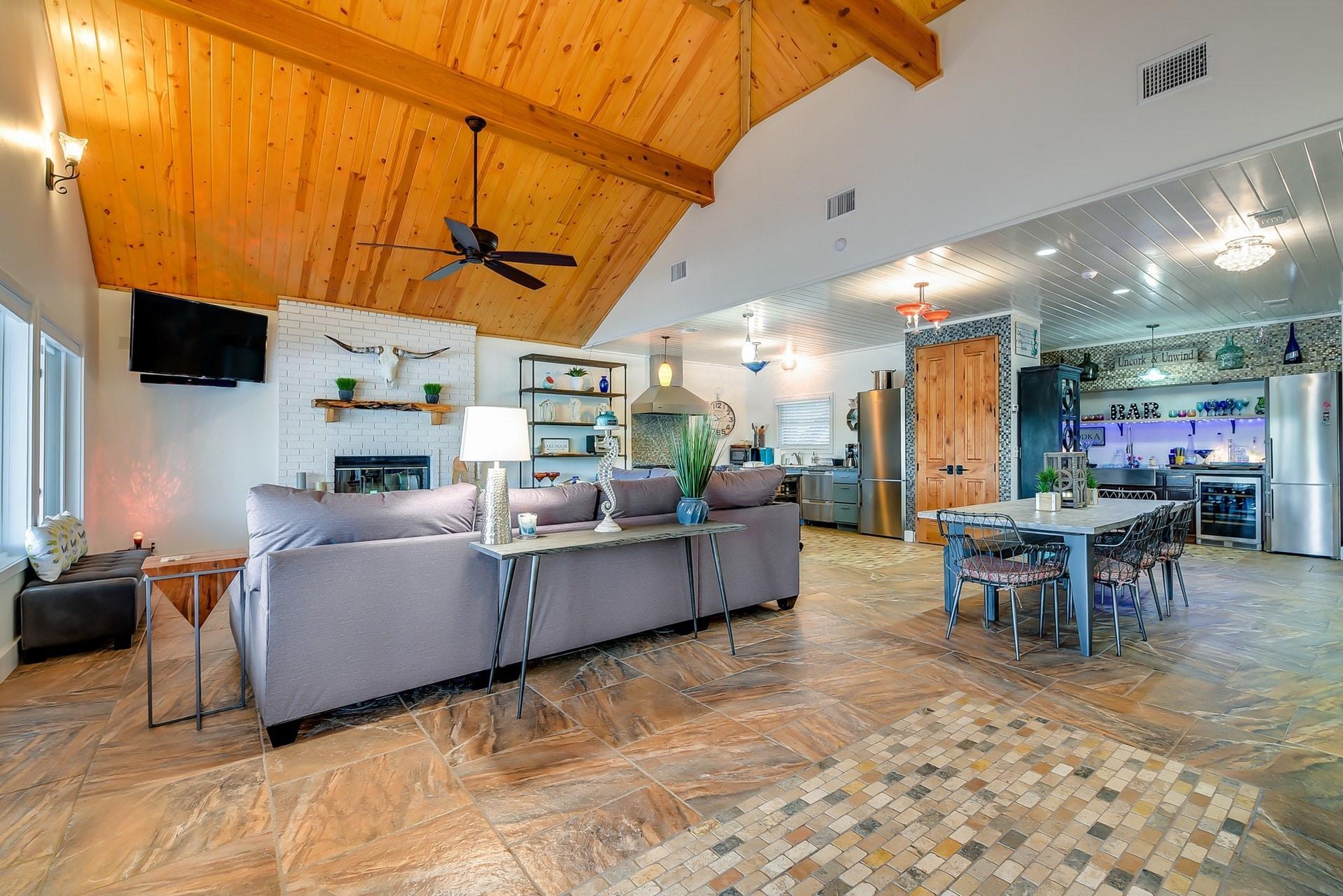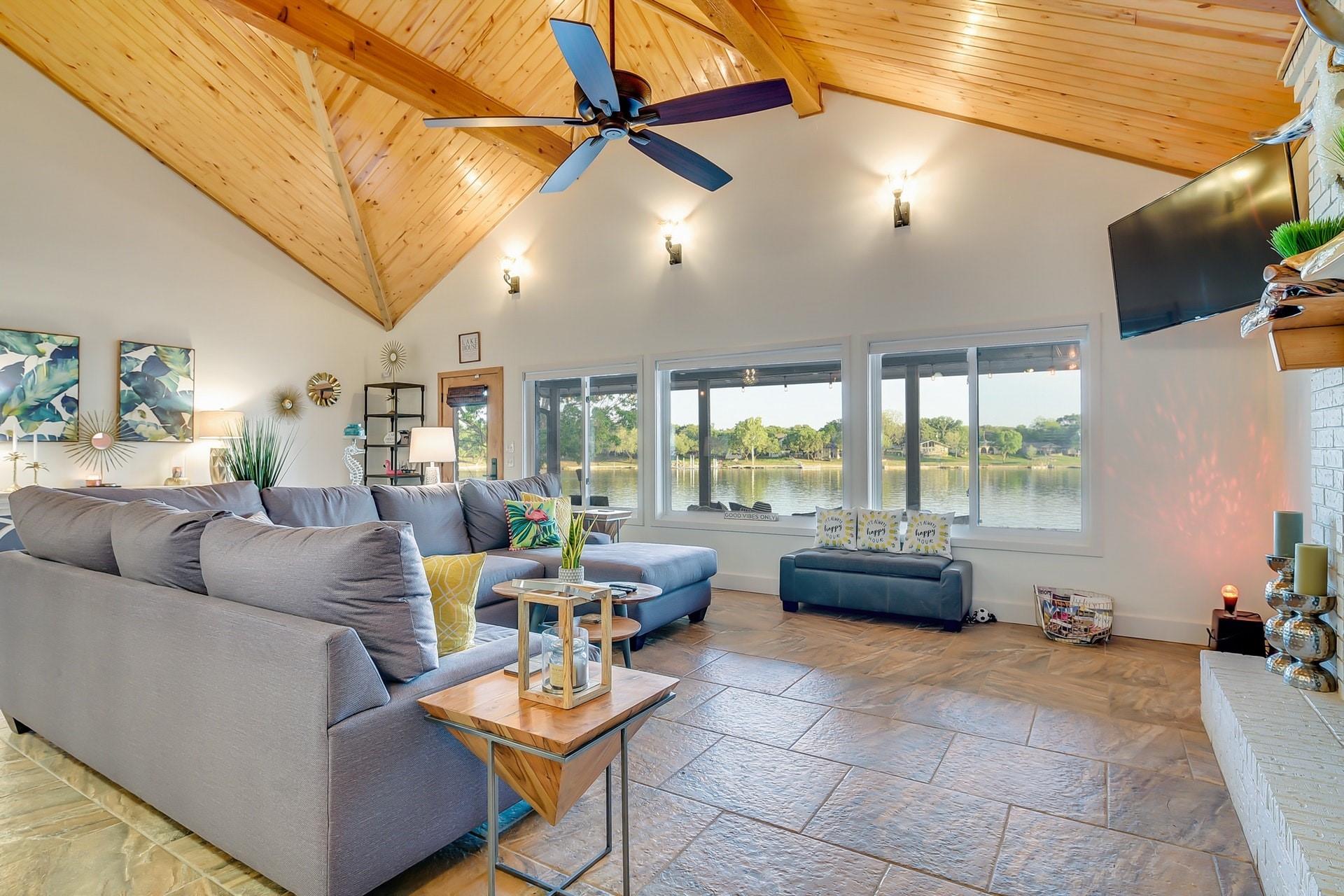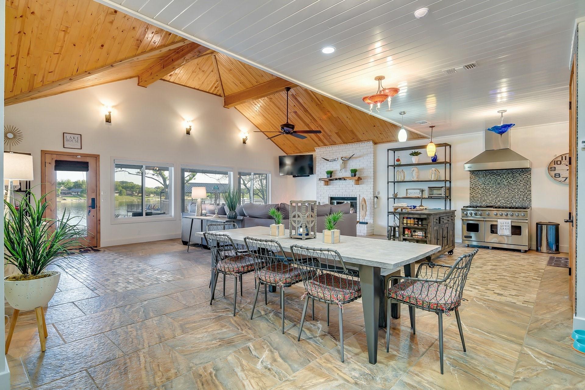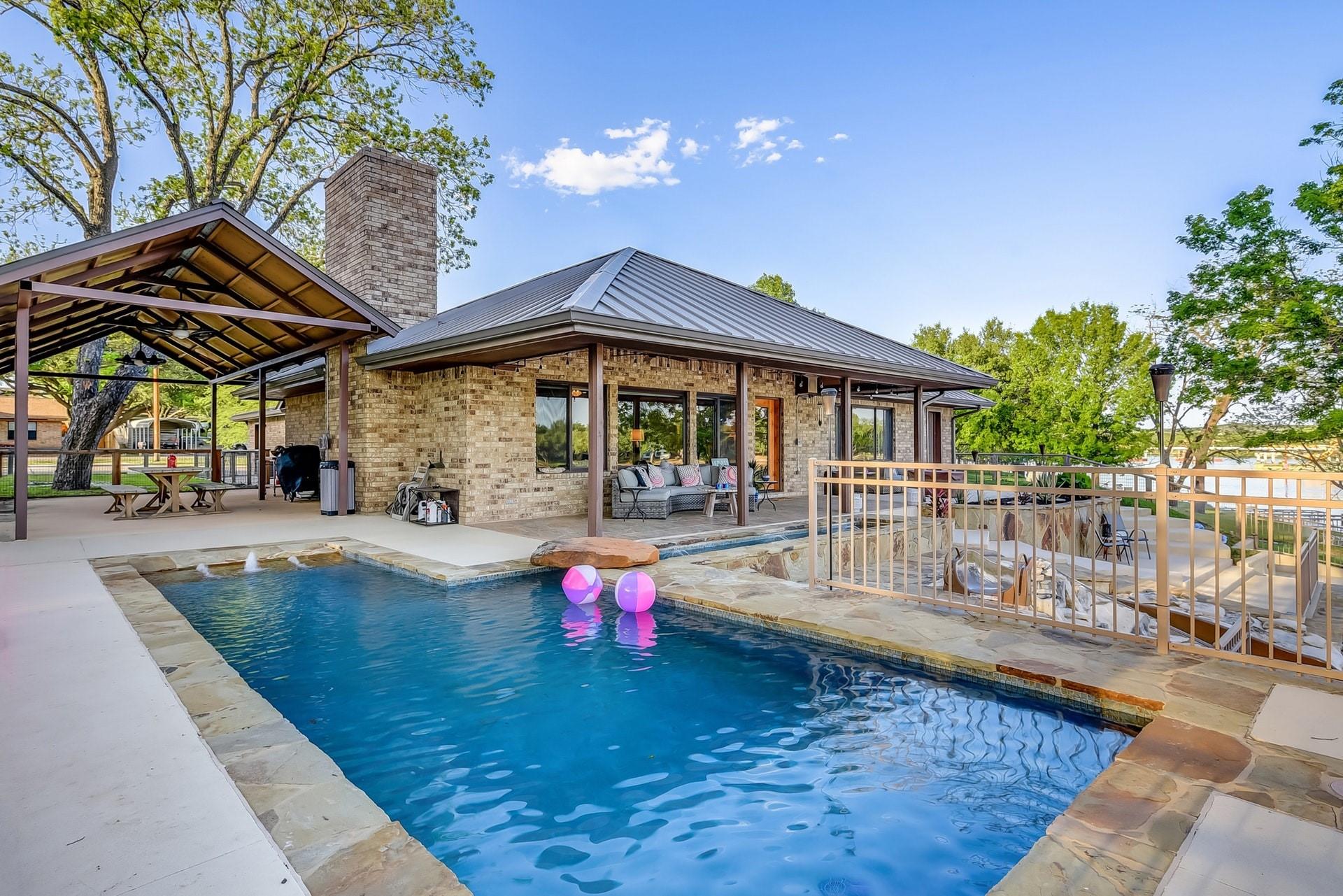 Incredible, vacation rental opportunity with proven track record on Lake LBJ! 4 bedroom, 2.5 bath single-story home with multiple living spaces, two pools, a water slide and a newly constructed boat dock with two slips and room for waverunners. The large lot is over 1/2 acre with 105 feet of south-facing waterfront on the Llano arm of Lake LBJ with outstanding views of the 2900 bridge in one direction and Packsaddle Mountain in the other. Multiple indoor and outdoor living spaces including The Game Room, and a covered outdoor kitchen overlooking one of the pools. Outstanding location close to Boat Town, HEB, Lazy Heron Coffee and the new Hoopers Restuarant in Kingsland. This home is being offered fully-furnished for a turn-key opportunity to start owning your own cash-flowing waterfront asset in the Texas Hill Country. This home did not flood in 2018 and has been well-maintained by its current owners as a 5-star rental property. Many unique features help elevate this property and allow it to stand out amongst the rental competition. Qualified buyers reach out to schedule a tour and come see this opportunity in the Texas Hill Country!