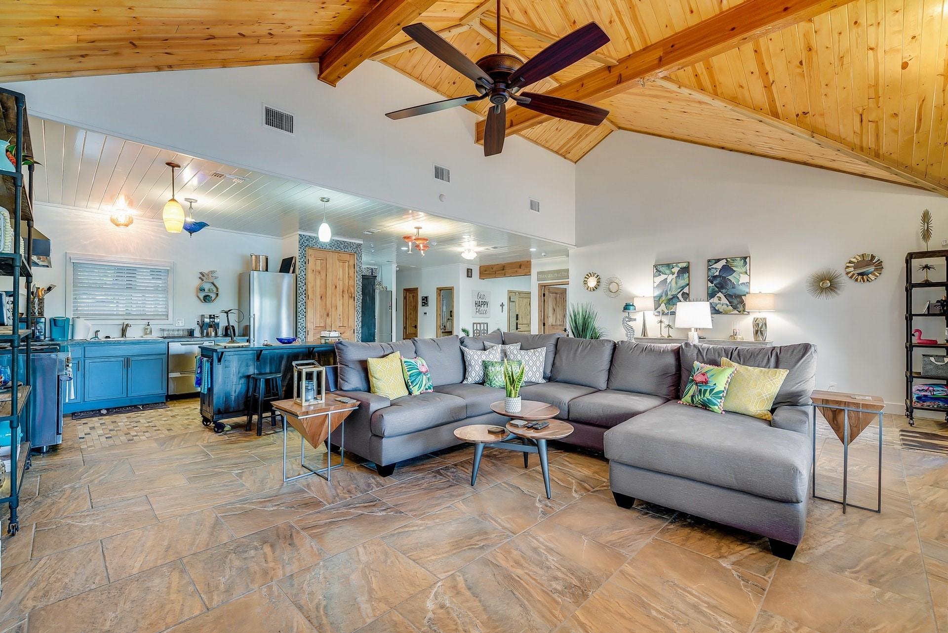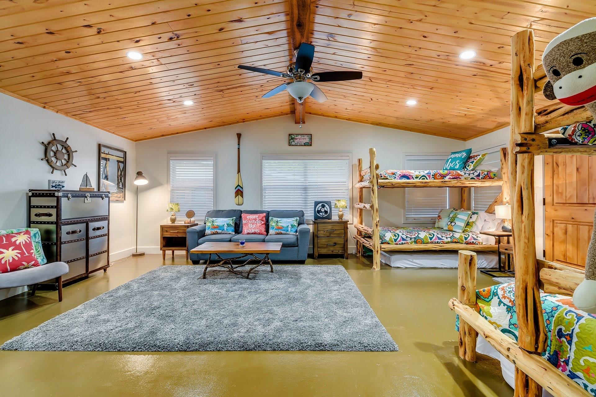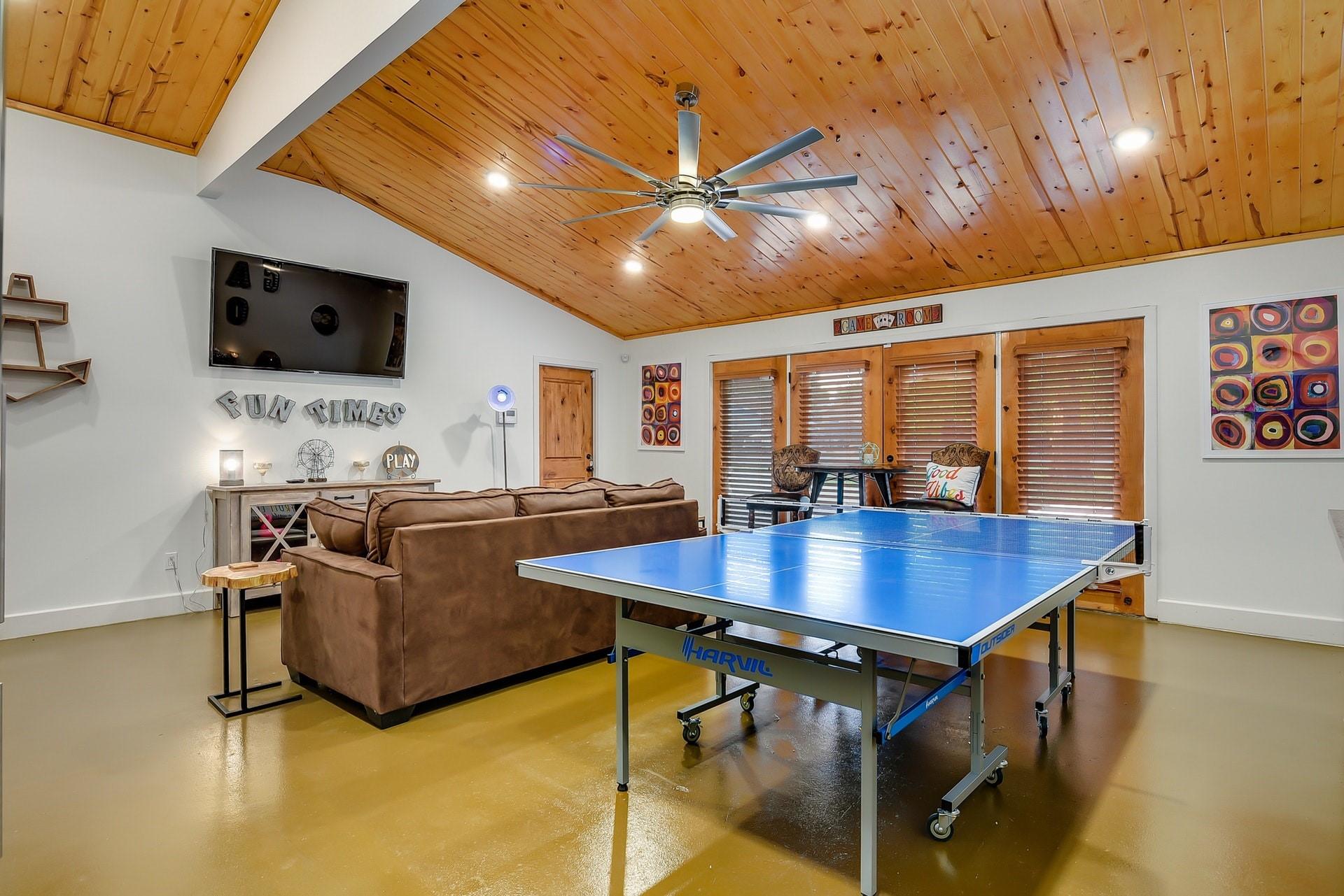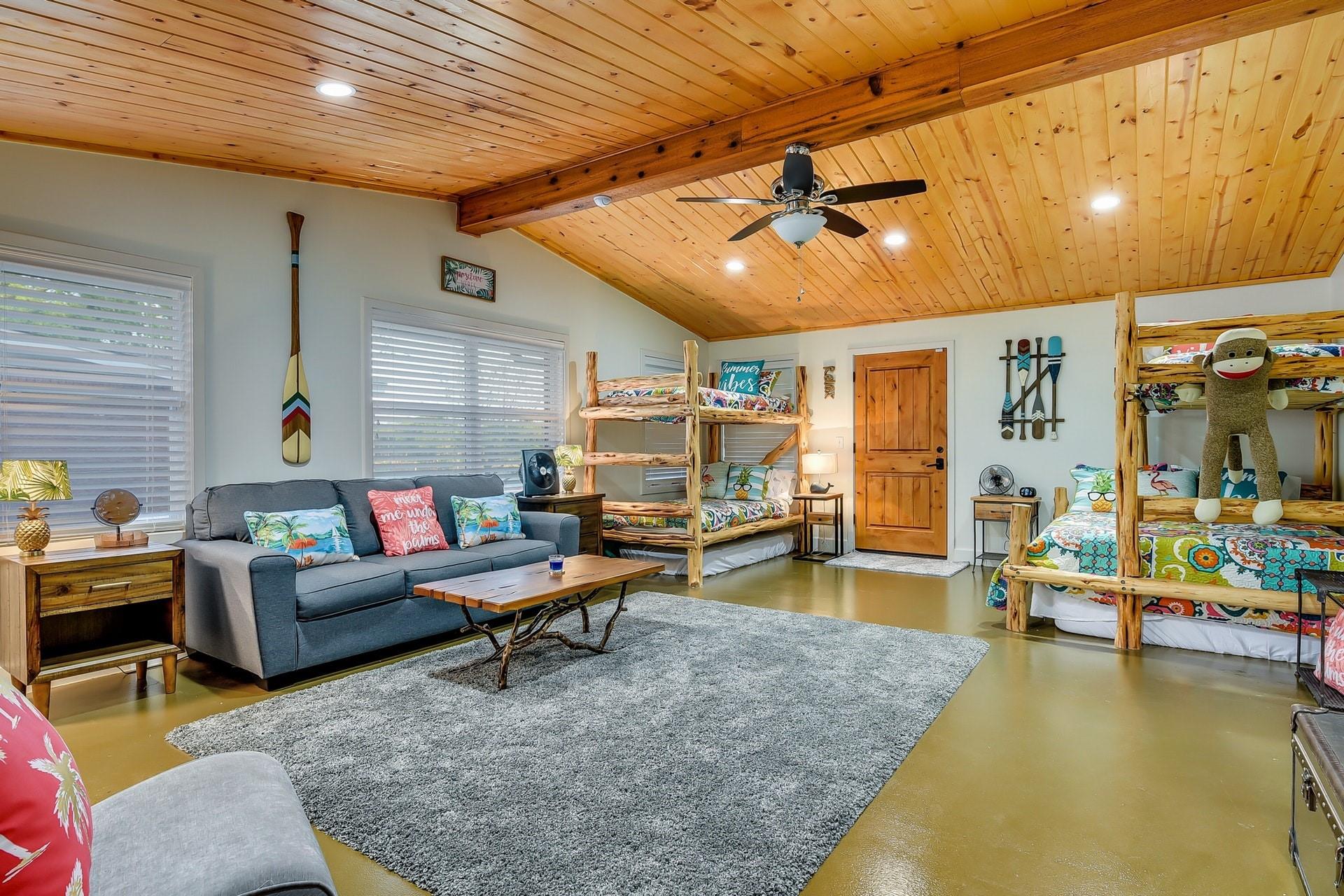 Incredible, vacation rental opportunity with proven track record on Lake LBJ! 4 bedroom, 2.5 bath single-story home with multiple living spaces, two pools, a water slide and a newly constructed boat dock with two slips and room for waverunners. The large lot is over 1/2 acre with 105 feet of south-facing waterfront on the Llano arm of Lake LBJ with outstanding views of the 2900 bridge in one direction and Packsaddle Mountain in the other. Multiple indoor and outdoor living spaces including The Game Room, and a covered outdoor kitchen overlooking one of the pools. Outstanding location close to Boat Town, HEB, Lazy Heron Coffee and the new Hoopers Restuarant in Kingsland. This home is being offered fully-furnished for a turn-key opportunity to start owning your own cash-flowing waterfront asset in the Texas Hill Country. This home did not flood in 2018 and has been well-maintained by its current owners as a 5-star rental property. Many unique features help elevate this property and allow it to stand out amongst the rental competition. Qualified buyers reach out to schedule a tour and come see this opportunity in the Texas Hill Country!
