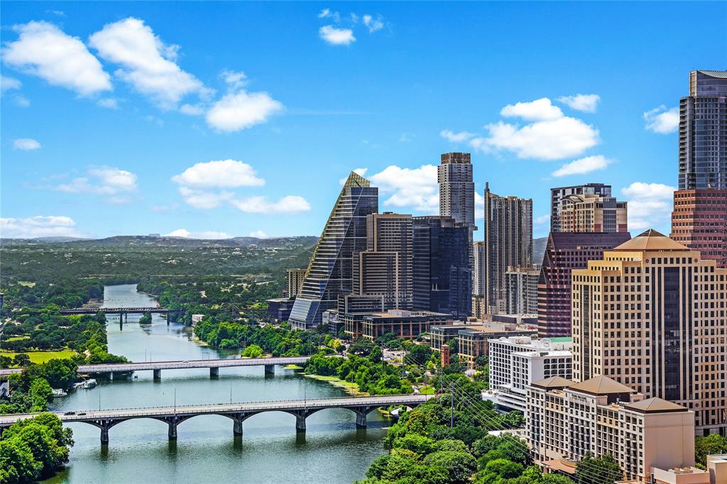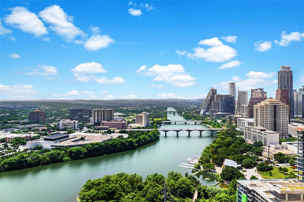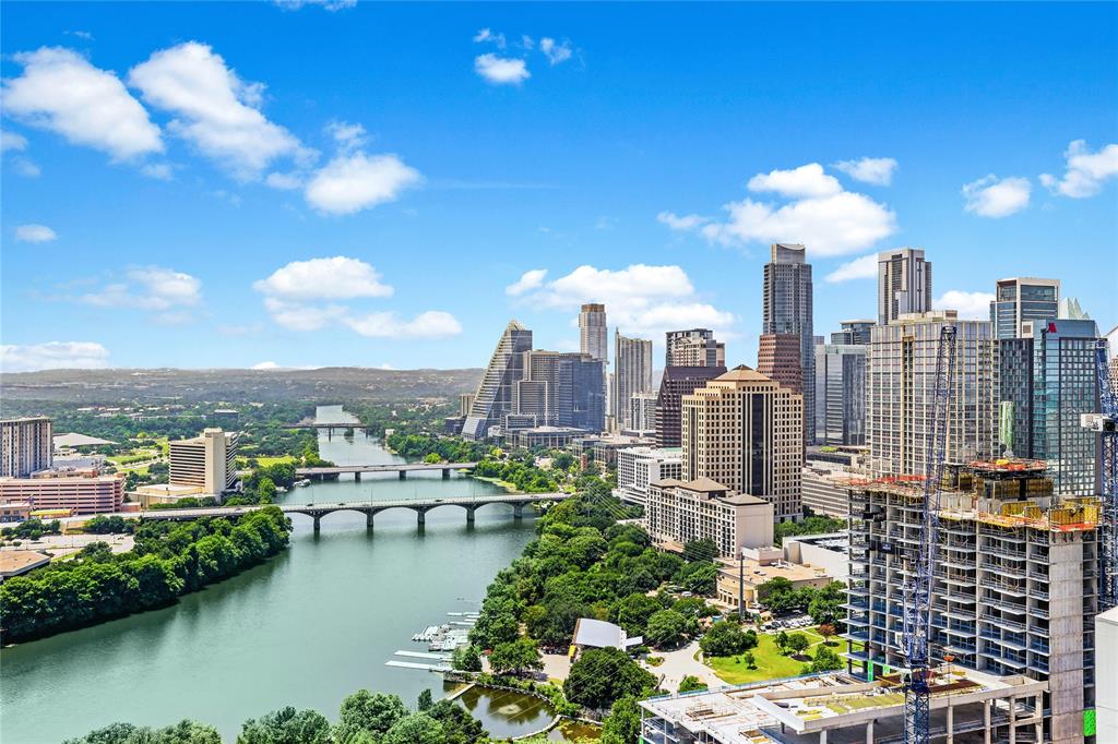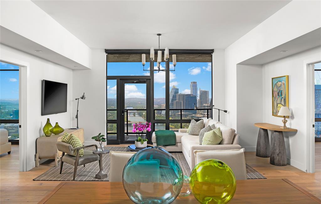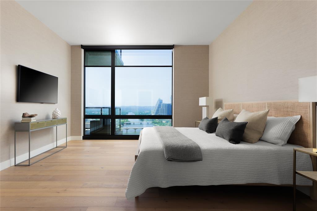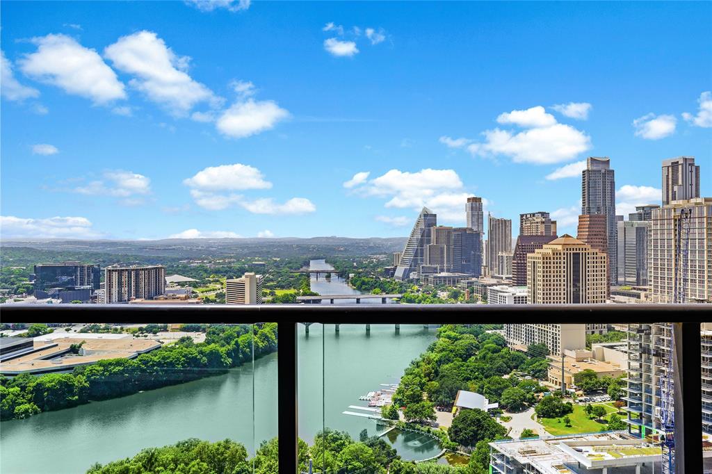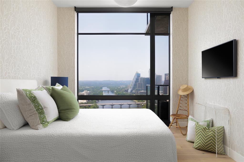 Step into a world of sophistication and unparalleled views with this exceptional 3-bedroom, 3-bathroom residence in downtown Austin. Located in a sought-after luxury building, this strikingly appointed residence at 70 Rainey showcases fine finishes and custom details throughout. Upon entry, be greeted by beautiful European wide-plank white oak flooring and floor-to-ceiling soundproof paneled windows, framing breathtaking vistas of Lady Bird Lake and the iconic skyline. The open floor plan seamlessly integrates the living, dining, and kitchen areas, providing a perfect space for entertaining. The kitchen boasts Miele appliances, quartz countertops, contemporary finishes, and a spacious center island that invites culinary exploration. Relax in the privacy of the spacious primary suite, featuring floor-to-ceiling windows overlooking the water. Indulge in the spa-like primary bathroom, complete with dual sinks, a soaking tub, a glass-enclosed shower with stunning marble tile, and an expansive walk-in closet with custom built-ins. The guest bedroom also offers an en-suite bathroom and breathtaking lake and skyline views. Additionally, a versatile den provides the perfect space for a home office, gym, or additional living area, complete with a full en-suite bathroom. This residence further boasts an in-unit utility room with built-in storage to maximize storage space. The building itself offers an impressive suite of amenities, including an infinity pool with panoramic lake views, multiple sundecks, covered outdoor dining areas with TVs and grills, lush landscaping, a dog park, and a fire pit. Indoors, you'll find lounges, dining spaces, a theater room, and a fitness center. With interior design selections by MARKZEFF, 70 Rainey offers over 31,000 sqft of indoor and outdoor amenities. Offering includes most furnishings currently in the unit. Tax and assessed values are estimates for illustration purposes only. All figures should be independently verified.