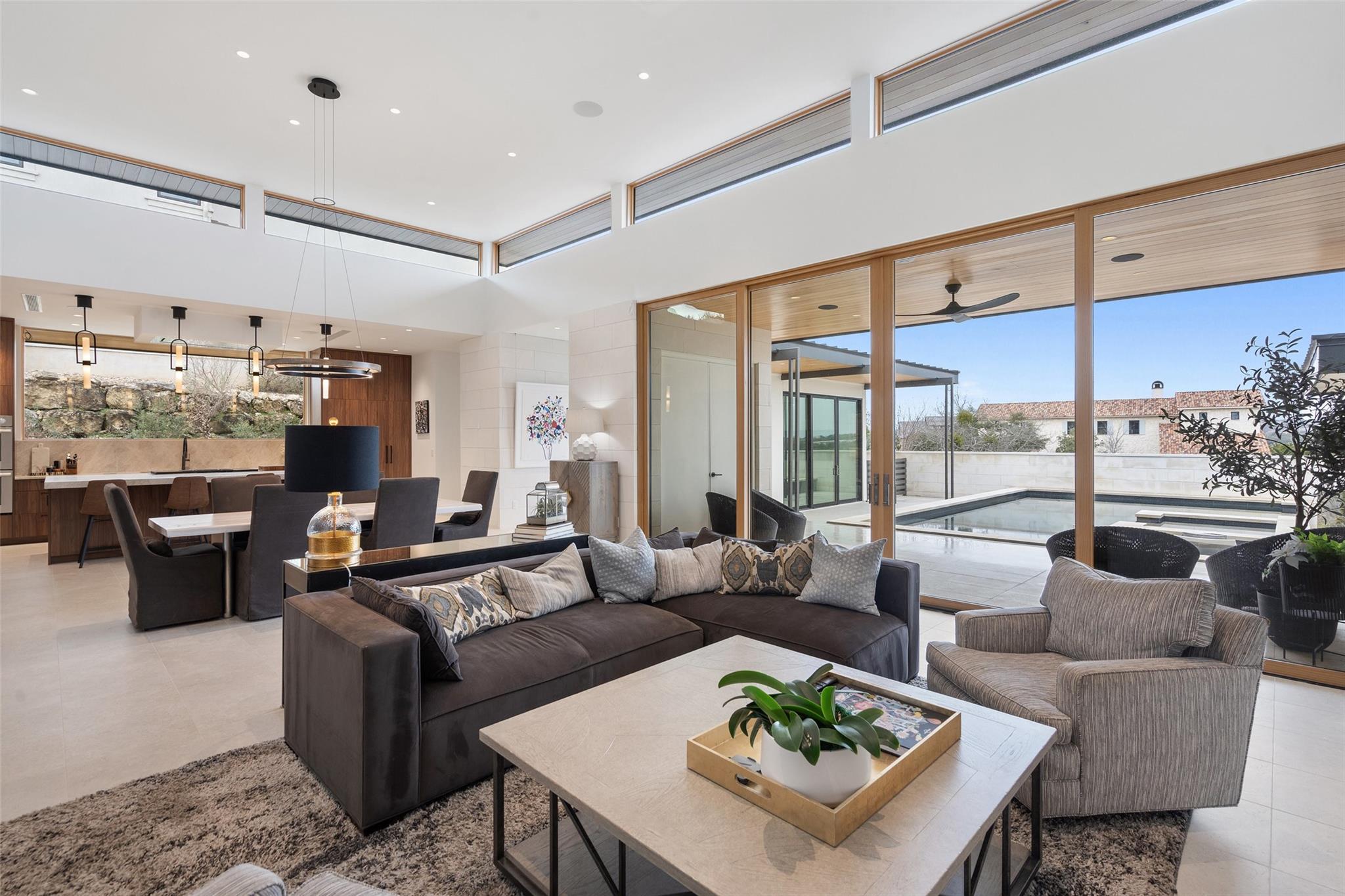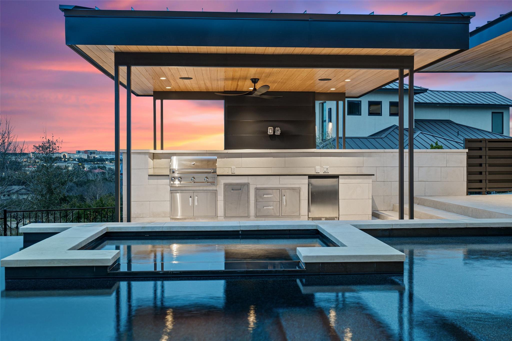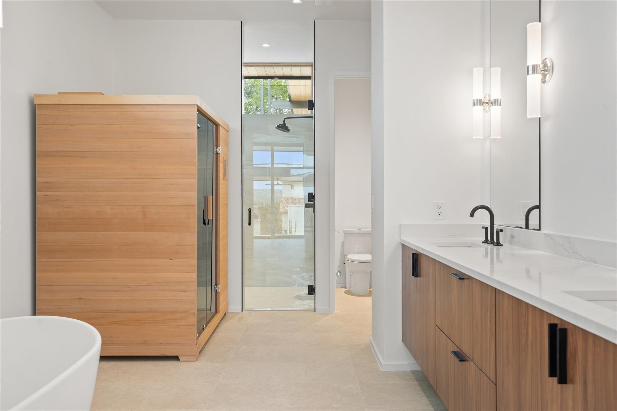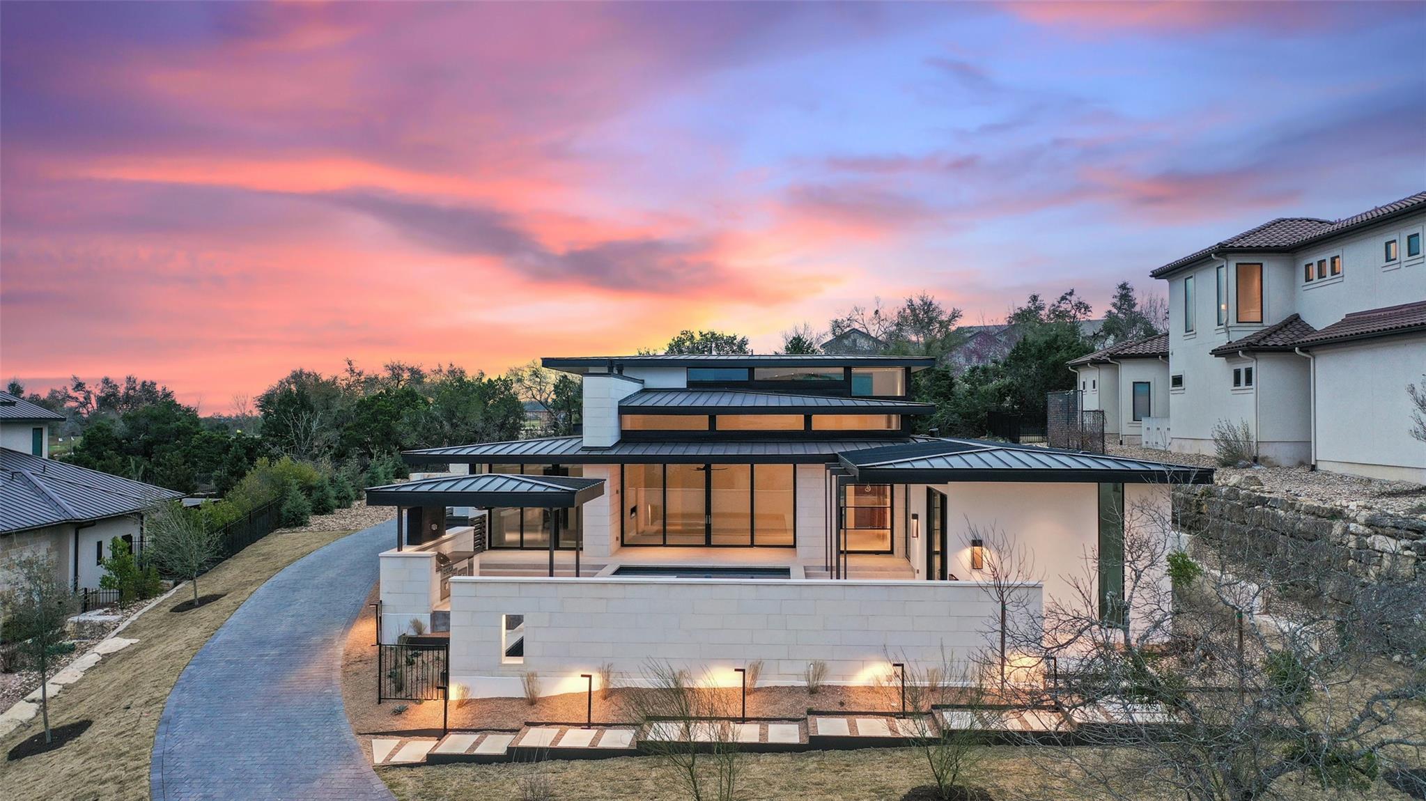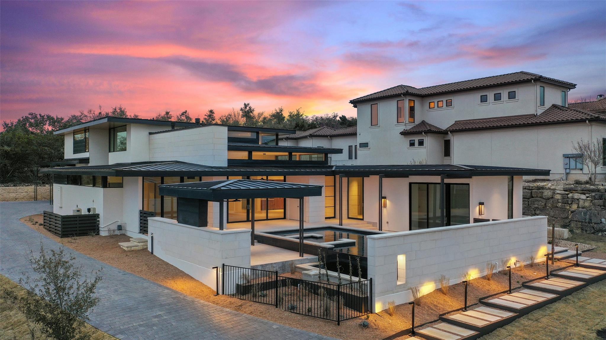 Welcome to this stunning Dick Clark + Associates home completed in 2023 and situated on a .47 acre lot in the exclusive Spanish Oaks, a highly sought-after guard gated community less than 20 miles from downtown Austin. This exquisite home features 5 bedrooms, each with its private bathroom, providing ample space and comfort for family and guests alike. The primary suite features glass sliders to the patio, a fireplace, a free-standing sauna, and an enviable closet with washer/dryer connections. In addition to the owner's suite, there is a full bed and bath, an office or library, a walk-through pantry, a laundry room, and a powder room on the main level. The floating wood and steel staircase leads you to three additional bedrooms with ensuite baths and a secondary living area. The thoughtfully designed indoor and outdoor living areas create an effortless flow for entertaining large and intimate groups. A Glass overhead door opens from the backyard to the garage for an extended all-weather play area, game room, or home gym. With an open gourmet kitchen featuring Signature appliances wrapped in custom cabinetry, Taj Mahal countertops, and an expansive island, this kitchen is the heart of the home! A full outdoor kitchen is adjacent to the inviting swimming pool and hot tub. With over $100,000 in recent upgrades, this move-in-ready home has everything the discerning buyer craves. Enjoy your private sanctuary on Pecan Chase and the resort-style amenities of Spanish Oaks.