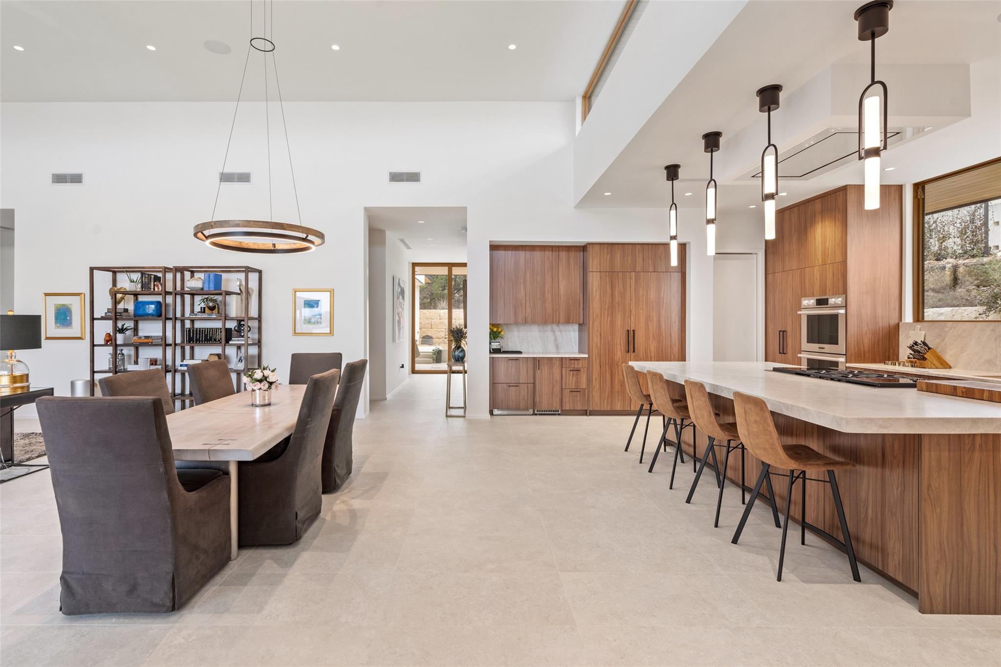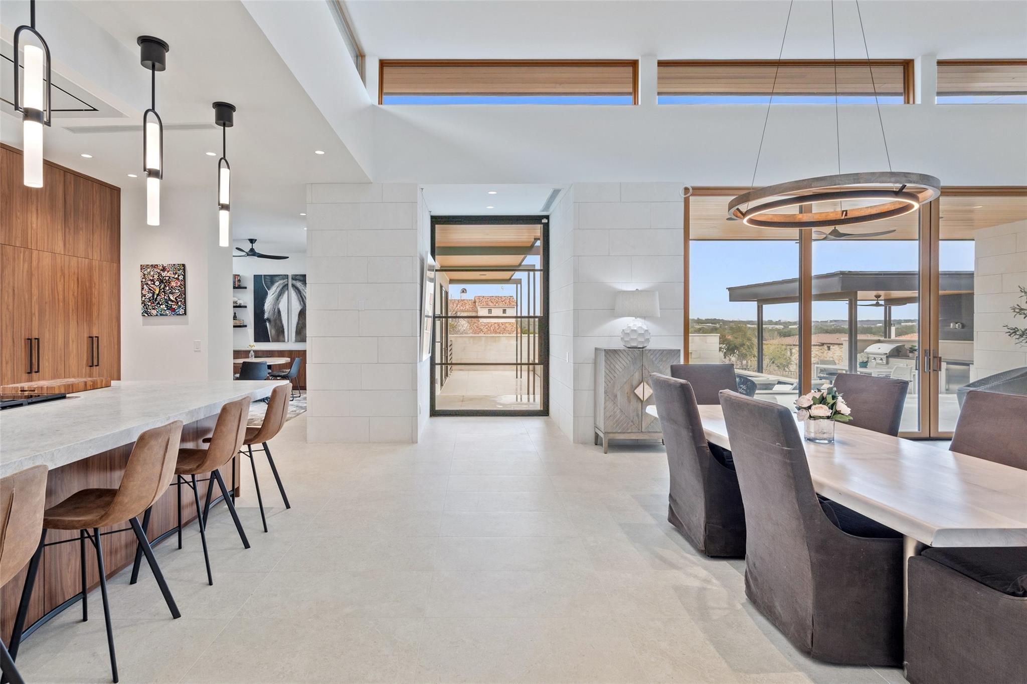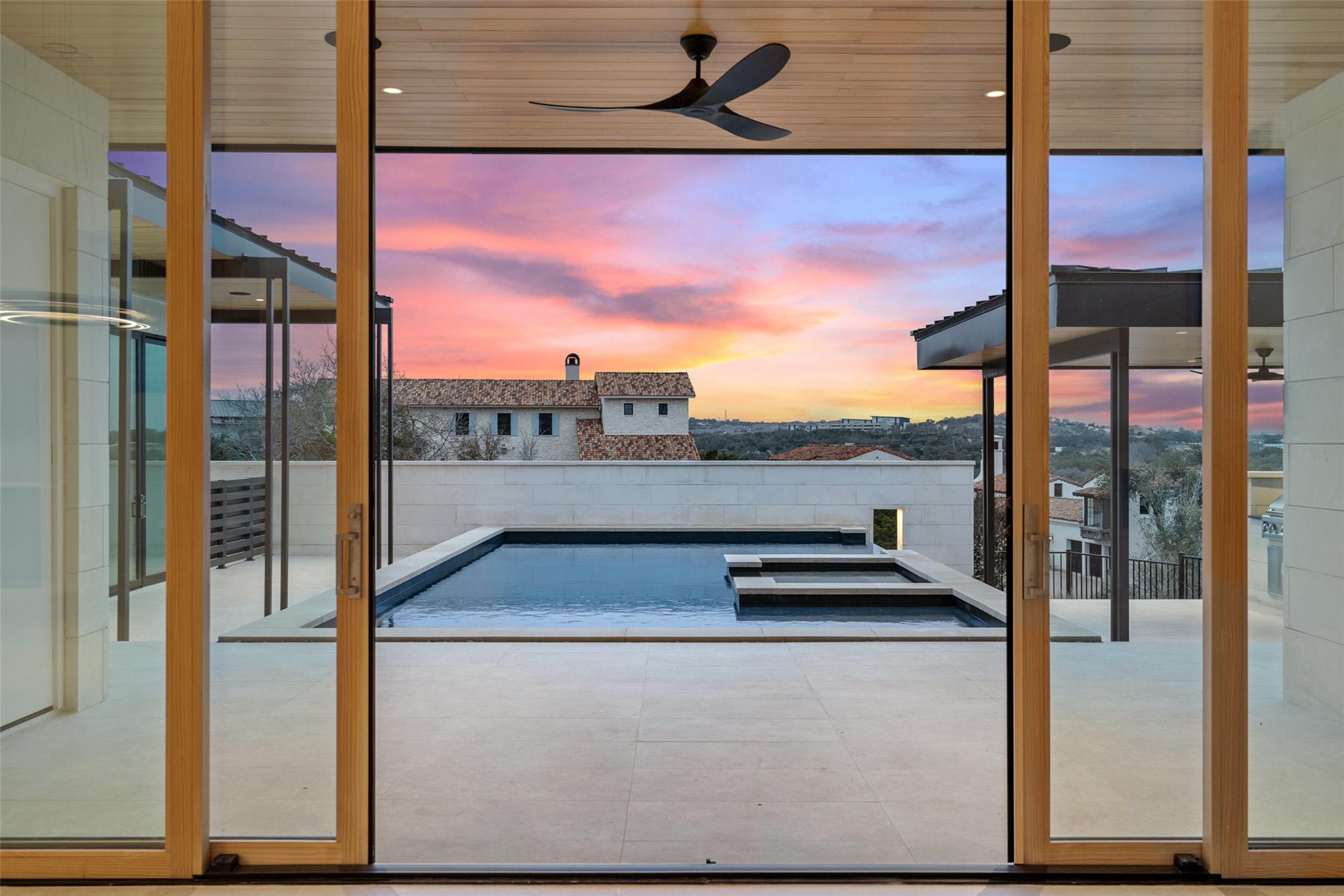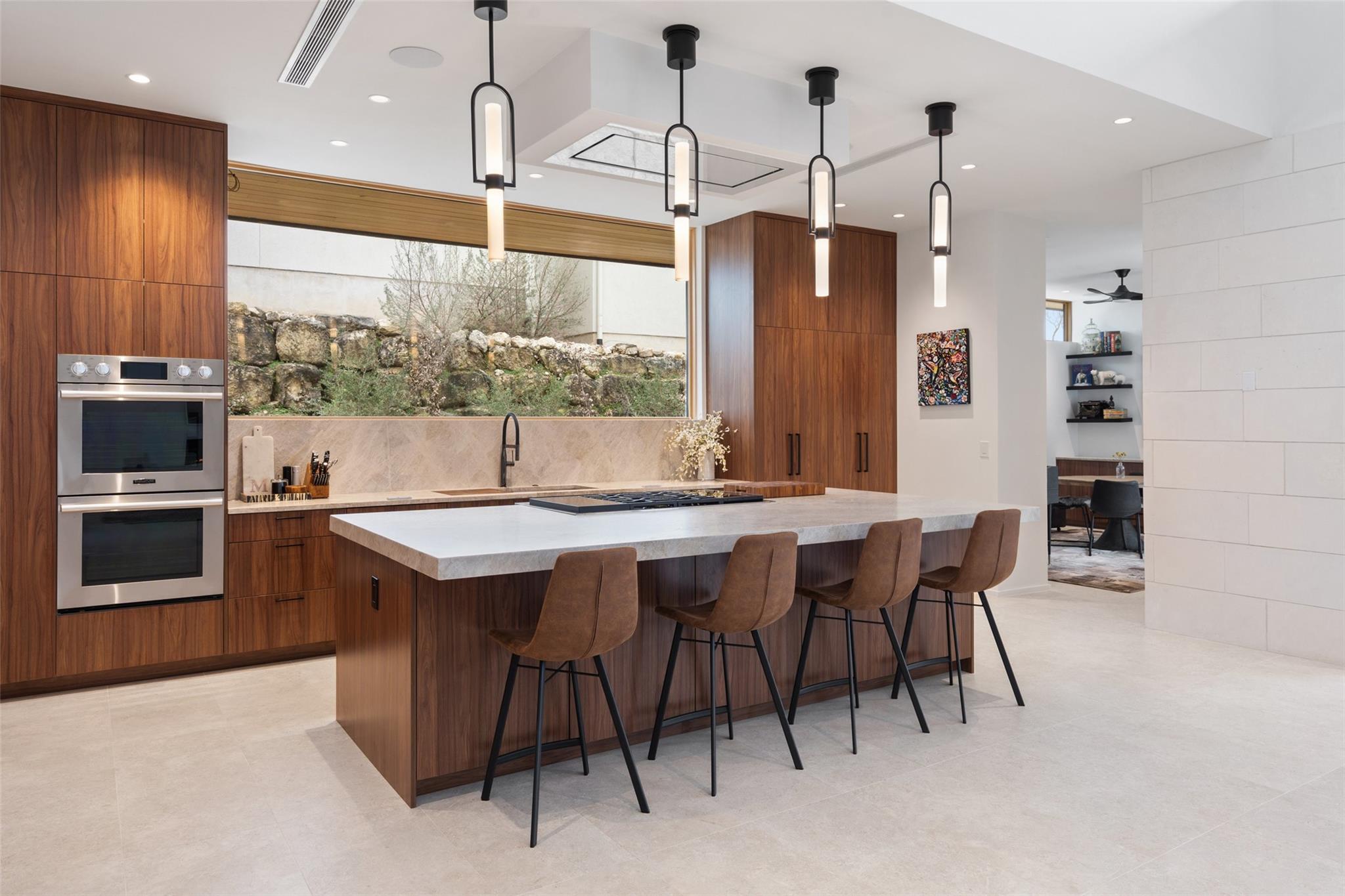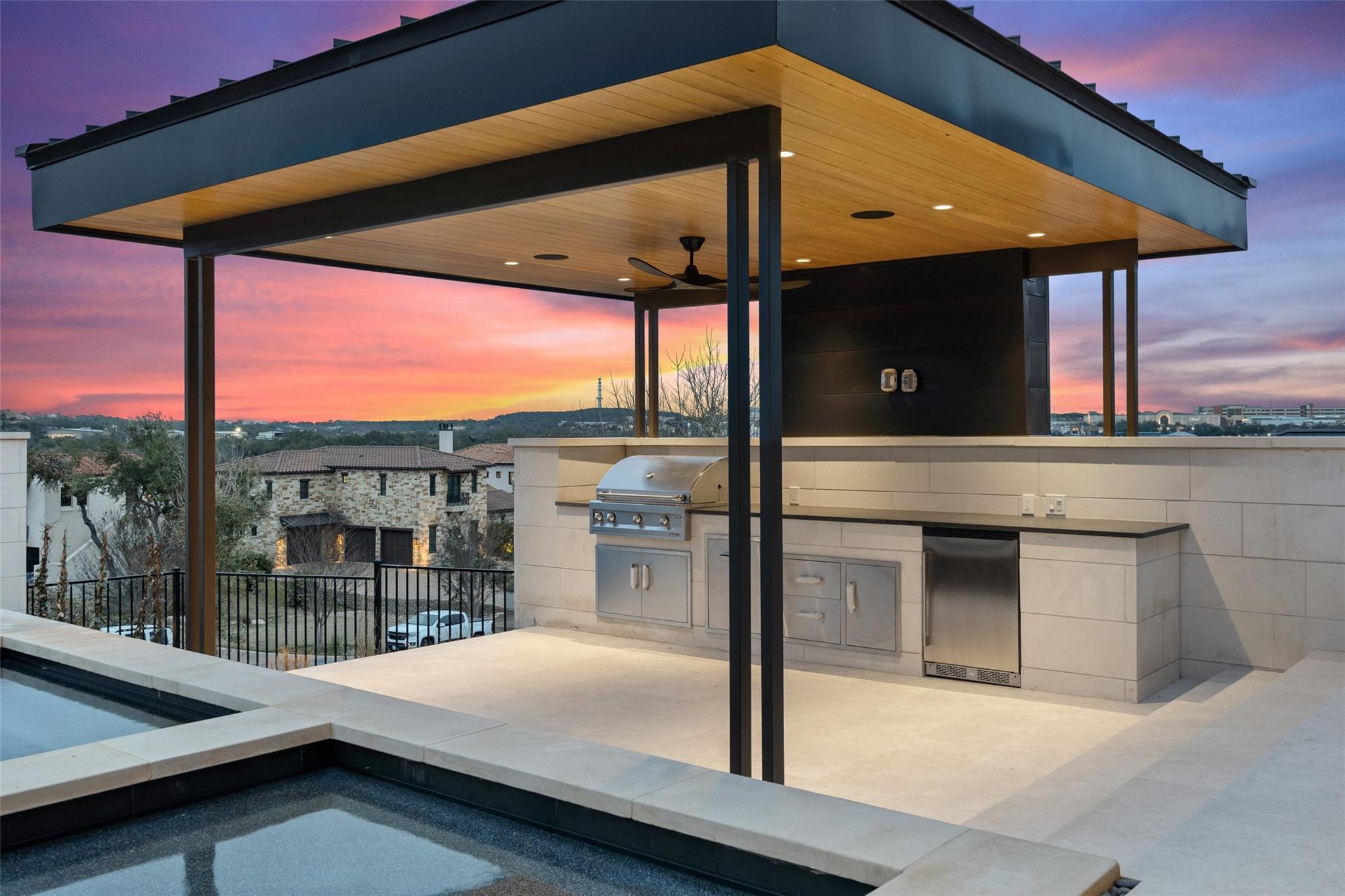 Welcome to this stunning Dick Clark + Associates home completed in 2023 and situated on a .47 acre lot in the exclusive Spanish Oaks, a highly sought-after guard gated community less than 20 miles from downtown Austin. This exquisite home features 5 bedrooms, each with its private bathroom, providing ample space and comfort for family and guests alike. The primary suite features glass sliders to the patio, a fireplace, a free-standing sauna, and an enviable closet with washer/dryer connections. In addition to the owner's suite, there is a full bed and bath, an office or library, a walk-through pantry, a laundry room, and a powder room on the main level. The floating wood and steel staircase leads you to three additional bedrooms with ensuite baths and a secondary living area. The thoughtfully designed indoor and outdoor living areas create an effortless flow for entertaining large and intimate groups. A Glass overhead door opens from the backyard to the garage for an extended all-weather play area, game room, or home gym. With an open gourmet kitchen featuring Signature appliances wrapped in custom cabinetry, Taj Mahal countertops, and an expansive island, this kitchen is the heart of the home! A full outdoor kitchen is adjacent to the inviting swimming pool and hot tub. With over $100,000 in recent upgrades, this move-in-ready home has everything the discerning buyer craves. Enjoy your private sanctuary on Pecan Chase and the resort-style amenities of Spanish Oaks.