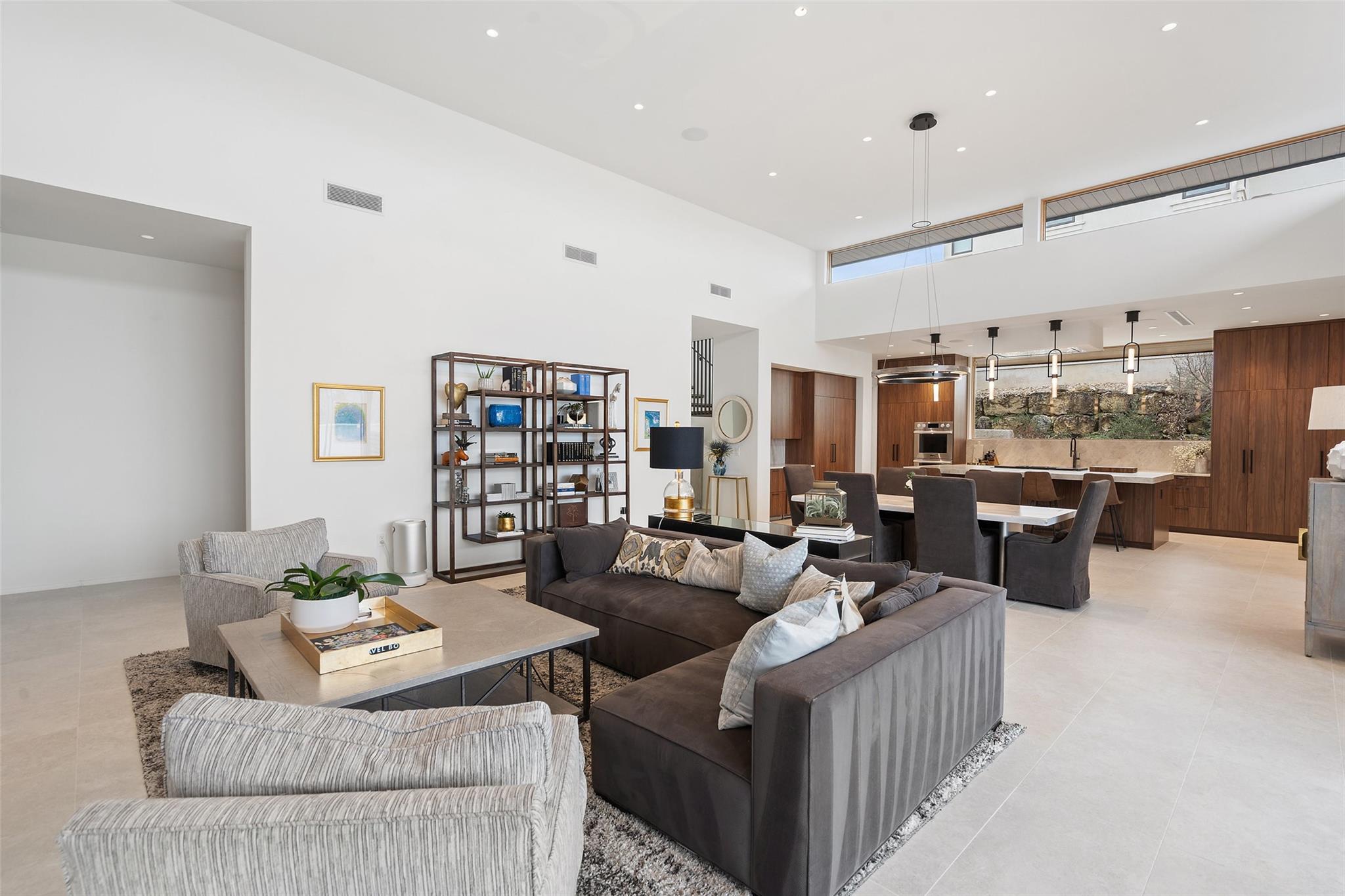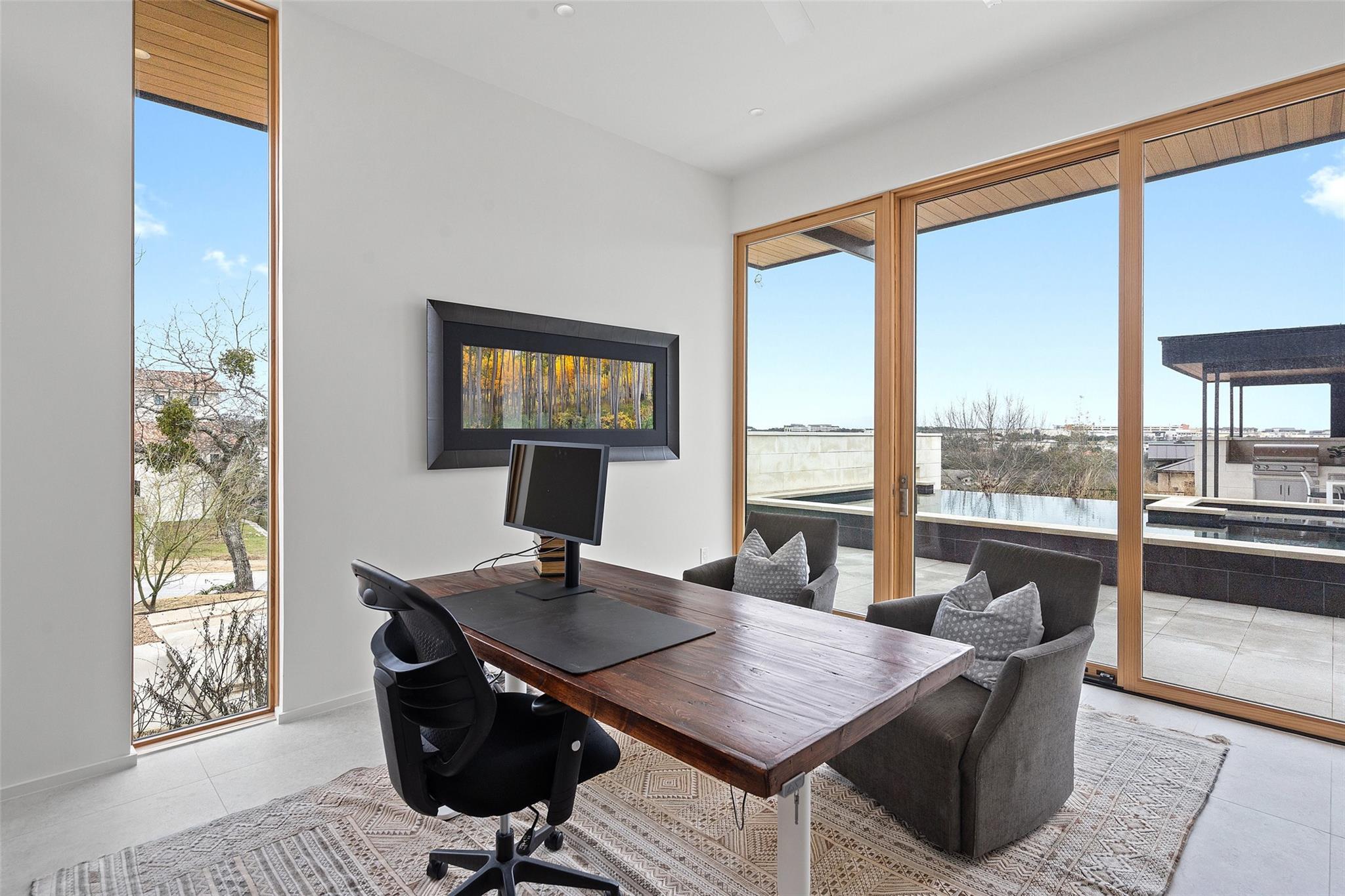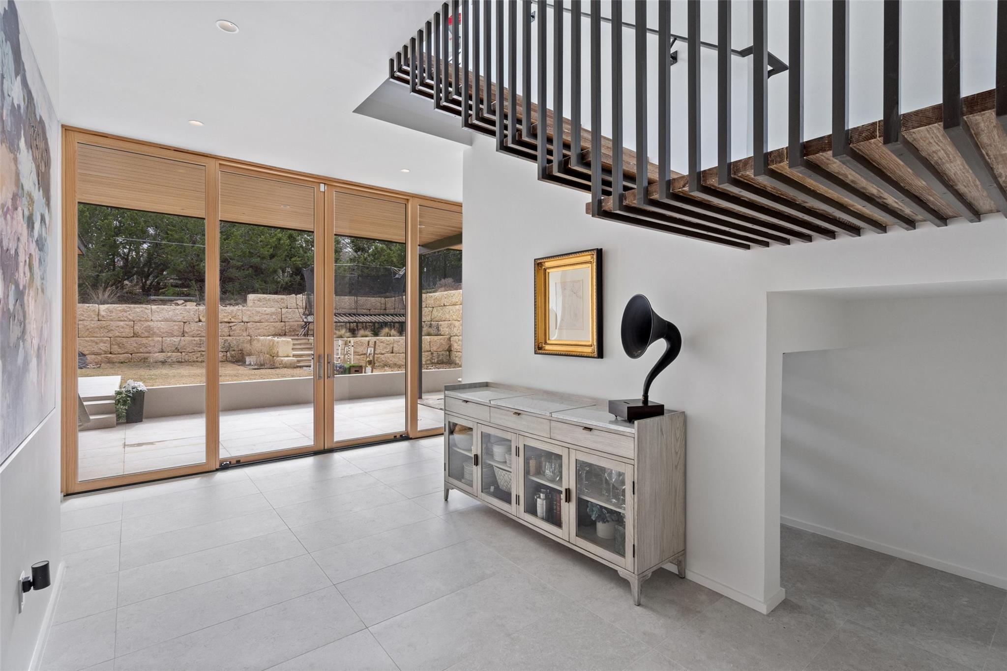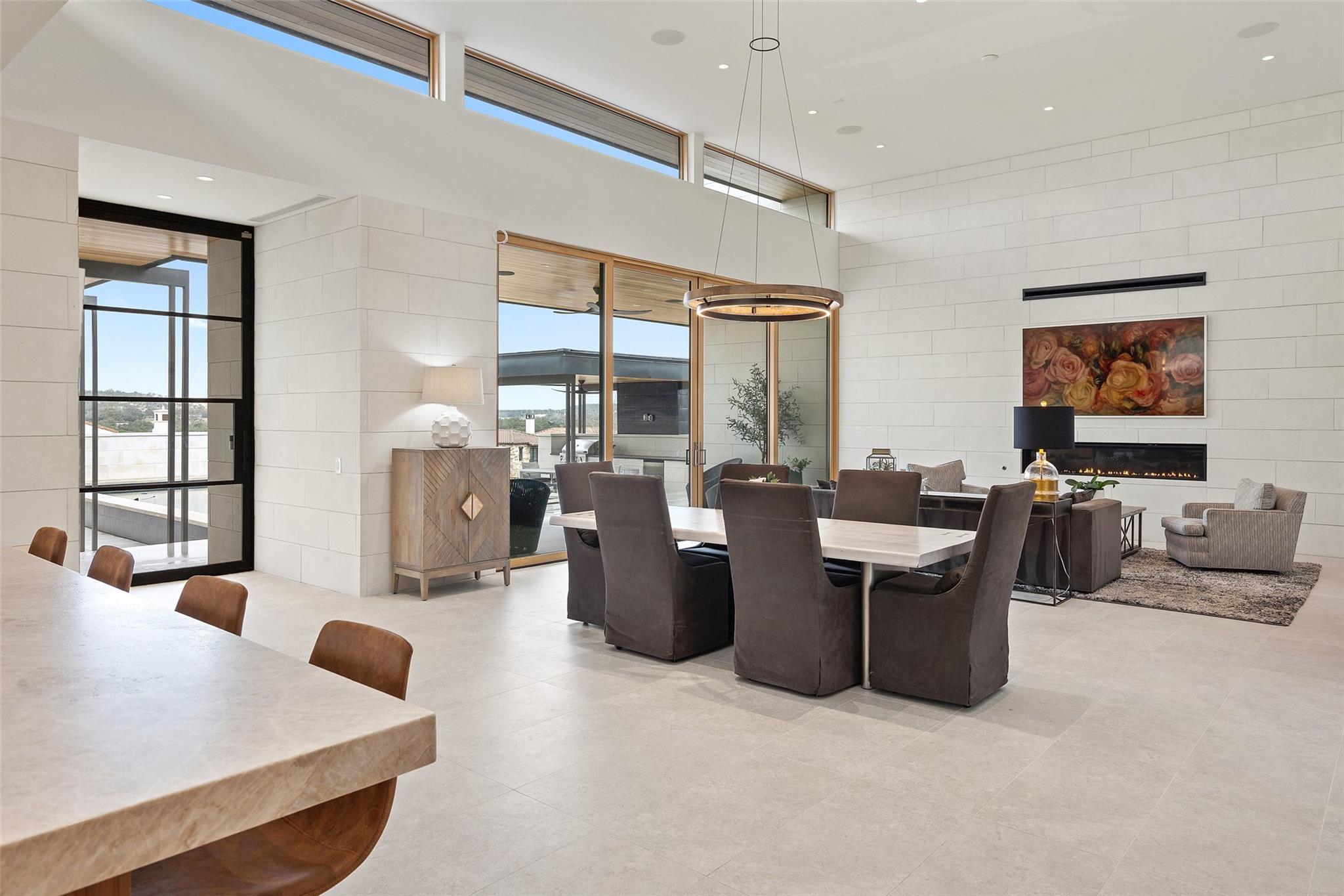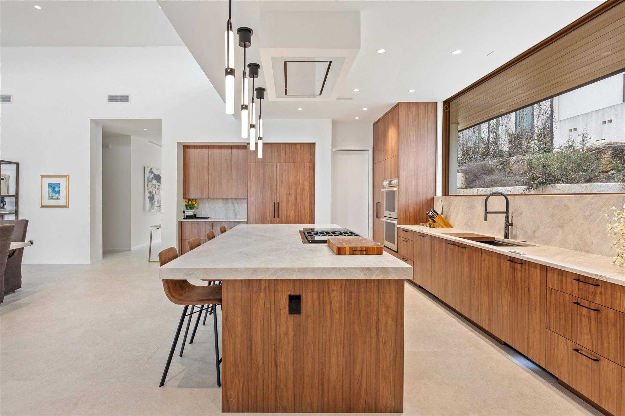 Welcome to this stunning Dick Clark + Associates home completed in 2023 and situated on a .47 acre lot in the exclusive Spanish Oaks, a highly sought-after guard gated community less than 20 miles from downtown Austin. This exquisite home features 5 bedrooms, each with its private bathroom, providing ample space and comfort for family and guests alike. The primary suite features glass sliders to the patio, a fireplace, a free-standing sauna, and an enviable closet with washer/dryer connections. In addition to the owner's suite, there is a full bed and bath, an office or library, a walk-through pantry, a laundry room, and a powder room on the main level. The floating wood and steel staircase leads you to three additional bedrooms with ensuite baths and a secondary living area. The thoughtfully designed indoor and outdoor living areas create an effortless flow for entertaining large and intimate groups. A Glass overhead door opens from the backyard to the garage for an extended all-weather play area, game room, or home gym. With an open gourmet kitchen featuring Signature appliances wrapped in custom cabinetry, Taj Mahal countertops, and an expansive island, this kitchen is the heart of the home! A full outdoor kitchen is adjacent to the inviting swimming pool and hot tub. With over $100,000 in recent upgrades, this move-in-ready home has everything the discerning buyer craves. Enjoy your private sanctuary on Pecan Chase and the resort-style amenities of Spanish Oaks.