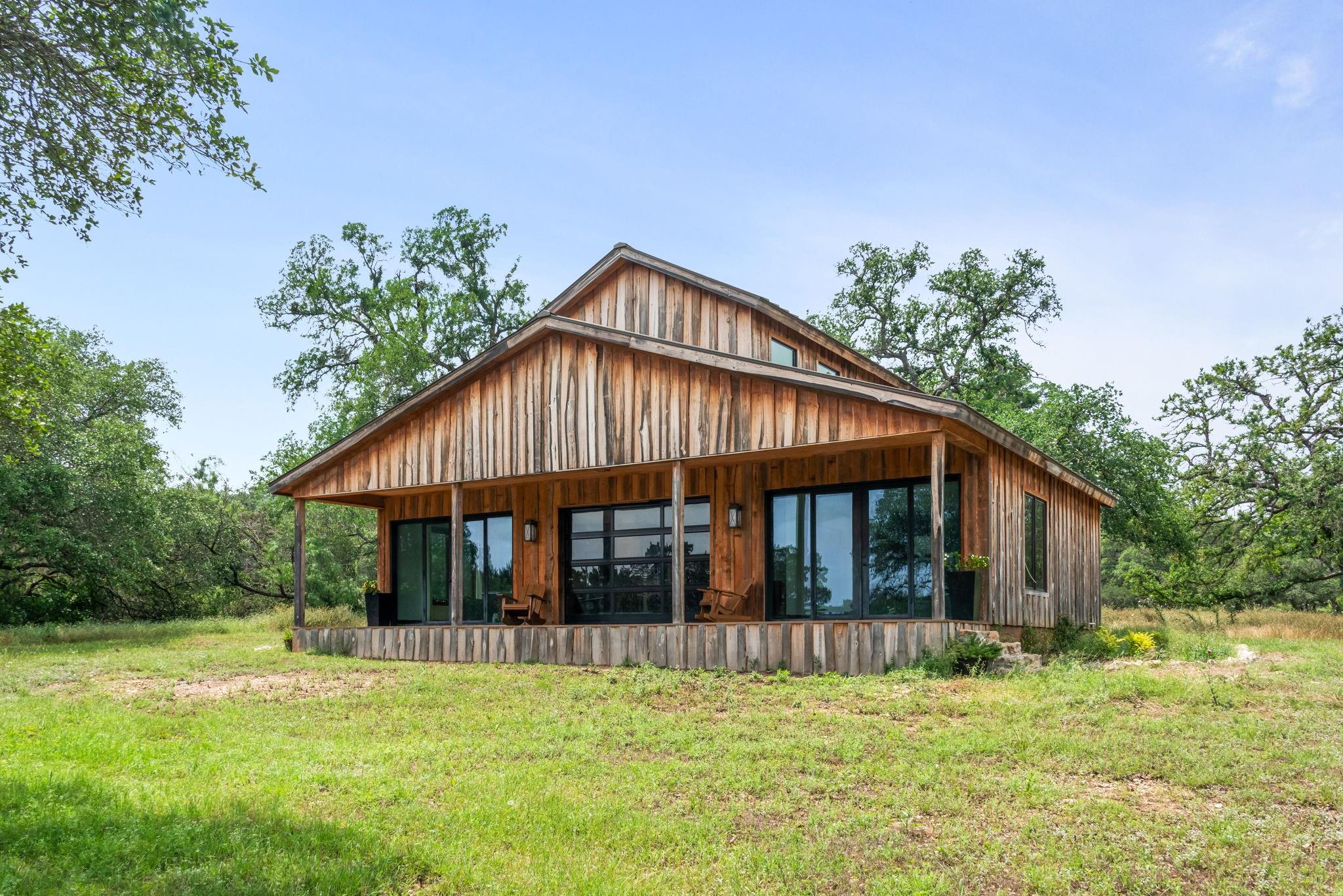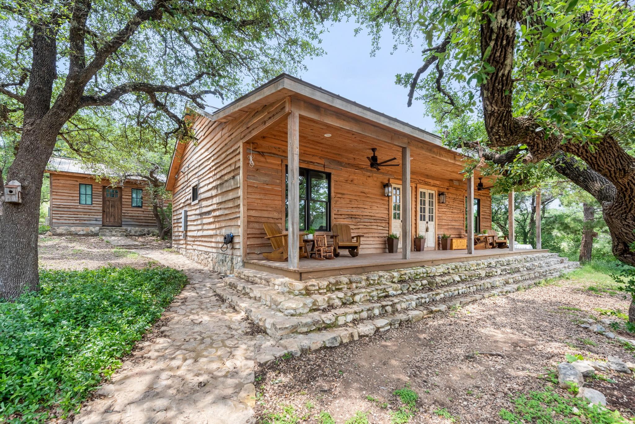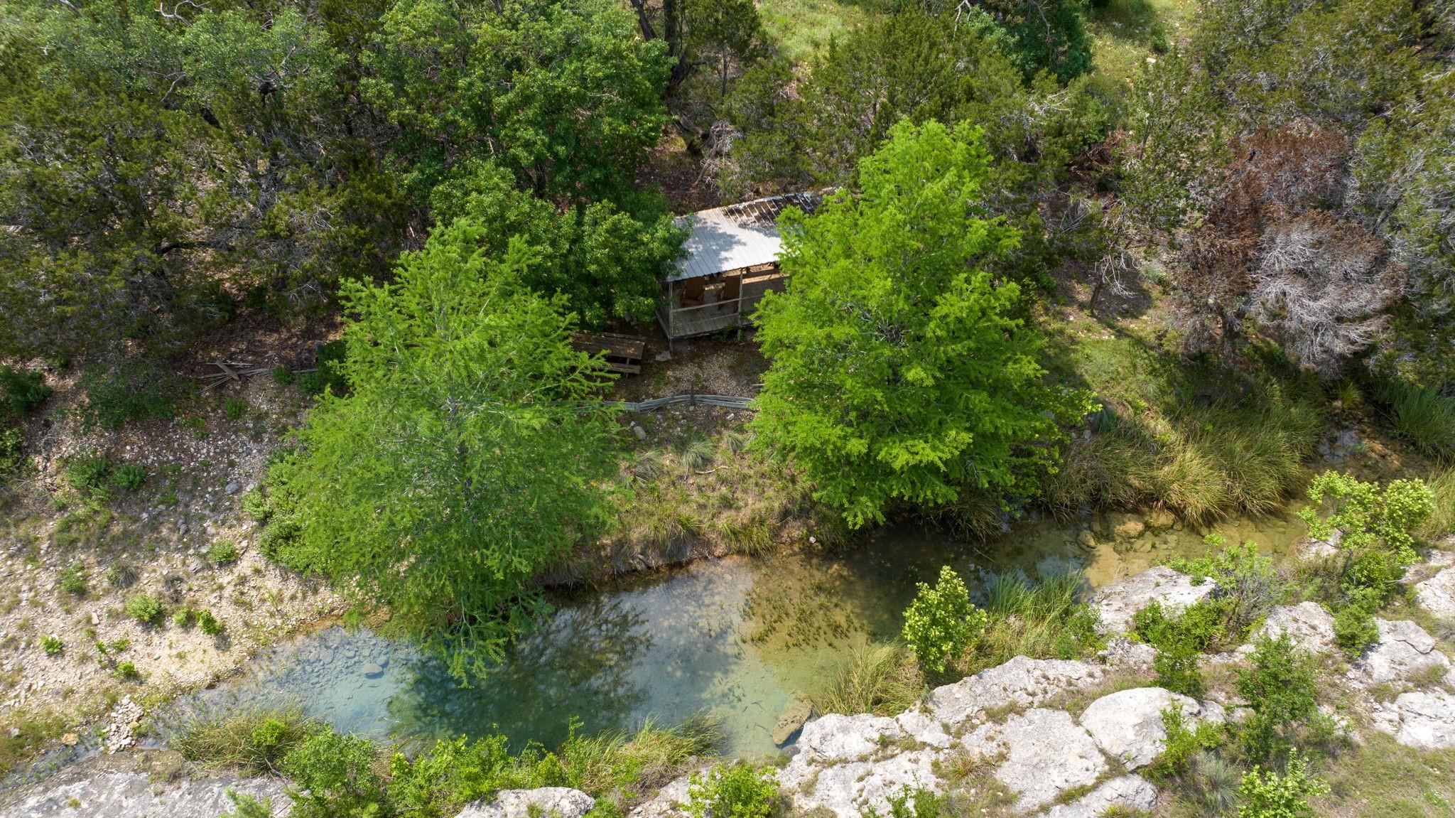 New build on a 32+ Acre Unrestricted Ranch along Spring Fed Deadman's Creek in Dripping Springs. A Spring Fed Creek, a large swimming hole, luscious grotto w/manicured walking trails throughout surrounded by limestone rock walls from the 1800's. Property has lots to offer, including vista views, beautiful bottom portion with mature oaks, large green pasture, a year around creek with limestone bluffs. Fully fenced. 4 Custom Structures built in 2022 by builder Mattison Reynolds w/Live Edge Cypress Wood and Board & Batten Siding include: *3/2 Guest Cottage (1400 sf) with metal roof, high-end appliances, pecky cypress custom cabinetry, white Calcutta marble countertops, wide plank wood flooring throughout, limestone walls and fireplace, rustic reclaimed wood beams, high ceilings, expansive covered porch with two Big Ass Fans & limestone steps. *Studio Casita (450 sf) with metal roof, cypress wood walls, kitchenette with concrete countertops, full shower & laundry. *Office/Gym Barn (1456 sf) with metal roof, two offices, spacious gym and large porch. Vaulted 22ft Gym Ceiling with reclaimed beams, Large Big Ass Fan, Steel Garage Door, High-End Bathroom Finishes, kitchenette with Miele Coffee System, Ice Maker & Stainless Steel Fridge. Two offices with wood custom cabinetry & shelves, limestone countertops and wood flooring. *RV Barn with Attached Outdoor Pavilion & Fireplace (1500 sf) wrapped in limestone from the property and metal roof. RV Barn has space for two full size RV's and storage above. Well and septic on property. Metal roofs set up for rainwater collection. Perfect spot to build your custom home in between and have a complete family compound or great investment opportunity to build a retreat center, wedding venue, & more. Hawk Shadow winery located at the top of the hill. Additional build sites located in the upper portion w/endless vista views. Wildlife exempt for low taxes. Owner/Agent. https://www.575norwoodroad.com https://vimeo.com/944890402