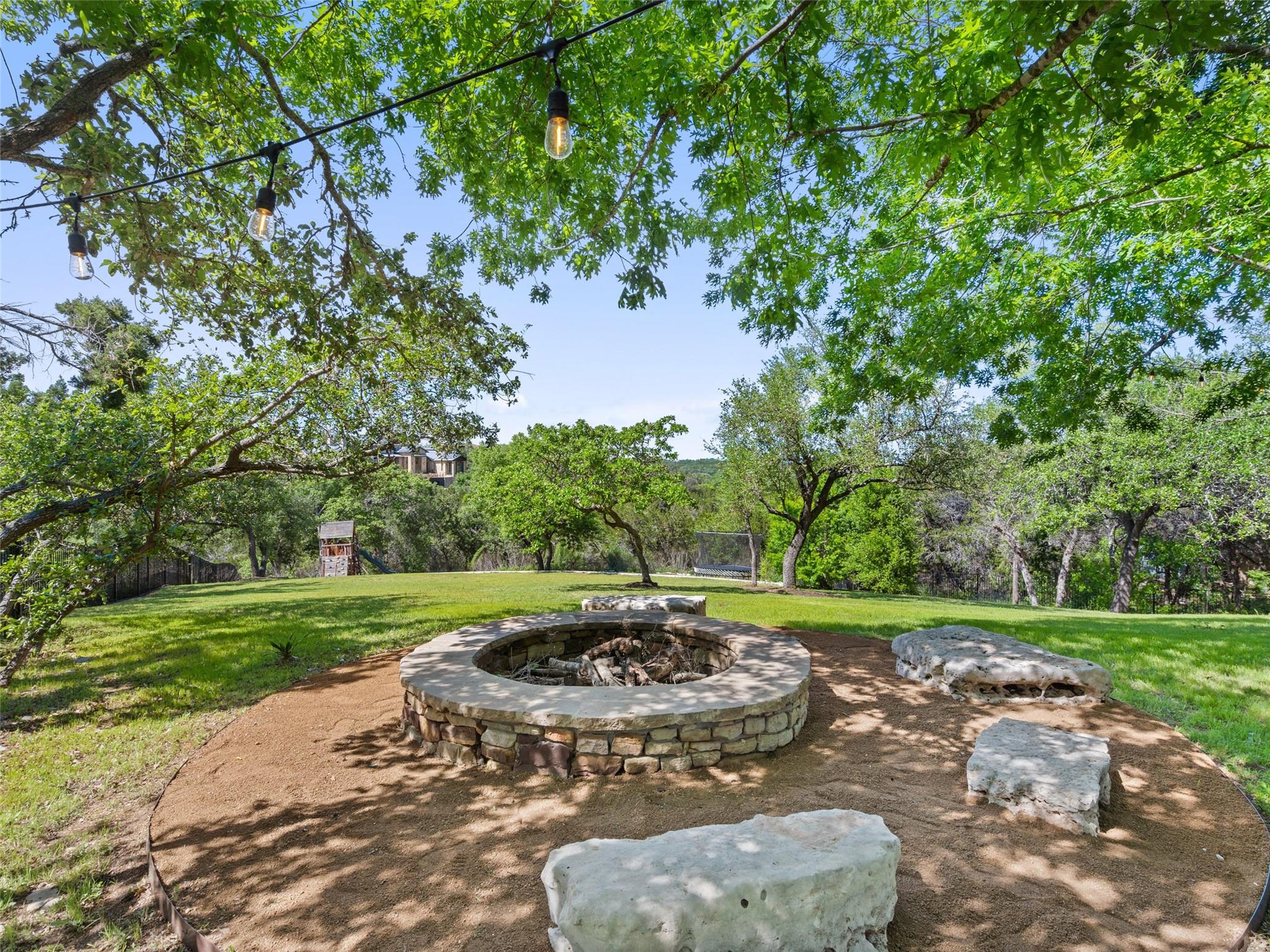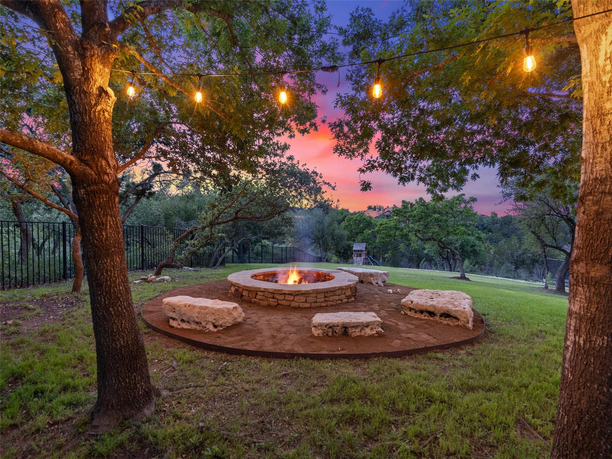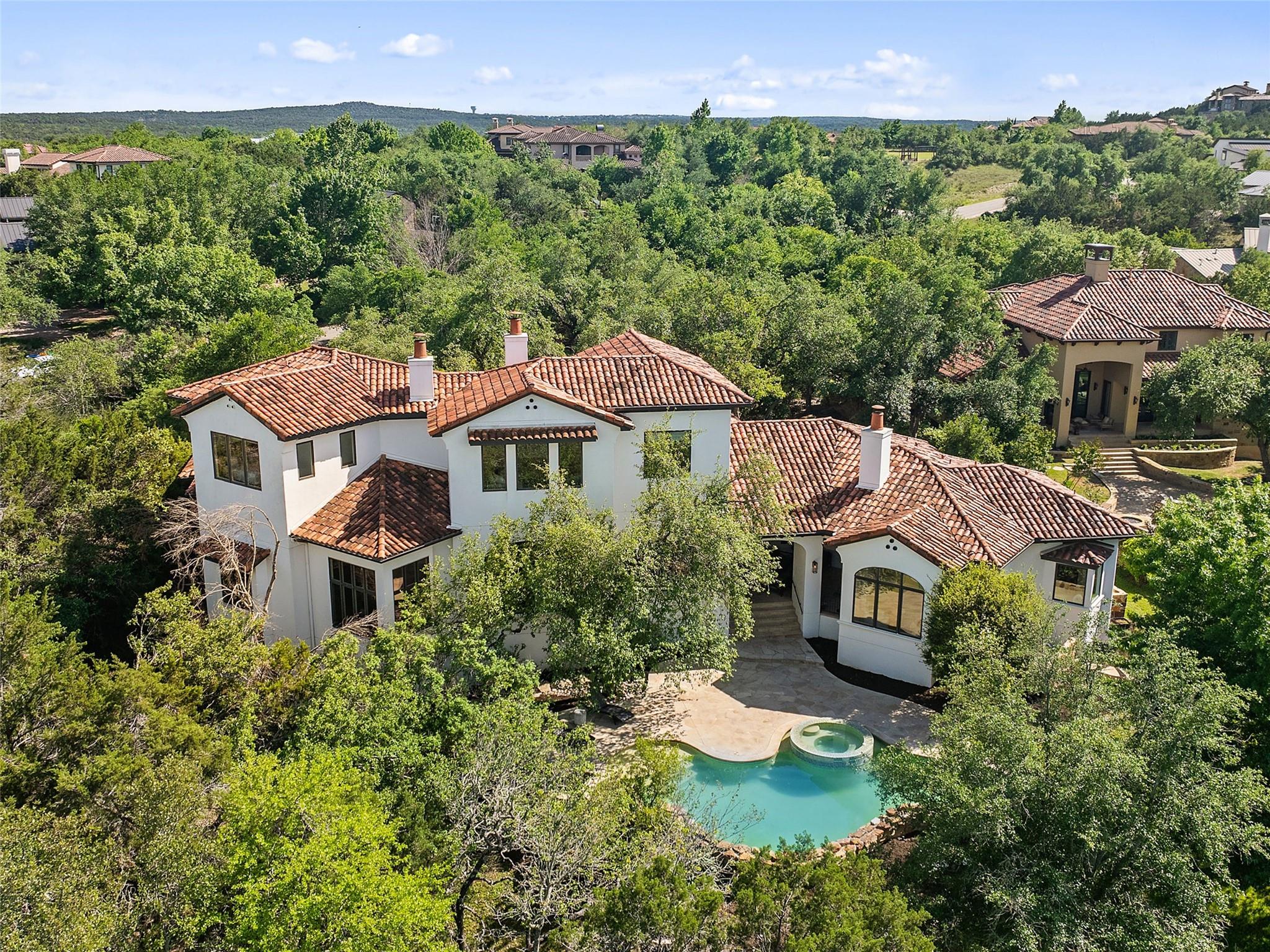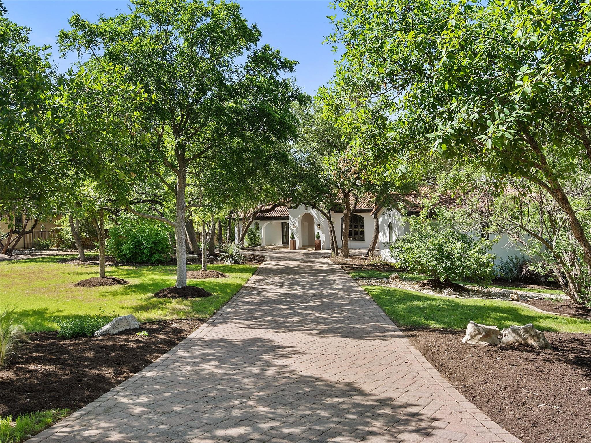 Nestled on one of the most coveted flat streets within Spanish Oaks, this elegant Santa Barbara-style residence exudes sophistication and charm, the home's structure and design promise enduring quality. Situated on a sprawling 1.5-acre lot adorned with lush Spanish & Live Oak trees, this property offers a tranquil sanctuary. The outdoor space is an entertainer's dream, featuring a full kitchen & a seating area with a gas fireplace. The extended yard also offers a play area w/ playset and trampoline, w/ ample room to add casita. The home's southern exposure floods the interiors with abundant natural light throughout the day. White Oak hardwood floors, natural stone, & solid wood doors grace every corner, complemented by two powder rooms flanking each side of the home. The study offers extensive shelving and picturesque views of the driveway and oak trees. A large stone fireplace anchors the living room, which boasts generous windows framing views of the sprawling oak trees and provides access to the patio. The kitchen serves as the heart of the home, boasting an oversized island, SSl appliances, soaring ceilings, breakfast area, large walk-in pantry, & yet another fireplace. The primary suite enjoys oversized windows offering views of the diverse oak trees, the primary bath features a tub, double vanity, walk-in shower, & spacious his/hers closets. Adjacent to the primary suite lies a guest room with an ensuite bath & access to the exterior, ideal for flexibility as a secondary office or nursery. Upstairs you will find 2 additional generous sized bedrooms w/ walk-in closets & ensuite baths, as well as a large secondary living space. With its thoughtful layout, this home effortlessly accommodates both entertaining & quiet family moments. Spanish Oaks is a 24-hour guard gated community with a private golf course, resort-style swimming pool, grill, hike and bike trails, fish camp, and tennis just outside the gates at Austin Tennis Academy.