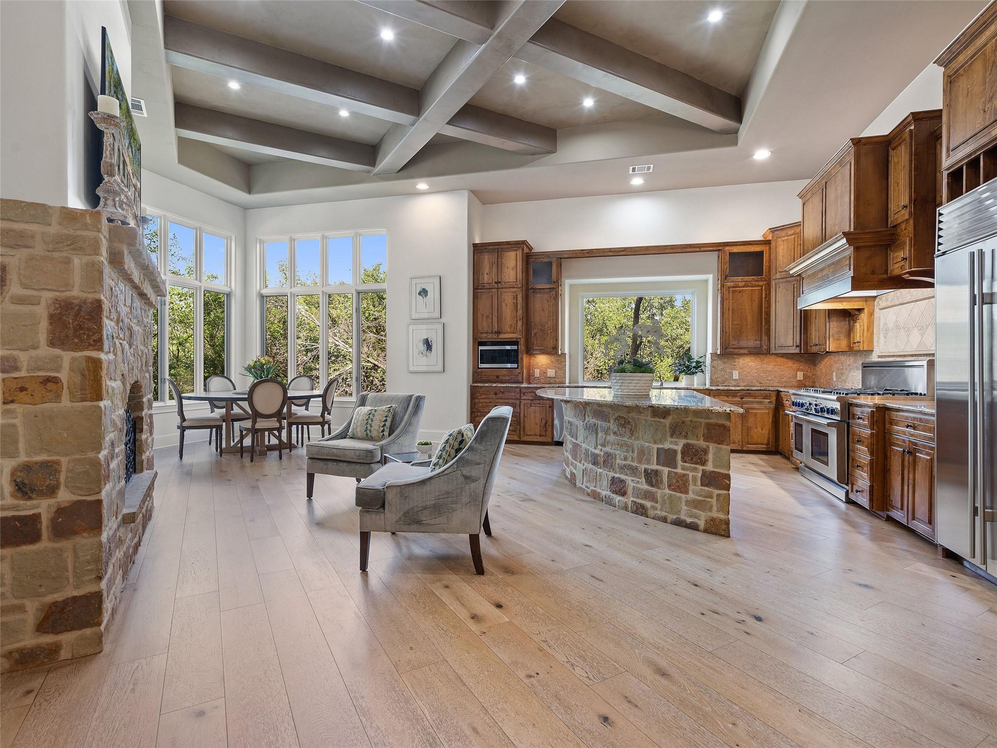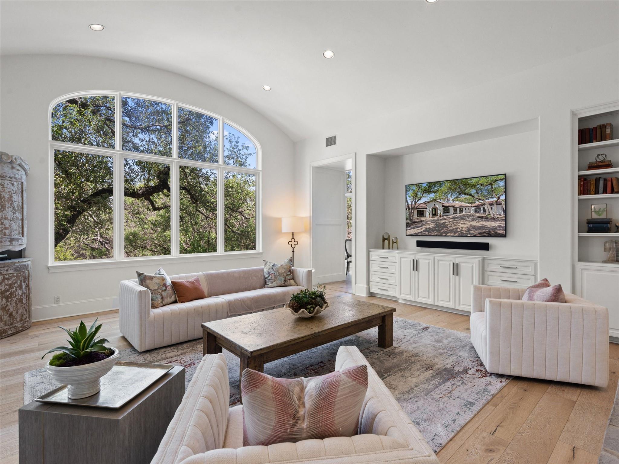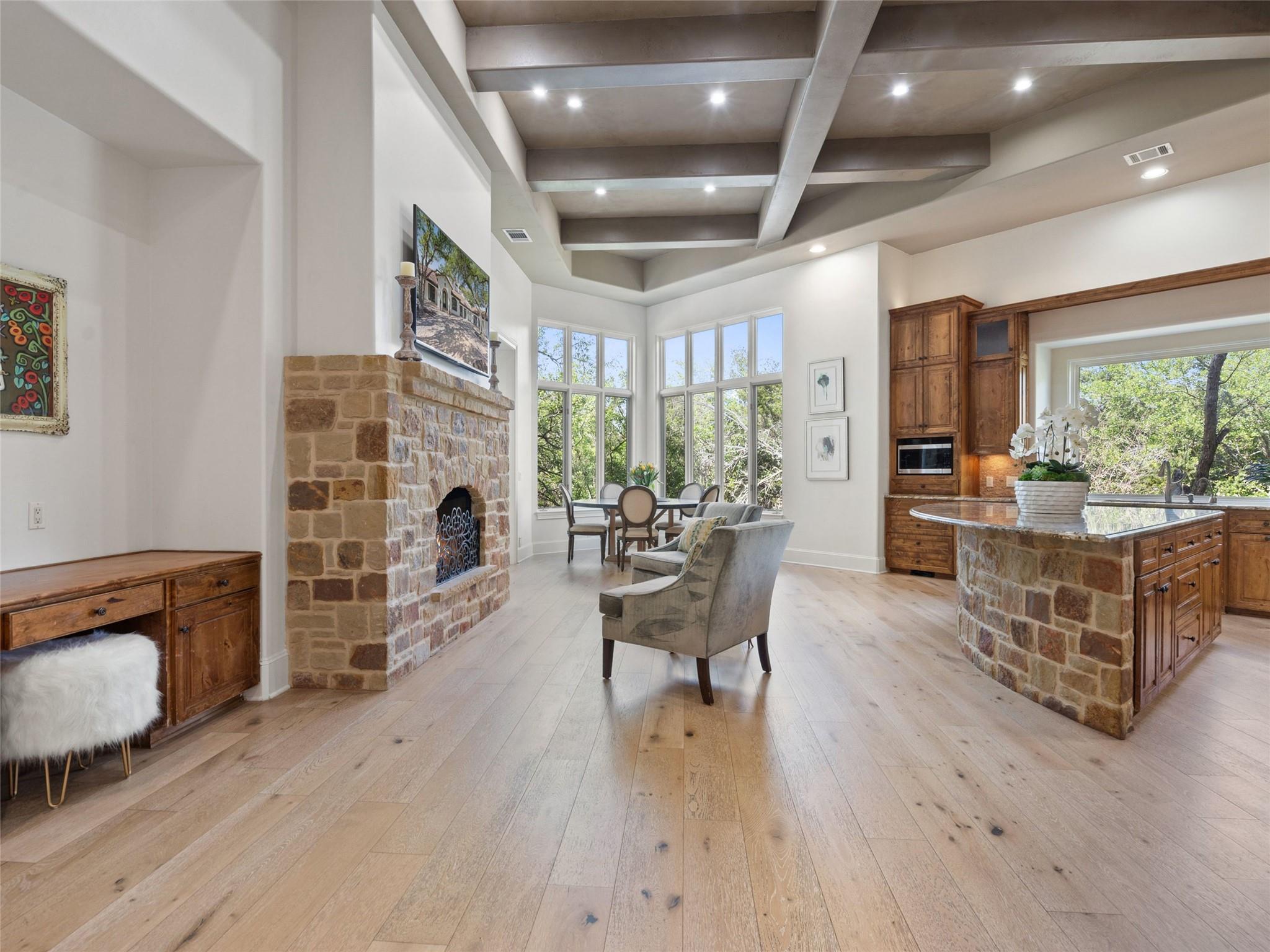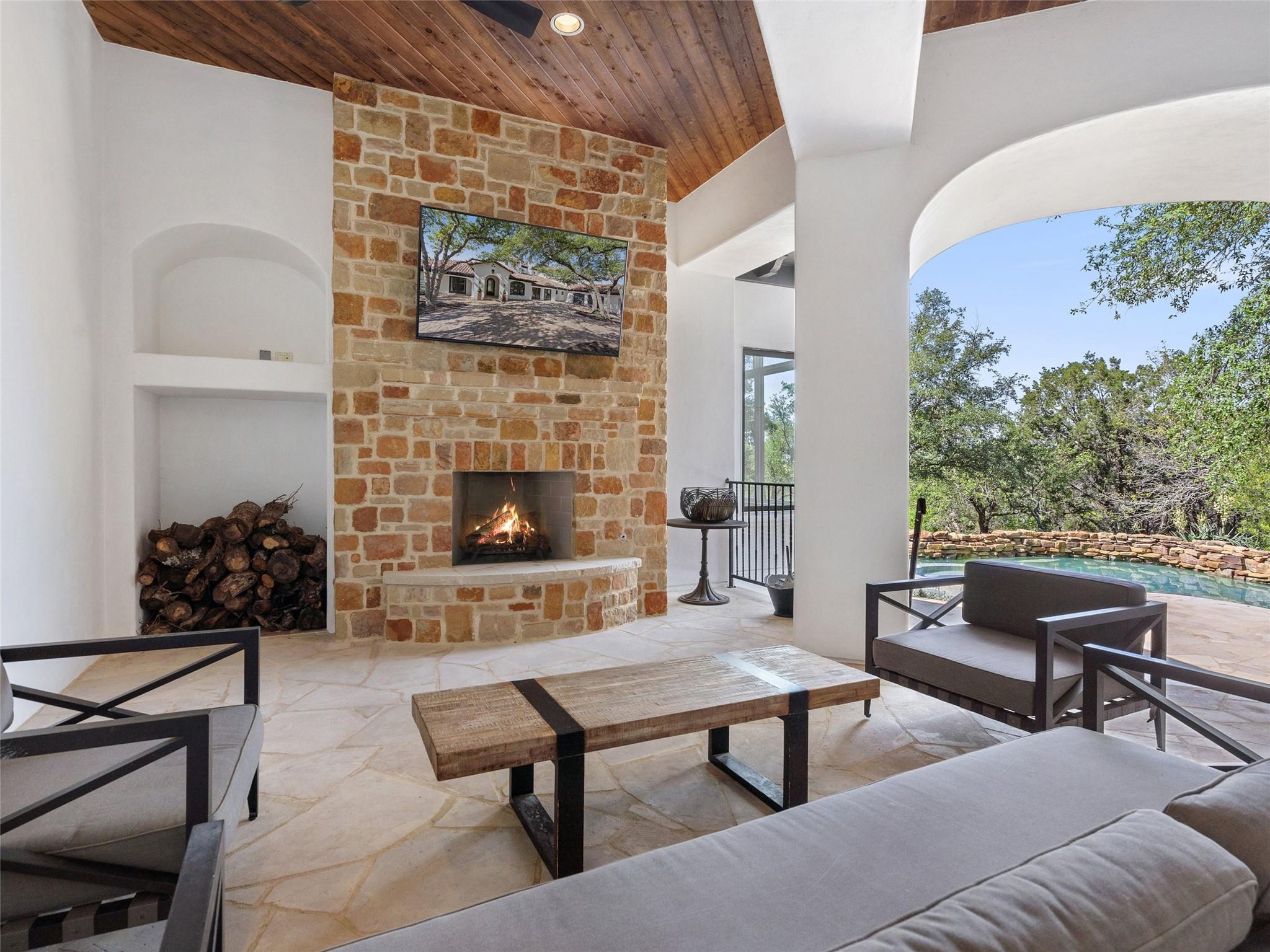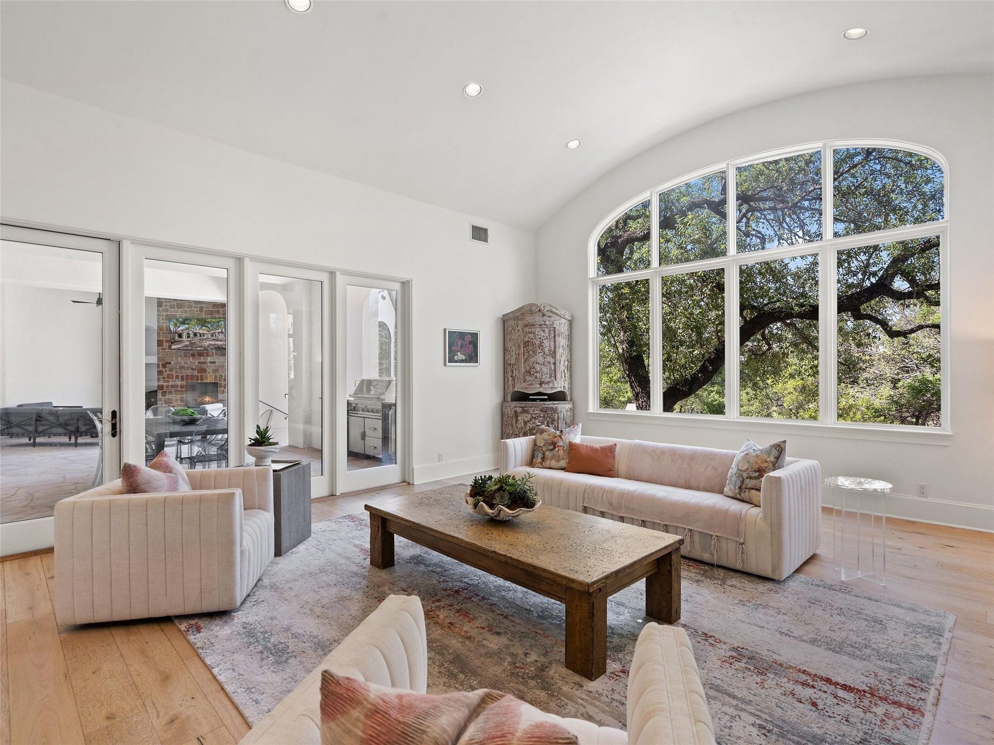 Nestled on one of the most coveted flat streets within Spanish Oaks, this elegant Santa Barbara-style residence exudes sophistication and charm, the home's structure and design promise enduring quality. Situated on a sprawling 1.5-acre lot adorned with lush Spanish & Live Oak trees, this property offers a tranquil sanctuary. The outdoor space is an entertainer's dream, featuring a full kitchen & a seating area with a gas fireplace. The extended yard also offers a play area w/ playset and trampoline, w/ ample room to add casita. The home's southern exposure floods the interiors with abundant natural light throughout the day. White Oak hardwood floors, natural stone, & solid wood doors grace every corner, complemented by two powder rooms flanking each side of the home. The study offers extensive shelving and picturesque views of the driveway and oak trees. A large stone fireplace anchors the living room, which boasts generous windows framing views of the sprawling oak trees and provides access to the patio. The kitchen serves as the heart of the home, boasting an oversized island, SSl appliances, soaring ceilings, breakfast area, large walk-in pantry, & yet another fireplace. The primary suite enjoys oversized windows offering views of the diverse oak trees, the primary bath features a tub, double vanity, walk-in shower, & spacious his/hers closets. Adjacent to the primary suite lies a guest room with an ensuite bath & access to the exterior, ideal for flexibility as a secondary office or nursery. Upstairs you will find 2 additional generous sized bedrooms w/ walk-in closets & ensuite baths, as well as a large secondary living space. With its thoughtful layout, this home effortlessly accommodates both entertaining & quiet family moments. Spanish Oaks is a 24-hour guard gated community with a private golf course, resort-style swimming pool, grill, hike and bike trails, fish camp, and tennis just outside the gates at Austin Tennis Academy.