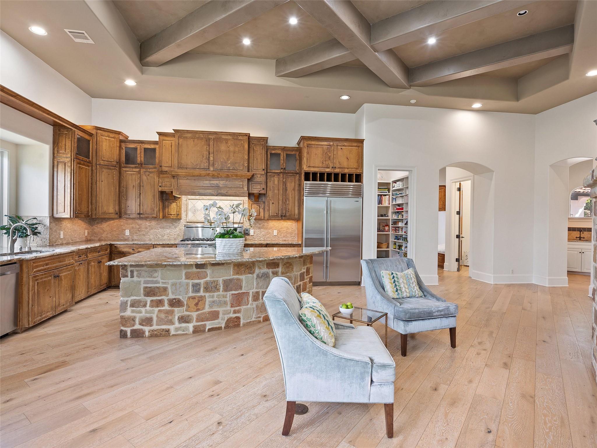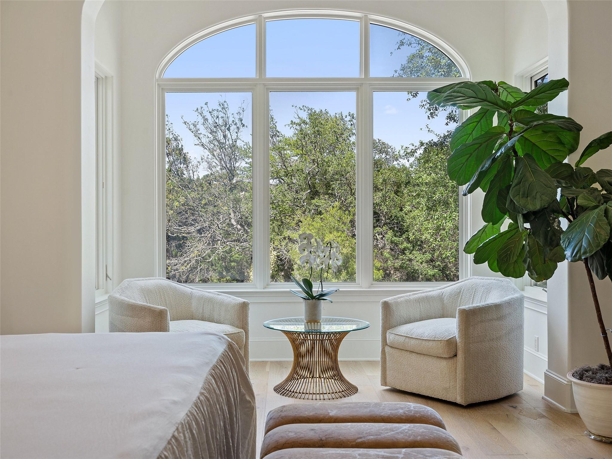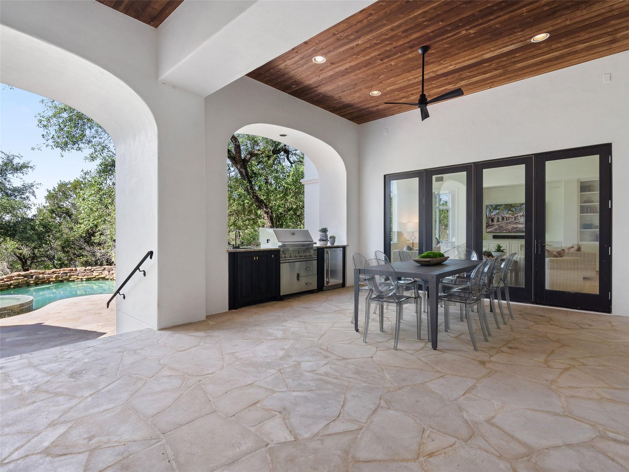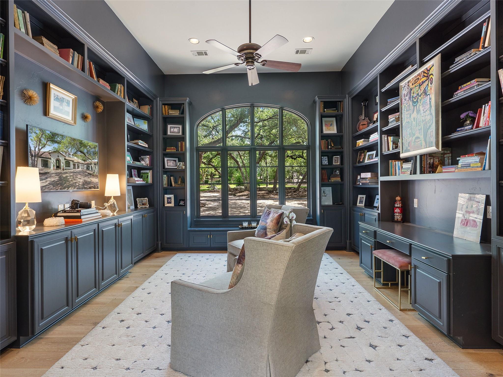 Nestled on one of the most coveted flat streets within Spanish Oaks, this elegant Santa Barbara-style residence exudes sophistication and charm, the home's structure and design promise enduring quality. Situated on a sprawling 1.5-acre lot adorned with lush Spanish & Live Oak trees, this property offers a tranquil sanctuary. The outdoor space is an entertainer's dream, featuring a full kitchen & a seating area with a gas fireplace. The extended yard also offers a play area w/ playset and trampoline, w/ ample room to add casita. The home's southern exposure floods the interiors with abundant natural light throughout the day. White Oak hardwood floors, natural stone, & solid wood doors grace every corner, complemented by two powder rooms flanking each side of the home. The study offers extensive shelving and picturesque views of the driveway and oak trees. A large stone fireplace anchors the living room, which boasts generous windows framing views of the sprawling oak trees and provides access to the patio. The kitchen serves as the heart of the home, boasting an oversized island, SSl appliances, soaring ceilings, breakfast area, large walk-in pantry, & yet another fireplace. The primary suite enjoys oversized windows offering views of the diverse oak trees, the primary bath features a tub, double vanity, walk-in shower, & spacious his/hers closets. Adjacent to the primary suite lies a guest room with an ensuite bath & access to the exterior, ideal for flexibility as a secondary office or nursery. Upstairs you will find 2 additional generous sized bedrooms w/ walk-in closets & ensuite baths, as well as a large secondary living space. With its thoughtful layout, this home effortlessly accommodates both entertaining & quiet family moments. Spanish Oaks is a 24-hour guard gated community with a private golf course, resort-style swimming pool, grill, hike and bike trails, fish camp, and tennis just outside the gates at Austin Tennis Academy.