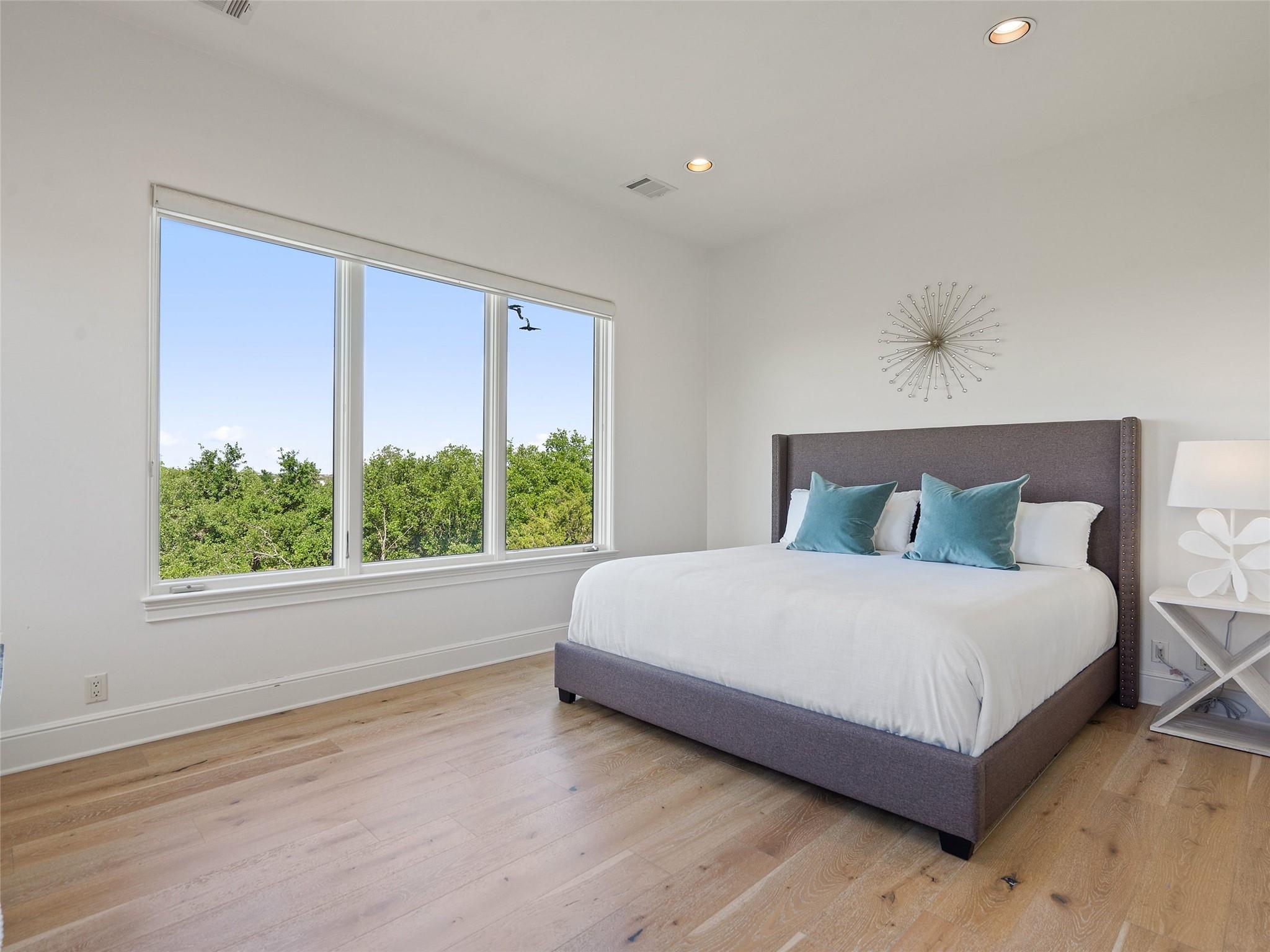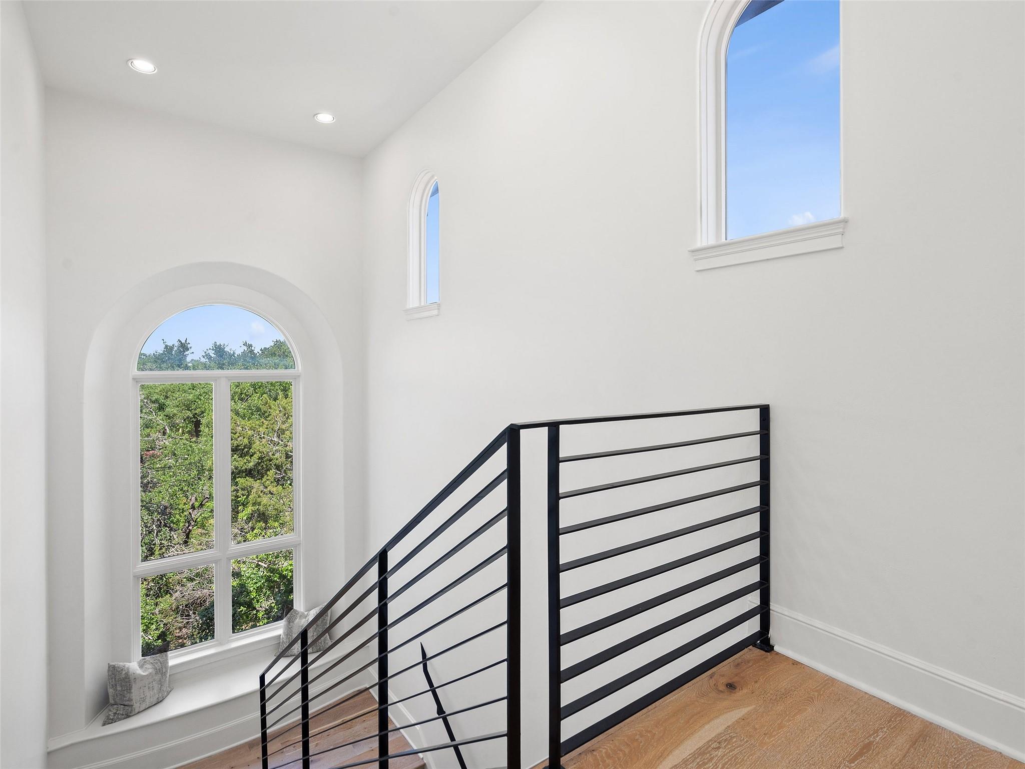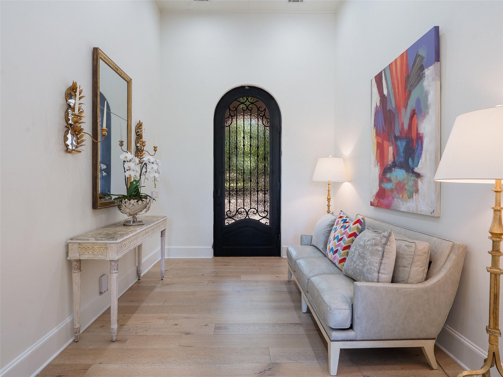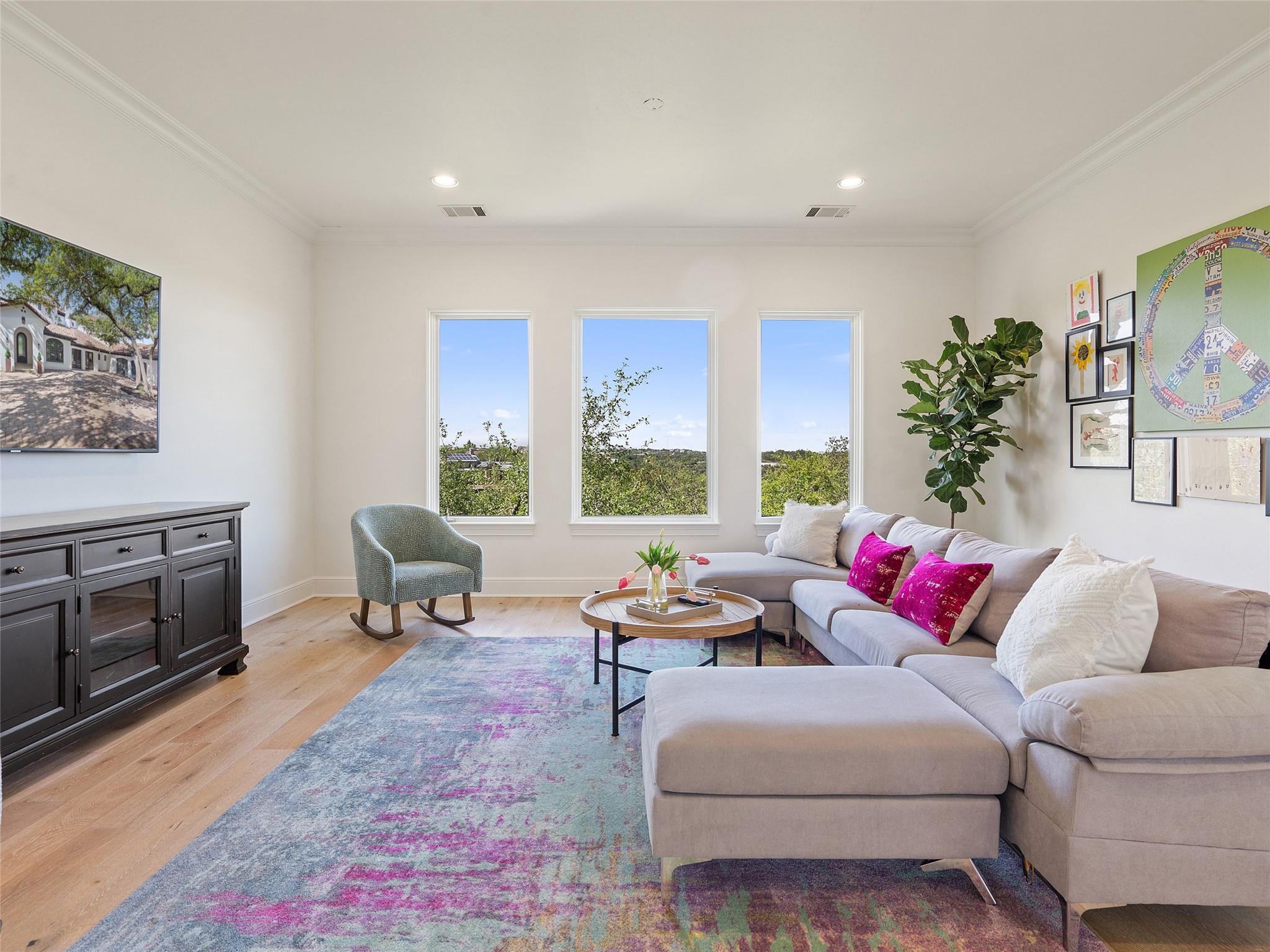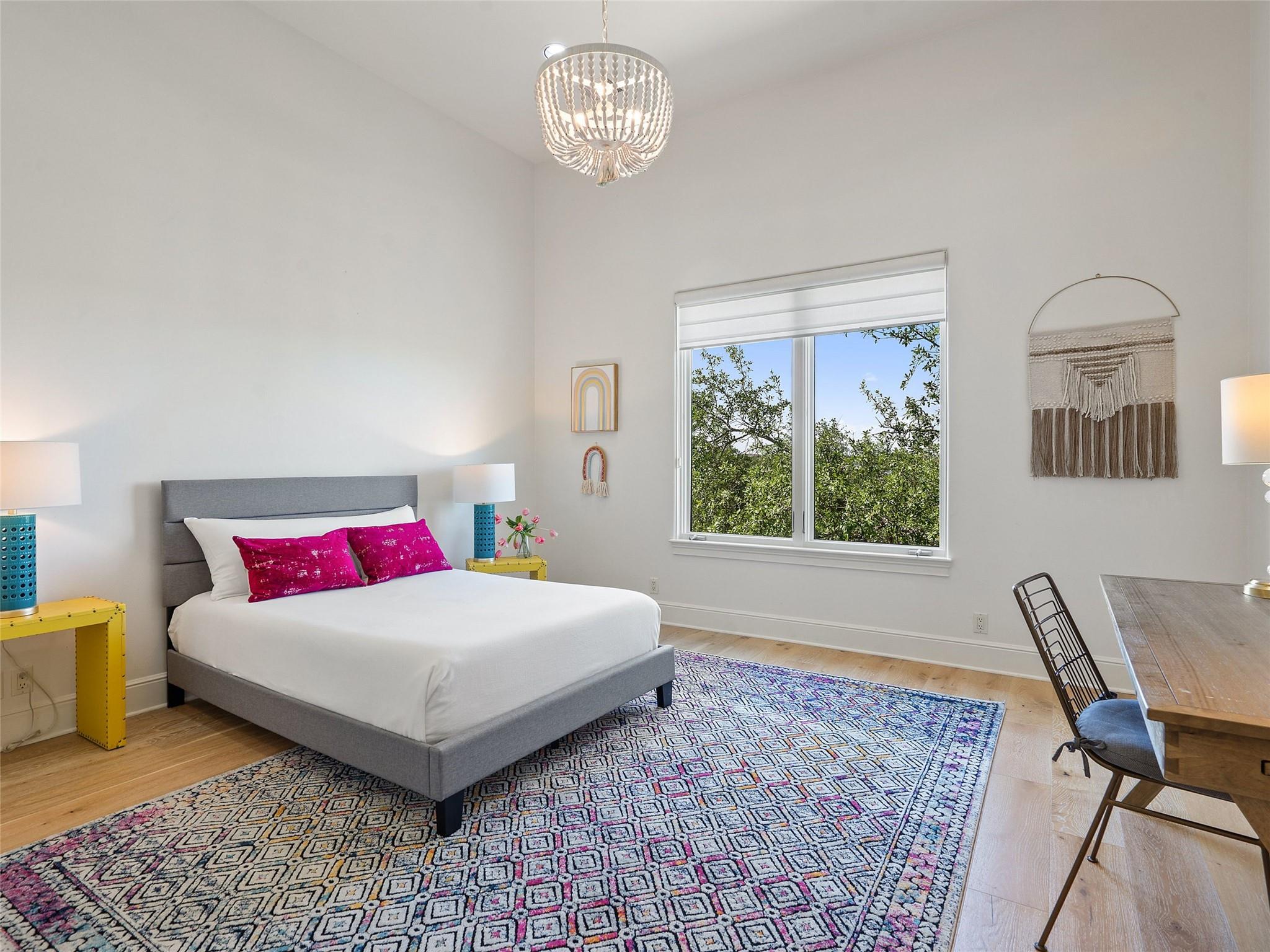 Nestled on one of the most coveted flat streets within Spanish Oaks, this elegant Santa Barbara-style residence exudes sophistication and charm, the home's structure and design promise enduring quality. Situated on a sprawling 1.5-acre lot adorned with lush Spanish & Live Oak trees, this property offers a tranquil sanctuary. The outdoor space is an entertainer's dream, featuring a full kitchen & a seating area with a gas fireplace. The extended yard also offers a play area w/ playset and trampoline, w/ ample room to add casita. The home's southern exposure floods the interiors with abundant natural light throughout the day. White Oak hardwood floors, natural stone, & solid wood doors grace every corner, complemented by two powder rooms flanking each side of the home. The study offers extensive shelving and picturesque views of the driveway and oak trees. A large stone fireplace anchors the living room, which boasts generous windows framing views of the sprawling oak trees and provides access to the patio. The kitchen serves as the heart of the home, boasting an oversized island, SSl appliances, soaring ceilings, breakfast area, large walk-in pantry, & yet another fireplace. The primary suite enjoys oversized windows offering views of the diverse oak trees, the primary bath features a tub, double vanity, walk-in shower, & spacious his/hers closets. Adjacent to the primary suite lies a guest room with an ensuite bath & access to the exterior, ideal for flexibility as a secondary office or nursery. Upstairs you will find 2 additional generous sized bedrooms w/ walk-in closets & ensuite baths, as well as a large secondary living space. With its thoughtful layout, this home effortlessly accommodates both entertaining & quiet family moments. Spanish Oaks is a 24-hour guard gated community with a private golf course, resort-style swimming pool, grill, hike and bike trails, fish camp, and tennis just outside the gates at Austin Tennis Academy.