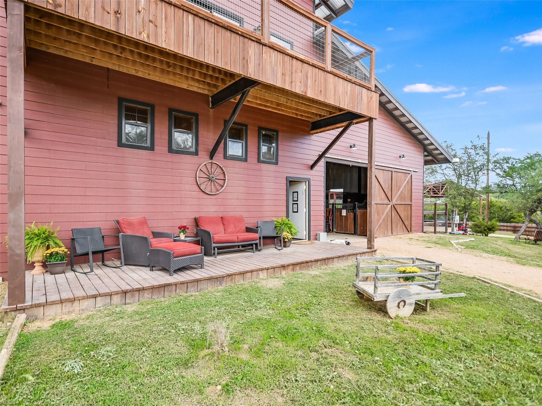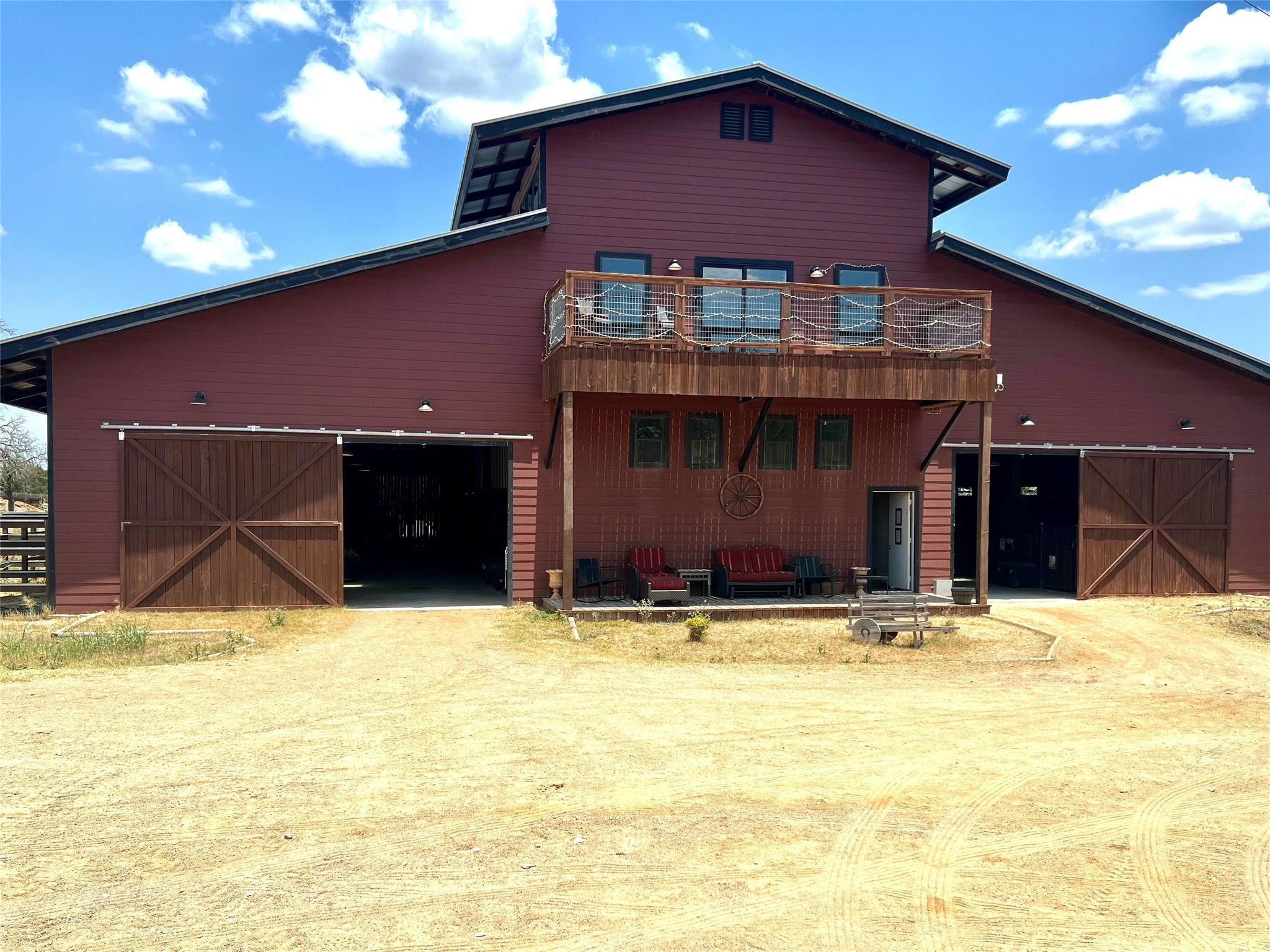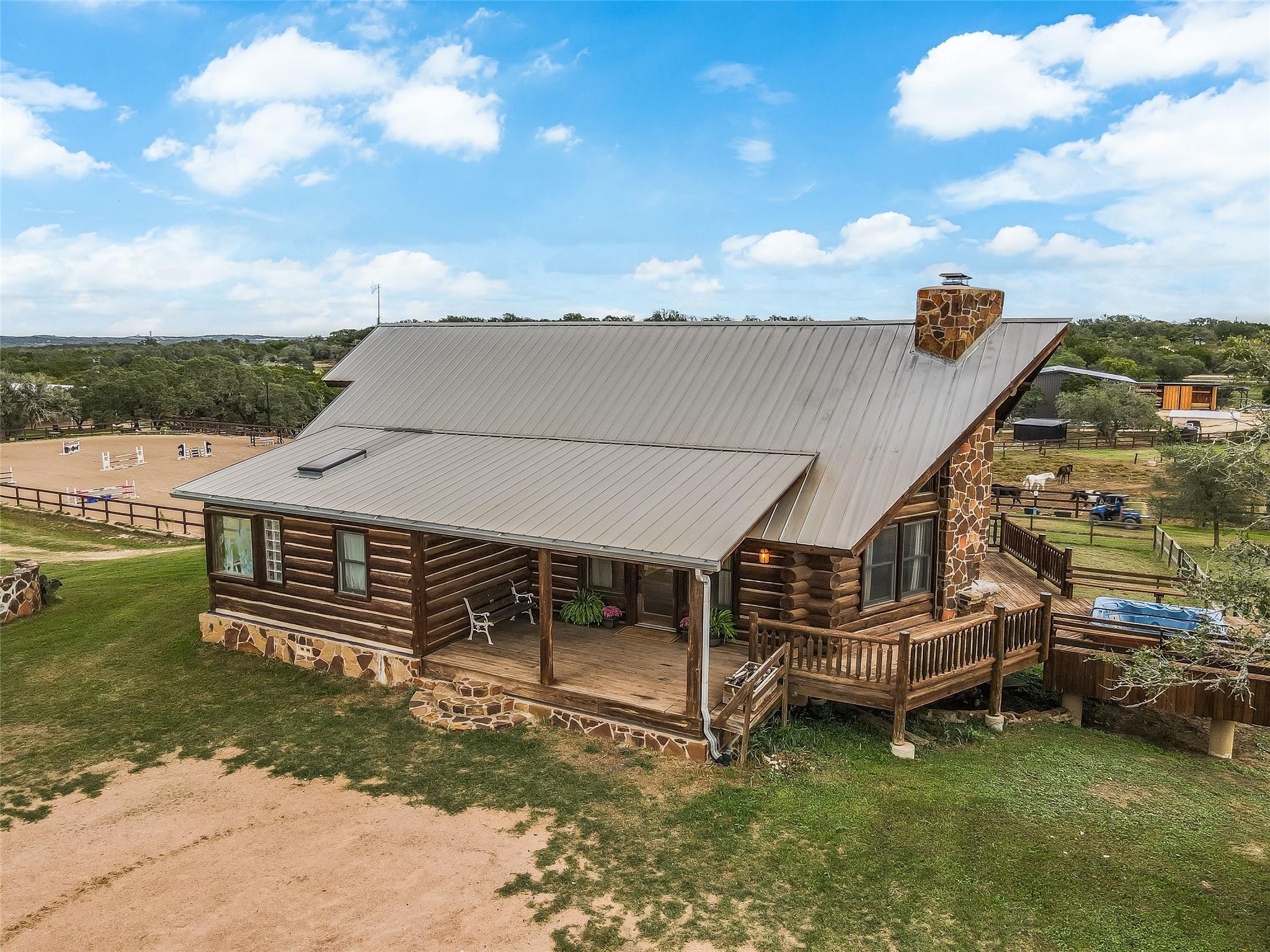 AUCTION: BID 26 JUNE–18 JULY. Listed for $3.35M. No Reserve. Starting Bids Expected Between $1M–$1.9M. Located in beautiful Texas hill country, this thoughtfully designed equestrian boarding and training facility has all the space needed for boarding and training horses and riders. Known as Querencia Stables, the property sits on 15+ acres with multiple buildings, including barns, holding pens, arenas, sheds, and a luxurious residential cabin. This expansive location includes a primary 20-stall barn with feed room, tack room, office, two upper level apartments, and a guest lounge with shiplap walls, a full bath, and coffee bar. The secondary barn has six stalls, second floor storage, and custom log construction. The large riding arena is fenced in the classic outdoor arena style. The smaller arena is a covered space. Included are 11 paddocks and a one-acre jump field. The two-story log cabin boasts exposed wood beams, stone chimney and fire-place, expansive windows and a cozy kitchen.