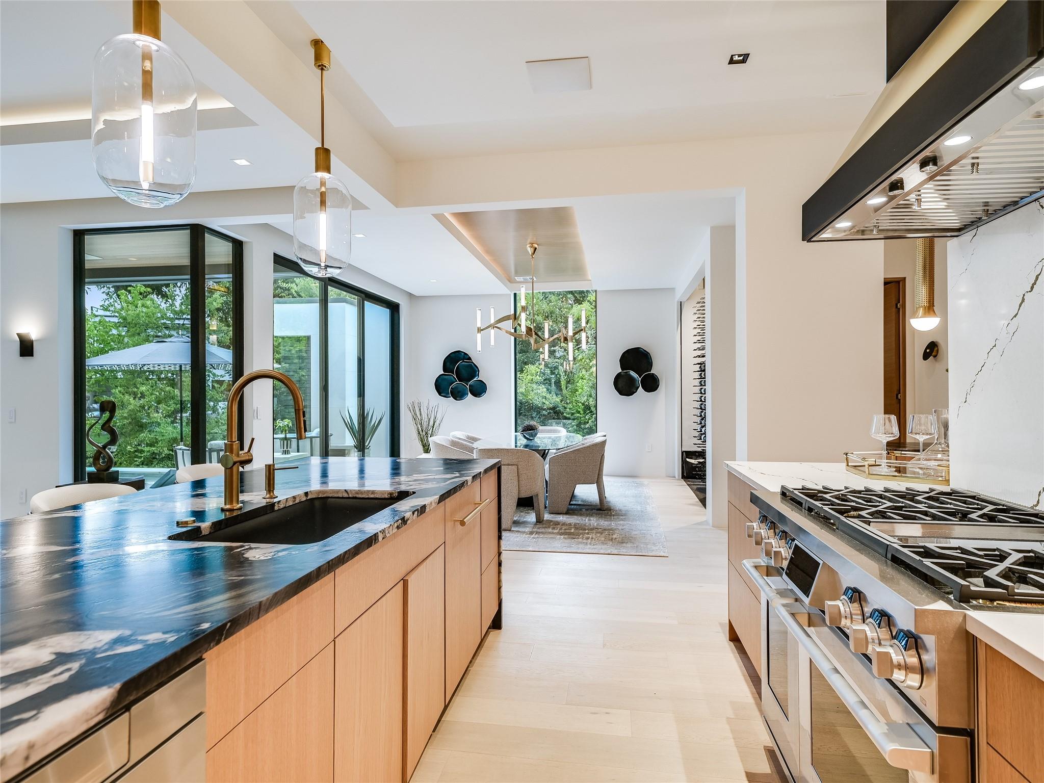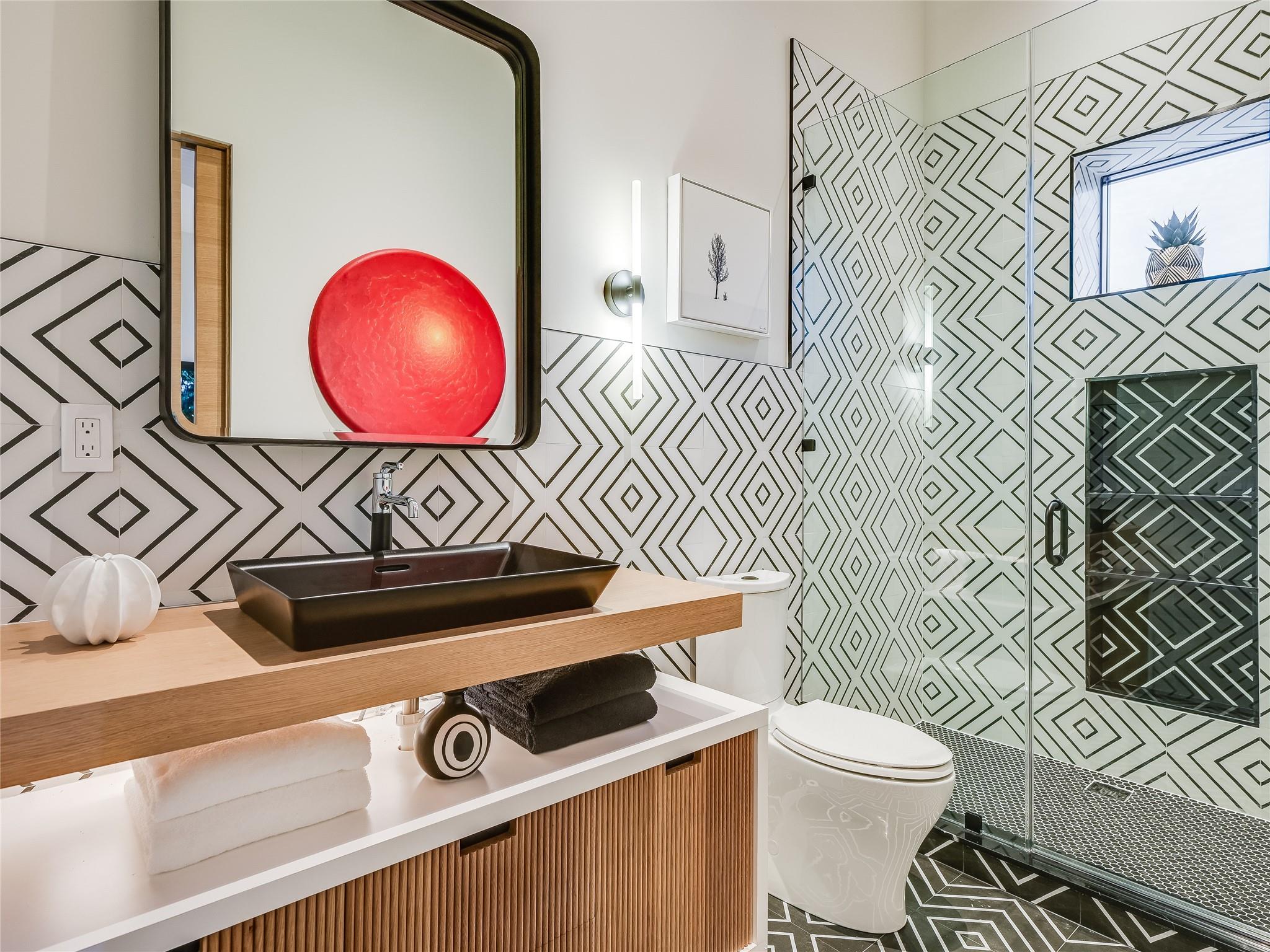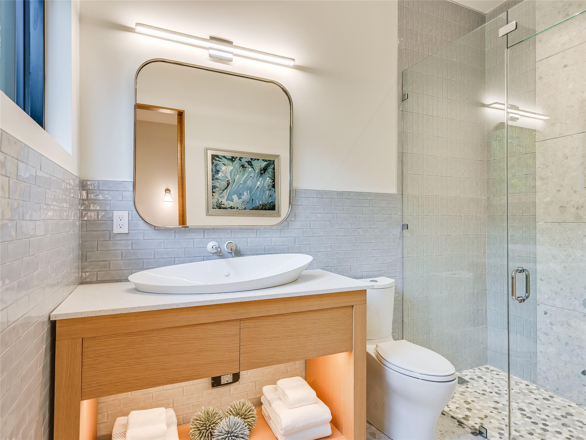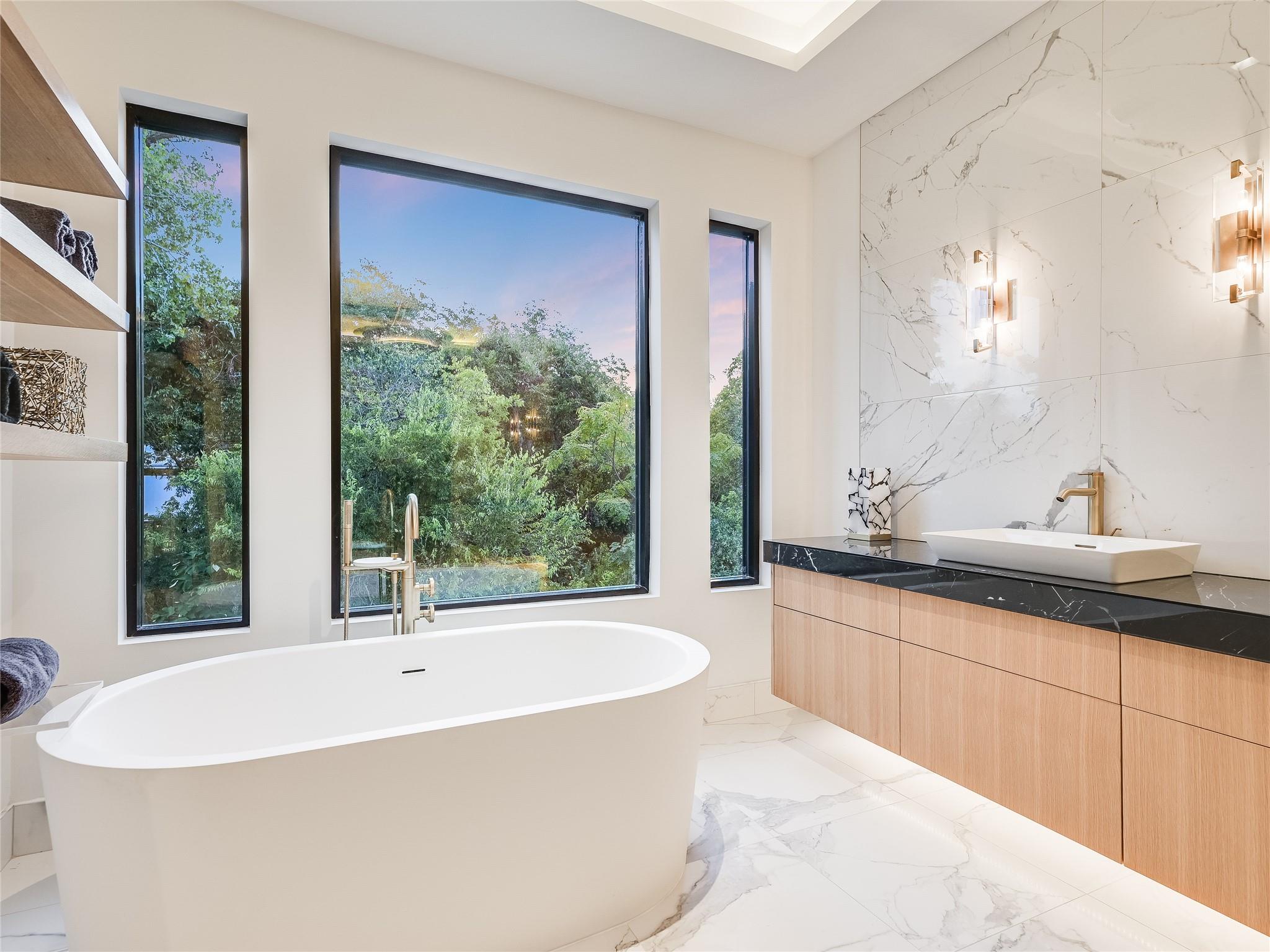 Indulge in refined living with this exceptional newly constructed residence in Austin's prestigious Travis Heights. This opulent home combines striking architectural design, impeccable craftsmanship, & lavish features to offer an unparalleled luxury lifestyle. From the entrance, marvel at the seamless integration of steel construction, creating floating rooms and expansive spaces. Every detail of this residence exudes contemporary elegance & comfort. Inside, experience sophistication with a level 5 finish and custom white oak floors, doors & cabinetry. Floor-to-ceiling windows fill the interiors with natural light, seamlessly blending indoor & outdoor living. The selection of materials & finishes is impeccable, including Italian porcelain & Hubbardton Forge lighting. Sound insulated walls ensure tranquility & recessed ceilings with back-lighting create a captivating atmosphere. The gourmet kitchen is a culinary masterpiece, equipped with top-of-the-line stainless steel appliances & a stunning black & white island with an exquisite leather finish. Step outside to a private oasis enclosed by a privacy wall—lounge by the poolside, which effortlessly transforms into a spa. The custom waterfall & pond add serenity, while the outdoor poolside TV offers entertainment. The deck, crafted from the finest Trex material, seamlessly extends the living space. A custom privacy screen with a vertical herb garden adds a touch of whimsy and elegance. The home also features a versatile office space that can serve as a fifth bedroom, wired for electronic exterior shades & adorned with Hubbardton Forge lighting. Indulge in sophistication with the temperature-controlled wine display featuring impressive 10' doors, perfect for wine enthusiasts. With its exceptional location in Travis Heights, renowned for its closeness to downtown, Lady Bird Lake and the SoCo district, this residence offers the epitome of sophisticated living.
