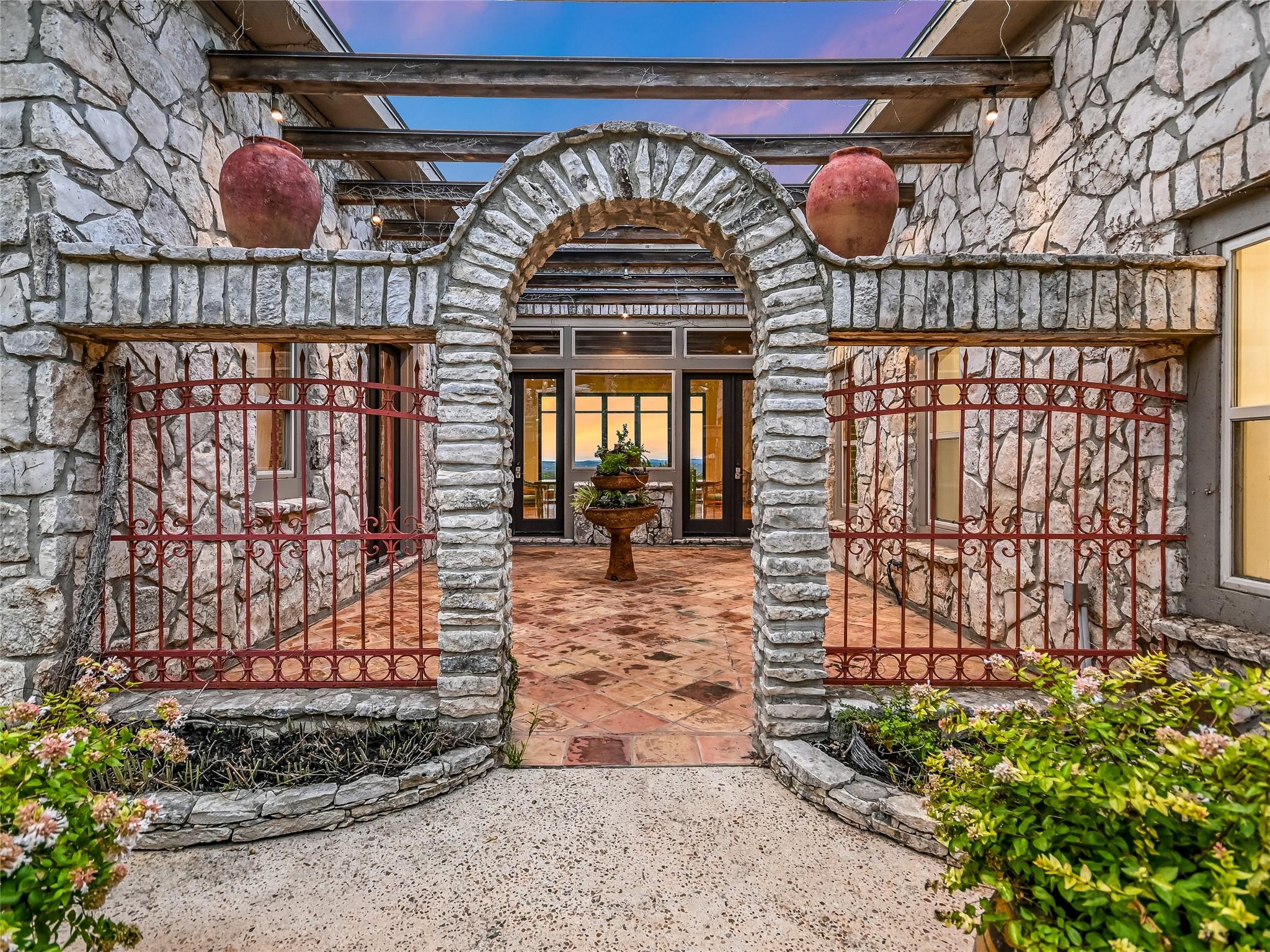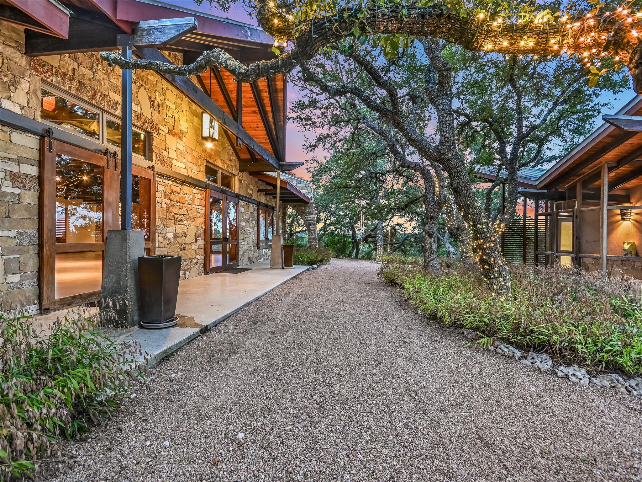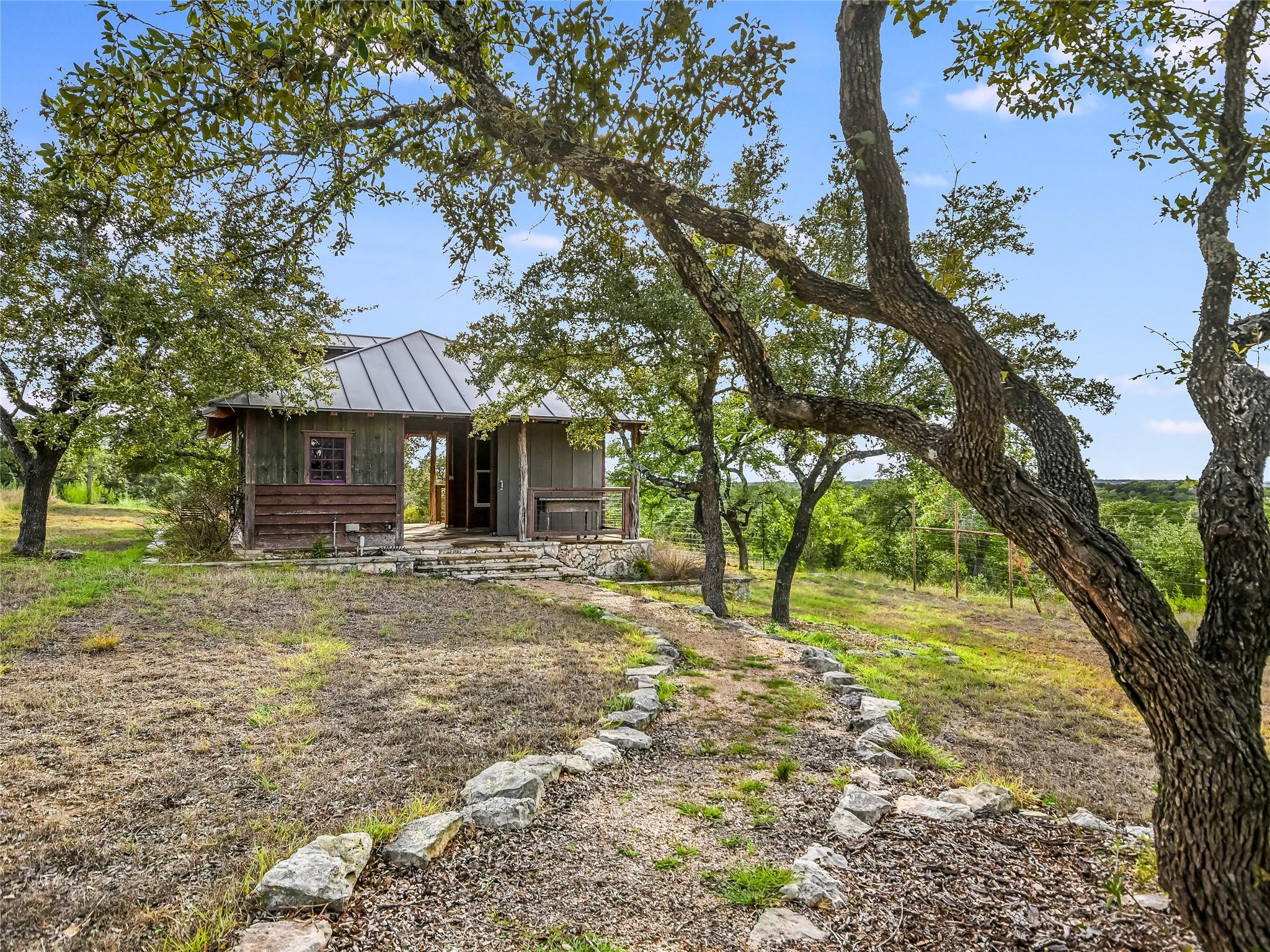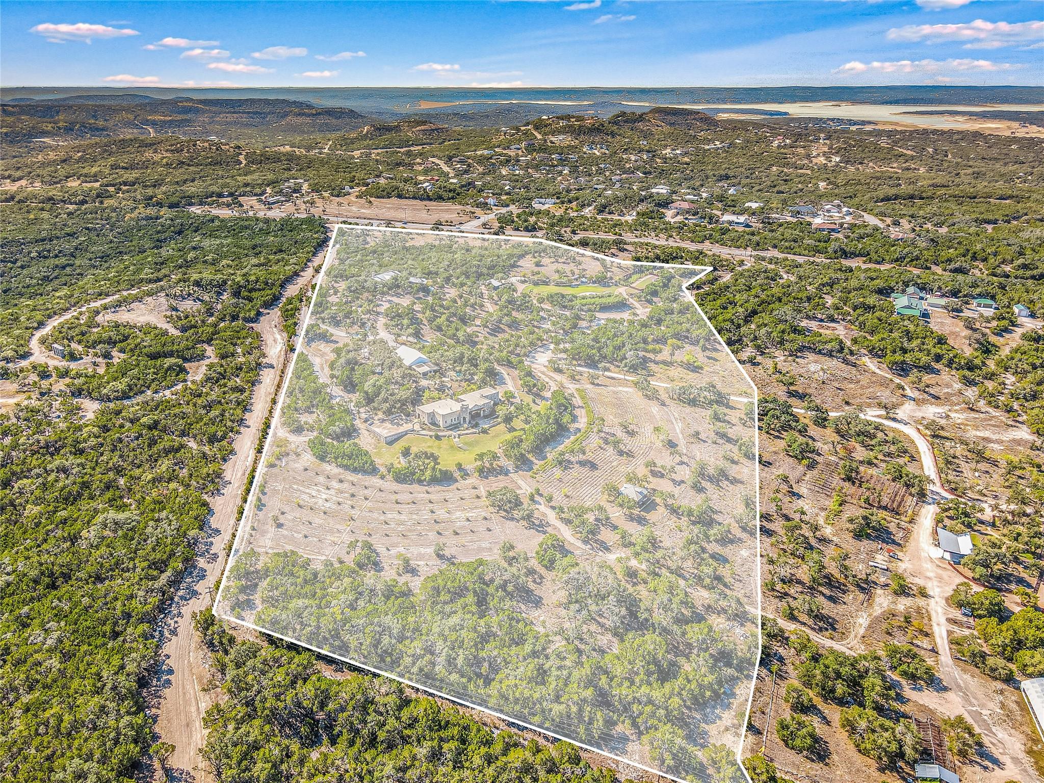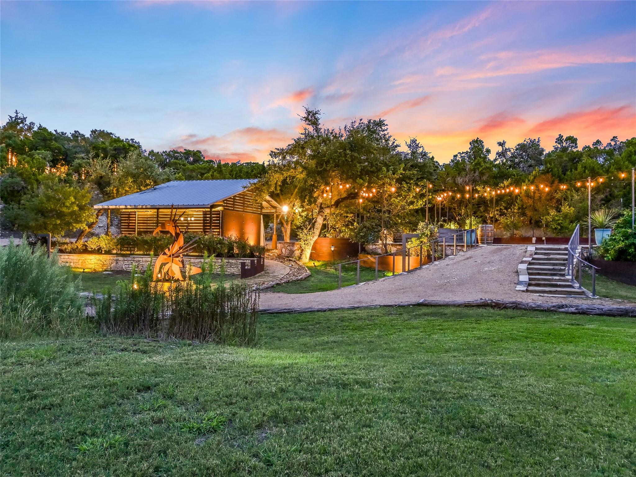 Tucked away within 30 meticulously landscaped acres, between San Marcos and Wimberley, Rancho Mirando stands as a breathtaking Hill Country Event Venue & Luxury Guest Ranch, at an elevated position of panoramic views of the Devil's Backbone spanning over 2 counties. The land has undergone 15years of restoration to native grasses & wildflowers and the removal of cedar trees allowing the installation of a 60 tree Olive Grove. This estate boasts a cool castle-like Hacienda, built in 2001, of 3834 sqft. With 4 bedrooms, 3 1/2 baths, 3 living areas, a fully equipped kitchen, a utility room, a double garage, two sprawling patios, and an ample 192+/- sqft storage area, it effortlessly accommodates up to 16 guests in true Texas comfort.Step outside, and you'll find an inviting oasis that includes a covered BBQ terrace, a refreshing pool with a cascading waterfall, and an adjacent 500 +/- sq ft tented area - all designed for relaxation & celebration while enjoying those captivating views.Across the way, is a view oriented, building constructed in 2011, the Pavilion. It is a contemporary Texas Hill Country style designed by AIA Architect Mark W Canada with approximately 3500 sqft of versatile space. Complete with multiple terraces, a fully equipped commercial kitchen, & spellbinding vistas.Descend the steps, and you'll come upon charming Bella Vista Bar & Patio & Park, complete with a welcoming serving bar and a limestone patio. The exquisite Bella Vista area stands as a picturesque park amid natural beauty.The potential of this remarkable property is as boundless as your imagination. Ideal for weddings, rehearsal dinners, joyous celebrations, corporate and family retreats, inspiring cooking classes, memorable awards ceremonies, cinematic filming locations, and heartwarming family or class reunions.With 30 sprawling acres at your disposal, envision creating additional cottages or living spaces to expand your dreams. NOTE: Taxes & Tax Information are estimates.