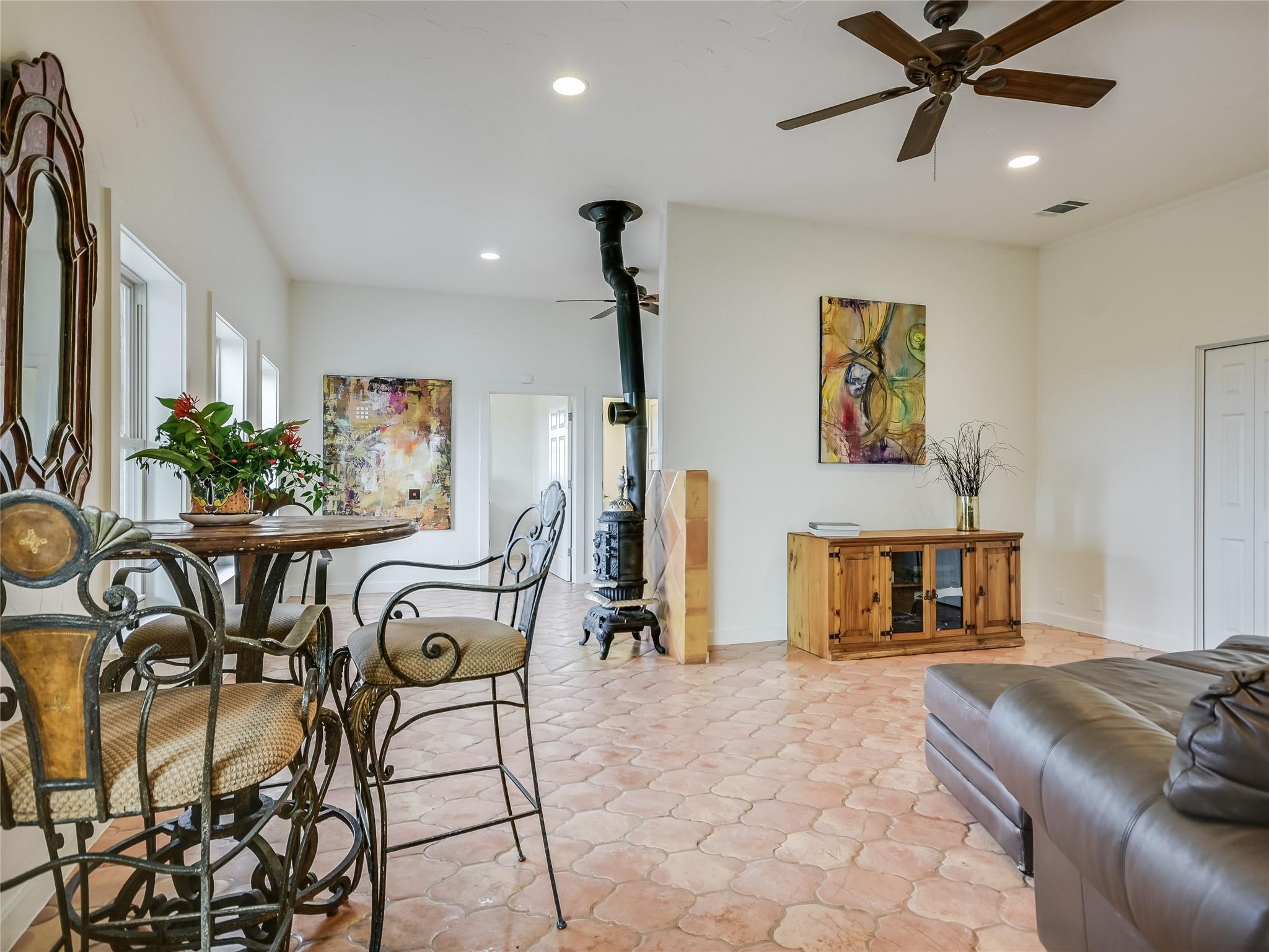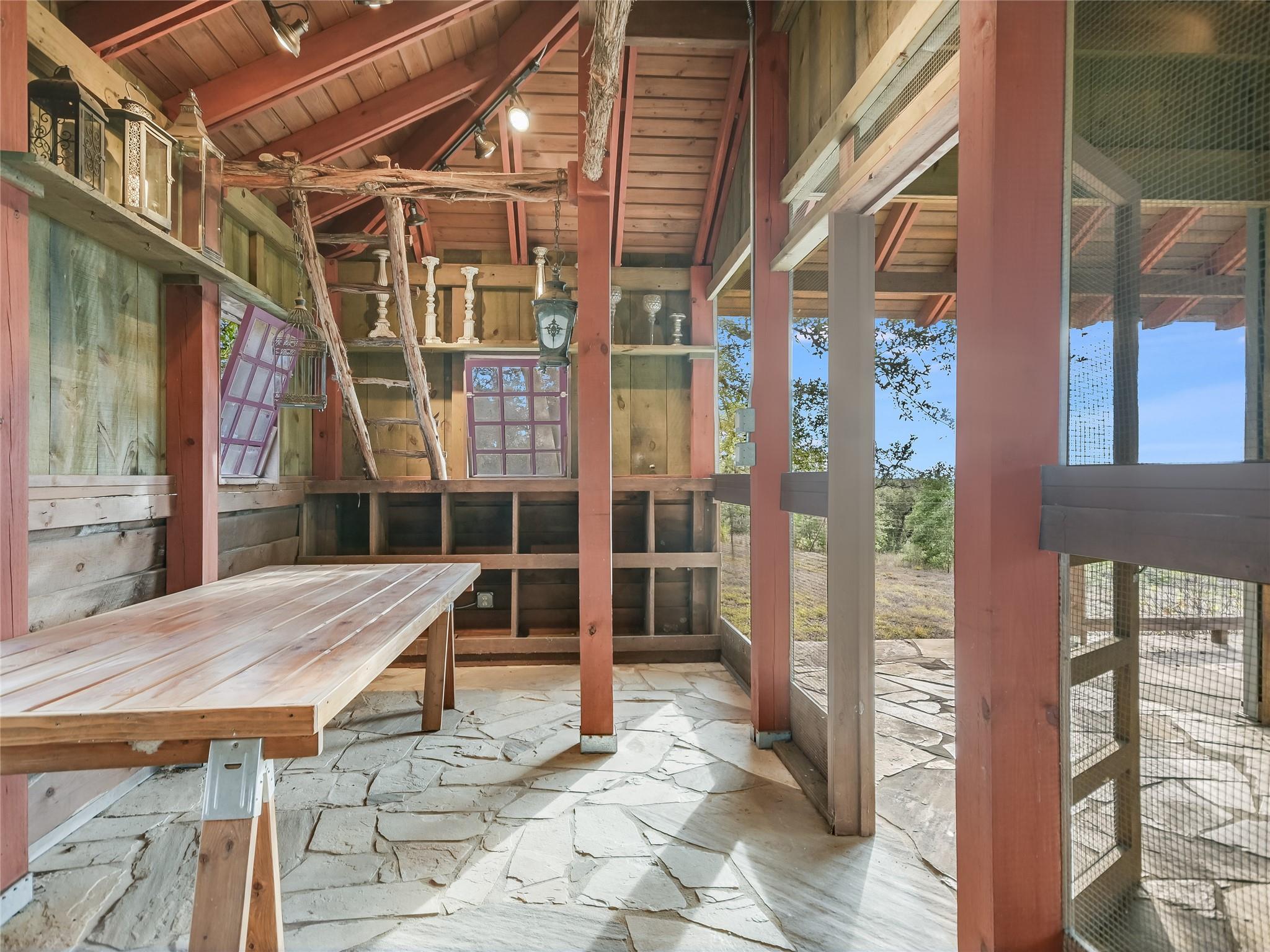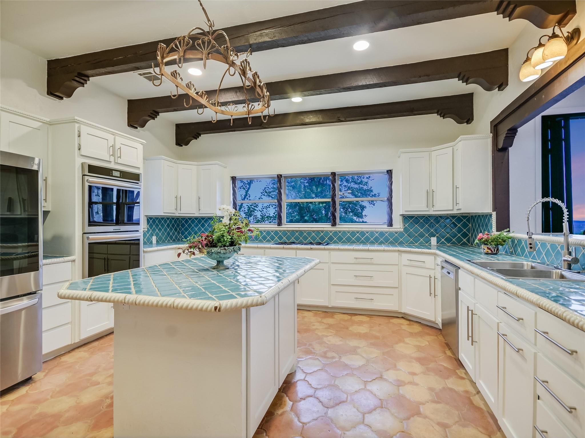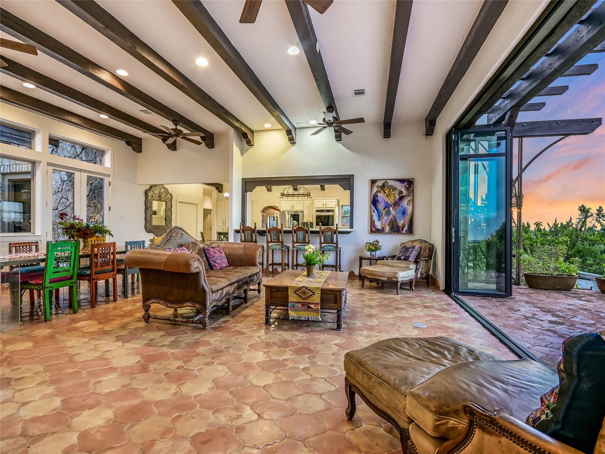| Interior Features | Two Primary Suties, Breakfast Bar, Ceiling Fan(s), Beamed Ceilings, High Ceilings, Tile Counters, Double Vanity, Kitchen Island, Multiple Dining Areas, Multiple Living Areas, No Interior Steps, Open Floorplan, Pantry, Primary Bedroom on Main, Recessed Lighting, Storage, Track Lighting, Two Primary Closets, Walk-In Closet(s) | |