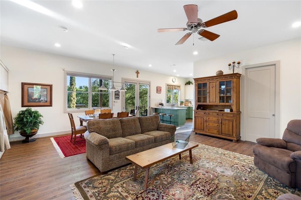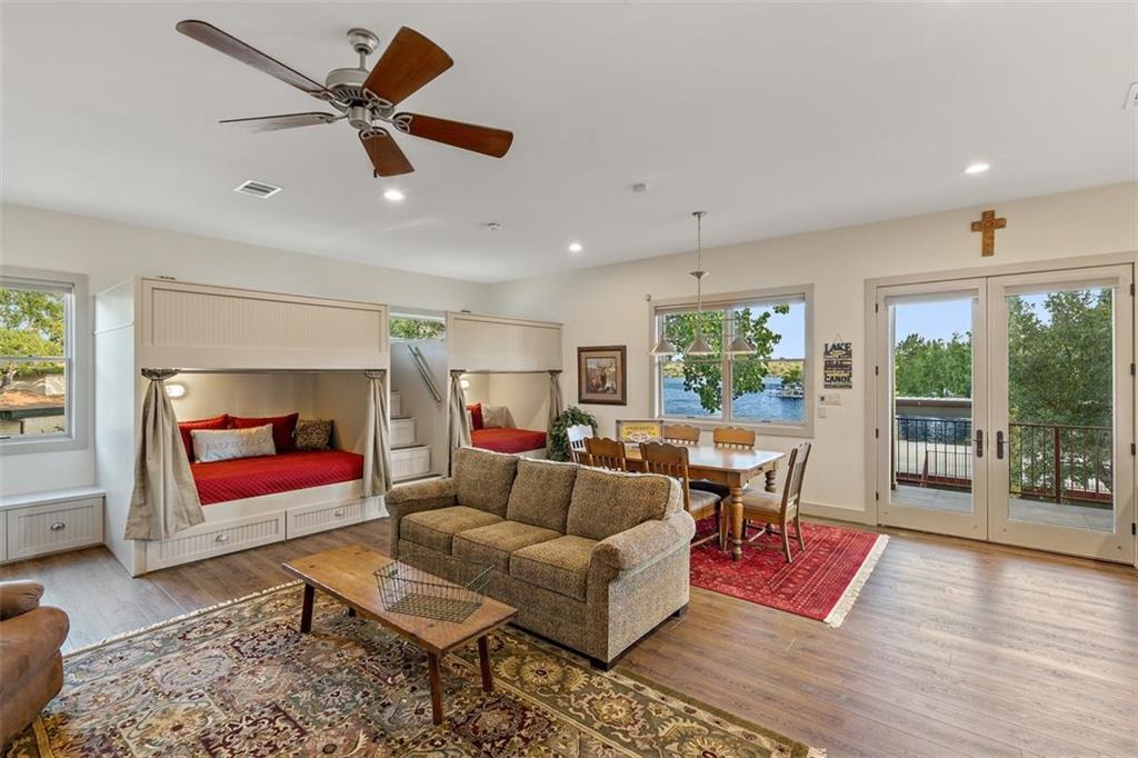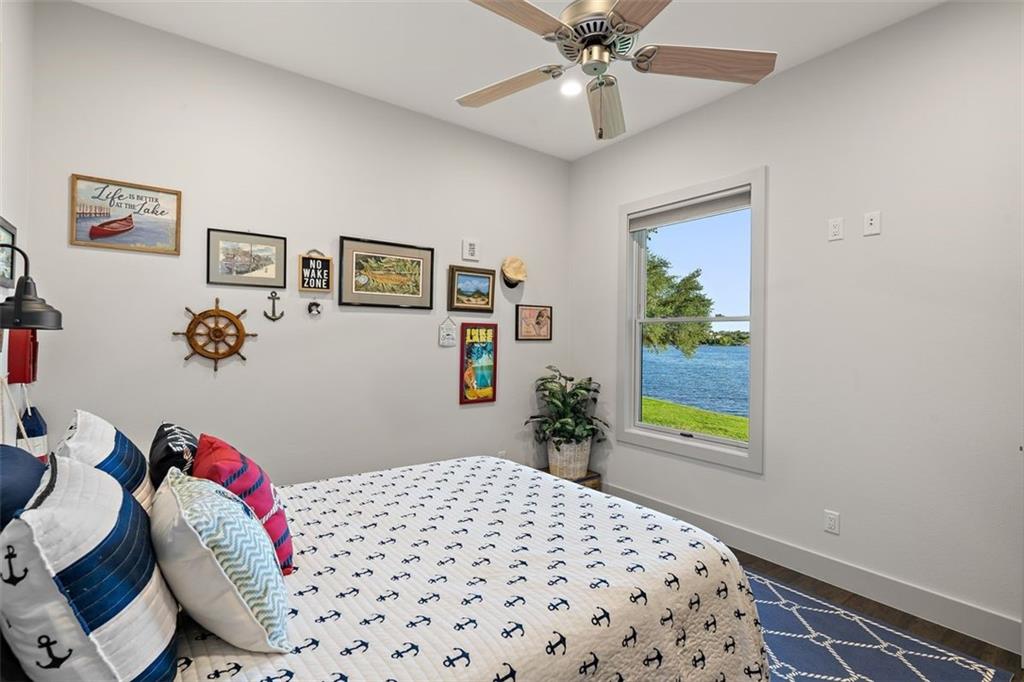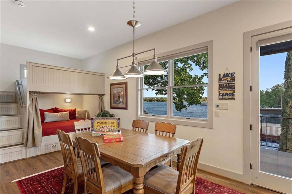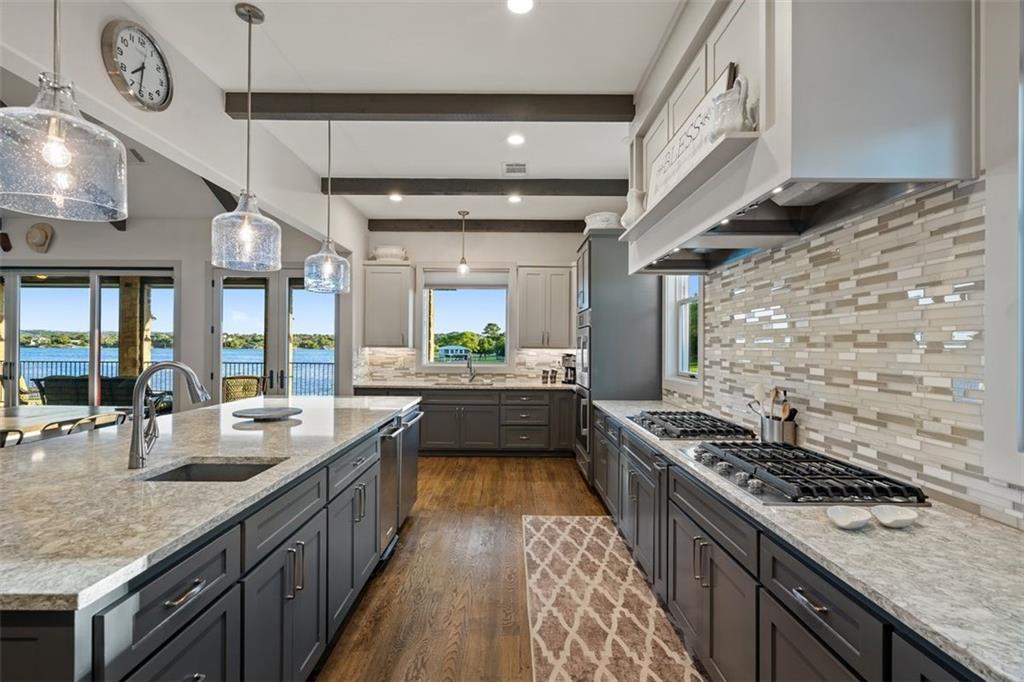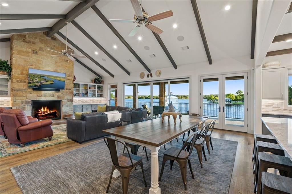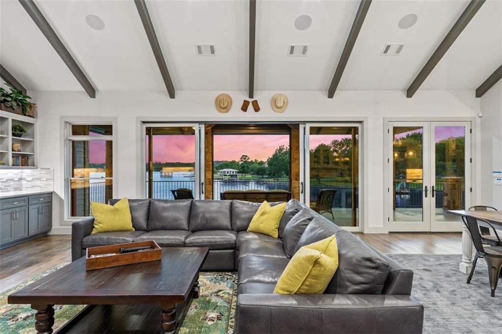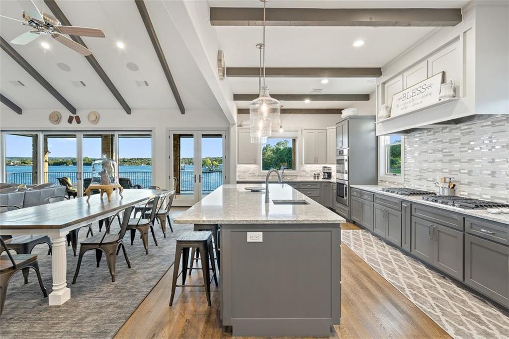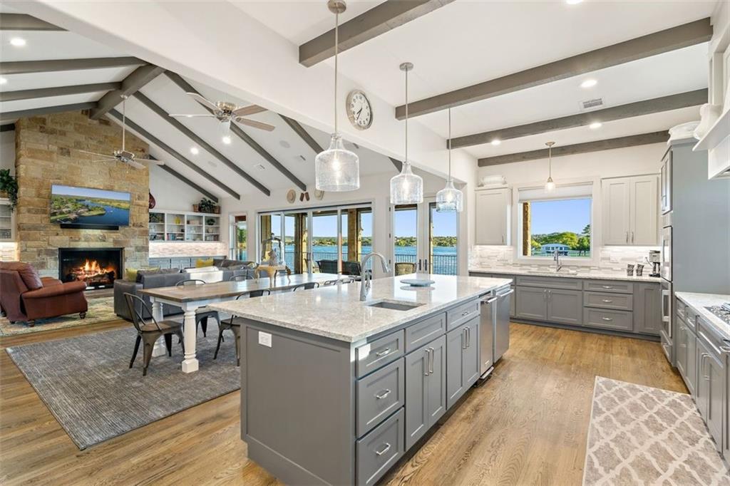 If you are lucky enough to be on Inks Lake, you are lucky enough! 114 Bluebonnet is a remarkable lake house in every aspect, built to thoroughly enjoy the good life while overlooking miles and miles of sparkling blue water on serene Inks Lake. The 325' of stunning open waterfront is the focus of this family compound, excellent watersports, fishing, swimming, boating, kayaking and paddle boarding, even a great lake swing with bounce blob to bounce your kids into the air… WHAT FUN! So many outdoor entertaining areas situated on a huge 1.82 acres! Absolute Perfection! A private gated entrance leads to the beautiful main home which is newer construction, built in 2021 with a light and airy color palette that features a stunning master suite, 2 large guest bedrooms, an open concept living area with fireplace and wet bar, vaulted, beamed ceilings a huge chef’s kitchen with high-end appliance package. The patio with remote shades provides even more outdoor living space. Outdoor lower level features an outdoor kitchen and covered entertaining space ready for great Bar-B-Q. Excellent boat house, with two stalls, has deck above boat house with covered patio area. A guest apartment sits above the 3-car garage with workshop. The living quarters are perfect for large families, providing them with space & privacy & the 4 built-in bunks are adorable as well as practical. Inks Lake is revered for its serenity and consistent level, the 831-acre lake is located just an hour from Austin and 2 Hours from San Antonio. Life is Short! Buy the Lake House!