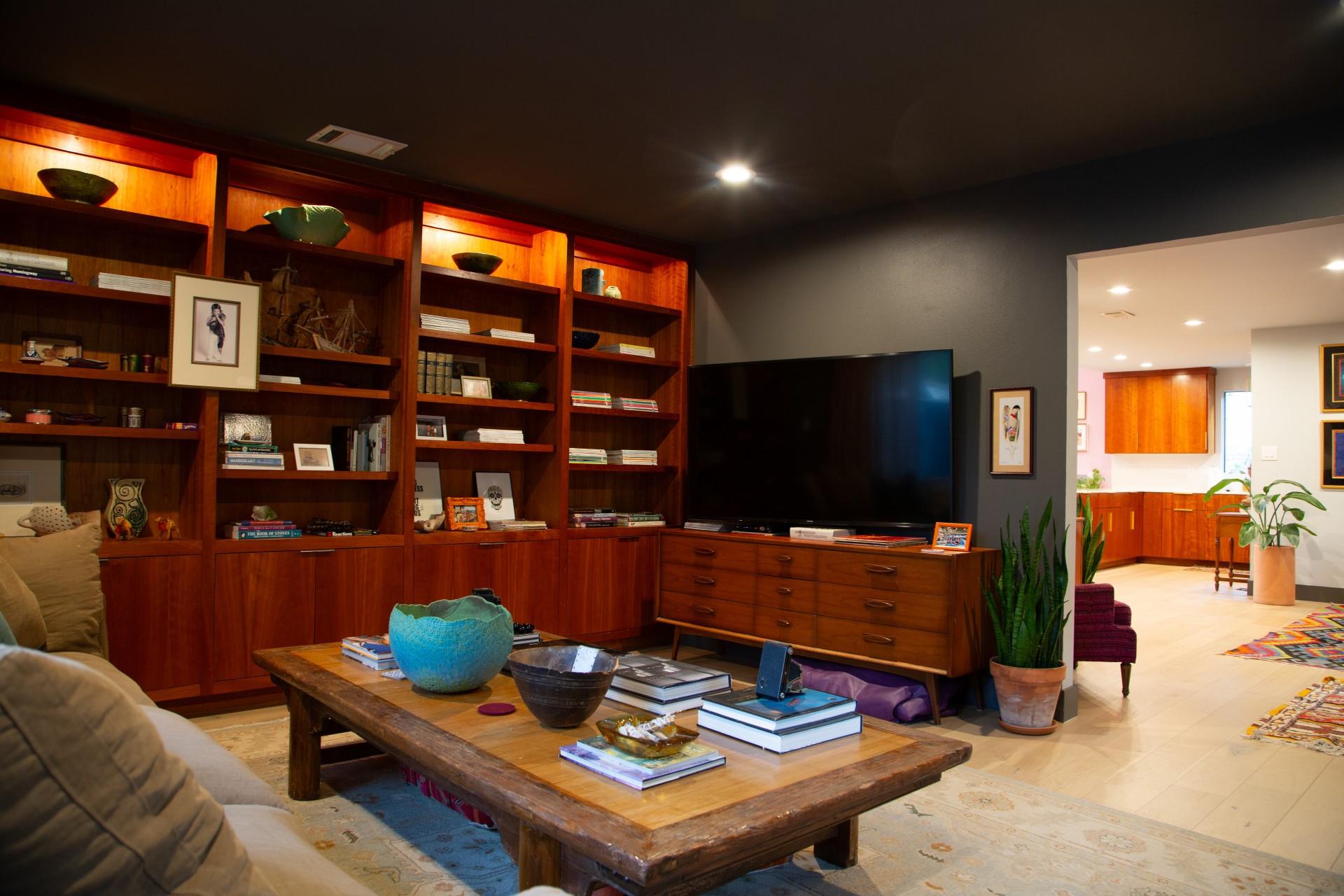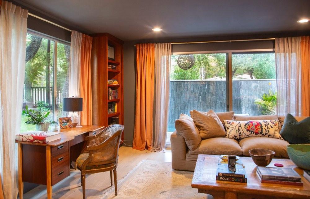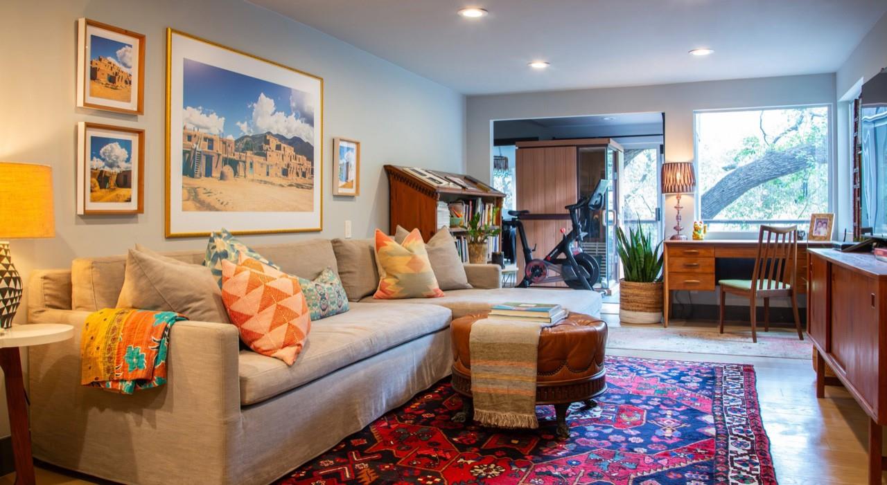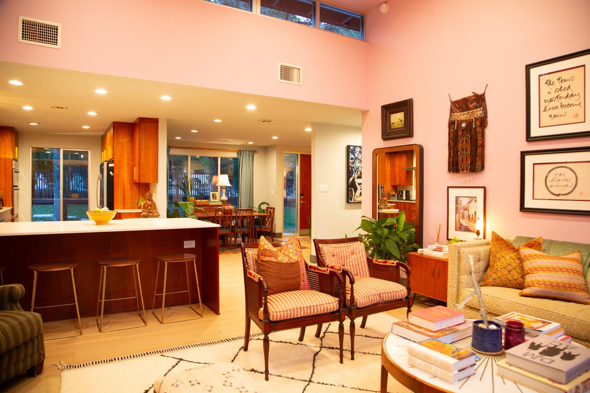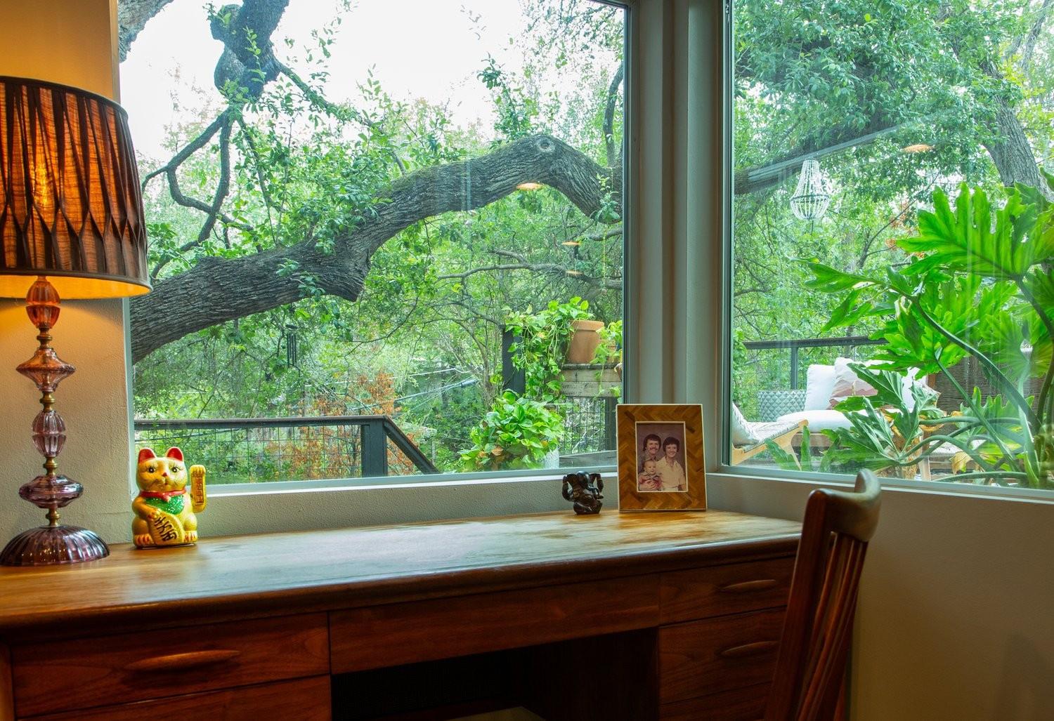 3,271 sq.ft. split-level Mid Century Modern Tarrytown home sits on an amazing .37 acre corner lot with tens of mature Live Oaks, Cedar Elms, Rosebud trees, Bamboo and just down the street from Casis Elementary. 300 sq.ft. of deck sits outside the floor to ceiling living room windows and slider, space for a full outdoor living room set up. There are four bedrooms and four full baths to compliment three different living room/den areas. Two car garage with Tesla Charging Station. The kitchen features custom made grain-matched Cherrywood cabinets that fit the time period of the home perfectly and white oak wood floors run seamlessly throughout the home. The lot has room for an additional ADU. A special, unique feature of the home is the two primary bedrooms located in separate areas of the home. One primary located upstairs with the other two bedrooms features its own ensuite and backyard balcony. This room would be Ideal for a mother-in-law, nanny, or teenager. The other two bedrooms upstairs share a full bath/shower with two sinks. The downstairs primary bedroom cantilevers like a floating treehouse surrounded by windows. The downstairs primary bathroom features three heads in a shower/tub combo and slider that opens from the shower to the deck that runs the length of the primary bedroom. The secondary living/den has a wall of bookshelves and large sliding door that opens onto the Ipe deck overlooking the heated pool and water wall. The lower level of the home features a third living space/den, full bathroom, workout space (indoor infrared sauna and peloton bike), desk area, primary bedroom and bath, laundry/mud room and garage access. Extremely close proximity to Lake Austin, quick access to Mopac to downtown, and approximately 20 minutes to Austin's airport and FBO's. Austin ISD: Casis Elementary, O'Henry Middle, & Austin High School. Cozy and comfortable, and the perfect home for a family and entertaining as you wish. Come See Her! 2709pecos.com