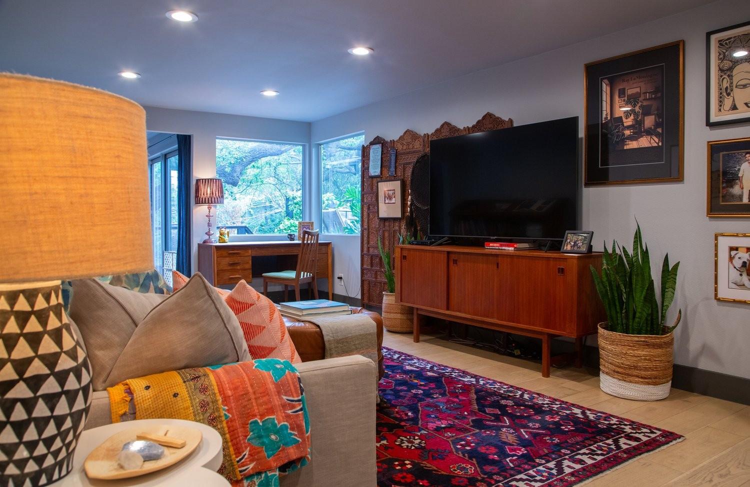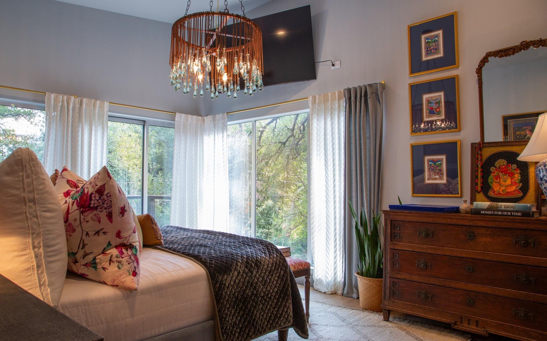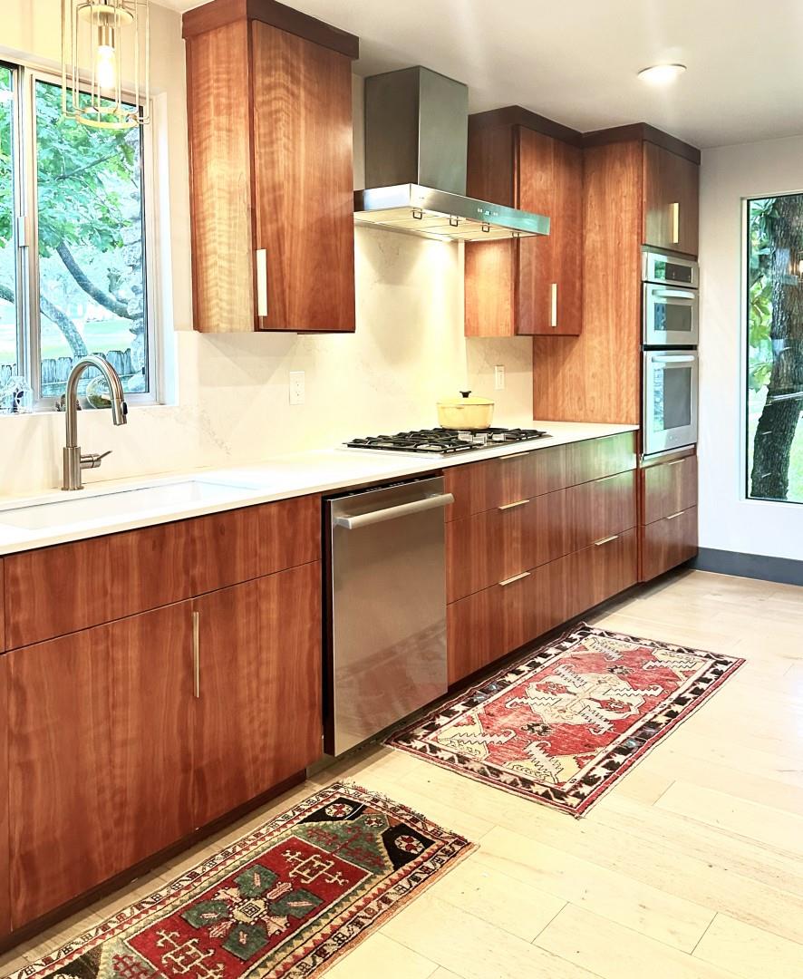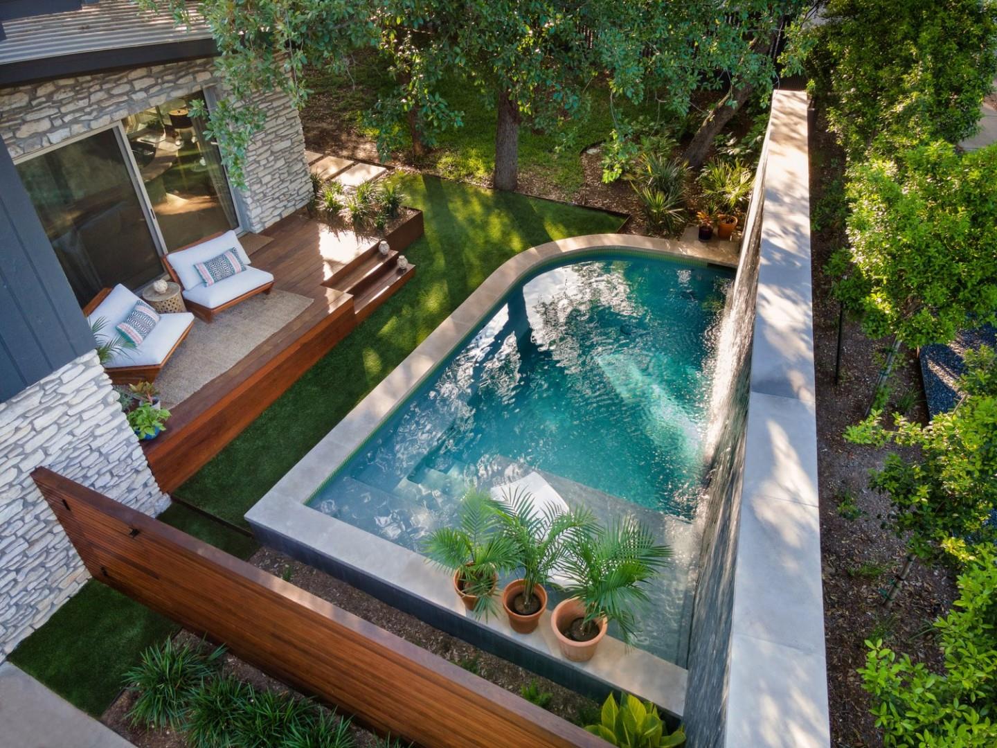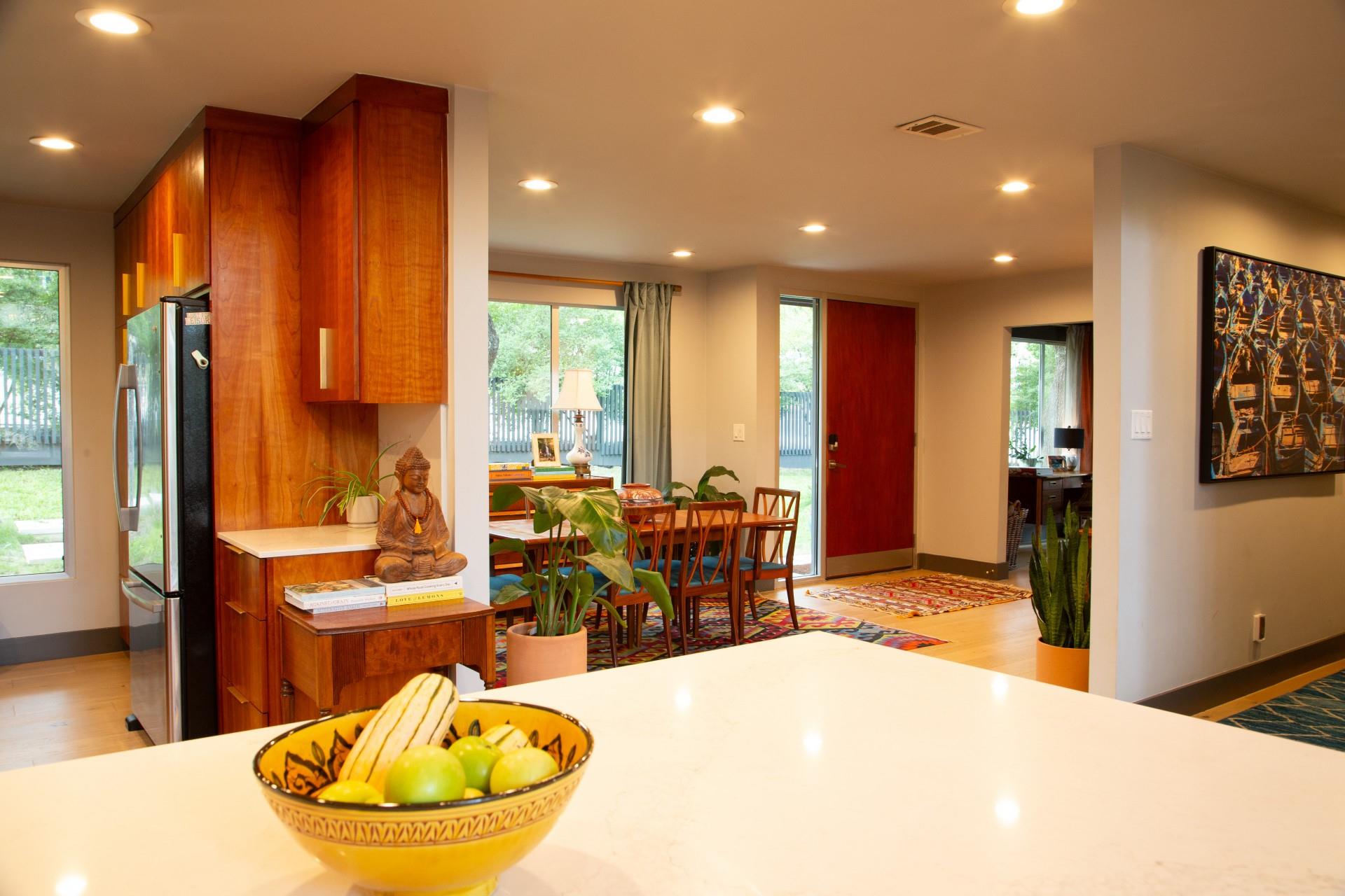3,271 sq.ft. split-level Mid Century Modern Tarrytown home sits on an amazing .37 acre corner lot with tens of mature Live Oaks, Cedar Elms, Rosebud trees, Bamboo and just down the street from Casis Elementary. 300 sq.ft. of deck sits outside the floor to ceiling living room windows and slider, space for a full outdoor living room set up. There are four bedrooms and four full baths to compliment three different living room/den areas. Two car garage with Tesla Charging Station. The kitchen features custom made grain-matched Cherrywood cabinets that fit the time period of the home perfectly and white oak wood floors run seamlessly throughout the home. The lot has room for an additional ADU. A special, unique feature of the home is the two primary bedrooms located in separate areas of the home. One primary located upstairs with the other two bedrooms features its own ensuite and backyard balcony. This room would be Ideal for a mother-in-law, nanny, or teenager. The other two bedrooms upstairs share a full bath/shower with two sinks. The downstairs primary bedroom cantilevers like a floating treehouse surrounded by windows. The downstairs primary bathroom features three heads in a shower/tub combo and slider that opens from the shower to the deck that runs the length of the primary bedroom. The secondary living/den has a wall of bookshelves and large sliding door that opens onto the Ipe deck overlooking the heated pool and water wall. The lower level of the home features a third living space/den, full bathroom, workout space (indoor infrared sauna and peloton bike), desk area, primary bedroom and bath, laundry/mud room and garage access. Extremely close proximity to Lake Austin, quick access to Mopac to downtown, and approximately 20 minutes to Austin's airport and FBO's. Austin ISD: Casis Elementary, O'Henry Middle, & Austin High School. Cozy and comfortable, and the perfect home for a family and entertaining as you wish. Come See Her! 2709pecos.com
