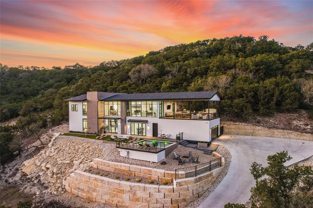 An idyllic haven where discerning individuals can savor a life of refined luxury, surrounded by the natural beauty of Lake Travis & the Hill Country. Indulge in an exceptional living experience nestled in the prestigious "Hollywood Hills" of North Lake Travis in Austin, Texas. As you step into its grandeur, the vast open spaces illuminated by custom lighting immediately envelop you in a sense of luxury & elegance. This exclusive property is an entertainer's dream, featuring a state-of-the-art media room equipped with surround sound & large screen TV, a pool table room, cocktail room and dart board. Two bedrooms down, one with a versatile Murphy bed, doubles as an office. Also a flex room that is currently a gym. An elevator connects the oversized garage to the main living space for seamless transitions. Here, the heart of the home awaits, with a meticulously designed kitchen, huge living area, & primary suite that exudes sophistication. The huge outdoor covered deck beckons, where outdoor living reaches new heights: hot tub, bar seating, full couch with entertainment setup, along with a fully equipped kitchen conveniently connected to the butler's pantry, fridge, & main kitchen. The indoor kitchen exudes a luxurious charm, showcasing gold accents on white tile accents & high gloss white lacquered upper cabinets. Bright & airy, the living room offers a seamless indoor/outdoor experience through commercial-grade floor-to-ceiling windows & doors that provide captivating views high above Lake Travis. The primary suite is a haven of relaxation, featuring a wet, coffee, & wine bar, as well as a makeup station doubling as an office/desk space. Escape within the grand tub & spacious walk-in shower, complemented by the primary closet complete with an island of cabinetry, abundant built-ins, & a dedicated washer/dryer. Welcome home!