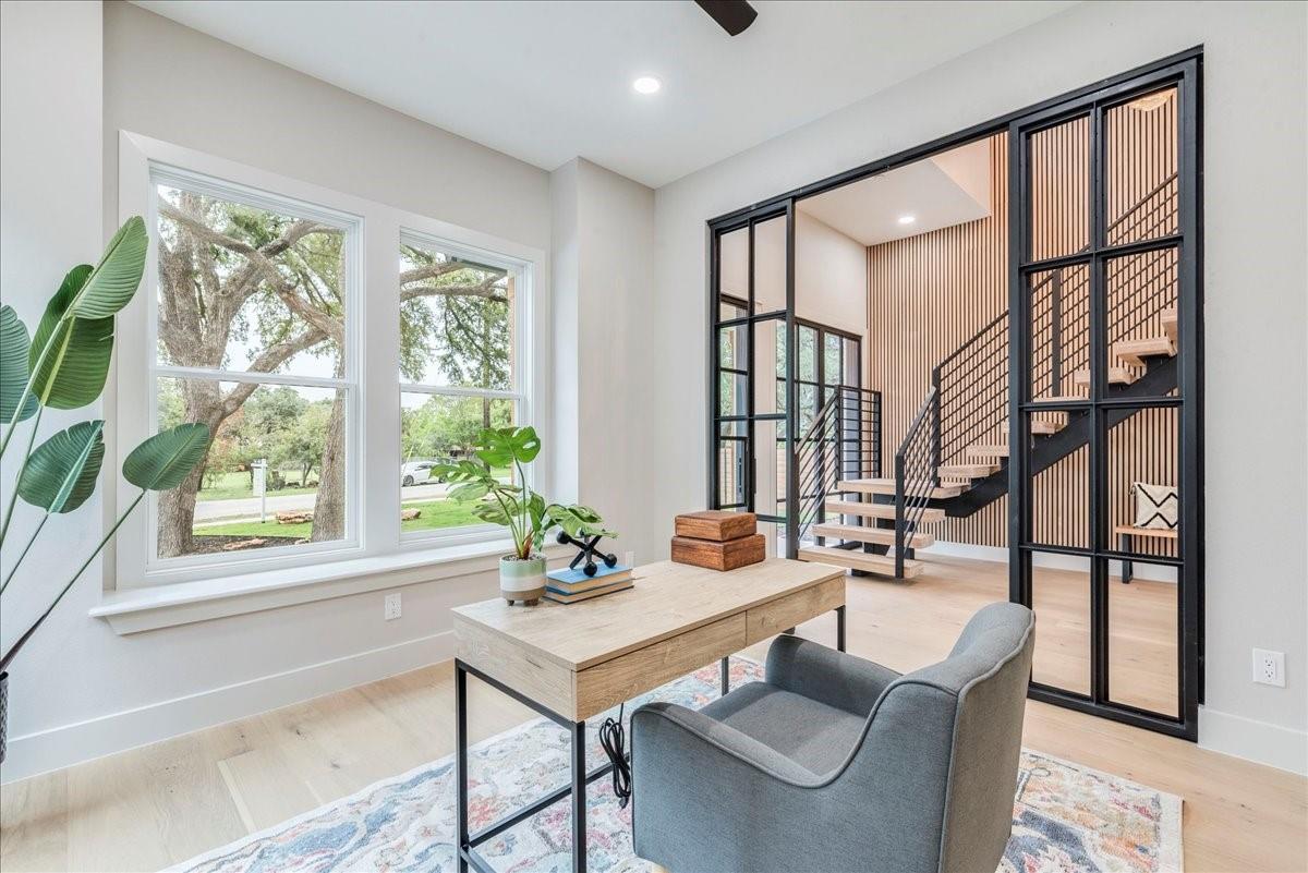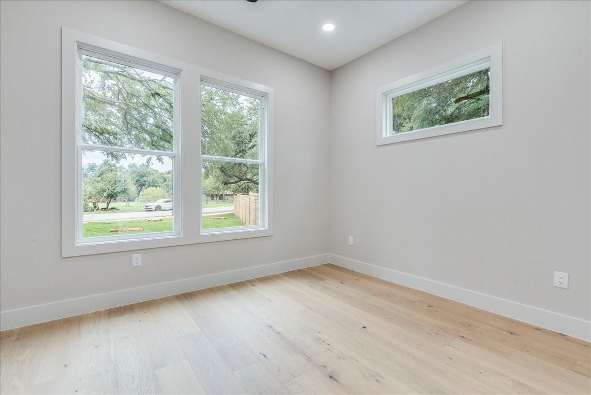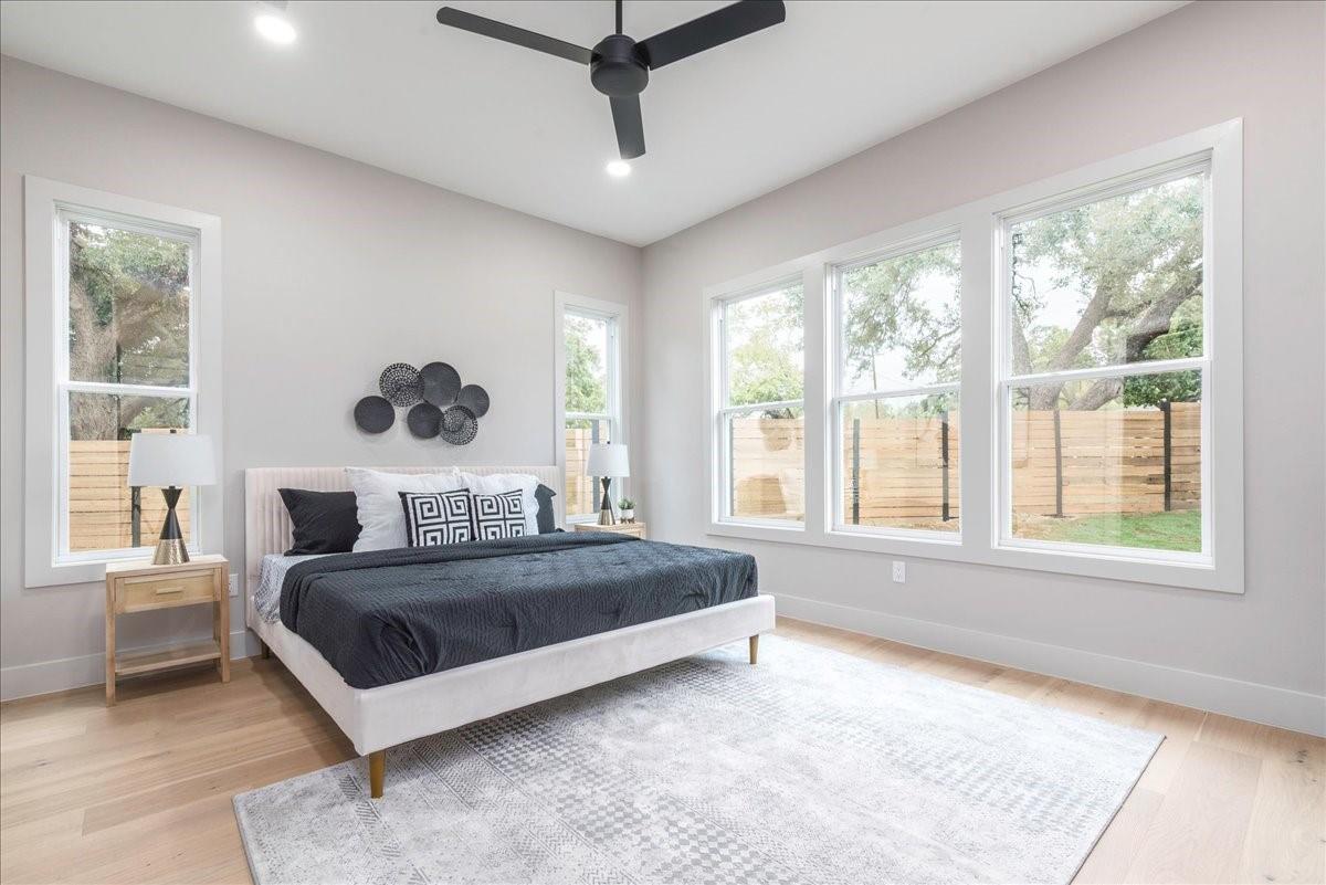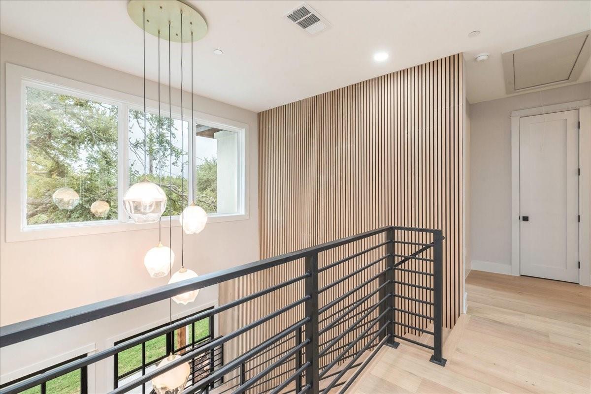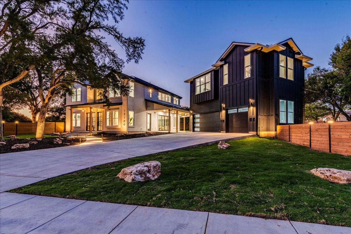 Dubbed "Striving for Balance," this stunning, new construction home is an on-trend architectural masterpiece characterized by striking European white oak flooring and banks of glass. Space and luxury are in abundance, with every modern convenience considered. Expansive windows and doors bathe the interior in natural light, connecting seamlessly to the enclosed, lush surroundings. The flowing 4,200+ sq ft floor plan includes four bedrooms and four baths in the main house and presents the finest finishes. Built for sensational entertaining, the home boasts an incredible open-plan great room with soaring fireplace and overlooking clerestory windows. The state-of-the-art kitchen centers around an exquisite island topped with a waterfall of soapstone. Premium Café appliances and intelligent amenities ensure effortless preparation of mouthwatering repasts. Sleek detailing and clean aesthetics continue to a main-level office/living room, private guest suite and laundry room. A plush owner's bedroom is a calm oasis designed for relaxation. This enticing retreat beckons with a rejuvenating shower, sumptuous tub for 2, and customized closet. A lavish floating staircase delivers residents to the upper level, where a generous game room offers a full-length wet bar. The second floor accommodates with a spacious bedroom and guest suite, each light and airy. Beyond a covered porch ideal for year-round barbecues, a superbly private one-bedroom guest house above an oversized three-car garage boasts its own kitchenette, laundry, bath, and living space, creating an ideal nanny or in-law apartment. Top-rated Davis Elementary, a National Blue Ribbon School, is within walking distance of the sought-after Angus Valley neighborhood, renowned for its tranquil environment and proximity to shops and recreation. Situated in the pocket between N Mopac and Hwy 183 with a short commute to Downtown Austin, this two story home is minutes from The Domain, The Arboretum, Apple, IBM and Q2 Stadium