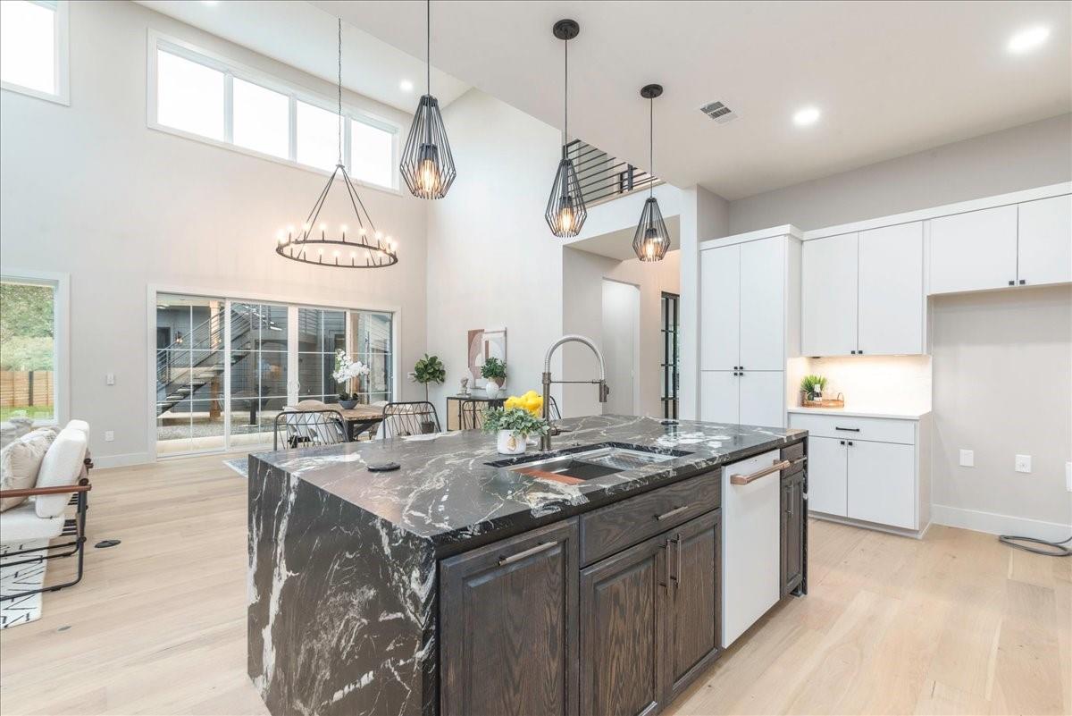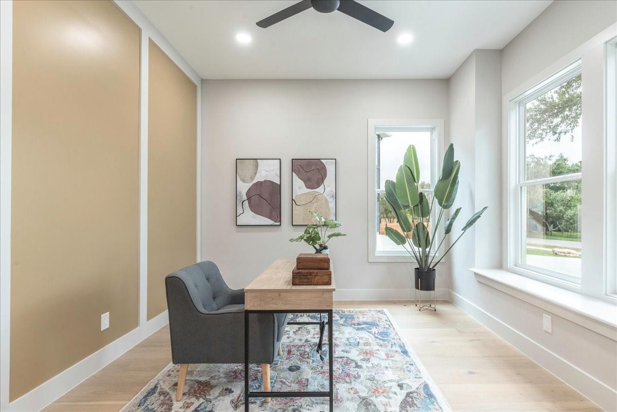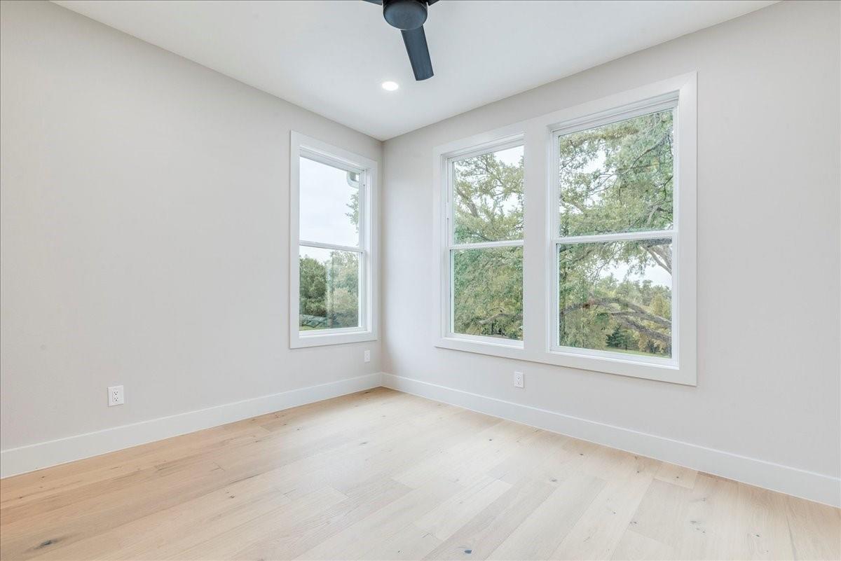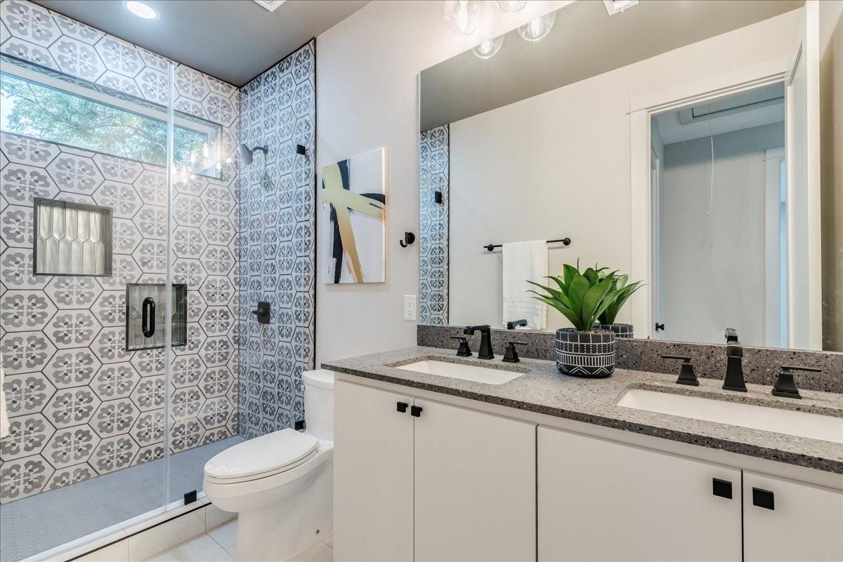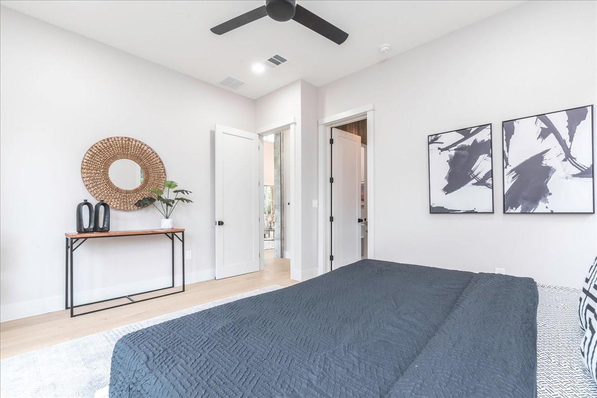 Dubbed "Striving for Balance," this stunning, new construction home is an on-trend architectural masterpiece characterized by striking European white oak flooring and banks of glass. Space and luxury are in abundance, with every modern convenience considered. Expansive windows and doors bathe the interior in natural light, connecting seamlessly to the enclosed, lush surroundings. The flowing 4,200+ sq ft floor plan includes four bedrooms and four baths in the main house and presents the finest finishes. Built for sensational entertaining, the home boasts an incredible open-plan great room with soaring fireplace and overlooking clerestory windows. The state-of-the-art kitchen centers around an exquisite island topped with a waterfall of soapstone. Premium Café appliances and intelligent amenities ensure effortless preparation of mouthwatering repasts. Sleek detailing and clean aesthetics continue to a main-level office/living room, private guest suite and laundry room. A plush owner's bedroom is a calm oasis designed for relaxation. This enticing retreat beckons with a rejuvenating shower, sumptuous tub for 2, and customized closet. A lavish floating staircase delivers residents to the upper level, where a generous game room offers a full-length wet bar. The second floor accommodates with a spacious bedroom and guest suite, each light and airy. Beyond a covered porch ideal for year-round barbecues, a superbly private one-bedroom guest house above an oversized three-car garage boasts its own kitchenette, laundry, bath, and living space, creating an ideal nanny or in-law apartment. Top-rated Davis Elementary, a National Blue Ribbon School, is within walking distance of the sought-after Angus Valley neighborhood, renowned for its tranquil environment and proximity to shops and recreation. Situated in the pocket between N Mopac and Hwy 183 with a short commute to Downtown Austin, this two story home is minutes from The Domain, The Arboretum, Apple, IBM and Q2 Stadium