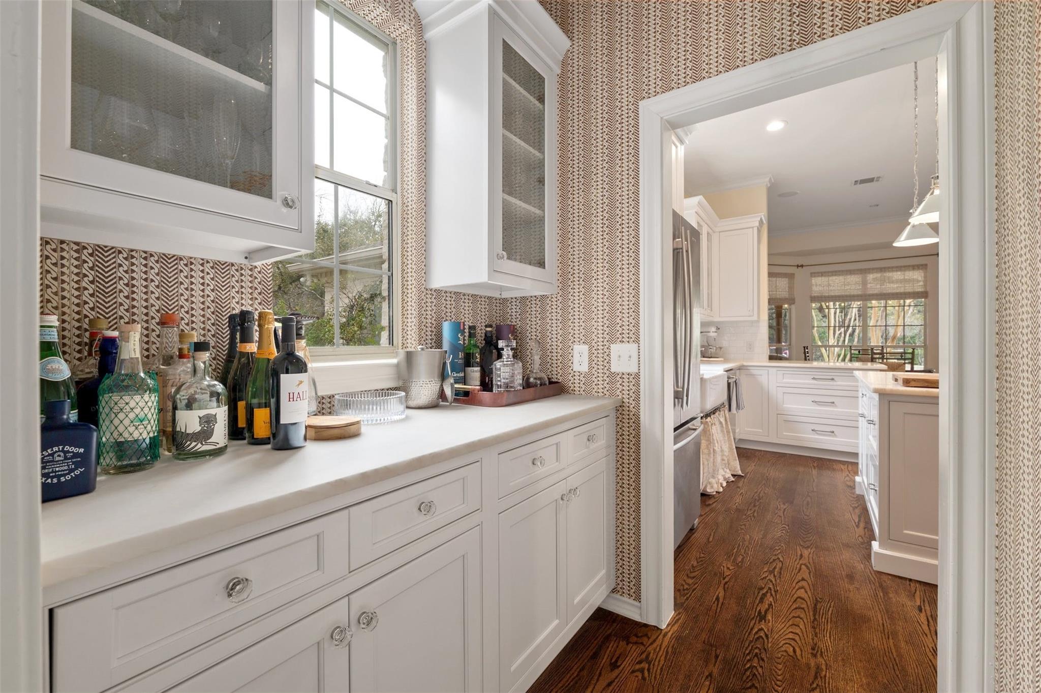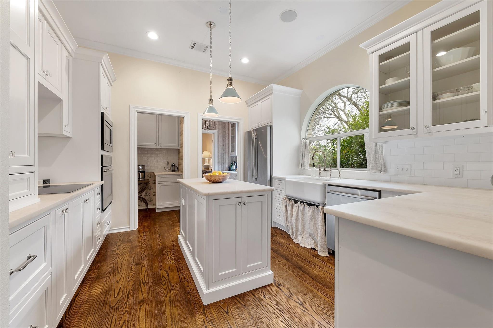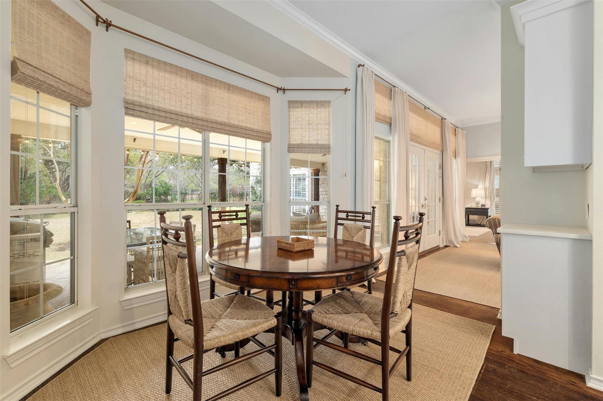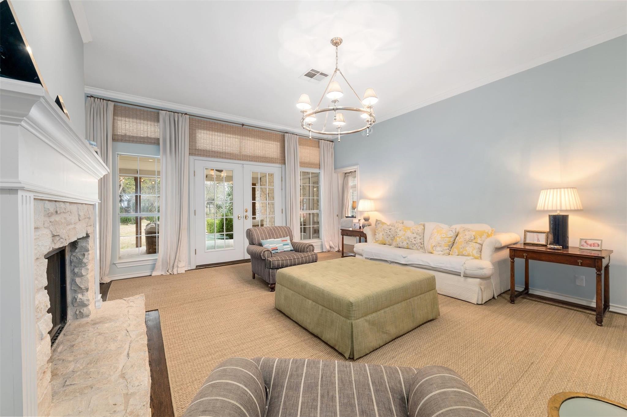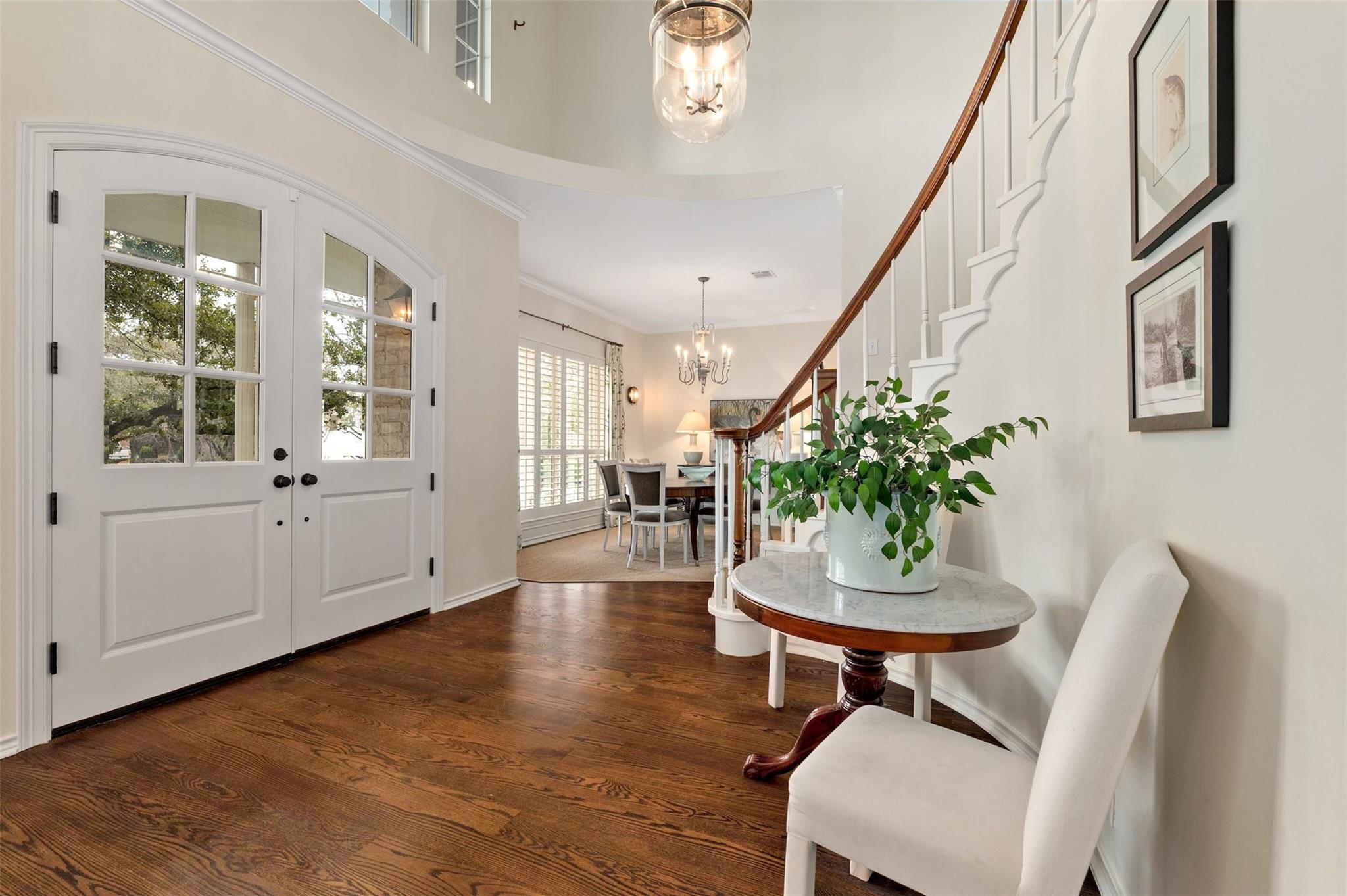 Locally acknowledged as having the best curb appeal in Barton Creek West, this Texas traditional home is straight off the cover of Southern Living magazine. Professionally designed and transformed by a professional designer for her own family, every detail has been thoughtfully planned and executed. From the moment you enter the foyer, a tone of gracious elegance is set by the excellence of the finishes and the efficiency of the floor plan. Open and airy formal living and dining spaces flank the entryway, providing instant warmth and welcome for family and friends and leading to the family room, featuring more character and craftsmanship. The remodeled kitchen includes white marble countertops, butler’s pantries, and bay window breakfast area. Off the kitchen, a remodeled third garage bay has been transformed into a beautiful laundry and mudroom. Rounding out the lower floor is a remarkable owner’s wing. Boasting a spacious bedroom, it also offers a study separated by gorgeous French doors and a marble fireplace. The primary bath was completely reconfigured and beautifully finished with white marble countertops, polished nickel fixtures, limestone floor, frameless shower, and dual walk-in closets. Upstairs, four bedrooms with remodeled Jack-and-Jill bathrooms are divided by a large playroom. All four bedrooms feel as though they are perched in the treetops because their large windows let in a huge amount of light. Outside, the spacious outdoor living space and the covered terraces provide multiple areas for living, dining, and entertaining, all while overlooking the expansive flat lawn bordering greenbelt. This special home, within walking distance of exemplary Eanes schools, is the ideal place to live and raise a family. With two community pools, hundreds of acres of private community nature preserve w/ trails, & neighborhood events like the annual Circleview Halloween parade, families will enjoy this charming home for generations to come.