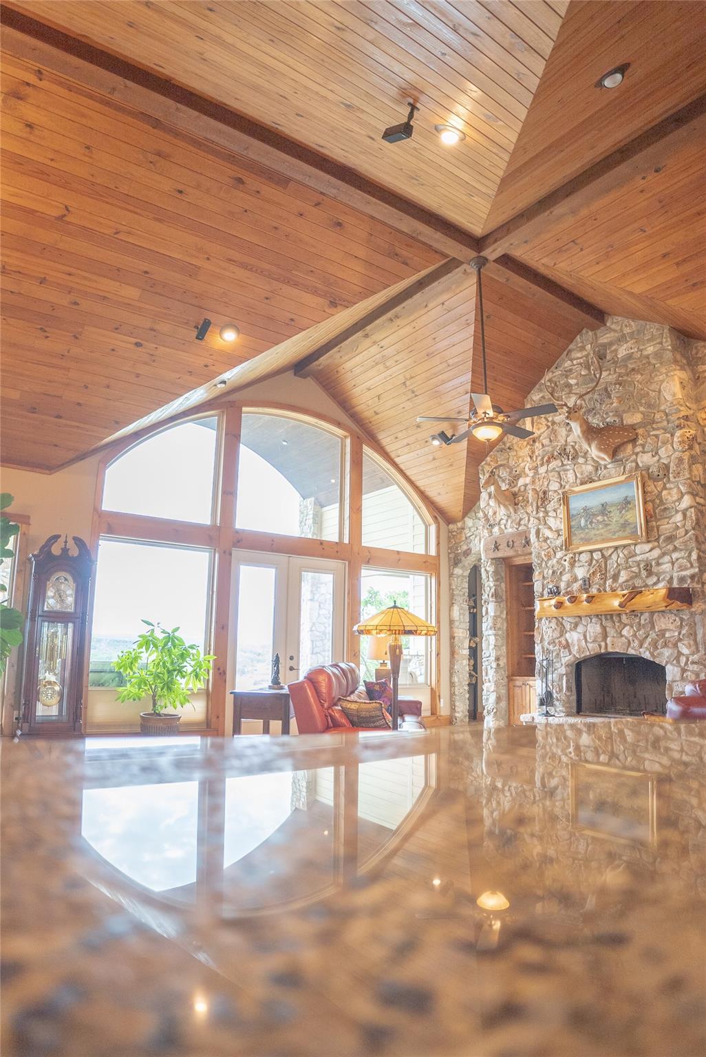 Stunning custom home on gorgeous 35.04 acres (per plat) within the exclusive community of Bridlewood Ranches between San Marcos and Wimberley Texas. This home comes with top-of-the-line upgrades and incredible hill country views! As you enter this beautiful home you will notice the magnificent stonework made from stones gathered from the property. The vaulted wooden ceilings will amaze you as the interior incorporates with the openness and incredible window views. The entire home is wheelchair accessible with smooth floor transitions, an additional lower sink/counter in the kitchen, and primary bathroom for wheelchair access if needed. The main home has three bedrooms and three and a half bathrooms. The primary bedroom is surrounded with windows exposing the view and linked to an extravagant bathroom with wheelchair accessible shower that has custom telework and detail; and abundantly large closet with an island that is useful for packing suitcases or folding clothes. The barn/workshop is a workman’s dream with metal construction including living quarters and two open overhead bays with a separate workroom for projects and benches etc. Above the barn there are living quarters with nicely finished apartment and a deck that overlooks the scenic property. There are two bedrooms and one bathroom with a full kitchen and a spacious living area offering excellent accommodations for guests. The 35.04 acres itself is a beauty to behold! Purgatory Creek is a wet weather creek that traverses the back portion of the acreage. Wildlife is abundant with many species including whitetail deer, hogs, and turkeys. Hunting is allowed with restrictions and this property comes ready with hunting blinds and feeders. The HOA manages an optional grazing lease that allows free ranging beautiful Texas longhorns to roam the property. Conveniently located between Wimberley and San Marcos with easy access to I-35 & the Hill Country, and equidistant between Austin and San Antonio Airports.
