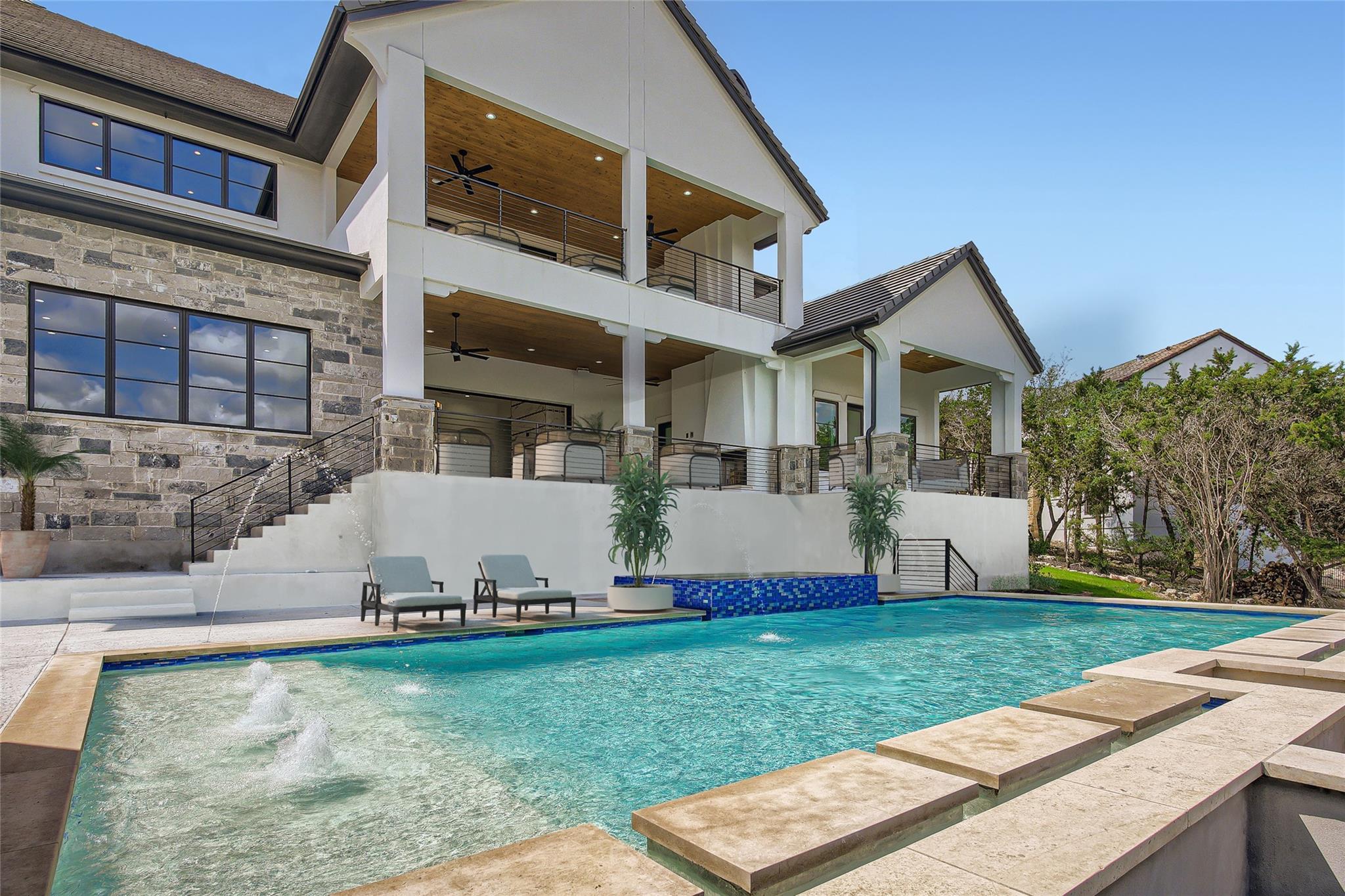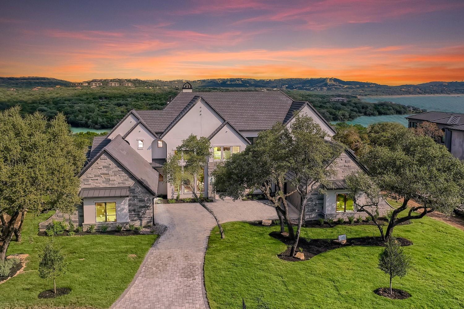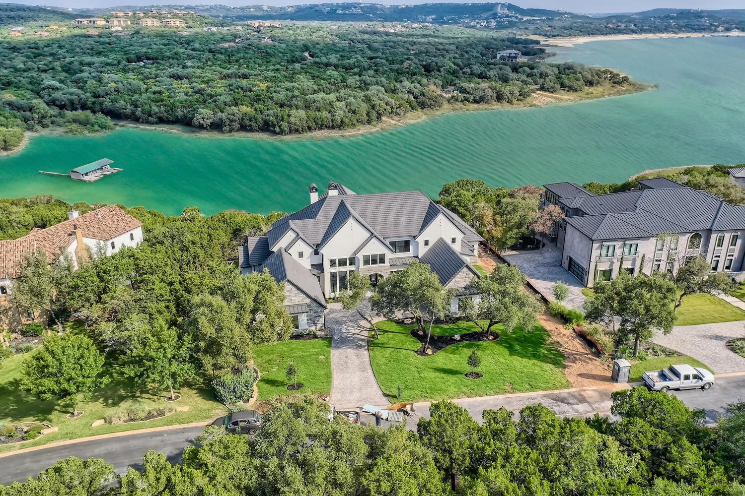 Fully furnished, and for those financing, a rate buydown, zero down payment program, or seller-financing makes it easy to call this remarkable residence home. A newly built French Tudor inspired haven with over 300 ft of shoreline and a boat slip, awaits you. Imagine a sprawling backyard, gently sloping to a private, deep water cove teeming with aquatic life. At normal lake levels, the water kisses the property line! Designed & built for generations of delight, with expansive 12ft ceilings and sophisticated arches throughout. Thoughtfully adorned with exquisite finishes from Thermador appliances,Emtek solid brass hardware, European white oak flooring, custom, frameless European cabinetry, whole-house solid core doors, Quartz and Butcher Block tops,Brizo fixtures, premium windows and doors, and designer tile and chandeliers. Here, life is seamless with contemporary luxuries: a catering kitchen with a 2nd set of appliances, primary suite with a dedicated laundry room & matching custom closets, a glass-encased wine bar, a versatile lounge perfect for fitness or art, and guest quarters with a private entrance. An oversized utility room with a pet spa, a future elevator shaft, a grand library, and a state-of-the-art home theater complete the inside. Outside, indulge in a resort-style pool, hot tub, sunken seating area with firepit, and separate outdoor kitchen. Enjoy Austin's year-round outdoor paradise, with miles of paved trails, fishing, boating, and water sports. A swift golf cart ride brings you to a sophisticated, deep water floating marina and Beach Club. Within minutes to living conveniences such as the brand new Brookshire Brothers grocery store, just 20 min to hill country wineries, 25 min to Austin limits, and 45 minutes to the airport, but a world apart in this double-gated resort community! Take your private tour today and make this unmatched sanctuary your home! * select photos edited to show normal lake levels