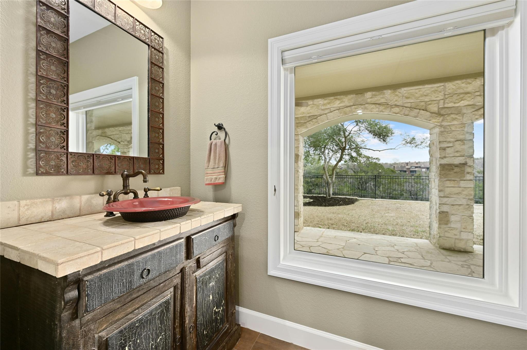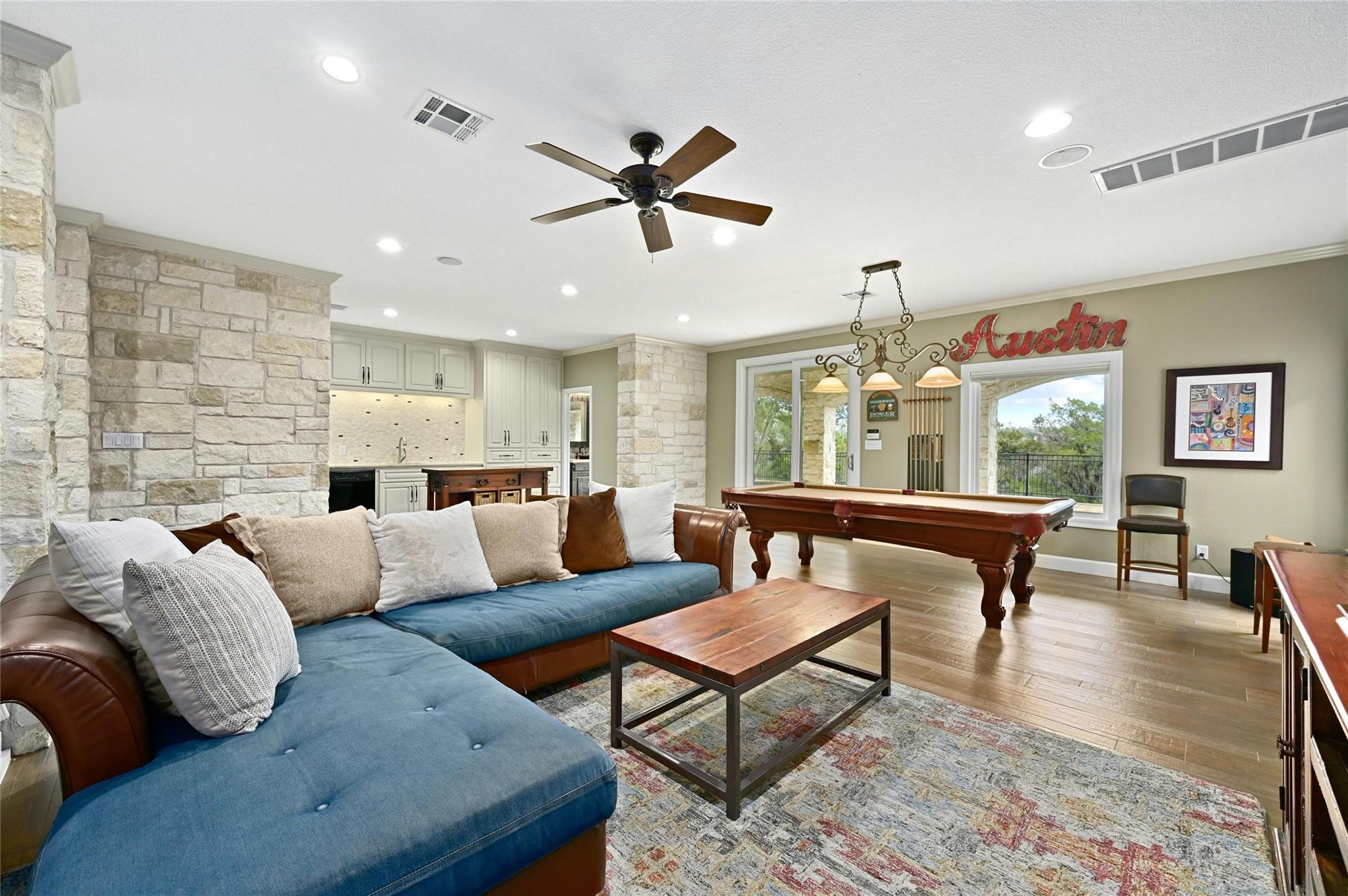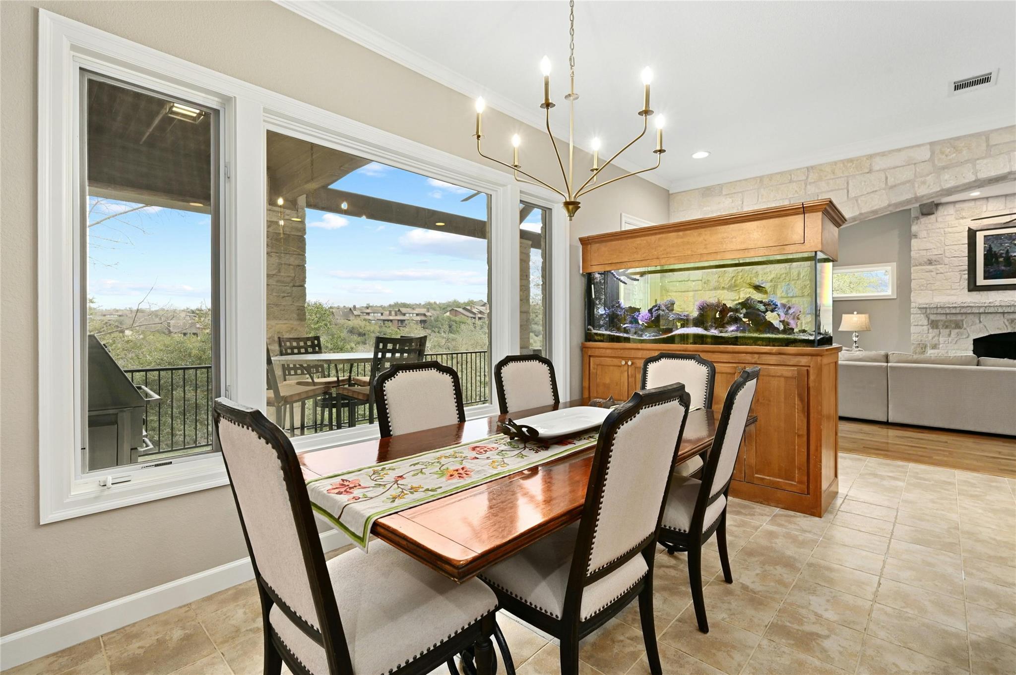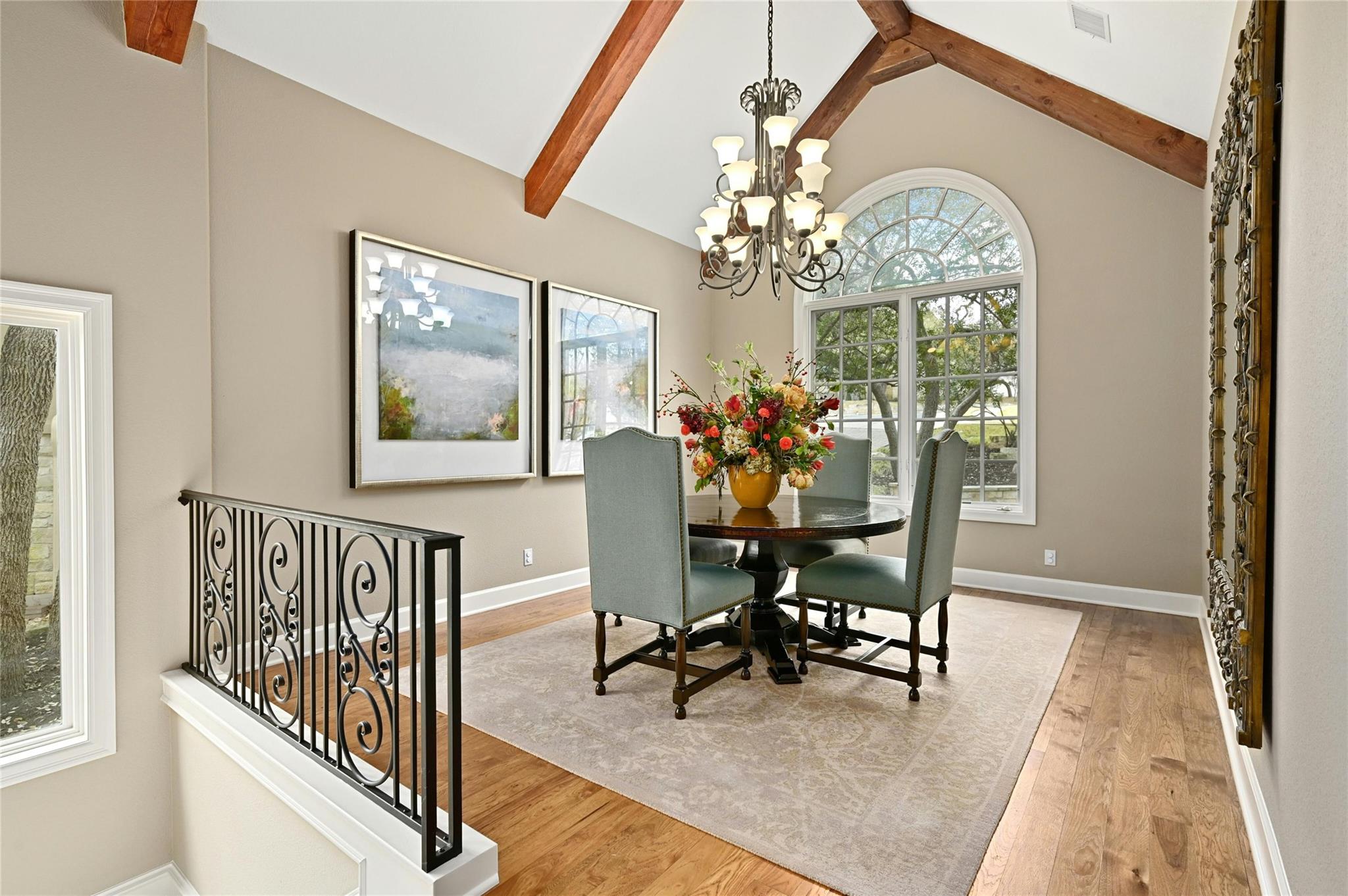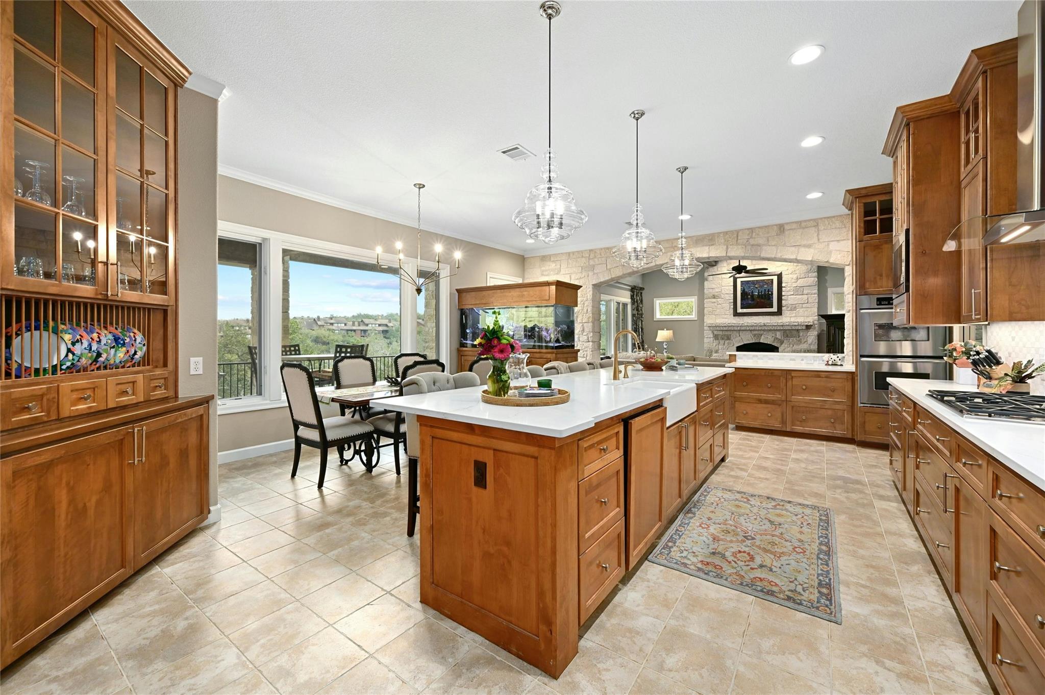 Located in the heart of Northwest Hills, this iconic, custom-built home is the perfect blend of elegance, functionality, and attention to detail. Upon entry, the foyer’s stone archways welcome guests into the oversized living room featuring exposed beams and a stone fireplace. Share stories and unwind in this inviting and elegant space. Steps away, the dining room features cathedral ceilings and exposed beams, creating an atmosphere of grandeur and sophistication. Entertain with ease in the fully equipped kitchen, complete with updated quartz counter tops, a modern and chic backsplash, and an expansive kitchen island. Step outside to the back patio and experience true outdoor living at its finest. Vaulted ceilings lined with cedar create a cozy atmosphere, while separate seating and eating areas offer great canyon views for al fresco dining and relaxation. Back inside, the primary suite offers a retreat complete with private office, dual vanities, garden tub, and impressive walk-in closet. Down the hall enjoy the convenience of a main floor guest room and spacious laundry room with plenty of storage to keep your home organized. Upstairs, discover three additional bedrooms, two full bathrooms, and a charming hallway desk, providing ample space for family and guests to work and relax. The lower level extends the allure of this home with a spacious living room complete with a pool table, a convenient kitchen, and a half bath, perfect for entertaining or unwinding in style. Step outside to the flat backyard, or let your furry friends run around in the dog run, all while enjoying the natural beauty that surrounds this stately residence. With convenient access to nearby shops and schools yet on a quiet street, this home offers the perfect balance of privacy and convenience. Feeds highly coveted Doss, Murchison, and Anderson. Buyer to verify all details. Note, impervious coverage limitations may prohibit building a pool.