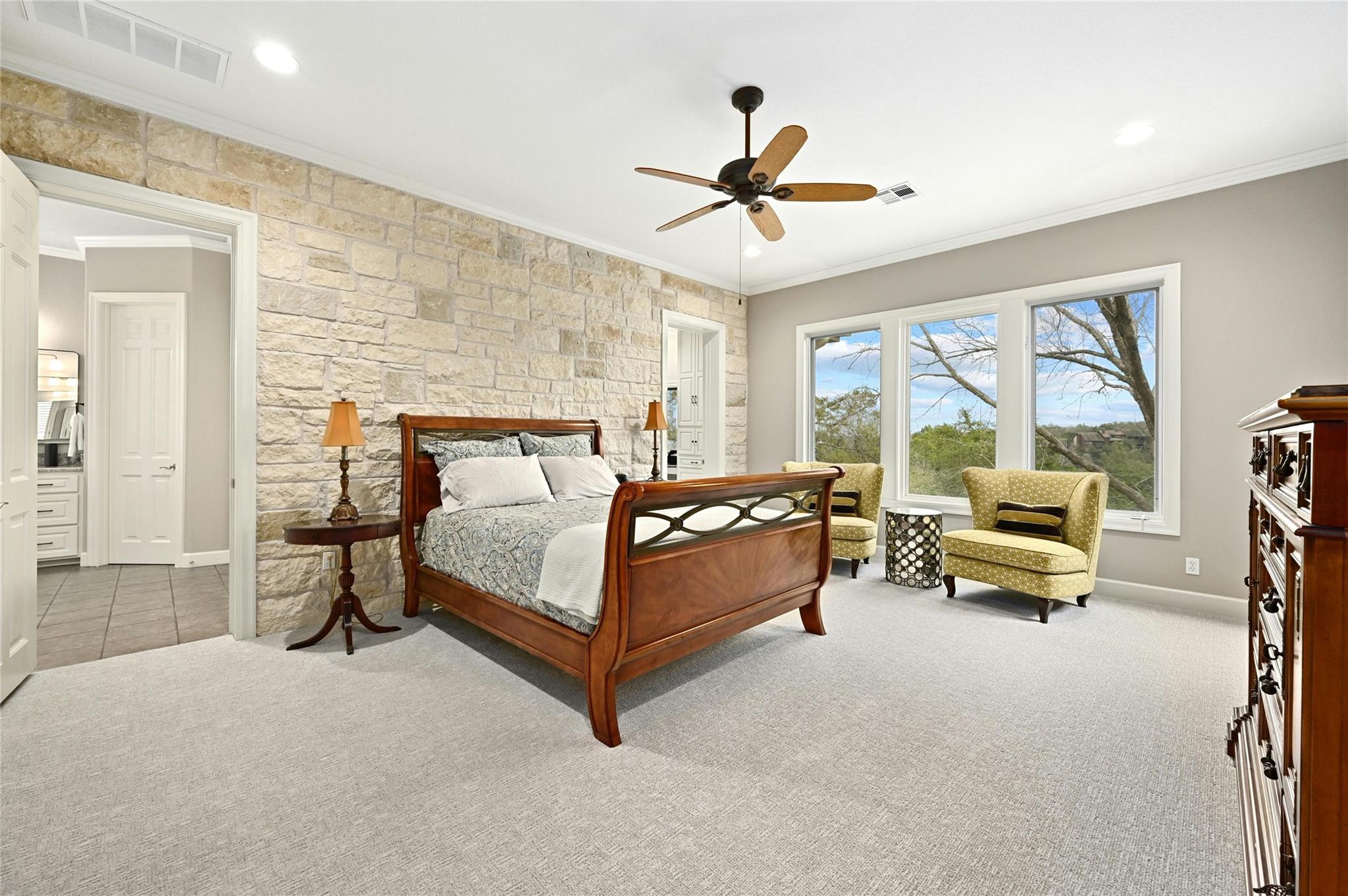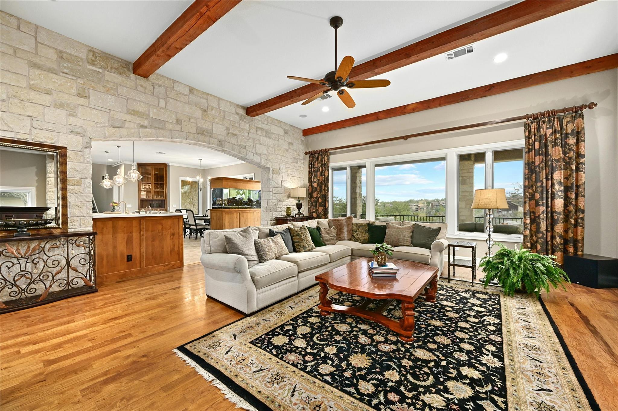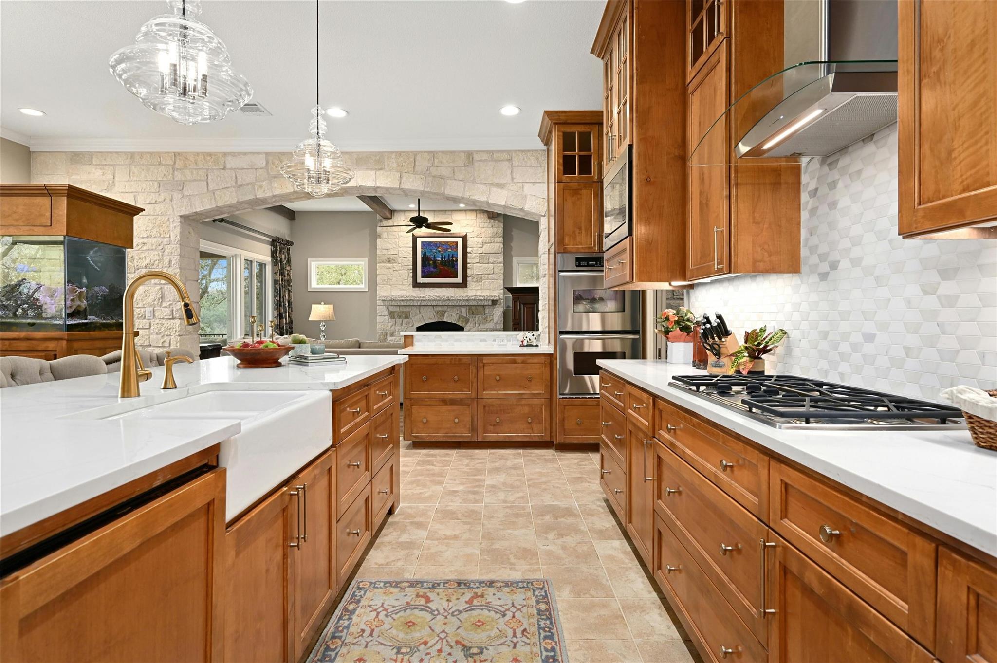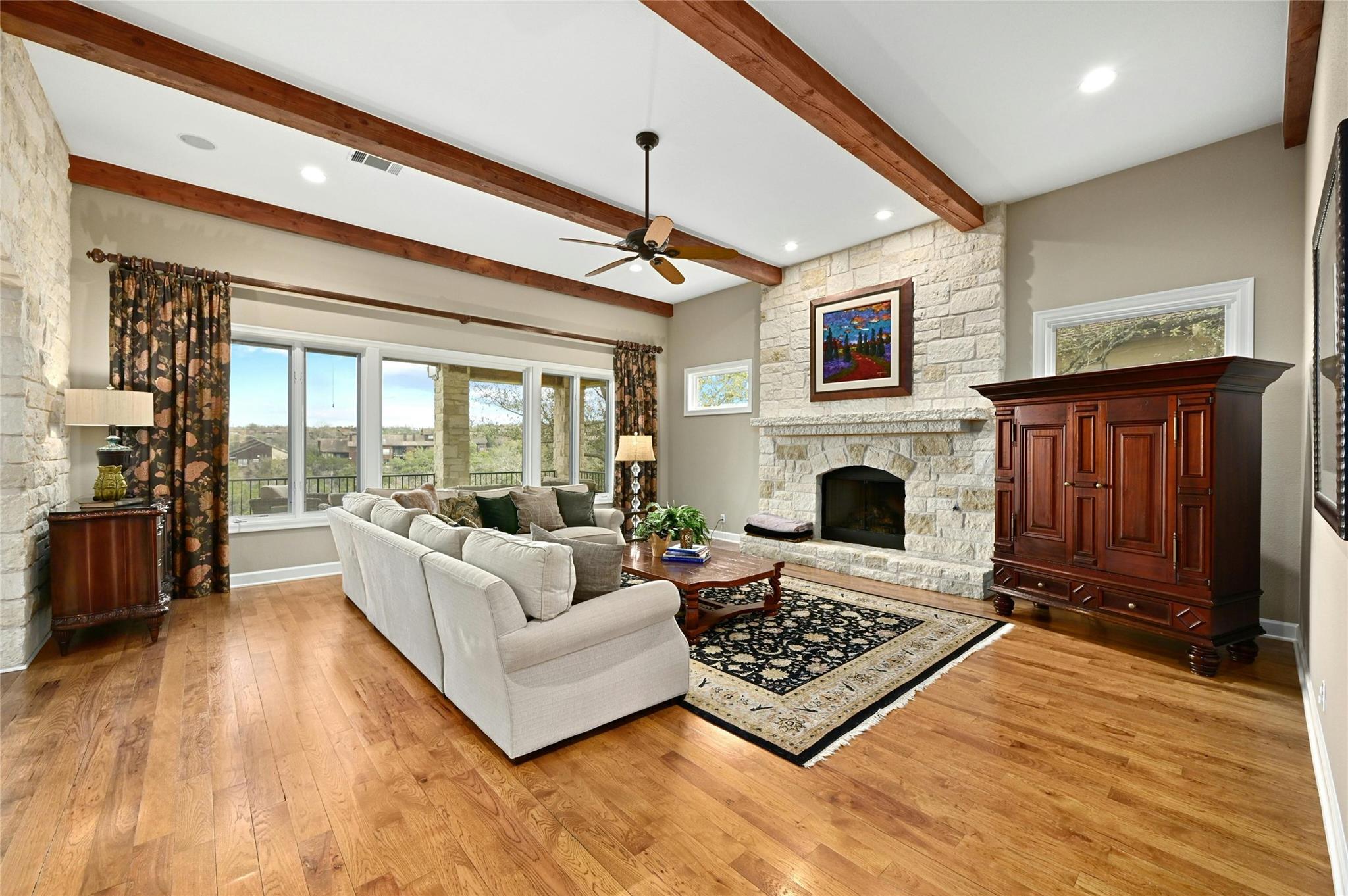 Located in the heart of Northwest Hills, this iconic, custom-built home is the perfect blend of elegance, functionality, and attention to detail. Upon entry, the foyer’s stone archways welcome guests into the oversized living room featuring exposed beams and a stone fireplace. Share stories and unwind in this inviting and elegant space. Steps away, the dining room features cathedral ceilings and exposed beams, creating an atmosphere of grandeur and sophistication. Entertain with ease in the fully equipped kitchen, complete with updated quartz counter tops, a modern and chic backsplash, and an expansive kitchen island. Step outside to the back patio and experience true outdoor living at its finest. Vaulted ceilings lined with cedar create a cozy atmosphere, while separate seating and eating areas offer great canyon views for al fresco dining and relaxation. Back inside, the primary suite offers a retreat complete with private office, dual vanities, garden tub, and impressive walk-in closet. Down the hall enjoy the convenience of a main floor guest room and spacious laundry room with plenty of storage to keep your home organized. Upstairs, discover three additional bedrooms, two full bathrooms, and a charming hallway desk, providing ample space for family and guests to work and relax. The lower level extends the allure of this home with a spacious living room complete with a pool table, a convenient kitchen, and a half bath, perfect for entertaining or unwinding in style. Step outside to the flat backyard, or let your furry friends run around in the dog run, all while enjoying the natural beauty that surrounds this stately residence. With convenient access to nearby shops and schools yet on a quiet street, this home offers the perfect balance of privacy and convenience. Feeds highly coveted Doss, Murchison, and Anderson. Buyer to verify all details. Note, impervious coverage limitations may prohibit building a pool.