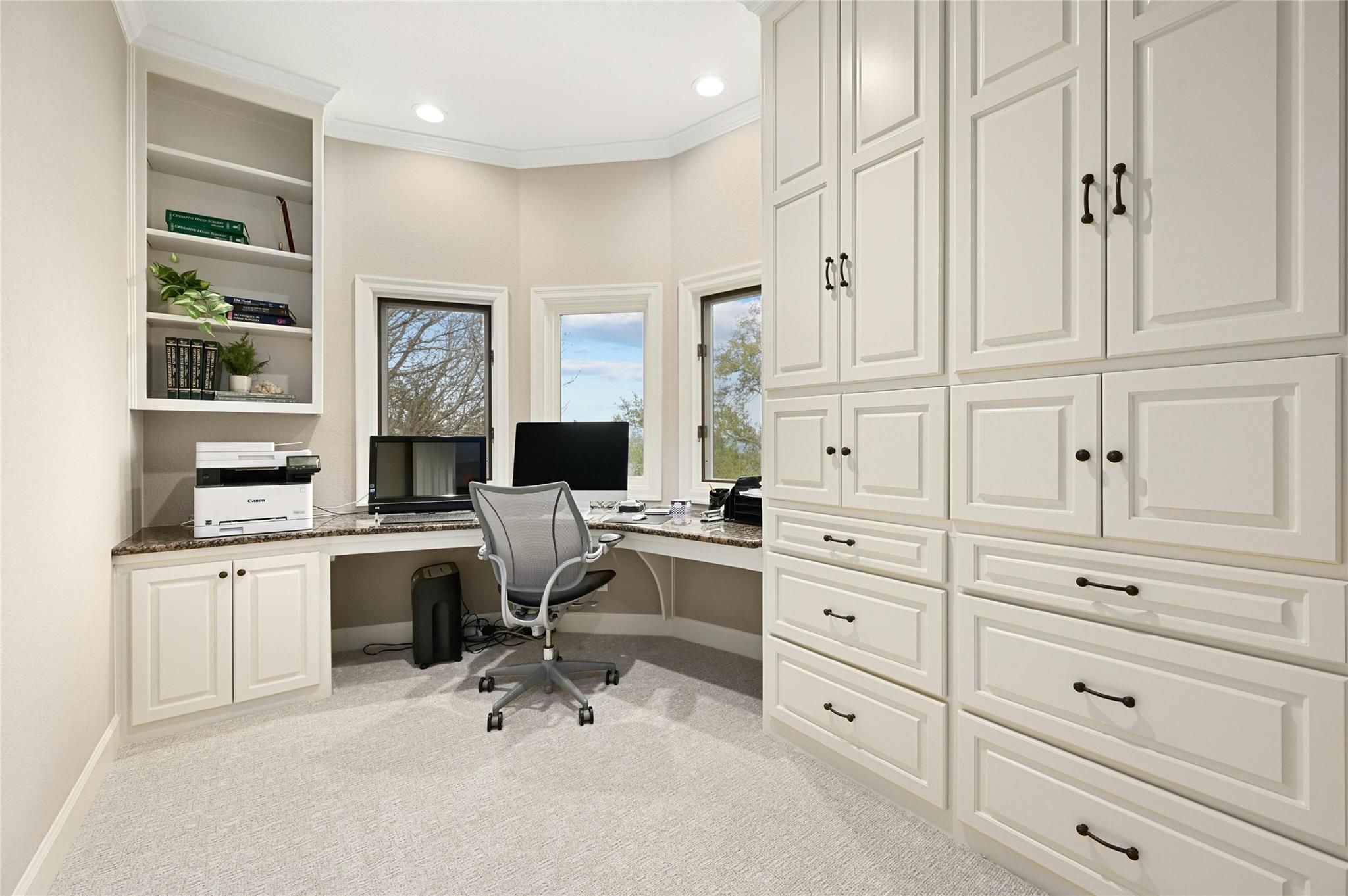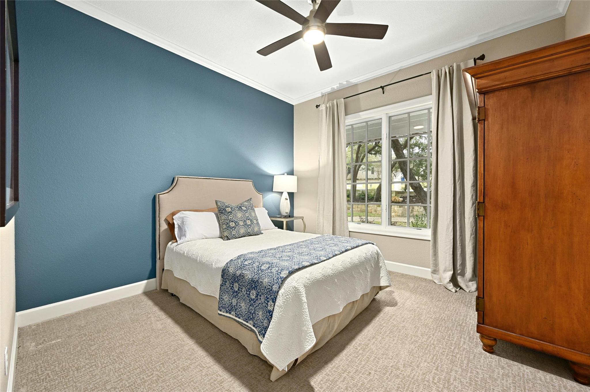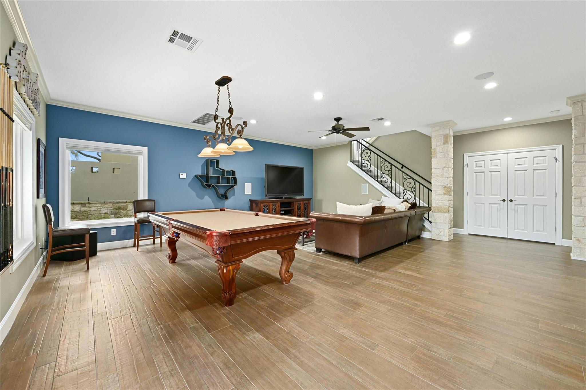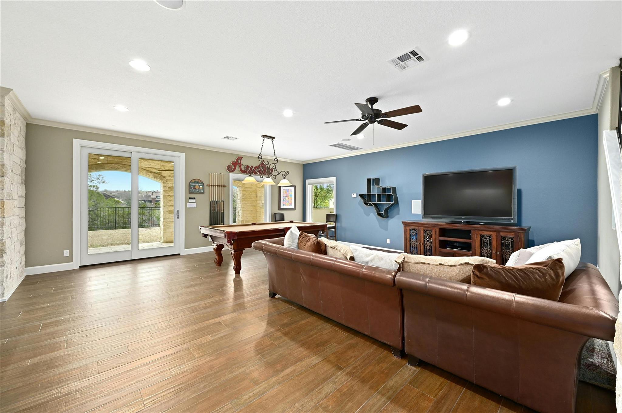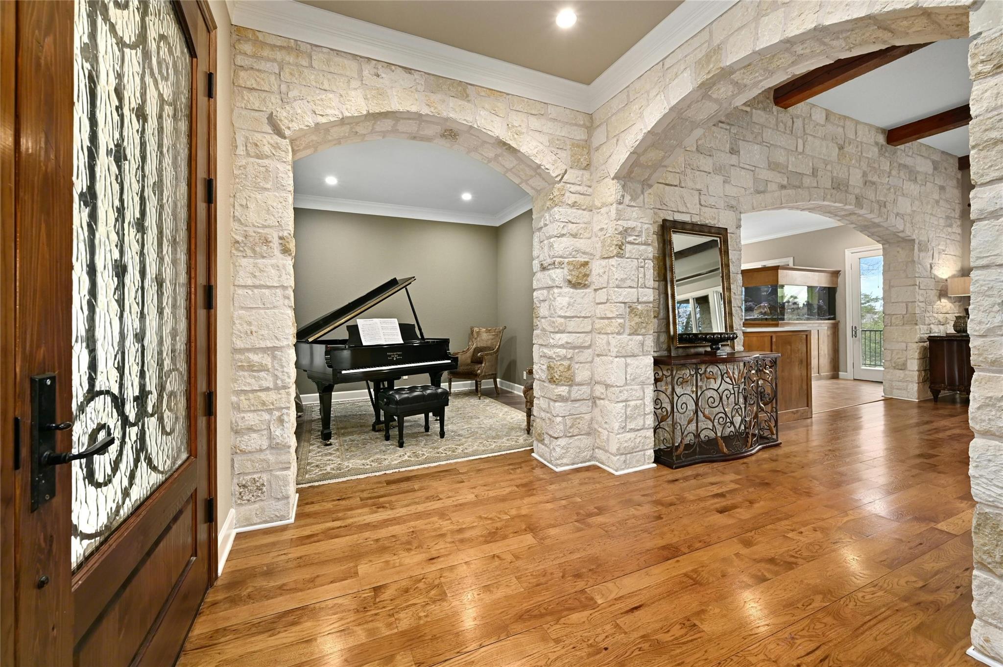 Located in the heart of Northwest Hills, this iconic, custom-built home is the perfect blend of elegance, functionality, and attention to detail. Upon entry, the foyer’s stone archways welcome guests into the oversized living room featuring exposed beams and a stone fireplace. Share stories and unwind in this inviting and elegant space. Steps away, the dining room features cathedral ceilings and exposed beams, creating an atmosphere of grandeur and sophistication. Entertain with ease in the fully equipped kitchen, complete with updated quartz counter tops, a modern and chic backsplash, and an expansive kitchen island. Step outside to the back patio and experience true outdoor living at its finest. Vaulted ceilings lined with cedar create a cozy atmosphere, while separate seating and eating areas offer great canyon views for al fresco dining and relaxation. Back inside, the primary suite offers a retreat complete with private office, dual vanities, garden tub, and impressive walk-in closet. Down the hall enjoy the convenience of a main floor guest room and spacious laundry room with plenty of storage to keep your home organized. Upstairs, discover three additional bedrooms, two full bathrooms, and a charming hallway desk, providing ample space for family and guests to work and relax. The lower level extends the allure of this home with a spacious living room complete with a pool table, a convenient kitchen, and a half bath, perfect for entertaining or unwinding in style. Step outside to the flat backyard, or let your furry friends run around in the dog run, all while enjoying the natural beauty that surrounds this stately residence. With convenient access to nearby shops and schools yet on a quiet street, this home offers the perfect balance of privacy and convenience. Feeds highly coveted Doss, Murchison, and Anderson. Buyer to verify all details. Note, impervious coverage limitations may prohibit building a pool.