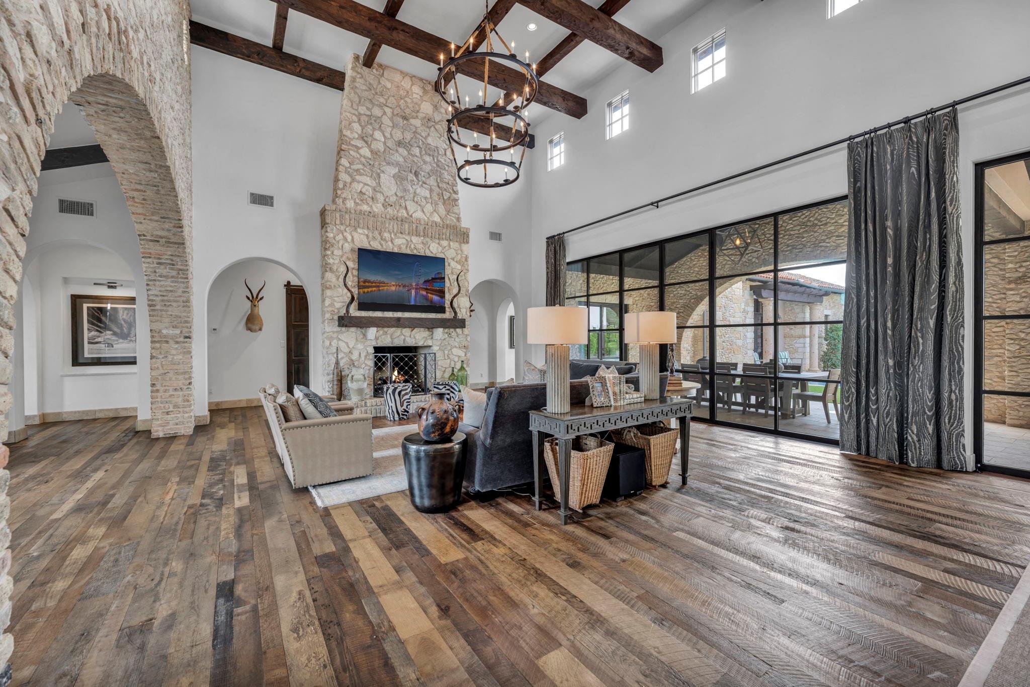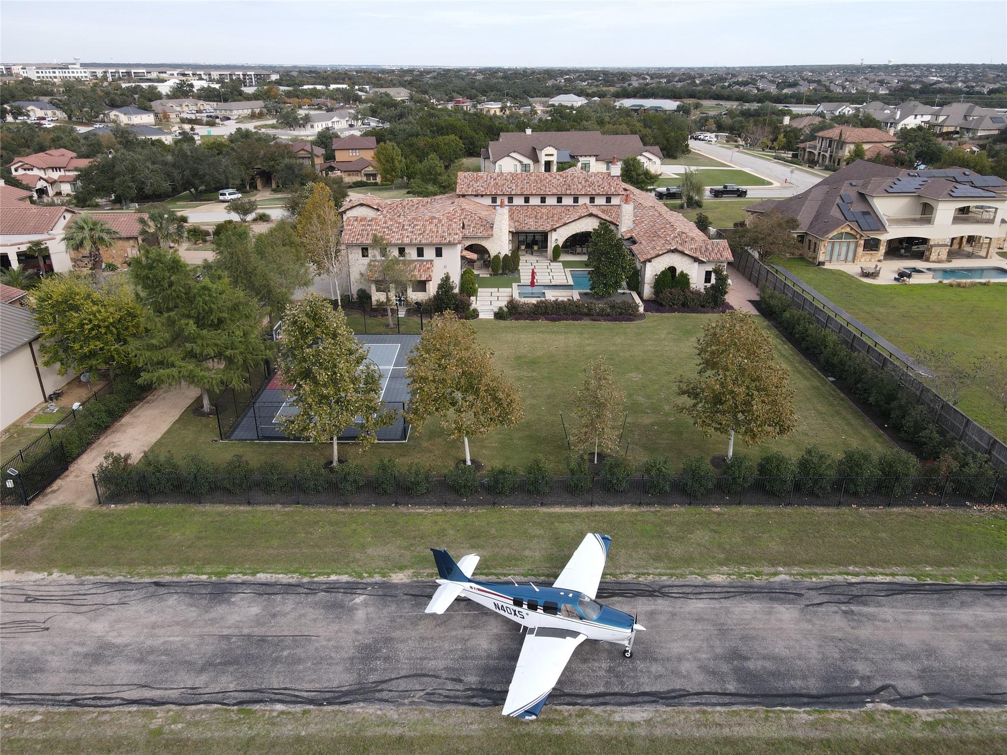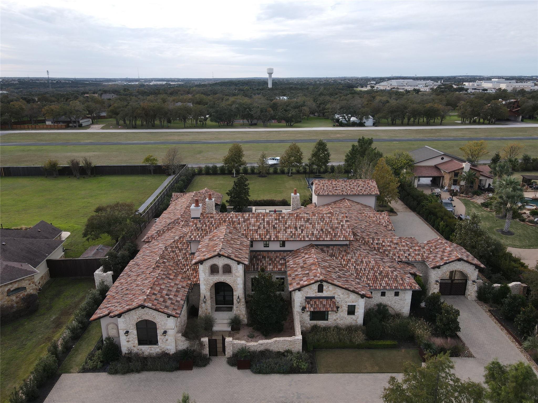 This one-of-a-kind luxury estate is located in the exclusive Breakaway Park subdivision known for its fly-in / fly-out community with its own private runway. Sitting on a full acre lot, this home backs directly up to the airstrip and has plenty of room to build your own hangar or guest house if desired. With this property, the owners have the opportunity to join the pilots' association as a member, for use of the airport. Designed by renowned architect John Hathaway of Vanguard Studios and decorated by Glynis Wood Interiors - this timeless Italian themed villa has a seamless blend of old-world elements mixed with contemporary touches throughout. With no expense spared in creating a luxurious and serene atmosphere – it’s the ultimate dream home for those who seek the best in high-end living and entertaining. Exterior appointments include a real Mexican clay tile roof, custom built copper gates, a blend of cave stone, limestone, and old Chicago brick masonry along with a professionally designed landscaping package and landscape lighting. In the rear yard many activities abound with a lighted sport court, a lavish heated pool and spa, a rear patio cooling system – and plenty of grassy lawn for many other outdoor experiences. The interior of the home boasts expansive open spaces, large steel and glass window / door units, custom wood beams, reclaimed custom wood floors and natural stone tile throughout. The owner's bath has a steam shower and hand hammered copper tub along with direct access its own patio which leads to the pool area. Just off the kitchen there is a custom-built 700+ bottle chilled wine room! Additionally, the high-end appliances, custom light fixtures, cabinets, and luxurious finishes throughout are just a few of the many things to experience. This location is close to shopping, the Domain, entertainment, and convenient transportation, trails and so much more!