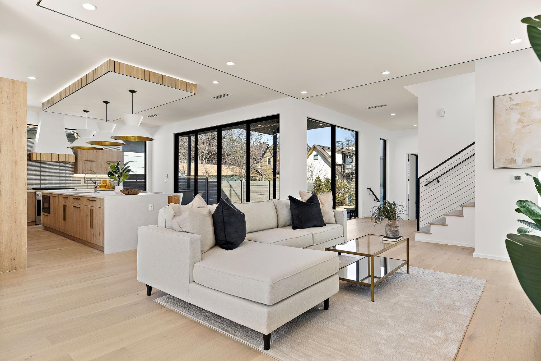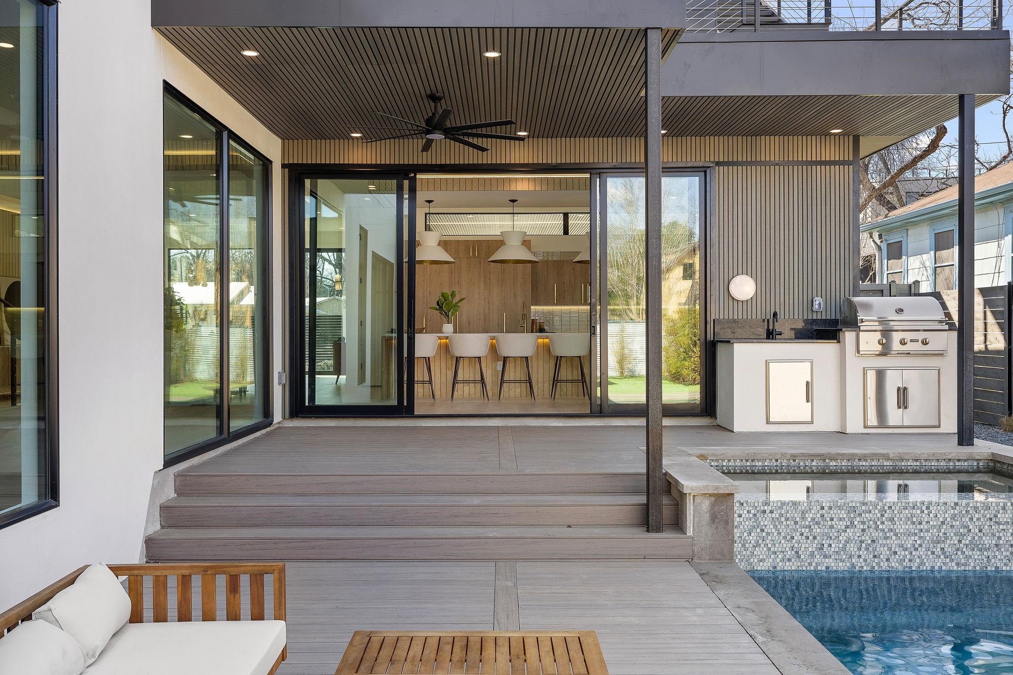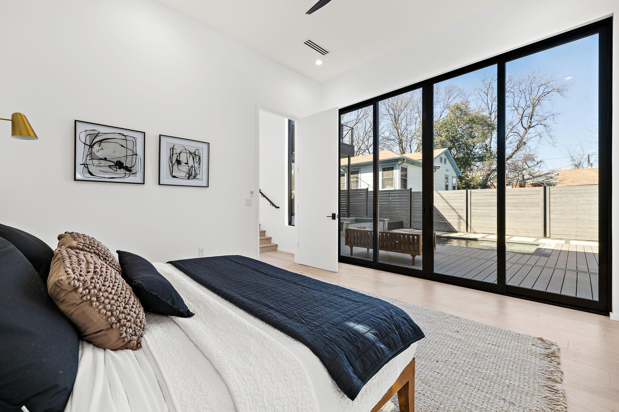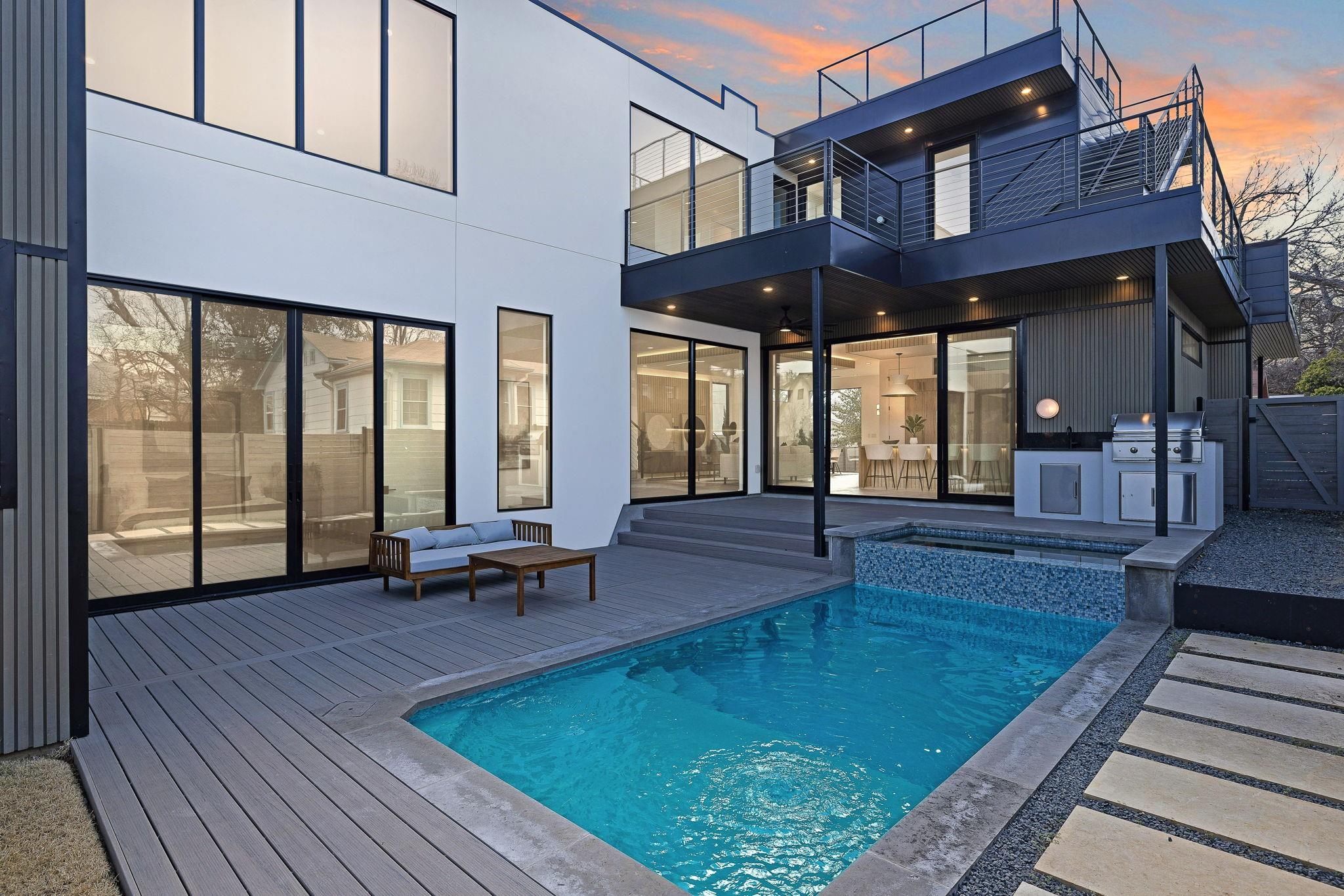 Discover the pinnacle of urban opulence with this breathtaking abode, where contemporary design meets unparalleled elegance. Boasting a sophisticated modern architectural style and a thoughtfully curated layout, this home is the epitome of luxury living, designed for grand-scale entertaining. It features soaring high ceilings and vast, floor-to-ceiling windows that bathe every room in natural light, complemented by the warmth of white oak hardwood floors throughout, creating a welcoming and refined atmosphere. The chef's kitchen is a masterpiece of design and functionality, outfitted with cutting-edge appliances and bespoke wooden cabinetry, marrying beauty with practicality. Step outside to find a serene outdoor sanctuary, featuring a peaceful swimming pool, spa, an alfresco kitchen, and a barbecue area, all set up for ultimate relaxation and social gatherings. The primary suite, located on the main level, serves as a luxurious haven, with its elevated ceilings, a bathroom reminiscent of a high-end spa, a generously sized walk-in closet, and direct access to the tranquil backyard. The second floor houses three additional bedrooms and two full bathrooms, alongside a flexible space complete with a wet bar, leading out to several balconies and a rooftop deck that offers awe-inspiring views of the Austin skyline. Situated just a stone's throw from Zilker Park, Lady Bird Lake, and a myriad of dining, shopping, and entertainment venues, this home truly represents the zenith of urban luxury living.