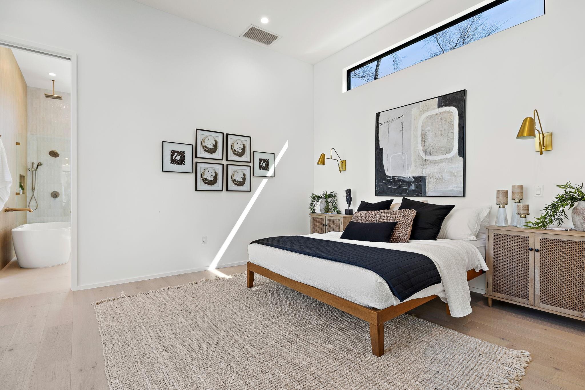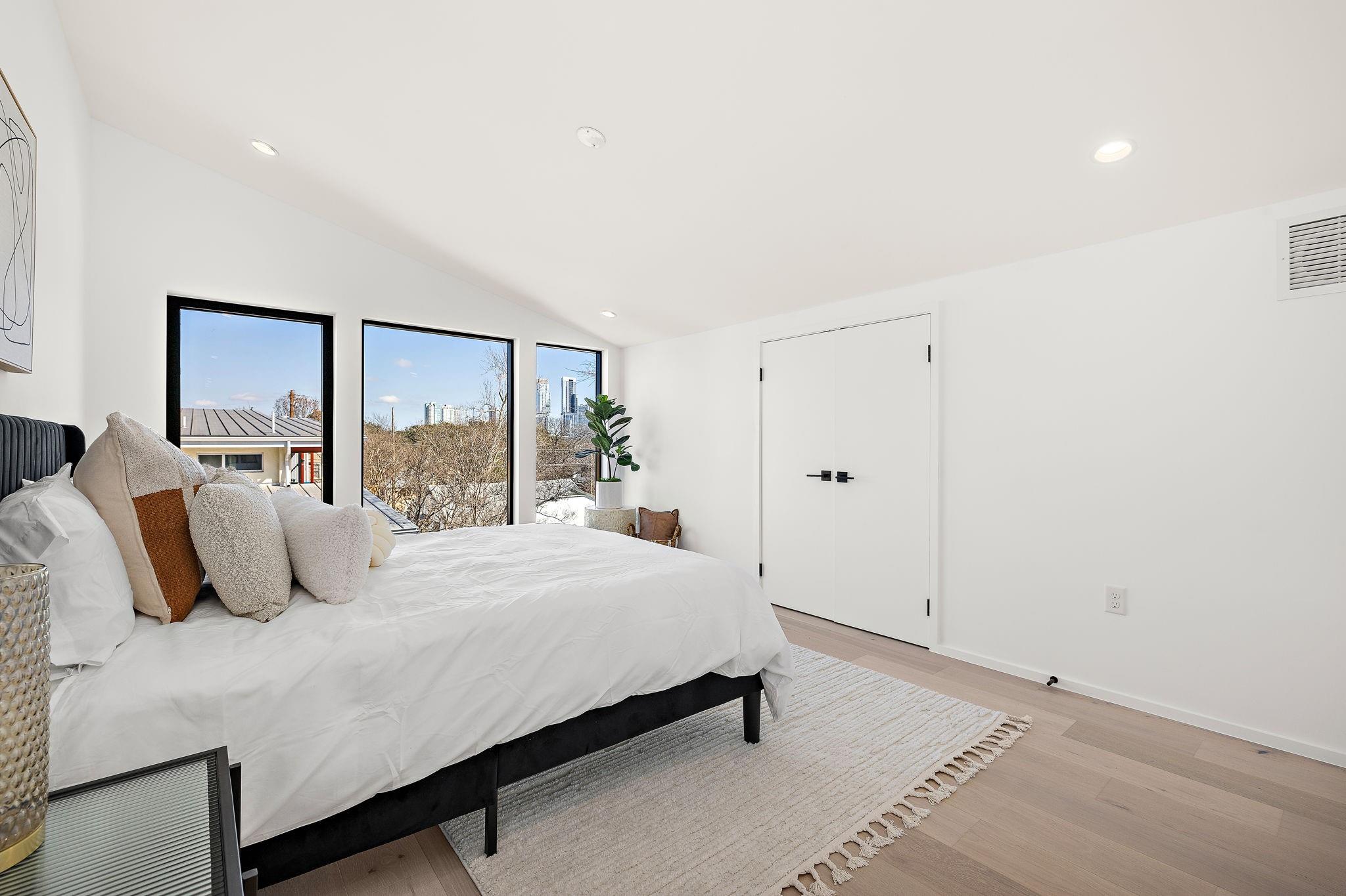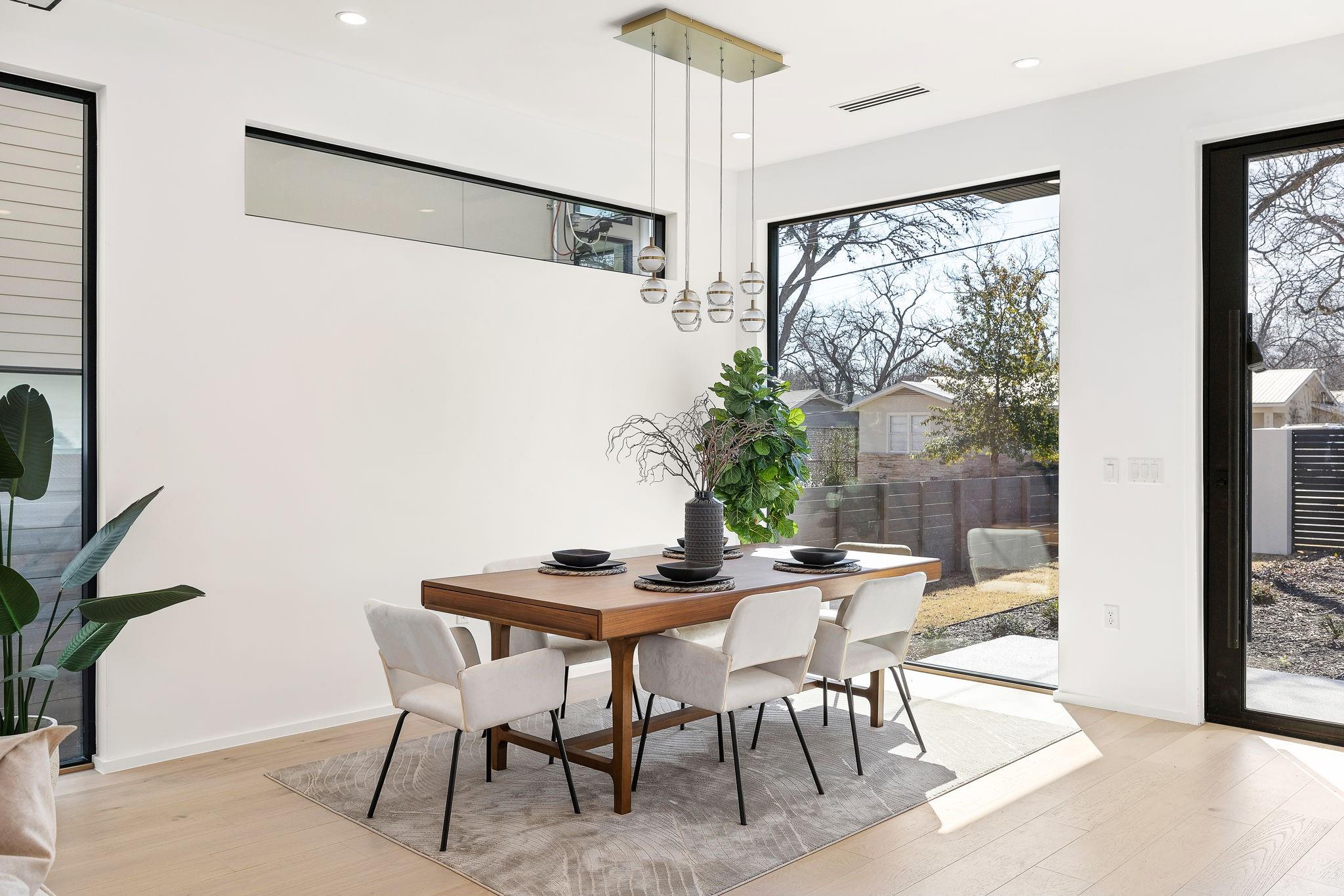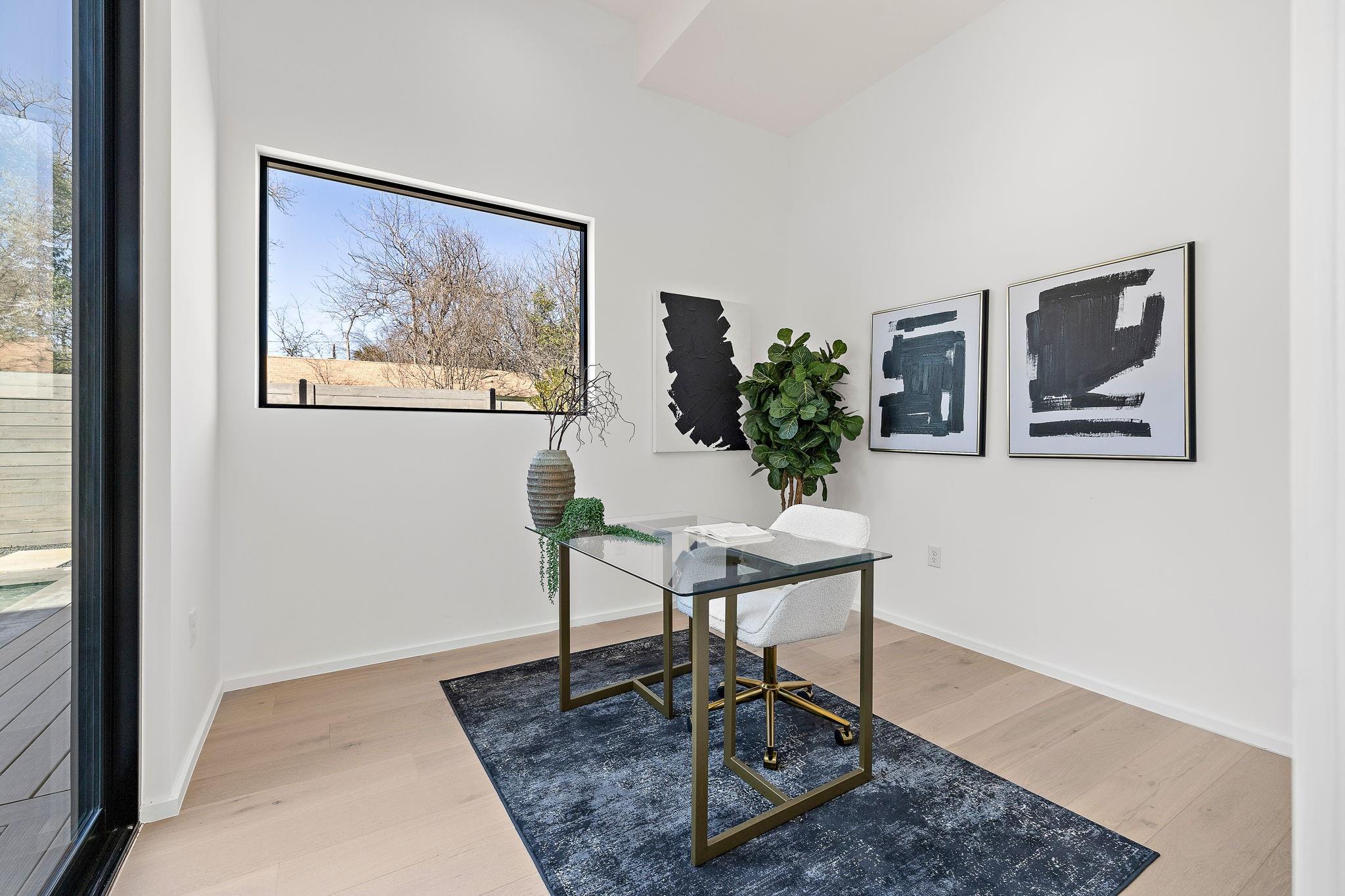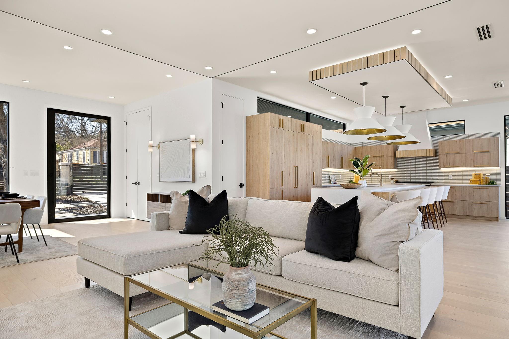 Discover the pinnacle of urban opulence with this breathtaking abode, where contemporary design meets unparalleled elegance. Boasting a sophisticated modern architectural style and a thoughtfully curated layout, this home is the epitome of luxury living, designed for grand-scale entertaining. It features soaring high ceilings and vast, floor-to-ceiling windows that bathe every room in natural light, complemented by the warmth of white oak hardwood floors throughout, creating a welcoming and refined atmosphere. The chef's kitchen is a masterpiece of design and functionality, outfitted with cutting-edge appliances and bespoke wooden cabinetry, marrying beauty with practicality. Step outside to find a serene outdoor sanctuary, featuring a peaceful swimming pool, spa, an alfresco kitchen, and a barbecue area, all set up for ultimate relaxation and social gatherings. The primary suite, located on the main level, serves as a luxurious haven, with its elevated ceilings, a bathroom reminiscent of a high-end spa, a generously sized walk-in closet, and direct access to the tranquil backyard. The second floor houses three additional bedrooms and two full bathrooms, alongside a flexible space complete with a wet bar, leading out to several balconies and a rooftop deck that offers awe-inspiring views of the Austin skyline. Situated just a stone's throw from Zilker Park, Lady Bird Lake, and a myriad of dining, shopping, and entertainment venues, this home truly represents the zenith of urban luxury living.