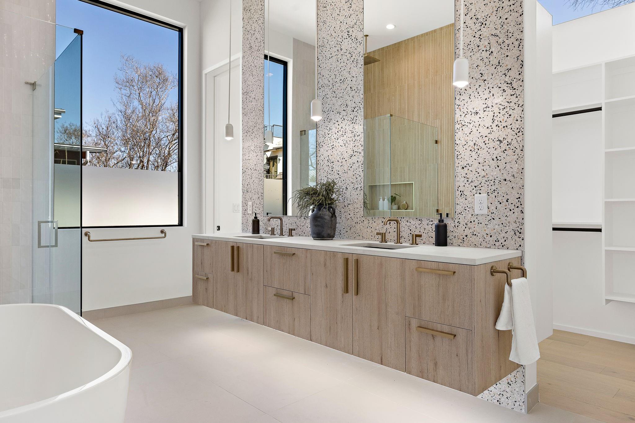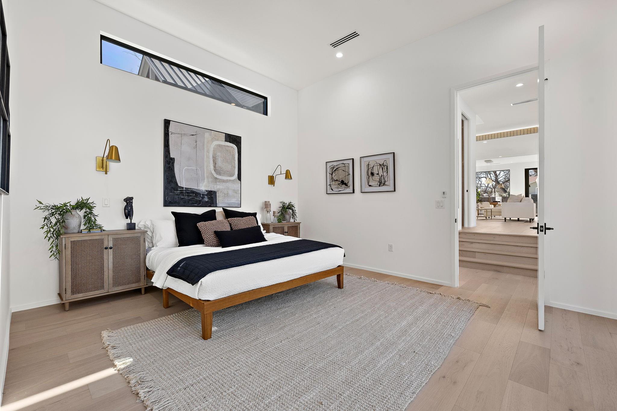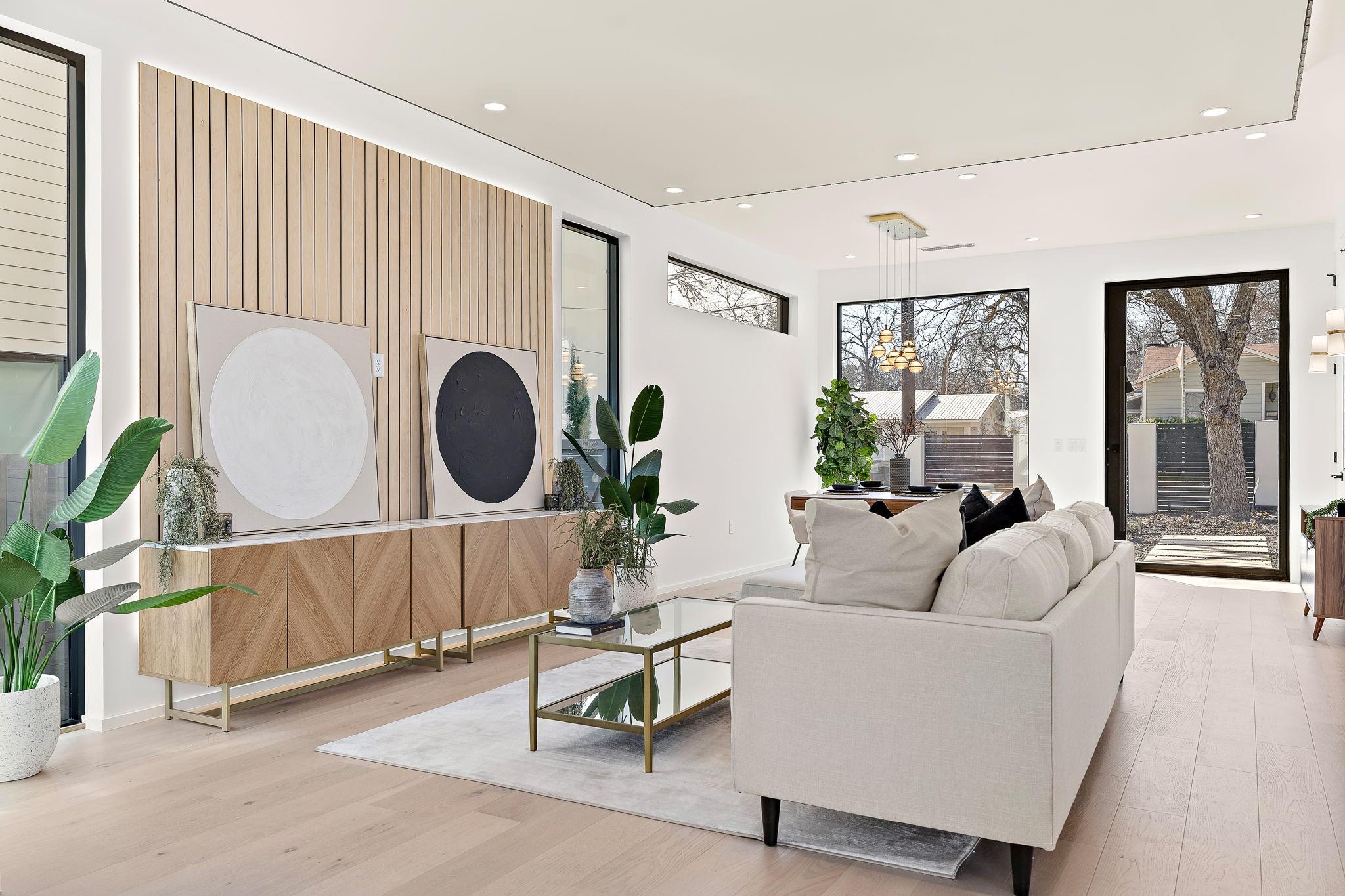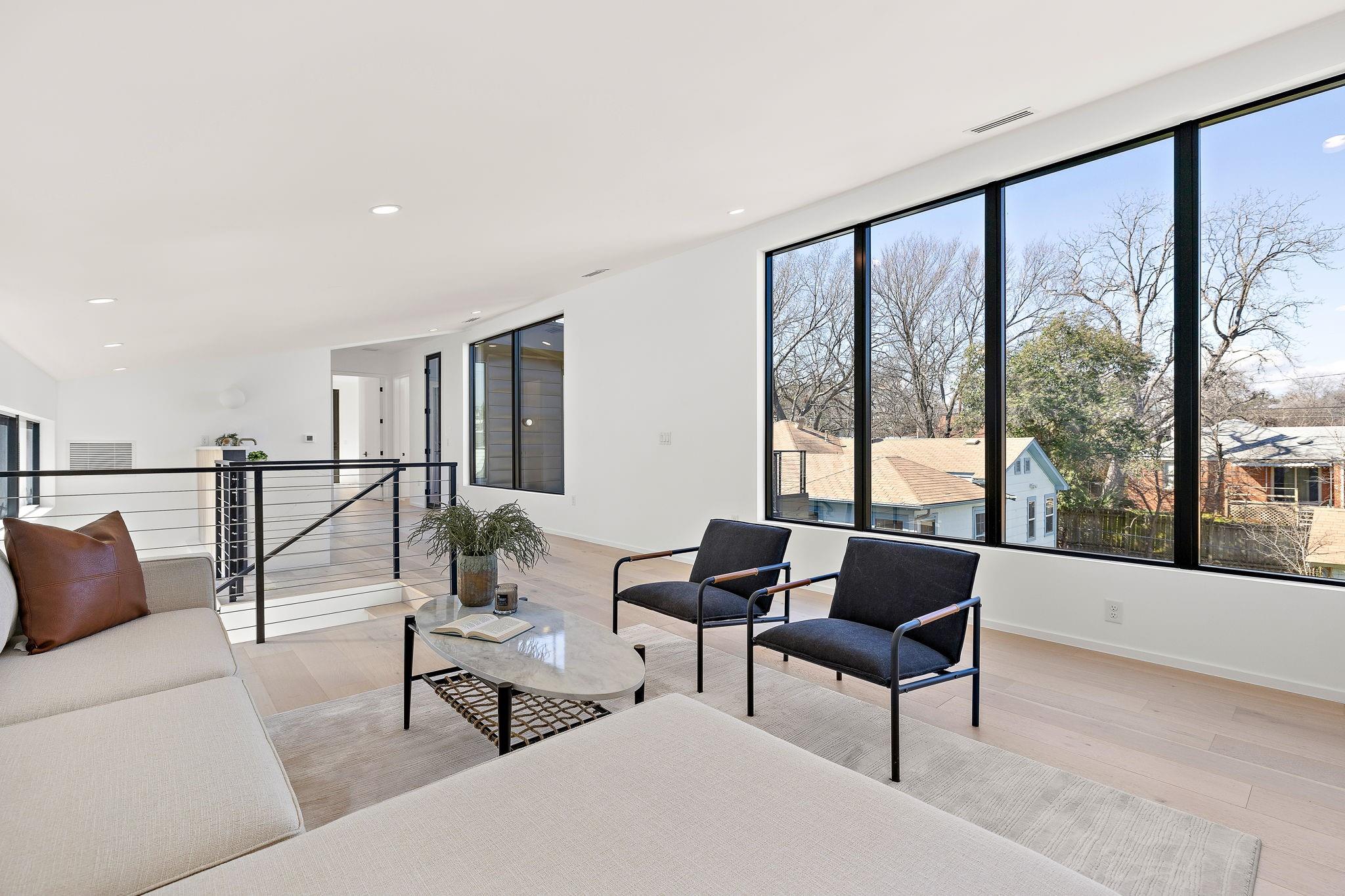 Discover the pinnacle of urban opulence with this breathtaking abode, where contemporary design meets unparalleled elegance. Boasting a sophisticated modern architectural style and a thoughtfully curated layout, this home is the epitome of luxury living, designed for grand-scale entertaining. It features soaring high ceilings and vast, floor-to-ceiling windows that bathe every room in natural light, complemented by the warmth of white oak hardwood floors throughout, creating a welcoming and refined atmosphere. The chef's kitchen is a masterpiece of design and functionality, outfitted with cutting-edge appliances and bespoke wooden cabinetry, marrying beauty with practicality. Step outside to find a serene outdoor sanctuary, featuring a peaceful swimming pool, spa, an alfresco kitchen, and a barbecue area, all set up for ultimate relaxation and social gatherings. The primary suite, located on the main level, serves as a luxurious haven, with its elevated ceilings, a bathroom reminiscent of a high-end spa, a generously sized walk-in closet, and direct access to the tranquil backyard. The second floor houses three additional bedrooms and two full bathrooms, alongside a flexible space complete with a wet bar, leading out to several balconies and a rooftop deck that offers awe-inspiring views of the Austin skyline. Situated just a stone's throw from Zilker Park, Lady Bird Lake, and a myriad of dining, shopping, and entertainment venues, this home truly represents the zenith of urban luxury living.