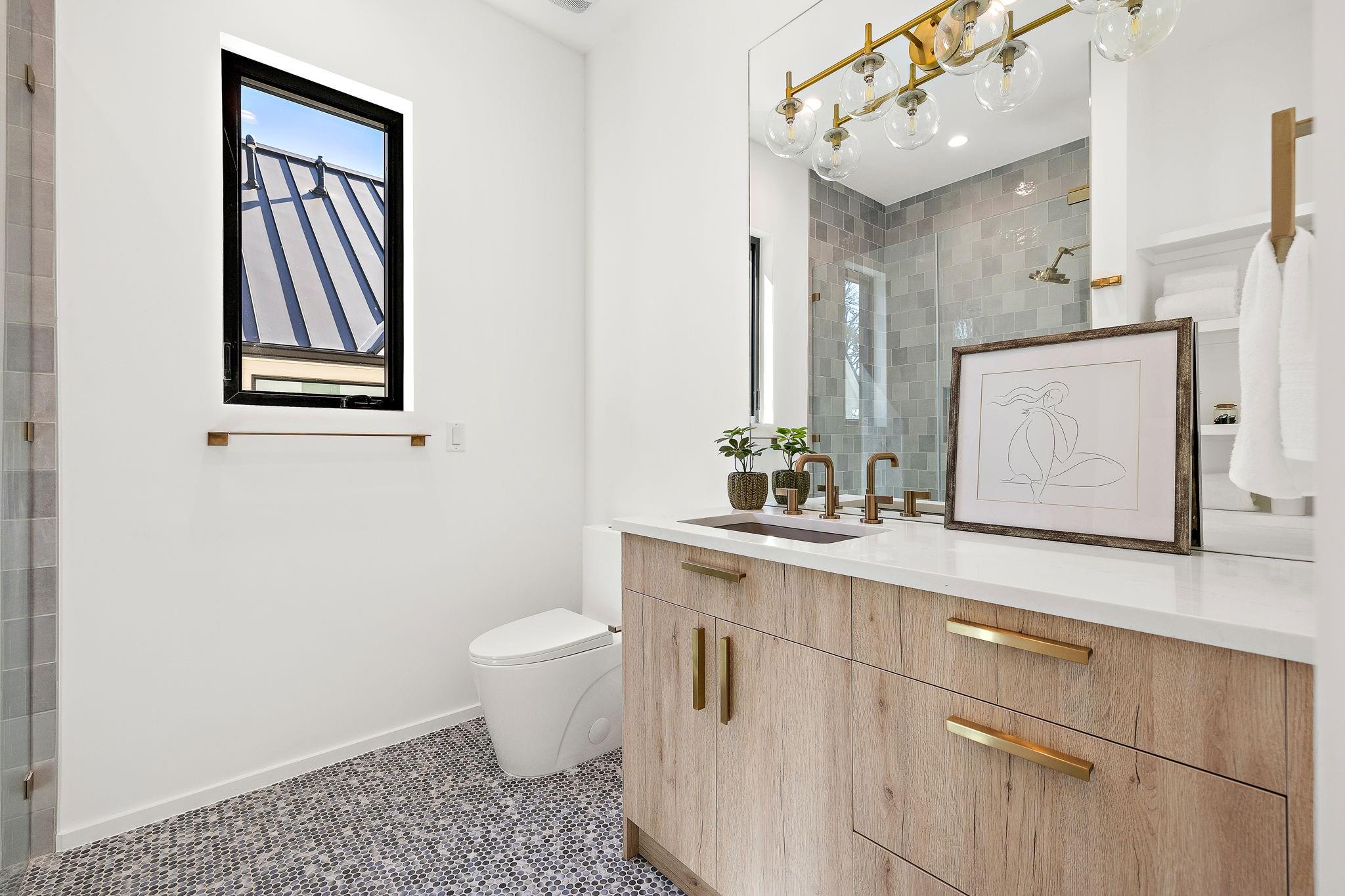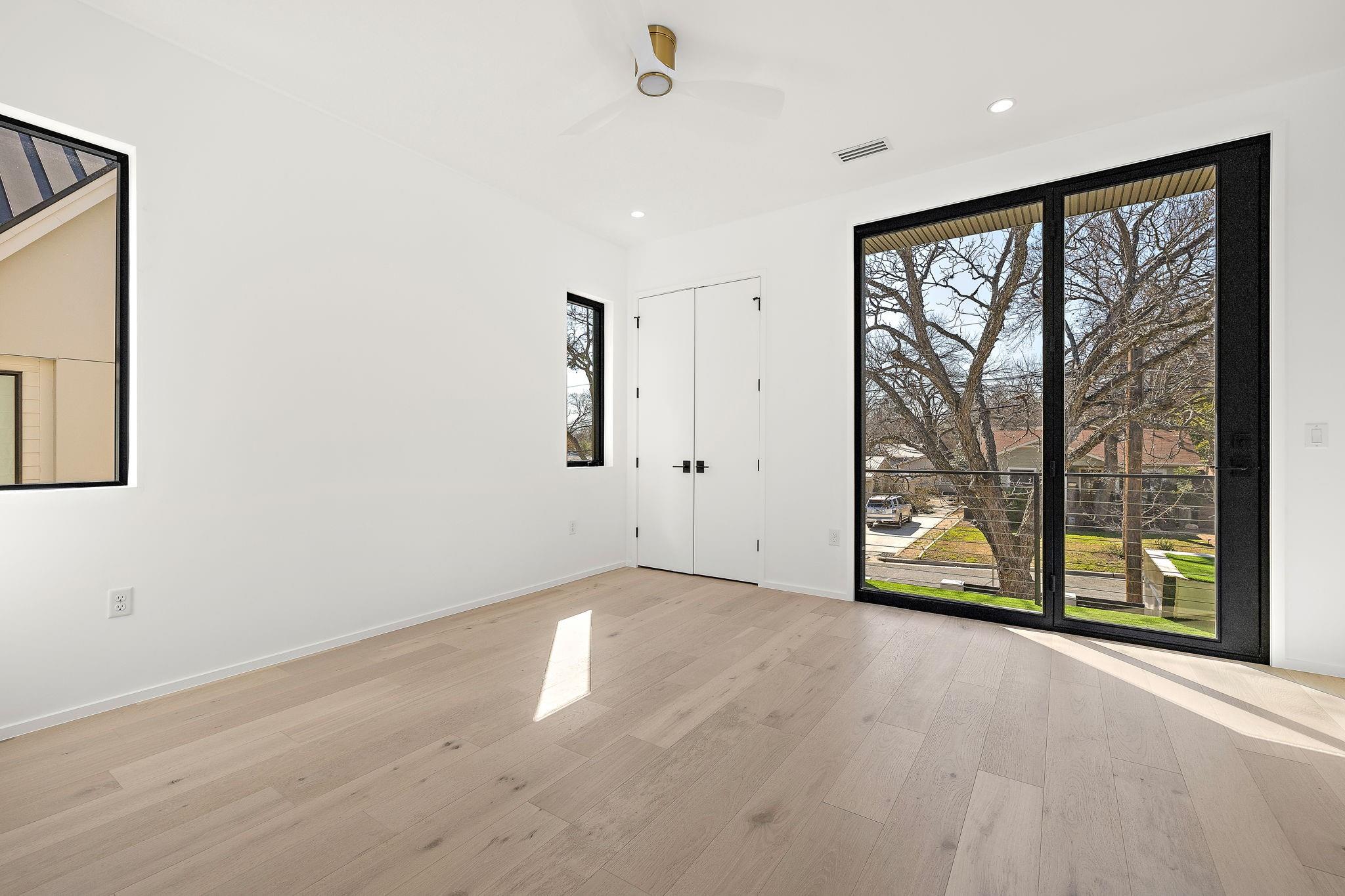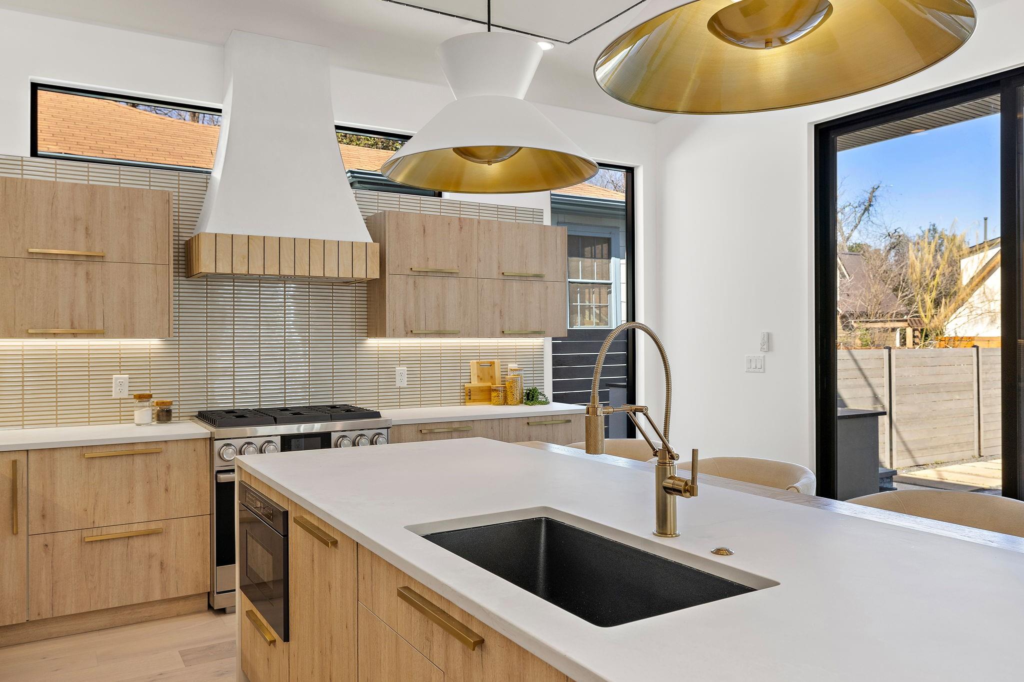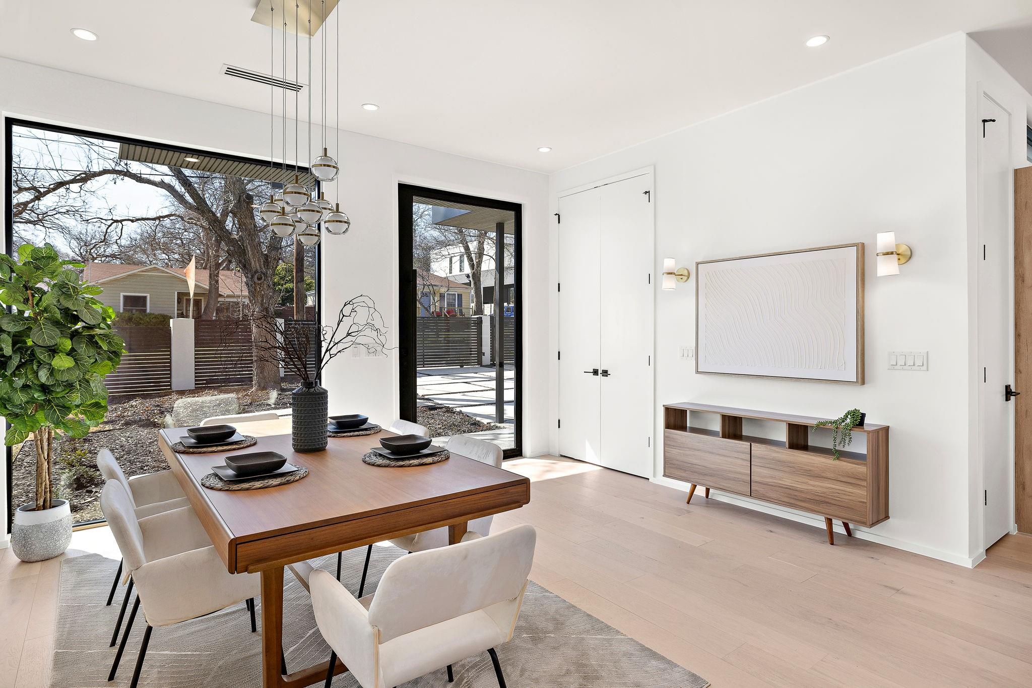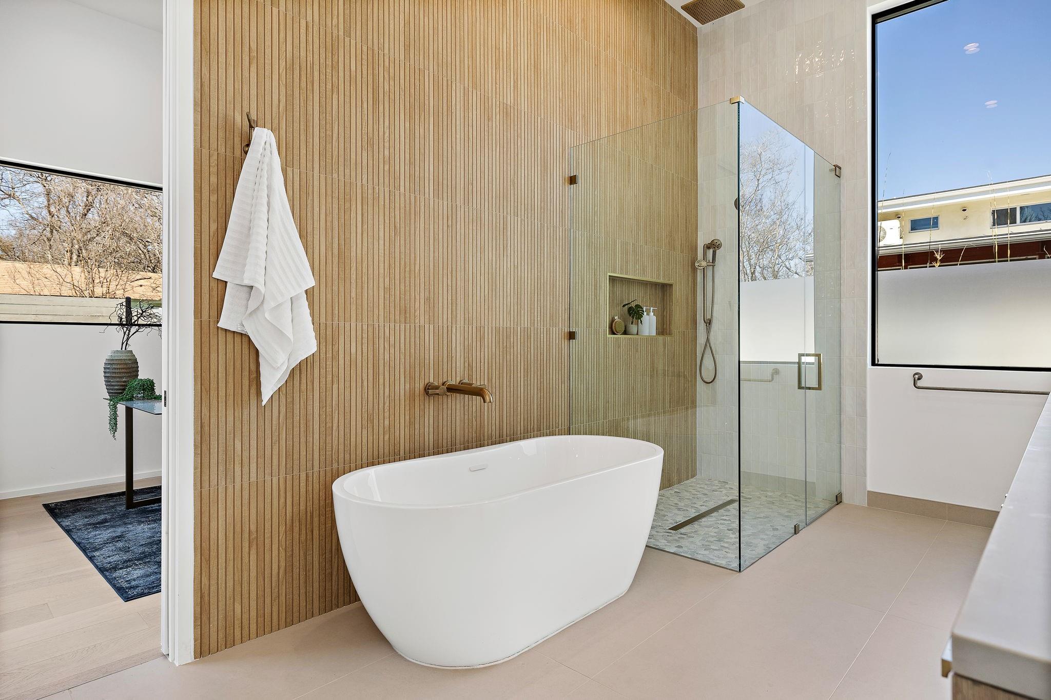 Discover the pinnacle of urban opulence with this breathtaking abode, where contemporary design meets unparalleled elegance. Boasting a sophisticated modern architectural style and a thoughtfully curated layout, this home is the epitome of luxury living, designed for grand-scale entertaining. It features soaring high ceilings and vast, floor-to-ceiling windows that bathe every room in natural light, complemented by the warmth of white oak hardwood floors throughout, creating a welcoming and refined atmosphere. The chef's kitchen is a masterpiece of design and functionality, outfitted with cutting-edge appliances and bespoke wooden cabinetry, marrying beauty with practicality. Step outside to find a serene outdoor sanctuary, featuring a peaceful swimming pool, spa, an alfresco kitchen, and a barbecue area, all set up for ultimate relaxation and social gatherings. The primary suite, located on the main level, serves as a luxurious haven, with its elevated ceilings, a bathroom reminiscent of a high-end spa, a generously sized walk-in closet, and direct access to the tranquil backyard. The second floor houses three additional bedrooms and two full bathrooms, alongside a flexible space complete with a wet bar, leading out to several balconies and a rooftop deck that offers awe-inspiring views of the Austin skyline. Situated just a stone's throw from Zilker Park, Lady Bird Lake, and a myriad of dining, shopping, and entertainment venues, this home truly represents the zenith of urban luxury living.