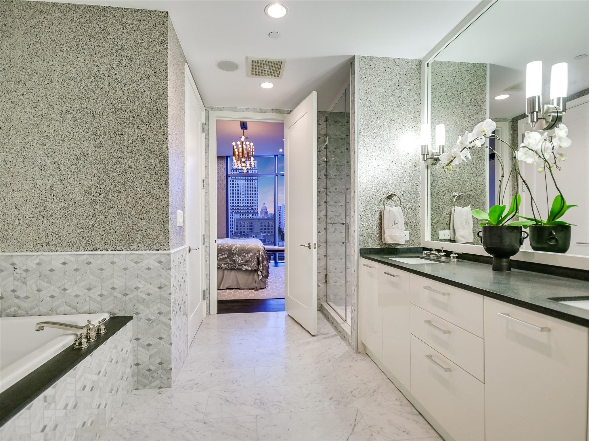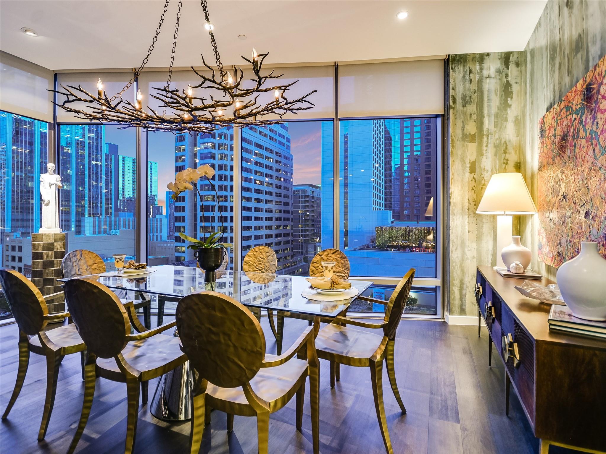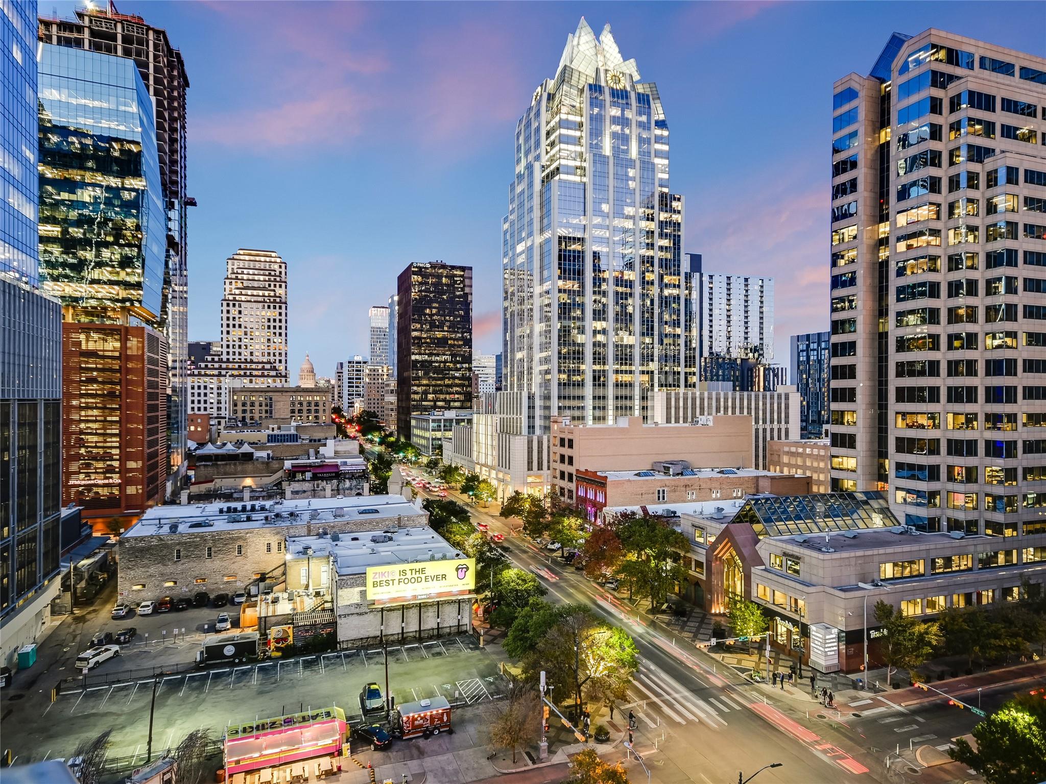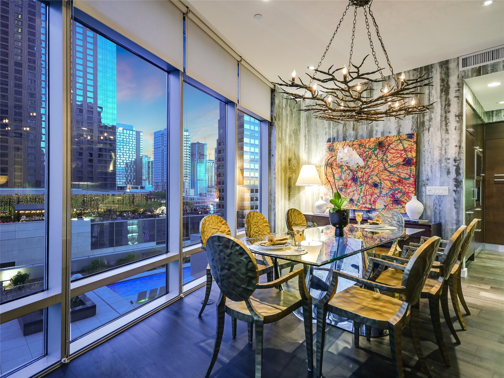 Situated on the 11th floor, NE corner, of the highly sought-after Austonian building, this 2-bedroom, 2-bath residence offers stunning views of the city skyline and the Capitol building. This open-concept living space incorporates floor-to-ceiling windows equipped with shades in the living, kitchen, and dining area. The well-appointed chef's kitchen boasts top-of-the-line stainless steel appliances, granite countertops, tile backsplash, ample cabinetry, and a central island that doubles as a breakfast bar. Throughout the residence, you'll find hardwood floors that enhance its elegance. The primary suite offers sweeping views of downtown and the Capitol. The luxurious primary bath is complete with a soaking tub, dual sinks, and a spacious shower all adorned with exquisite marble. The primary walk-in closet offers custom built-ins for maximum storage. All bedrooms feature custom shades. In addition, this unit offers a storage unit as well as two prime parking spots. The building also offers valet parking. The Austonian is renowned for its resort-style atmosphere and opulent residences, offering a wealth of amenities spanning 40,000 square feet. These amenities include meticulously maintained common areas, a 56th-floor fitness center and pool offering panoramic views, a private spa room, a dog grooming area, a dog park, a theater, a premium wine cellar, and more. Positioned in a prime central location, residents enjoy easy access to Lady Bird Lake, the Hike-and-Bike Trail, the Austin Public Library, exceptional shopping options, and the city's finest dining establishments.
