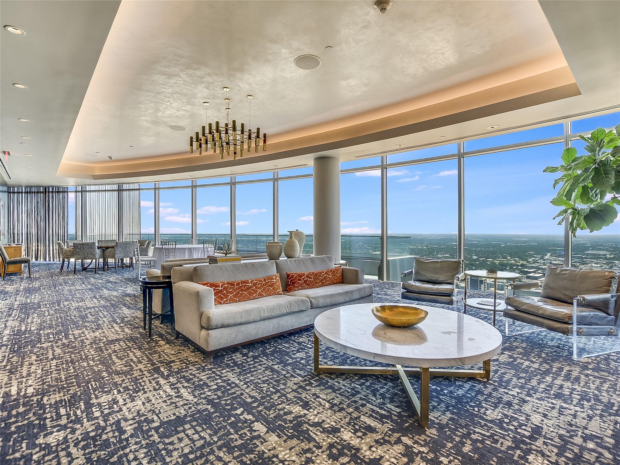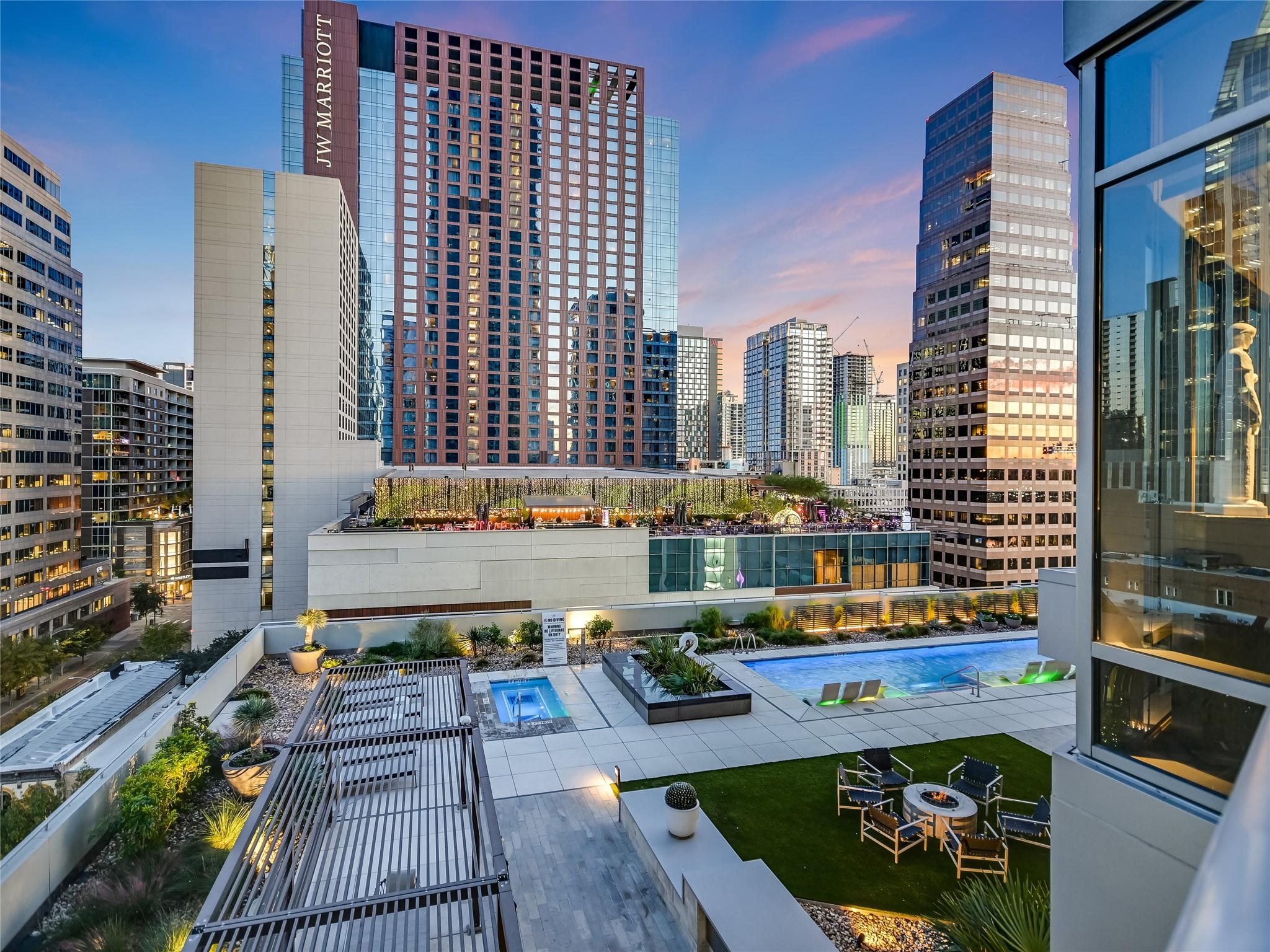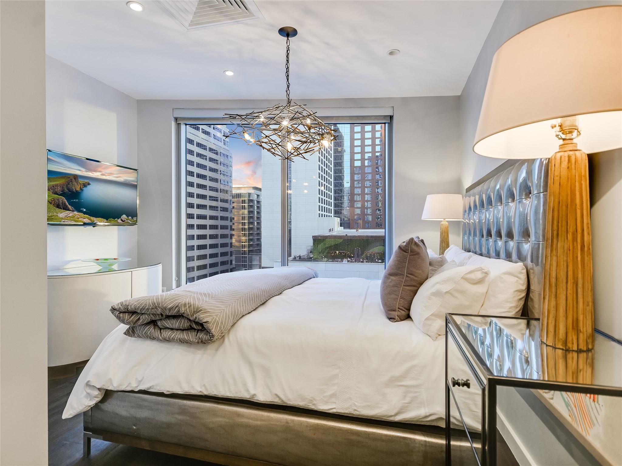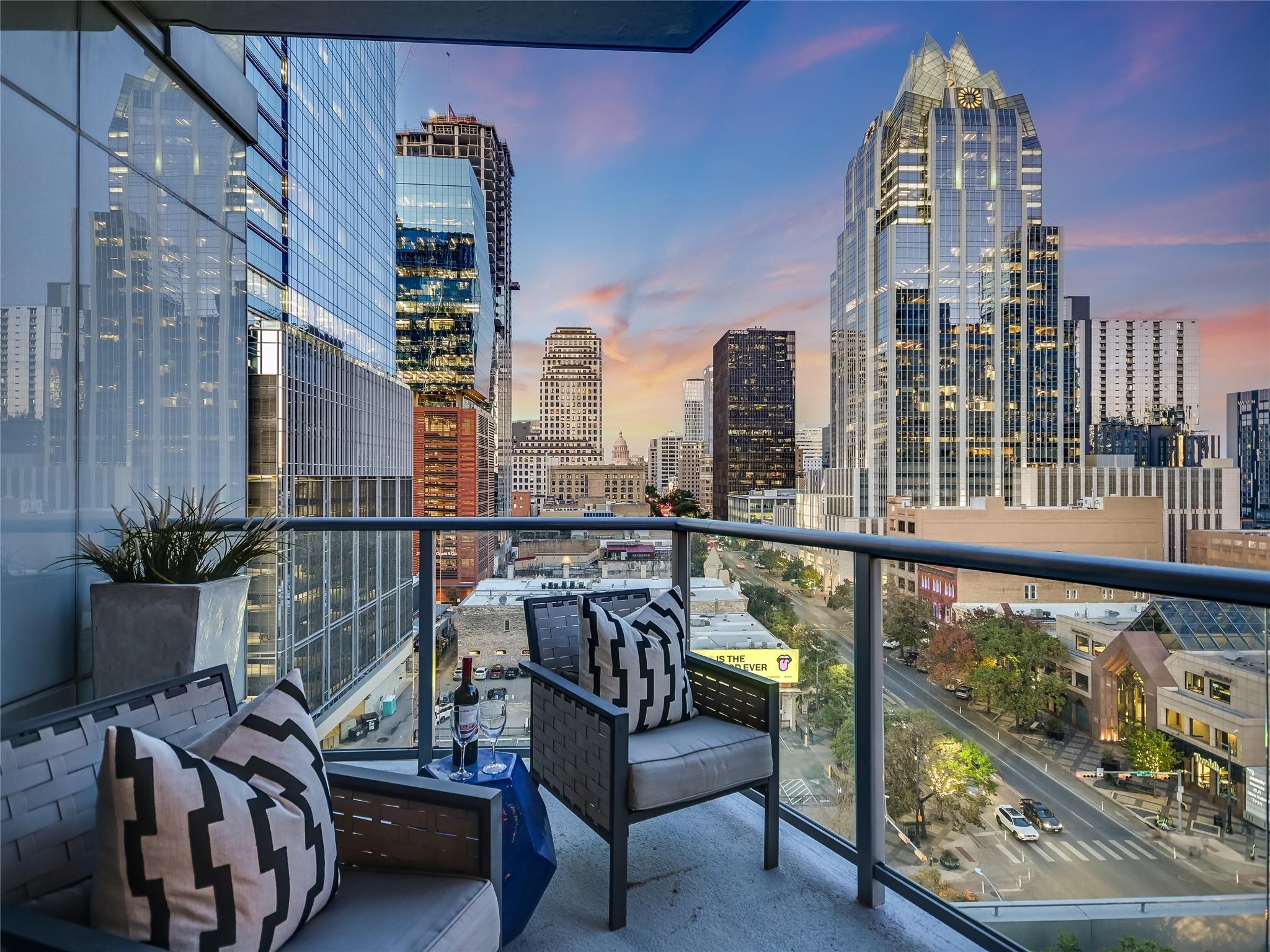 Situated on the 11th floor, NE corner, of the highly sought-after Austonian building, this 2-bedroom, 2-bath residence offers stunning views of the city skyline and the Capitol building. This open-concept living space incorporates floor-to-ceiling windows equipped with shades in the living, kitchen, and dining area. The well-appointed chef's kitchen boasts top-of-the-line stainless steel appliances, granite countertops, tile backsplash, ample cabinetry, and a central island that doubles as a breakfast bar. Throughout the residence, you'll find hardwood floors that enhance its elegance. The primary suite offers sweeping views of downtown and the Capitol. The luxurious primary bath is complete with a soaking tub, dual sinks, and a spacious shower all adorned with exquisite marble. The primary walk-in closet offers custom built-ins for maximum storage. All bedrooms feature custom shades. In addition, this unit offers a storage unit as well as two prime parking spots. The building also offers valet parking. The Austonian is renowned for its resort-style atmosphere and opulent residences, offering a wealth of amenities spanning 40,000 square feet. These amenities include meticulously maintained common areas, a 56th-floor fitness center and pool offering panoramic views, a private spa room, a dog grooming area, a dog park, a theater, a premium wine cellar, and more. Positioned in a prime central location, residents enjoy easy access to Lady Bird Lake, the Hike-and-Bike Trail, the Austin Public Library, exceptional shopping options, and the city's finest dining establishments.