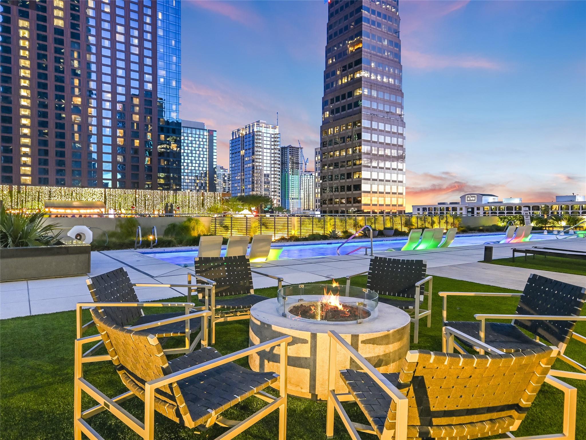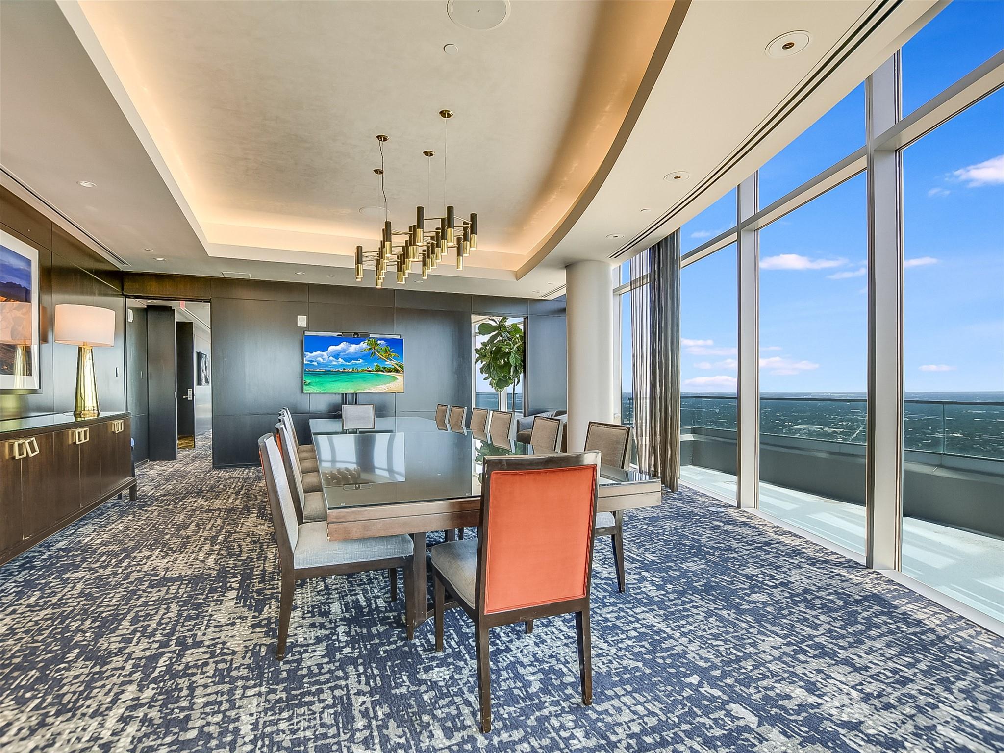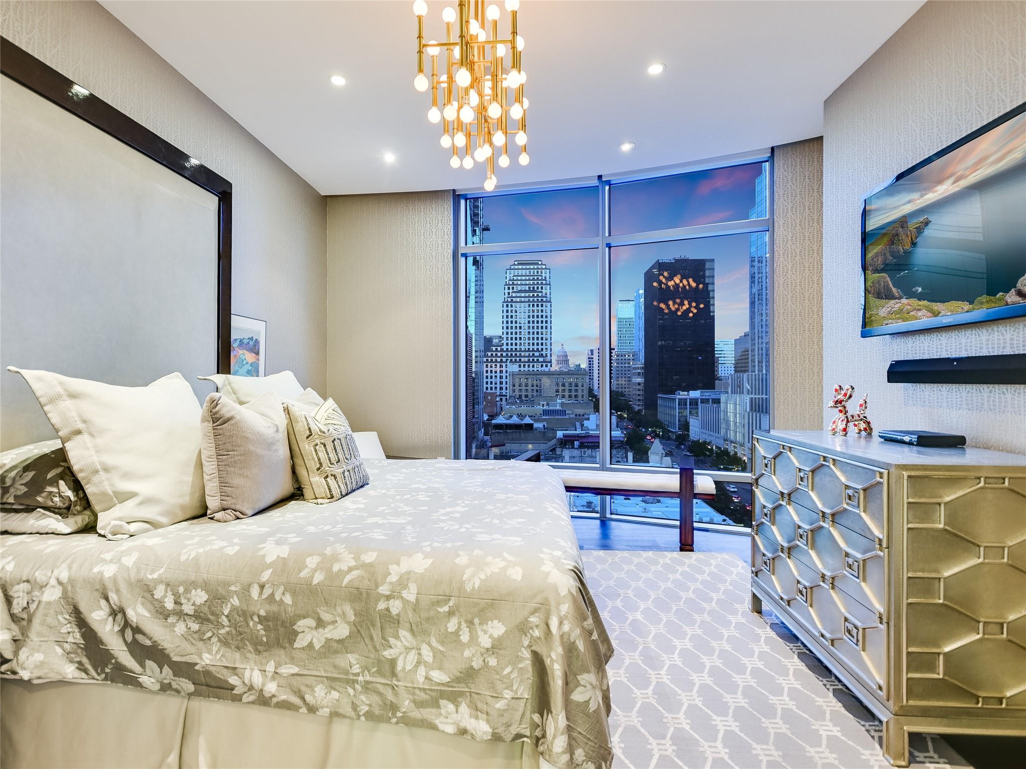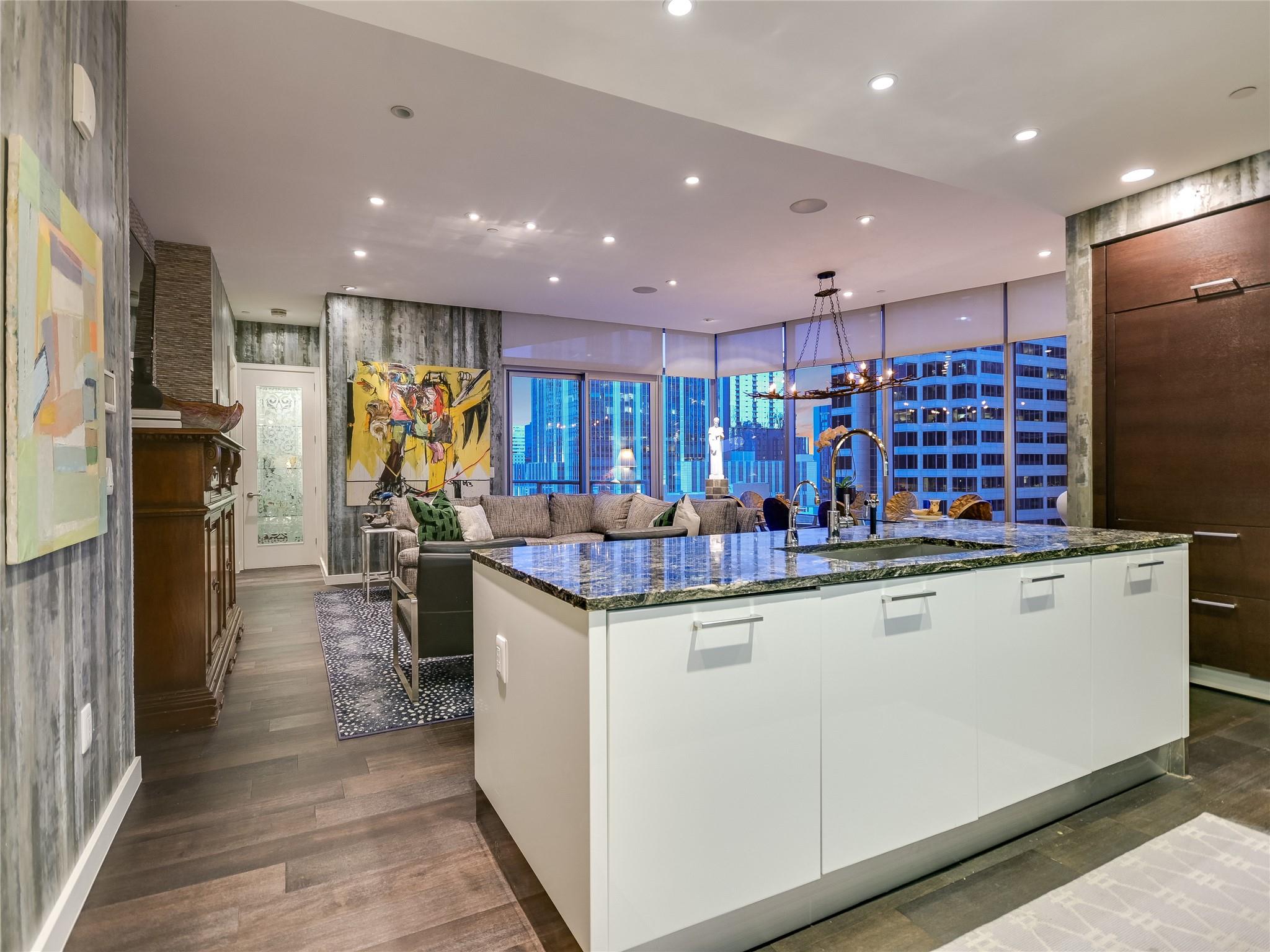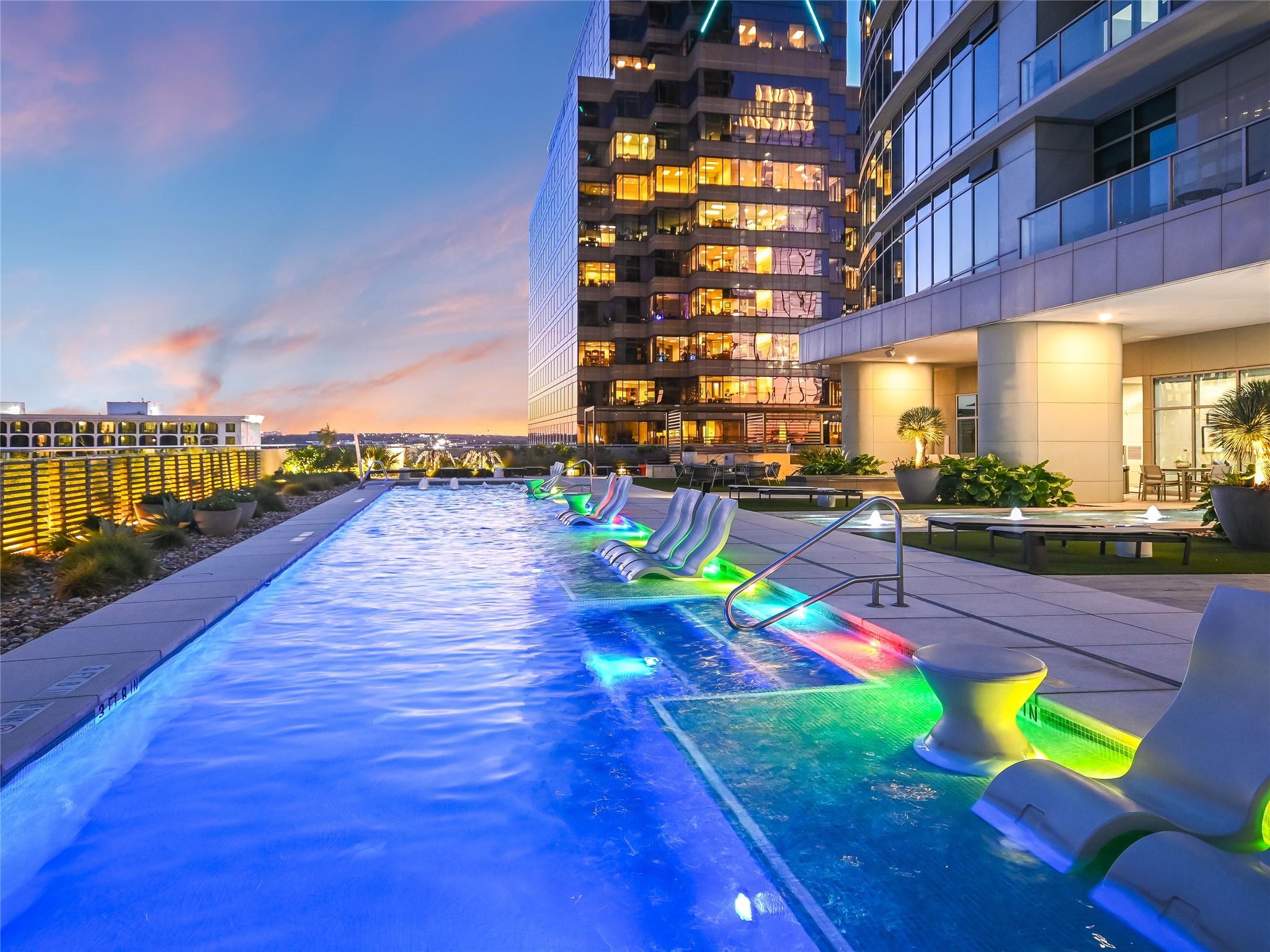 Situated on the 11th floor, NE corner, of the highly sought-after Austonian building, this 2-bedroom, 2-bath residence offers stunning views of the city skyline and the Capitol building. This open-concept living space incorporates floor-to-ceiling windows equipped with shades in the living, kitchen, and dining area. The well-appointed chef's kitchen boasts top-of-the-line stainless steel appliances, granite countertops, tile backsplash, ample cabinetry, and a central island that doubles as a breakfast bar. Throughout the residence, you'll find hardwood floors that enhance its elegance. The primary suite offers sweeping views of downtown and the Capitol. The luxurious primary bath is complete with a soaking tub, dual sinks, and a spacious shower all adorned with exquisite marble. The primary walk-in closet offers custom built-ins for maximum storage. All bedrooms feature custom shades. In addition, this unit offers a storage unit as well as two prime parking spots. The building also offers valet parking. The Austonian is renowned for its resort-style atmosphere and opulent residences, offering a wealth of amenities spanning 40,000 square feet. These amenities include meticulously maintained common areas, a 56th-floor fitness center and pool offering panoramic views, a private spa room, a dog grooming area, a dog park, a theater, a premium wine cellar, and more. Positioned in a prime central location, residents enjoy easy access to Lady Bird Lake, the Hike-and-Bike Trail, the Austin Public Library, exceptional shopping options, and the city's finest dining establishments.